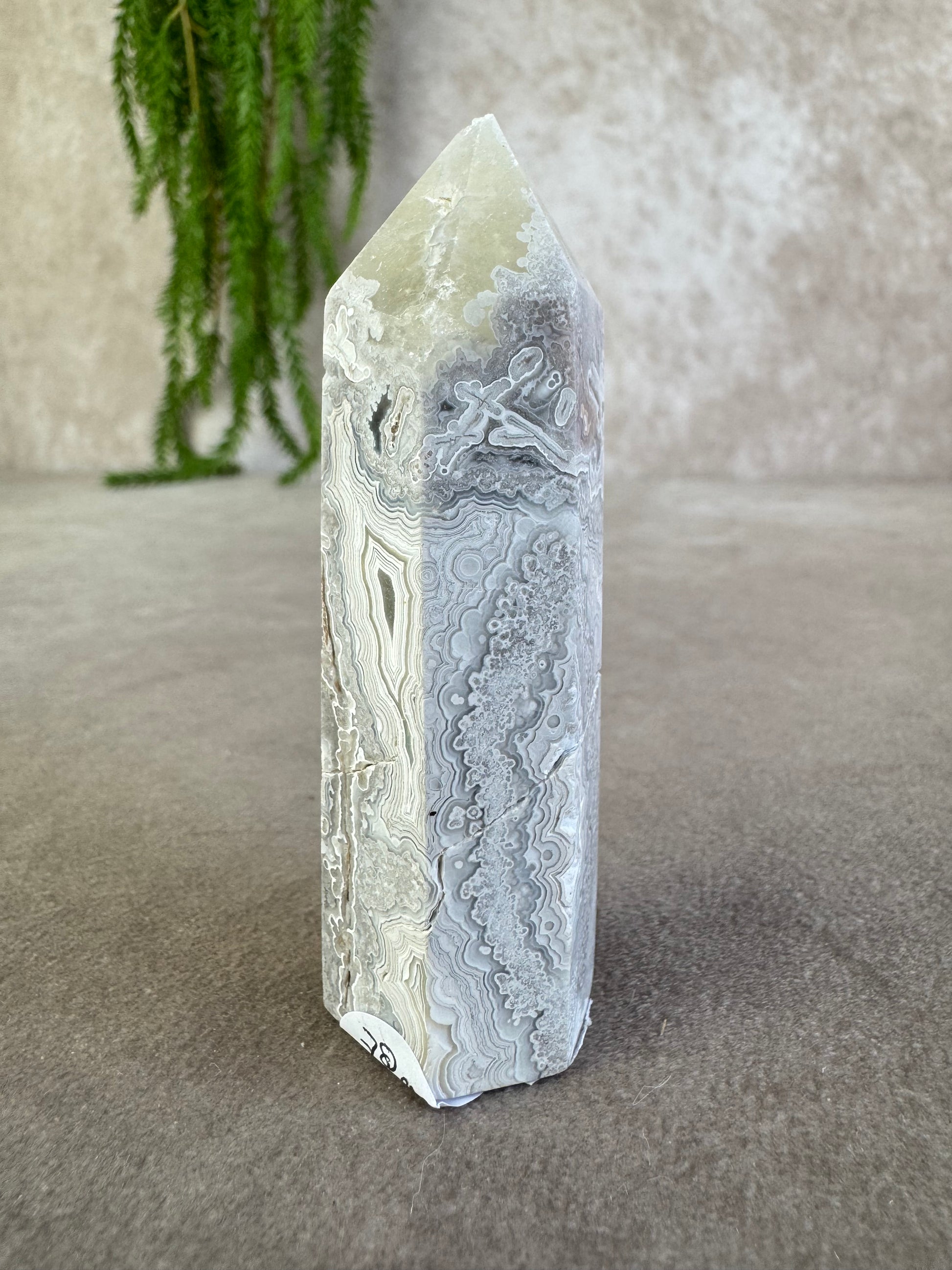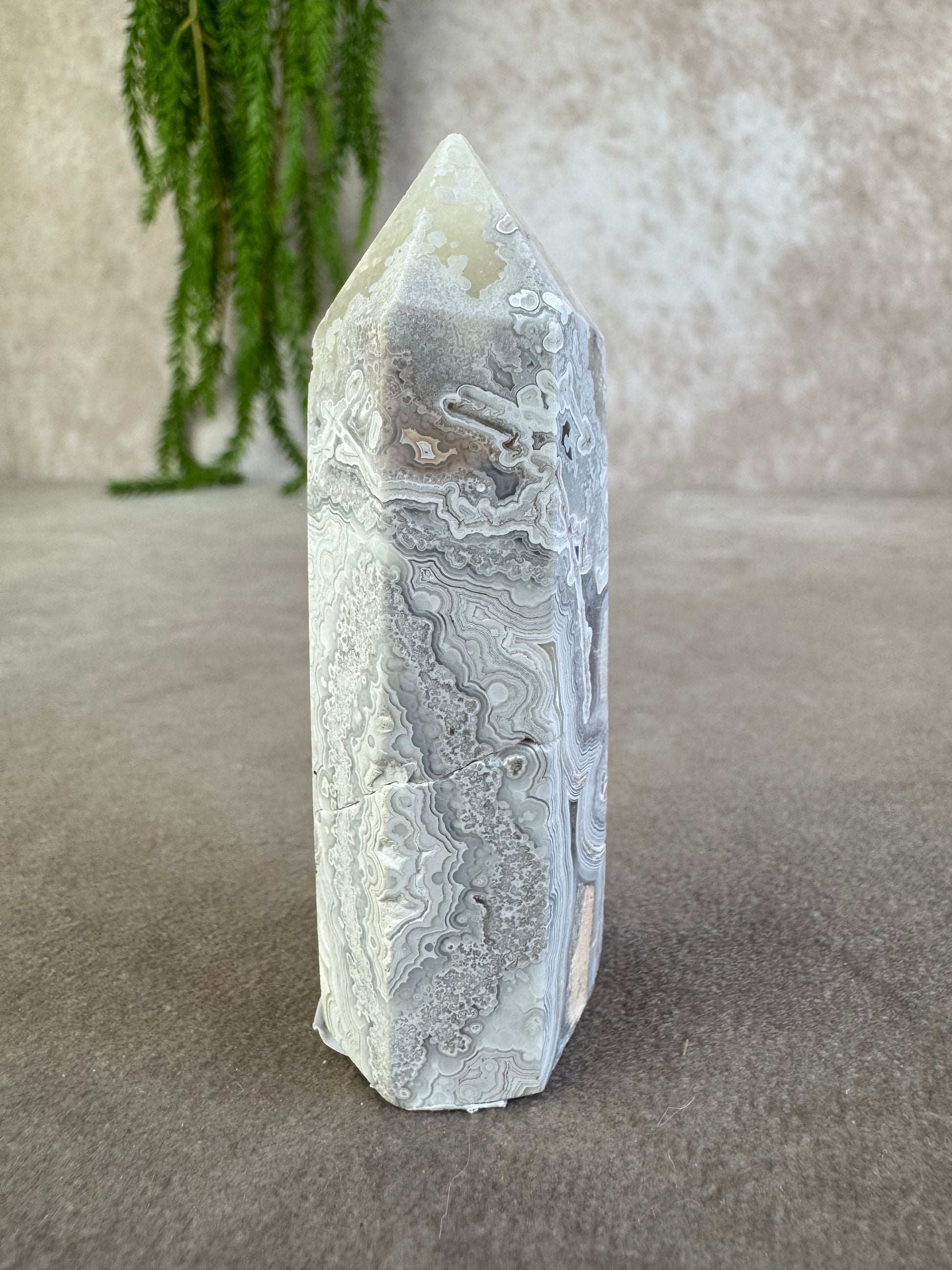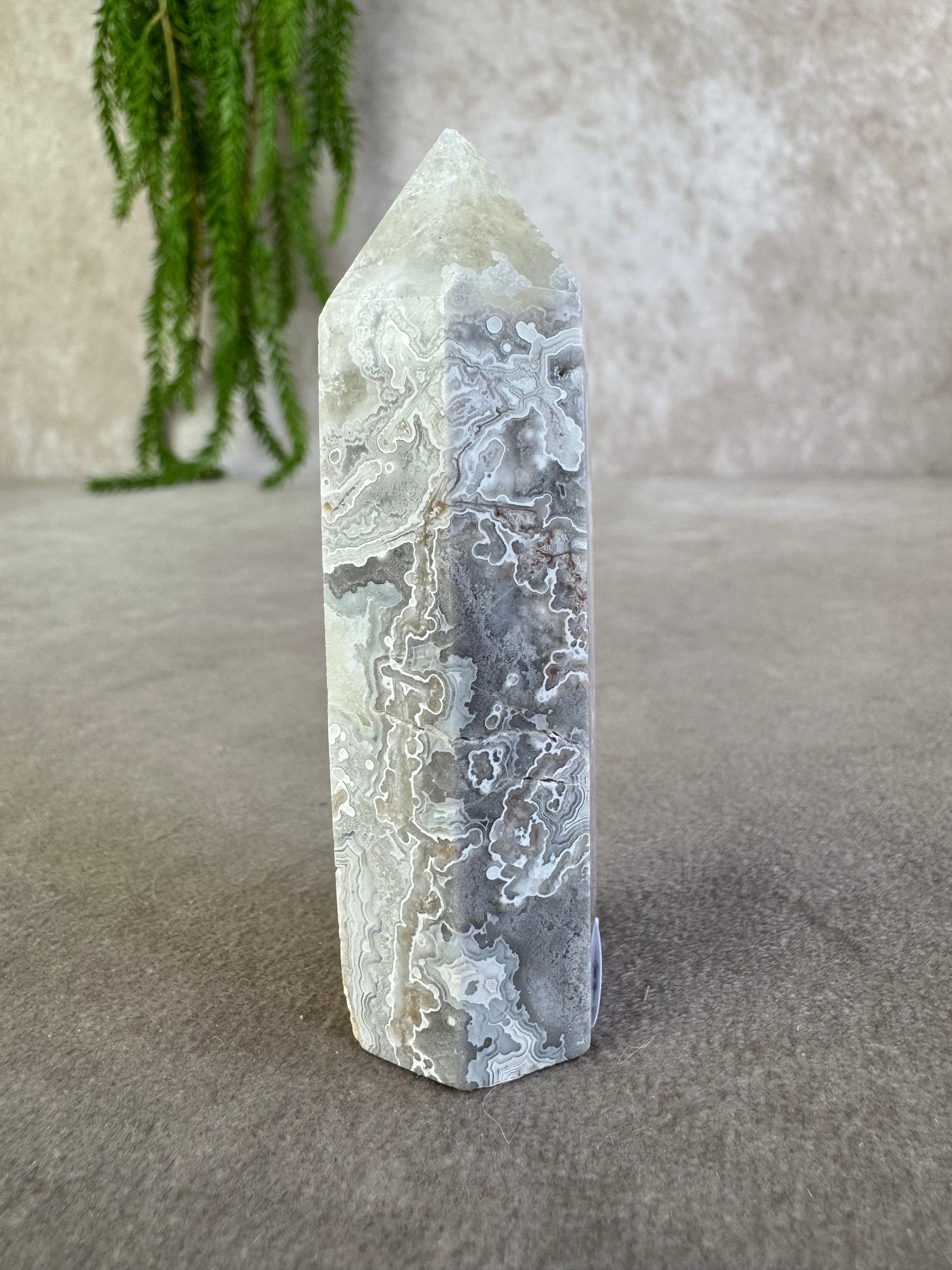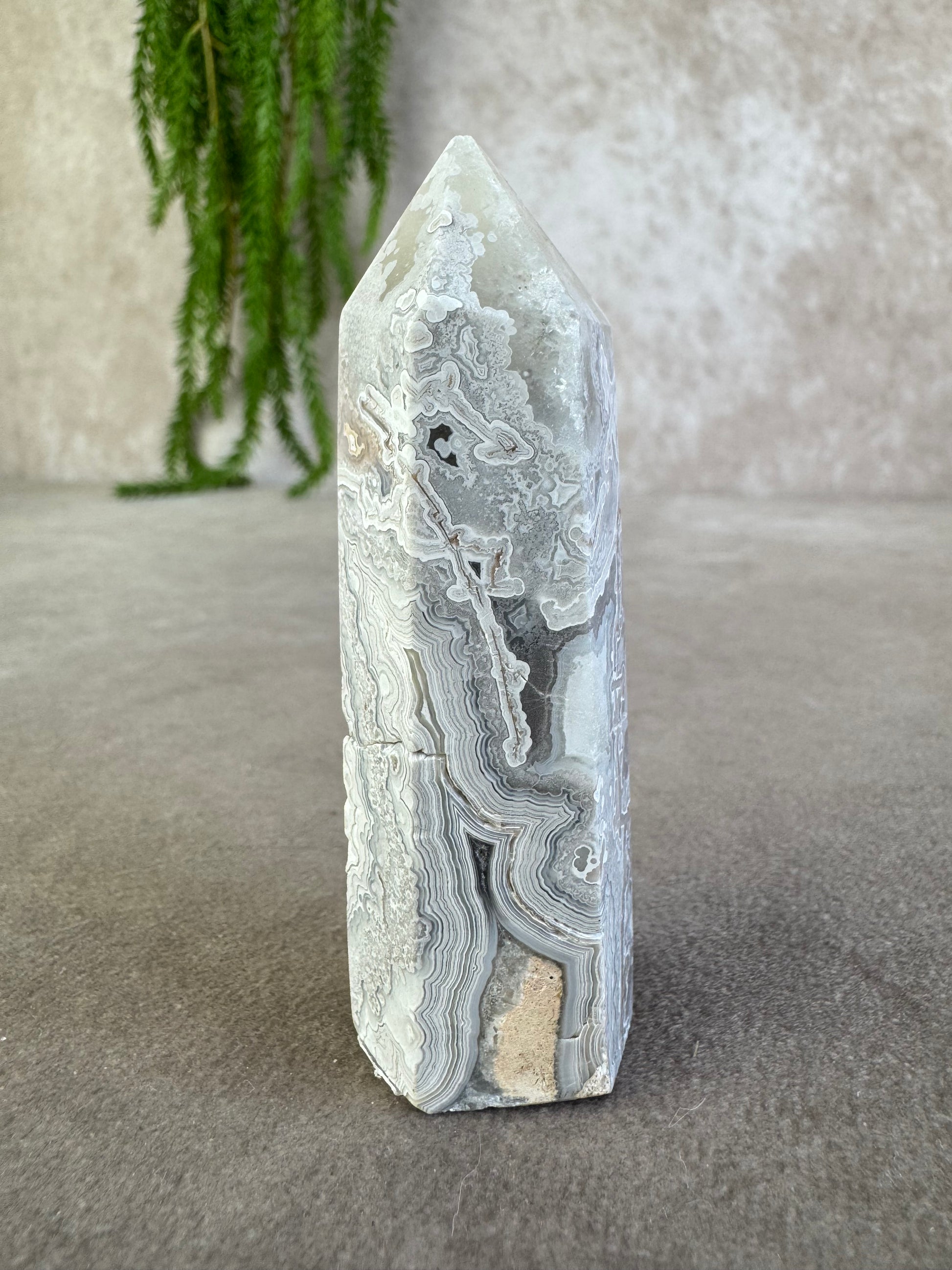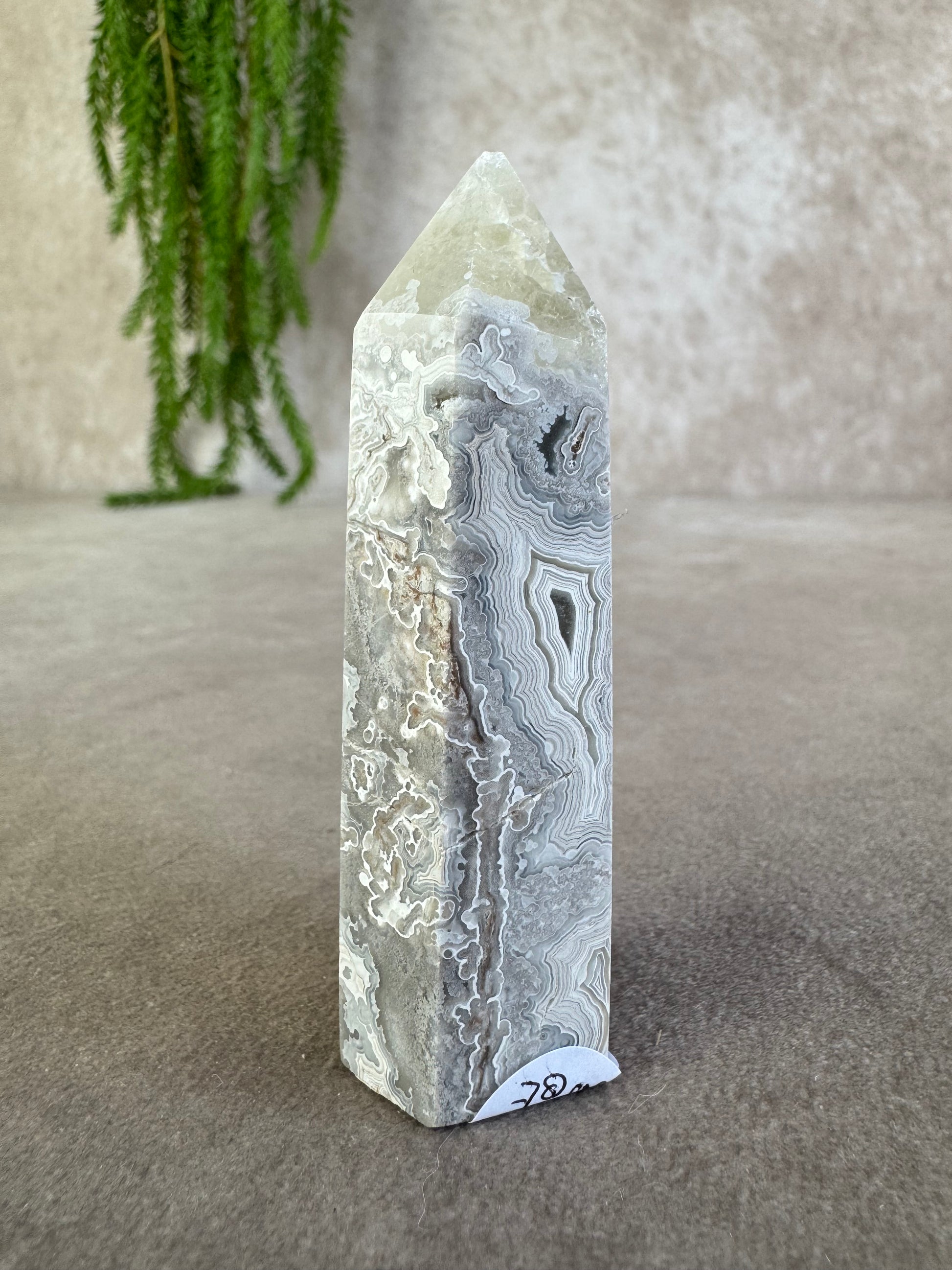 Deze elegante crazy lace agaat toren van 78 gram heeft een hoogte van 8 cm en een breedte van 2,5 cm. De steen toont prachtige grijs-witte tinten met duidelijke banding, wat hem een stijlvol en uniek karakter geeft.