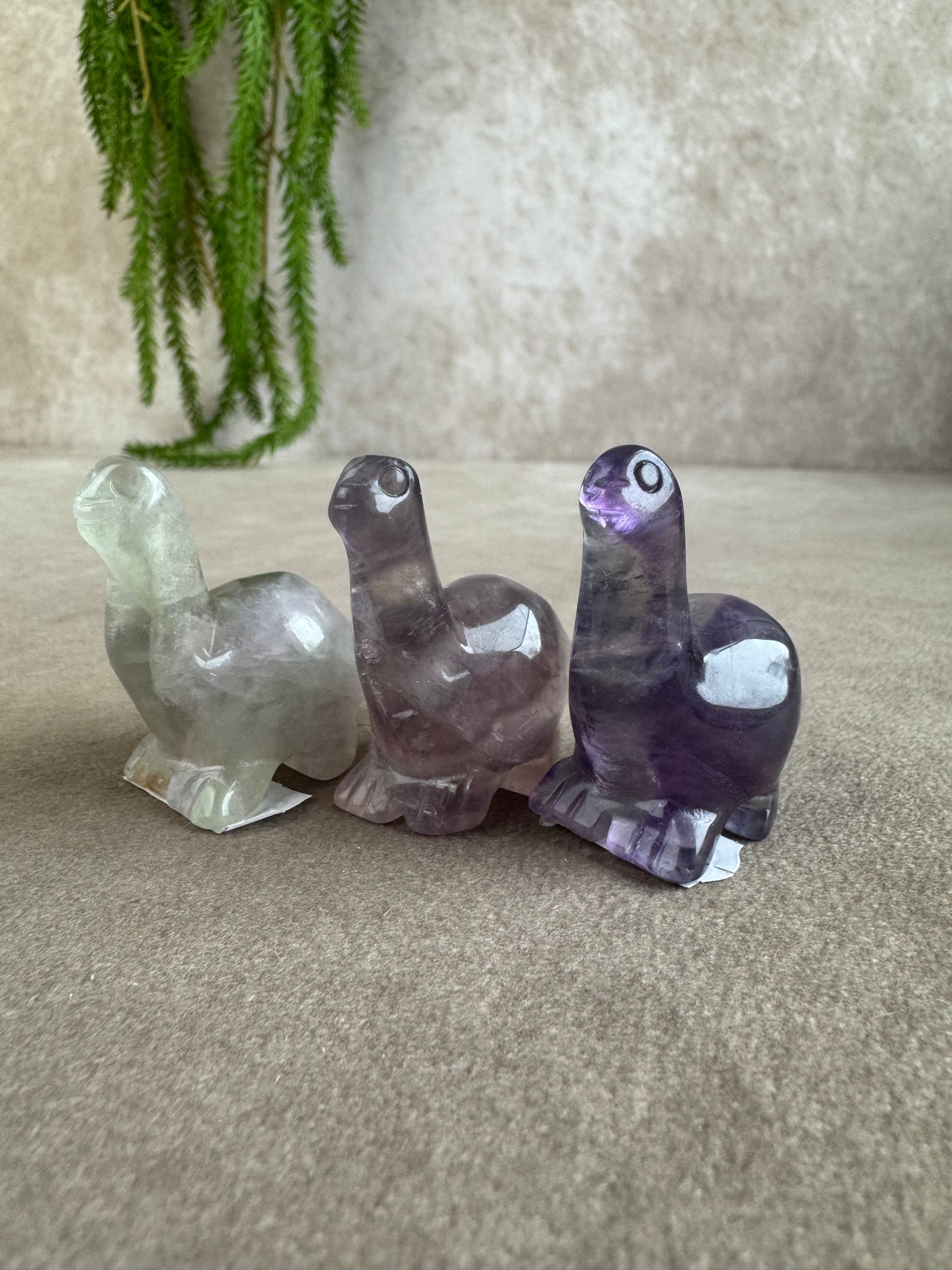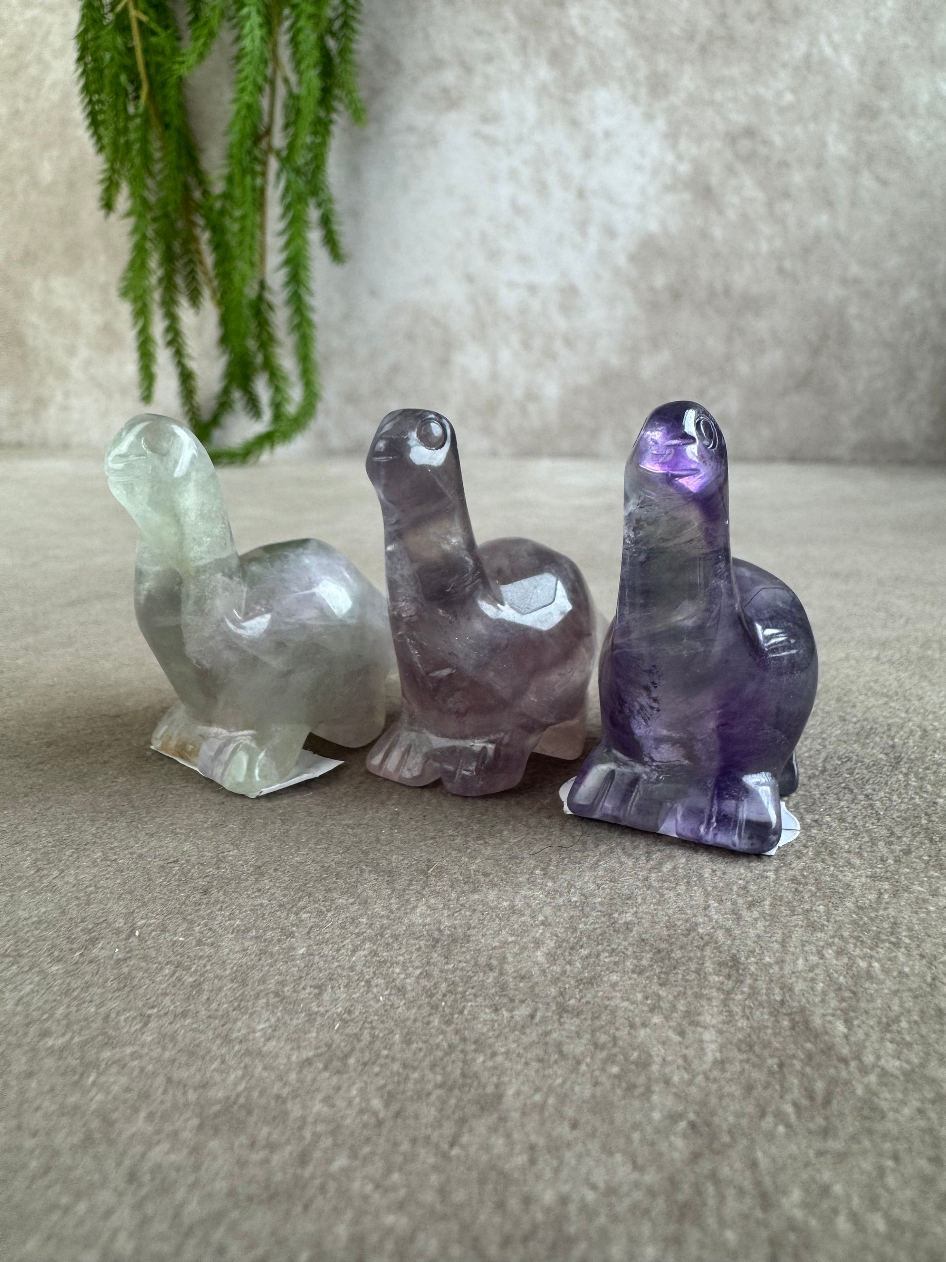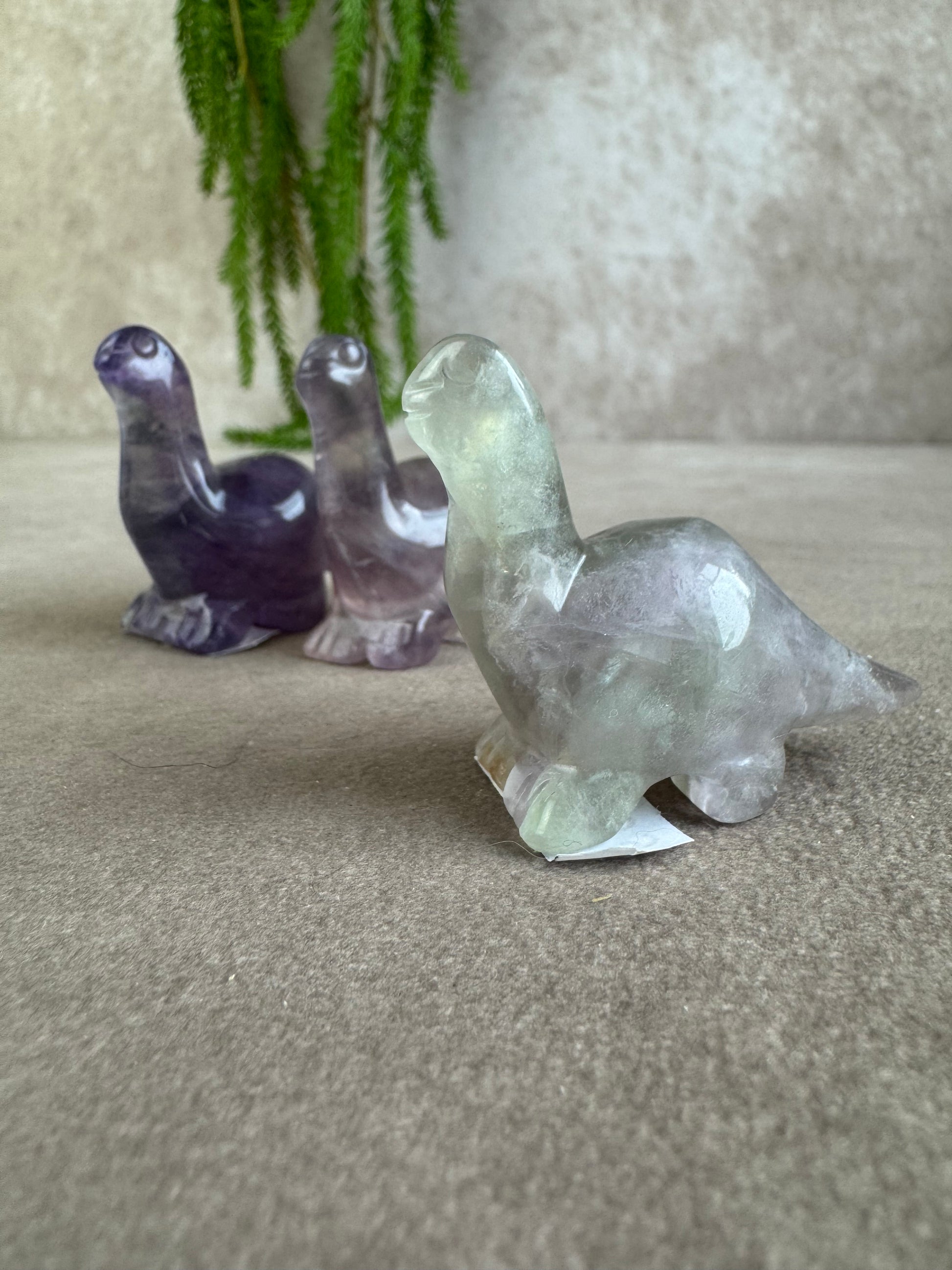 Deze prachtige dino carving is volledig uit fluoriet gesneden en heeft een hoogte van 4,7 cm. De natuurlijke kleurschakeringen van fluoriet, variërend van groen tot paars en helder, geven het beeldje een levendige en unieke uitstraling. De prachtige regenbogen maken het een opvallend en speels kunstwerkje.
