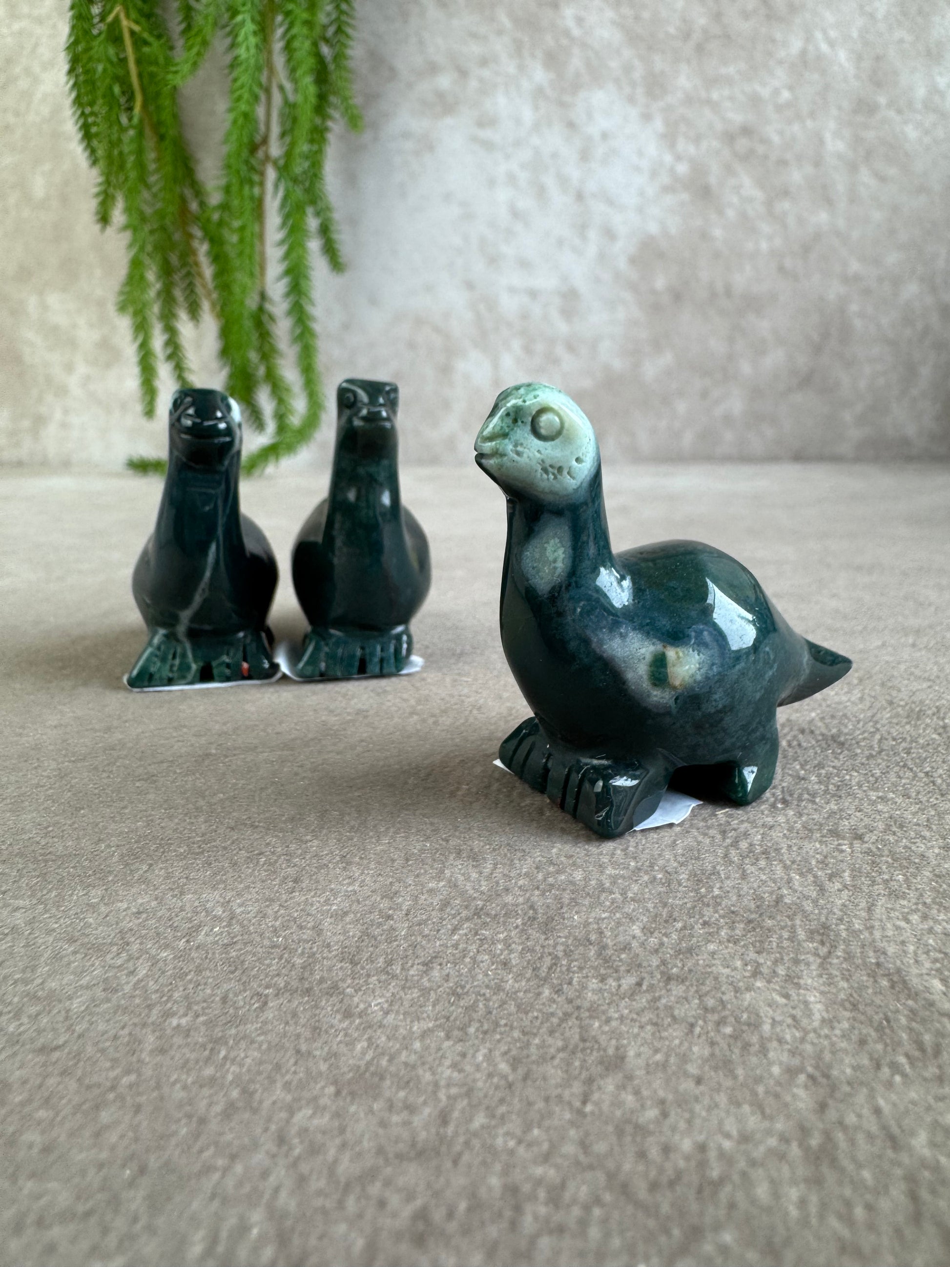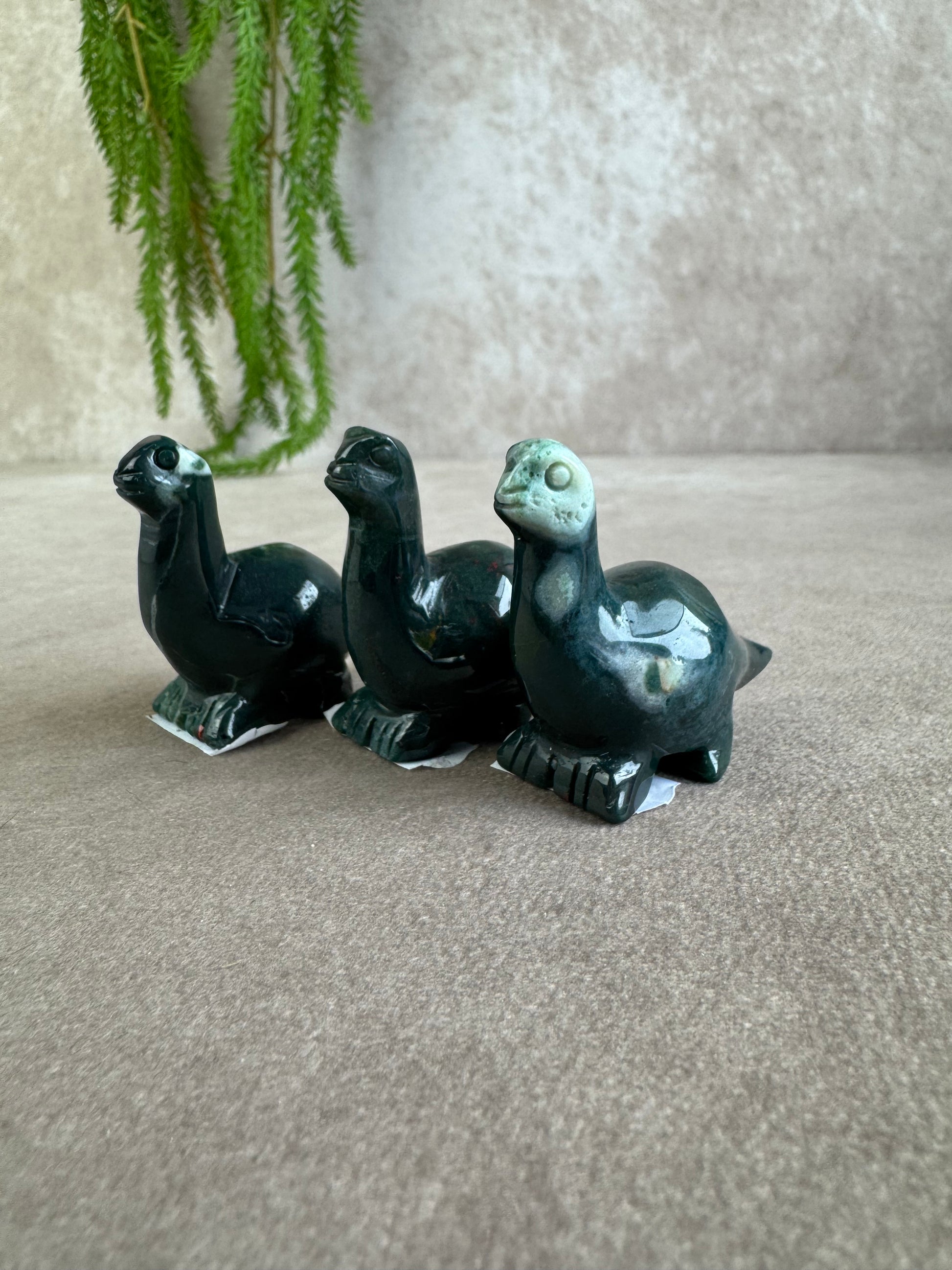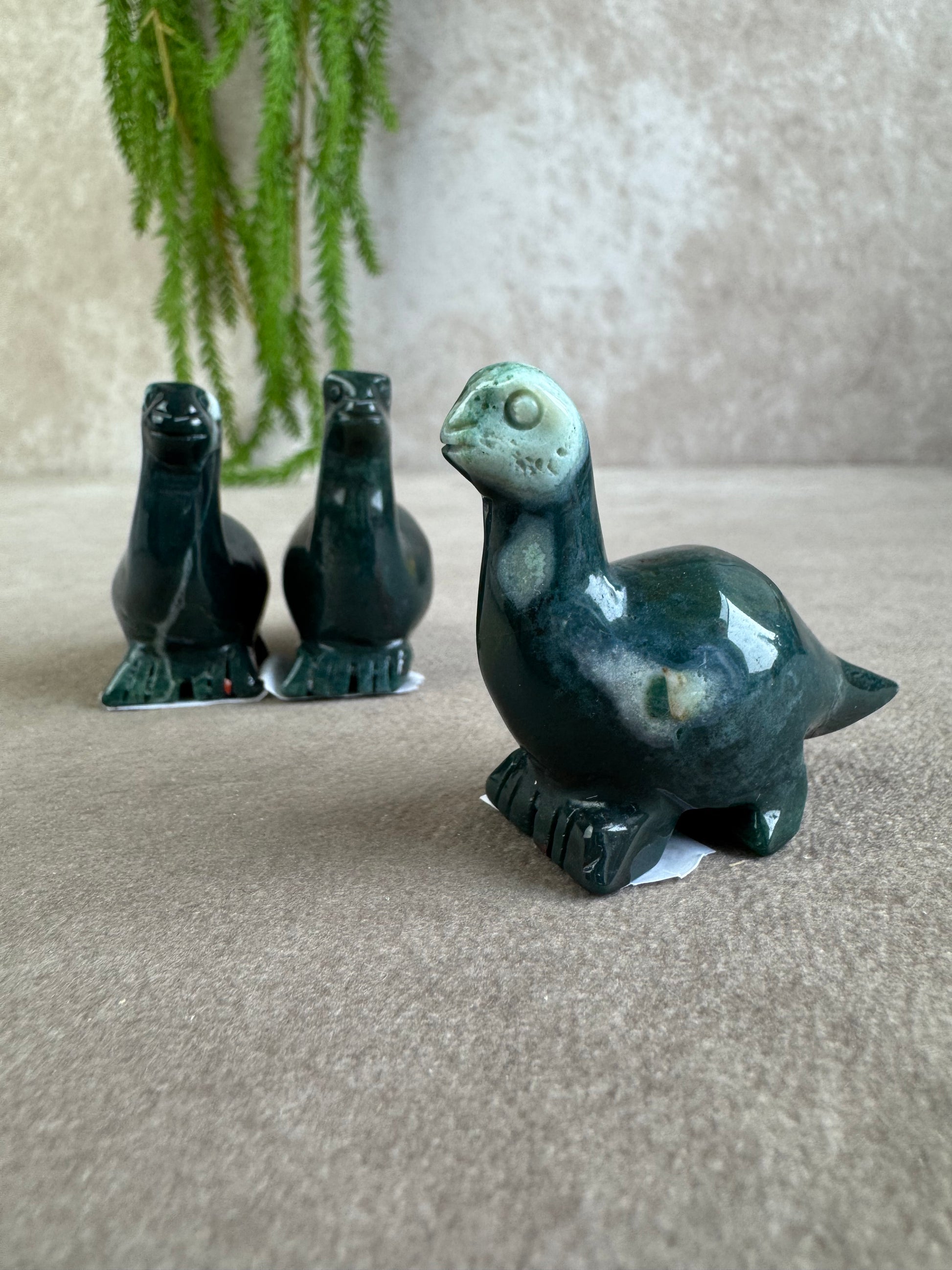 Deze bijzondere dino carving is volledig uit mosagaat gesneden en heeft een hoogte van 4,7 cm. De natuurlijke groene tinten en doorschijnende structuren van de steen geven het beeldje een levendig, bijna organisch karakter. De fijne details van het snijwerk maken de dino extra realistisch en uniek.