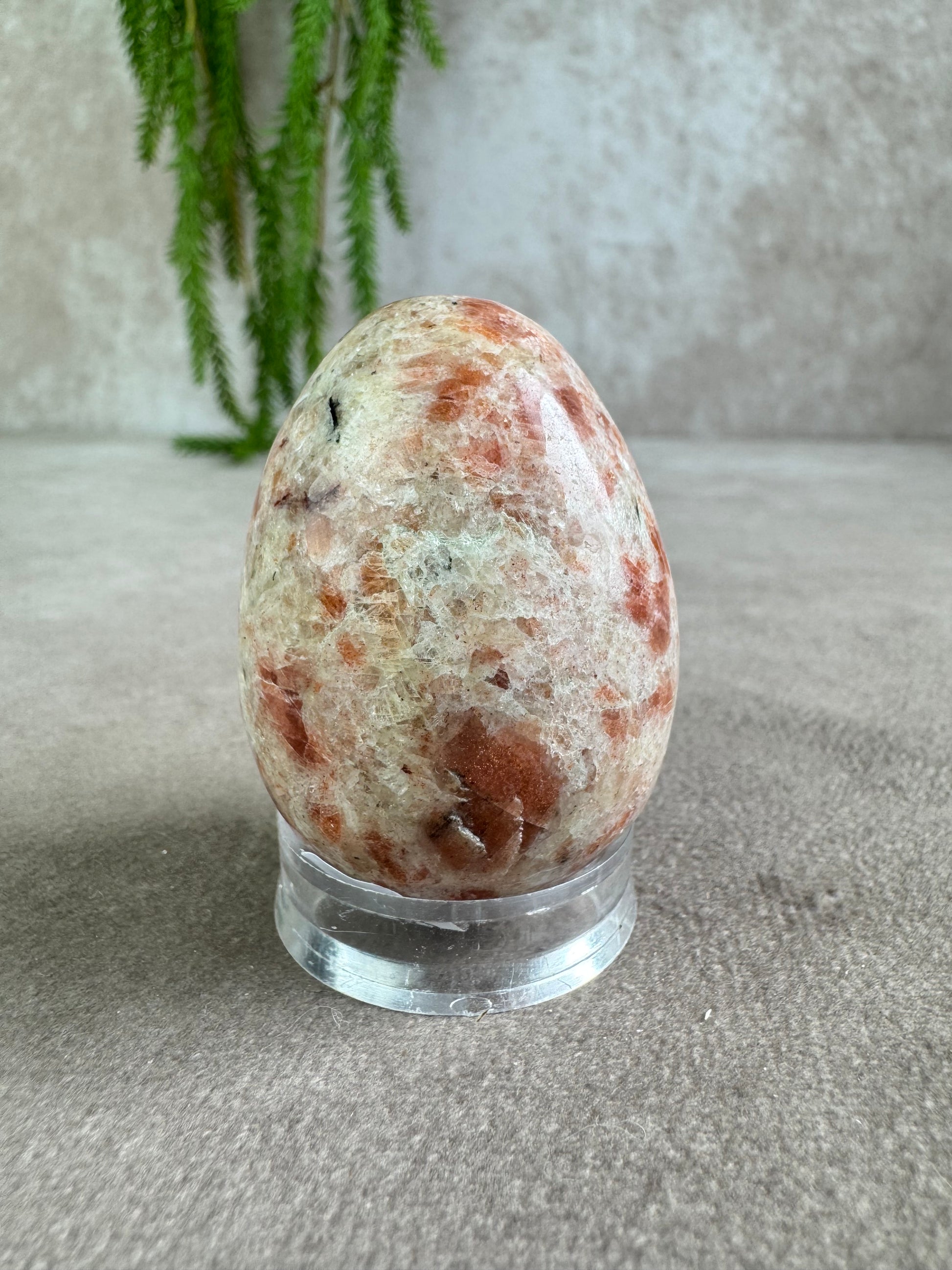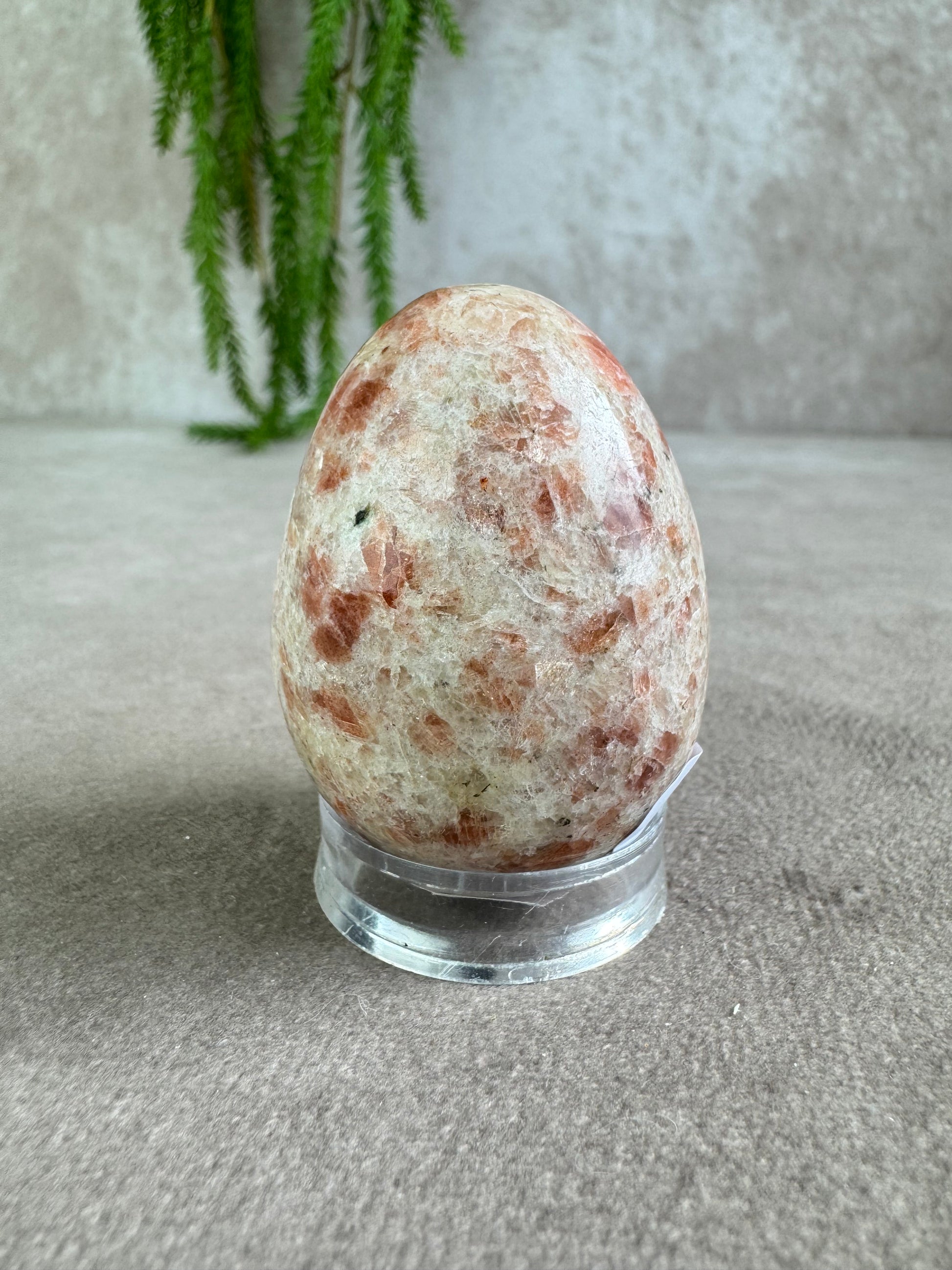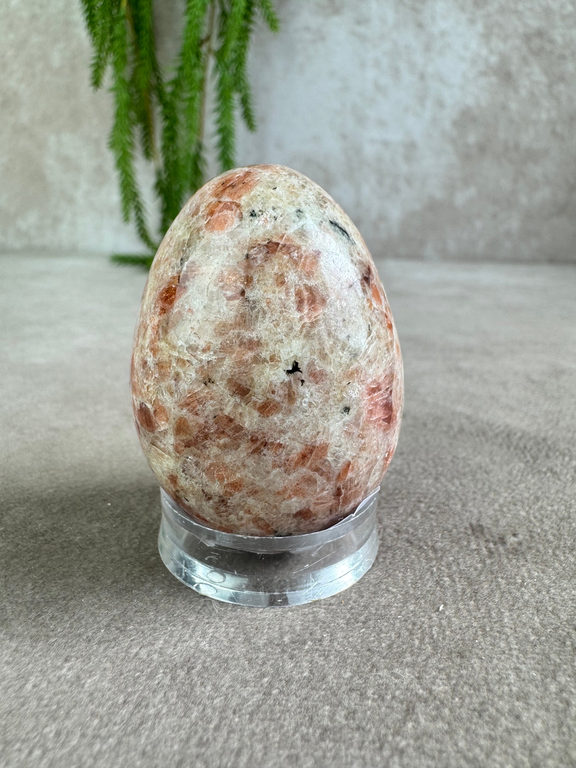 Dit prachtige ei van zonnesteen heeft een afmeting van 5cm en straalt warmte en positiviteit uit. De steen schittert met subtiele glinsteringen die het licht op een speelse manier weerkaatsen.