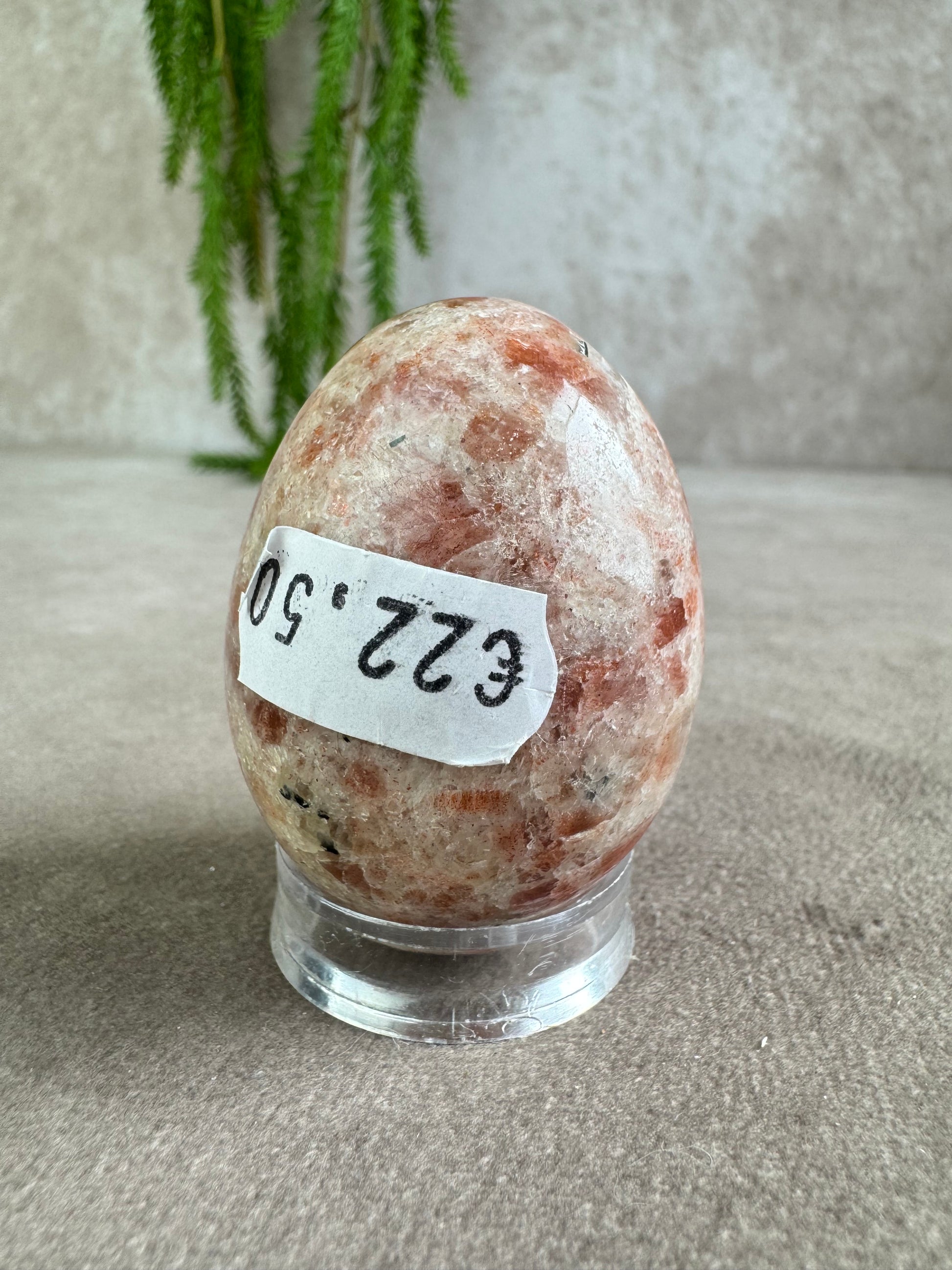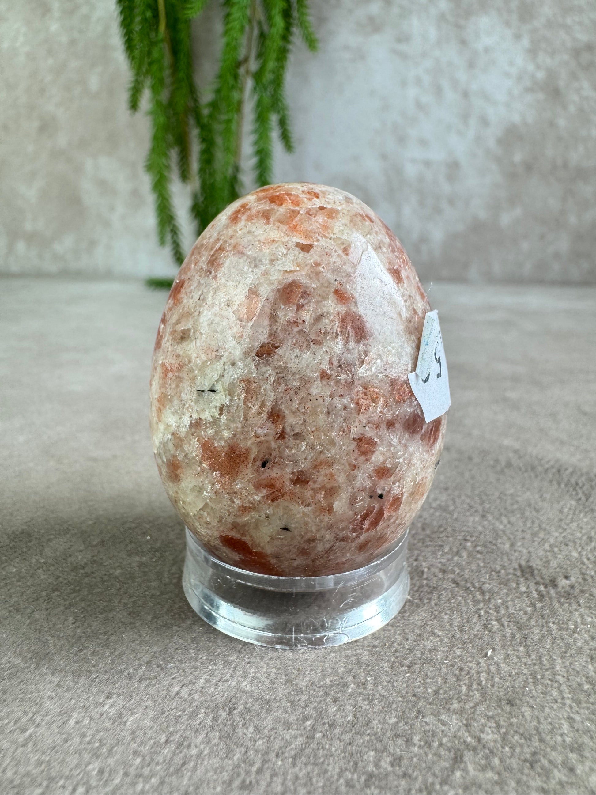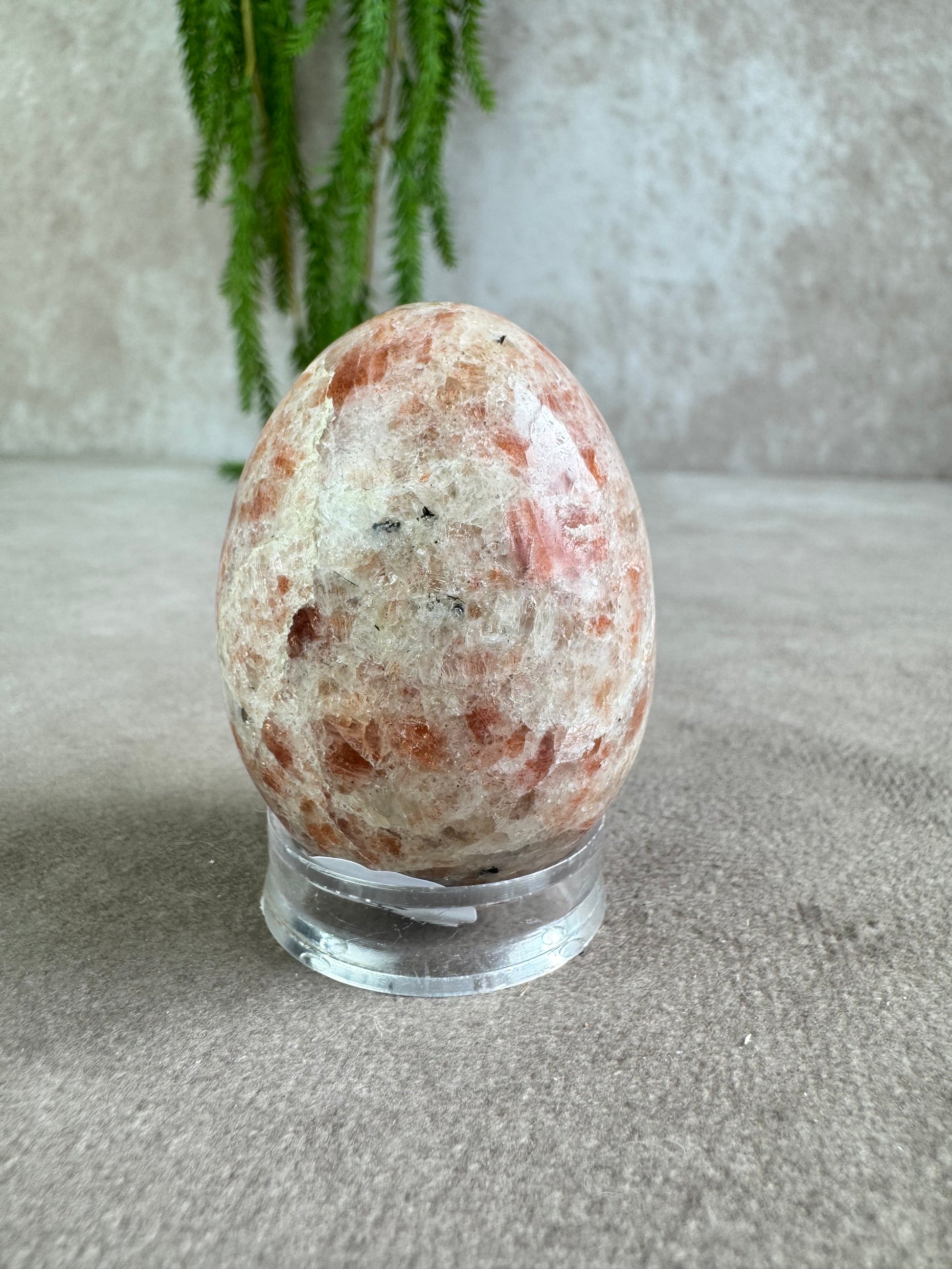Dit prachtige ei van zonnesteen heeft een afmeting van 5,3 cm en straalt warmte en positiviteit uit. De steen schittert met subtiele glinsteringen die het licht op een speelse manier weerkaatsen.