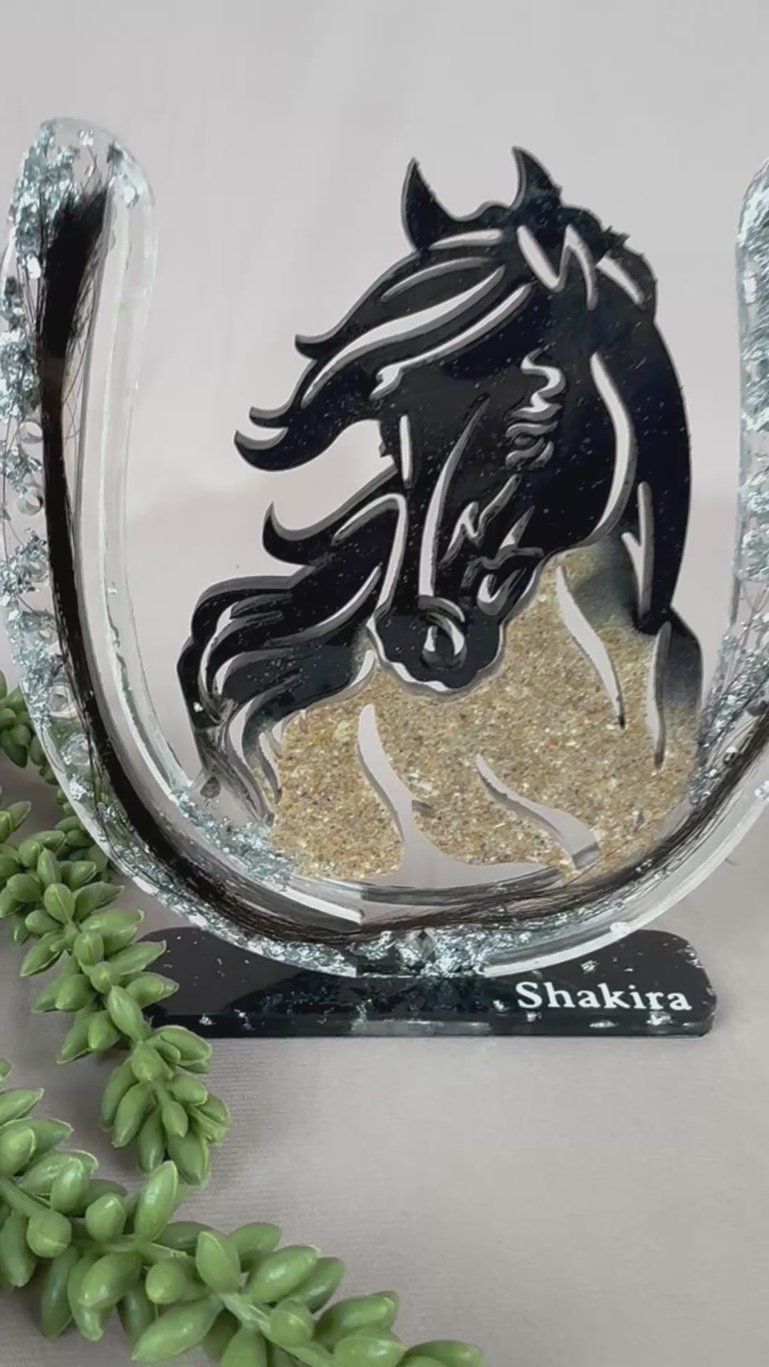 Ben je op zoek naar een prachtig aandenken aan je paard? Dit hoefijzer is de perfecte keuze. Wij kunnen er haartjes of as in verwerken, en je kunt zelfs een naam laten toevoegen. Het hoefijzer is beschikbaar in elke gewenste kleur of glitter. Na je bestelling nemen we binnen drie werkdagen contact met je op om de wensen te bespreken en het hoefijzer volledig naar jouw smaak te personaliseren. Bekijk alvast de kleuren onder het kopje kleur keuze.