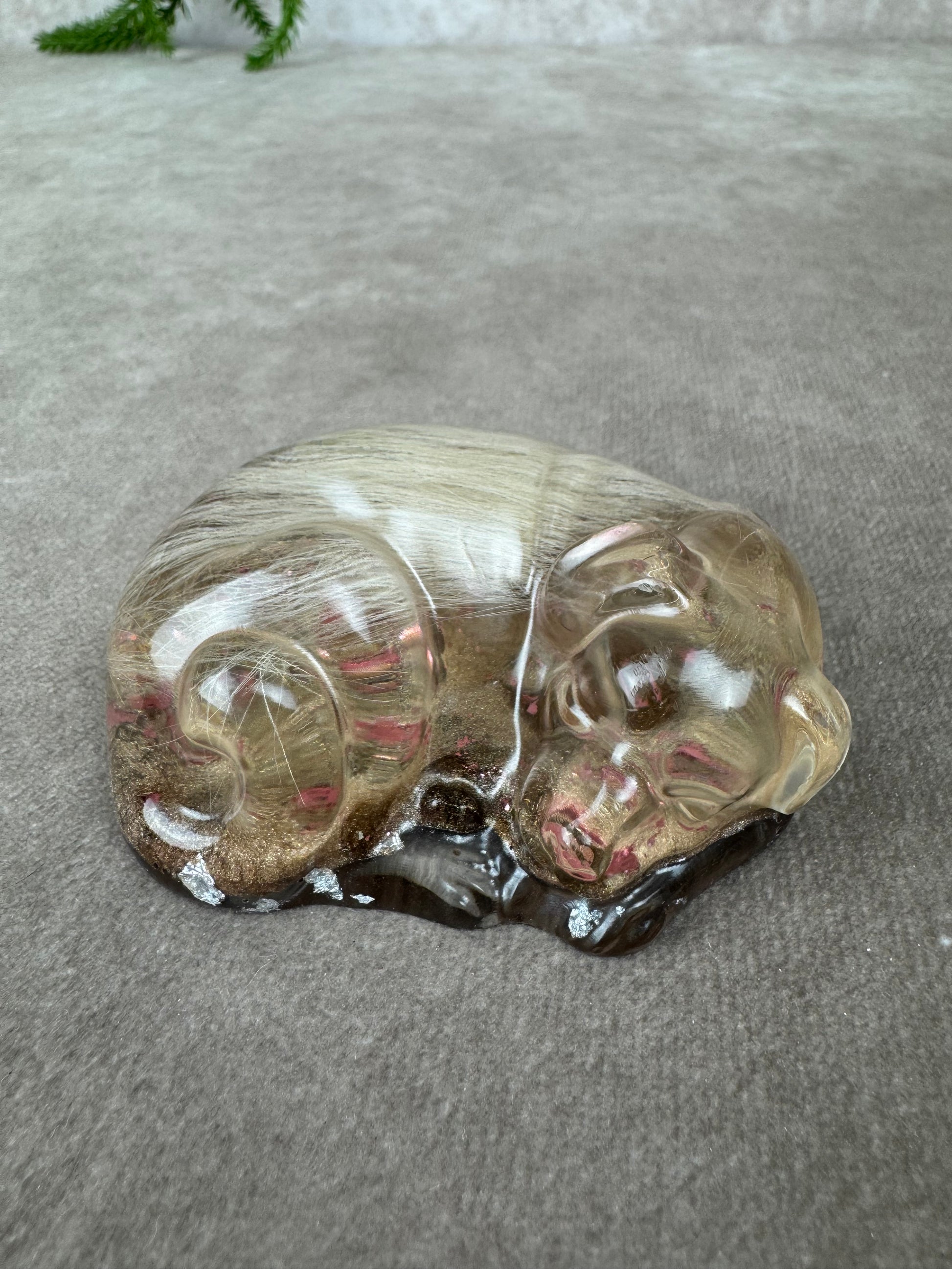 Dit schattige liggende epoxy hondje van ongeveer 8 cm lang wordt volledig op maat en naar wens gemaakt. Elk detail kan worden toegevoegd van haren, as of tandjes tot kleine persoonlijke herinneringen zodat het een waardevol en tastbaar aandenken wordt.