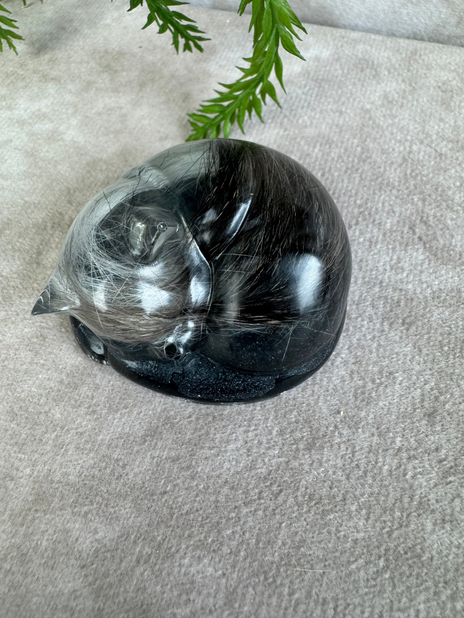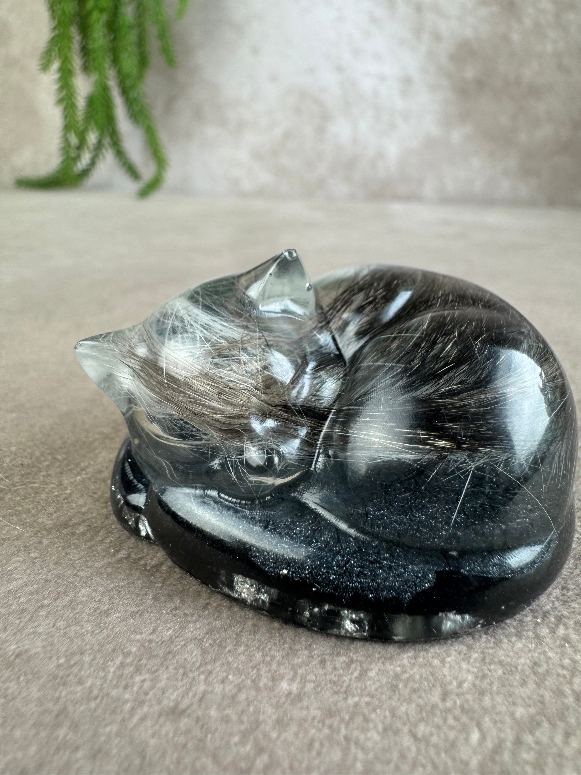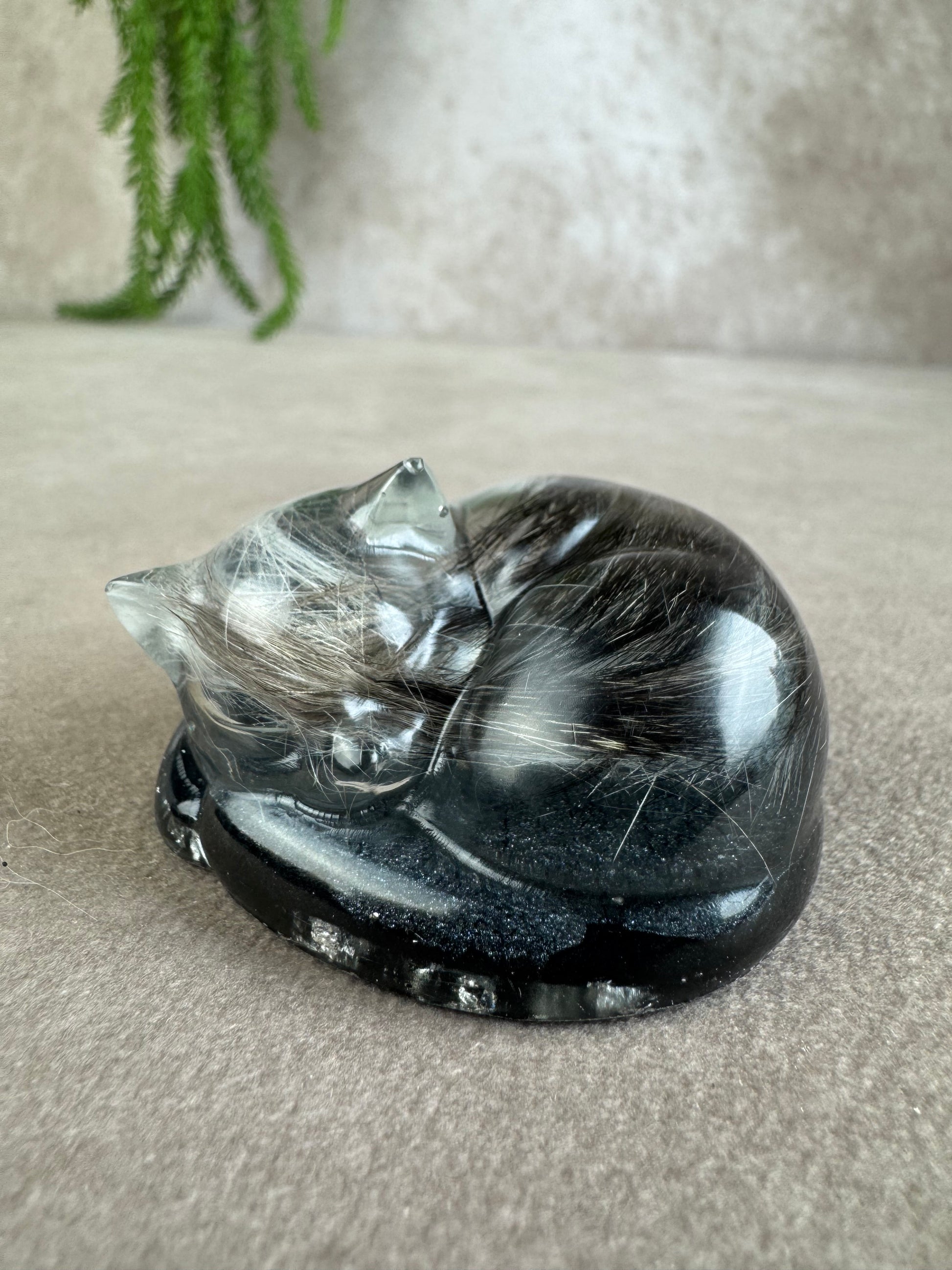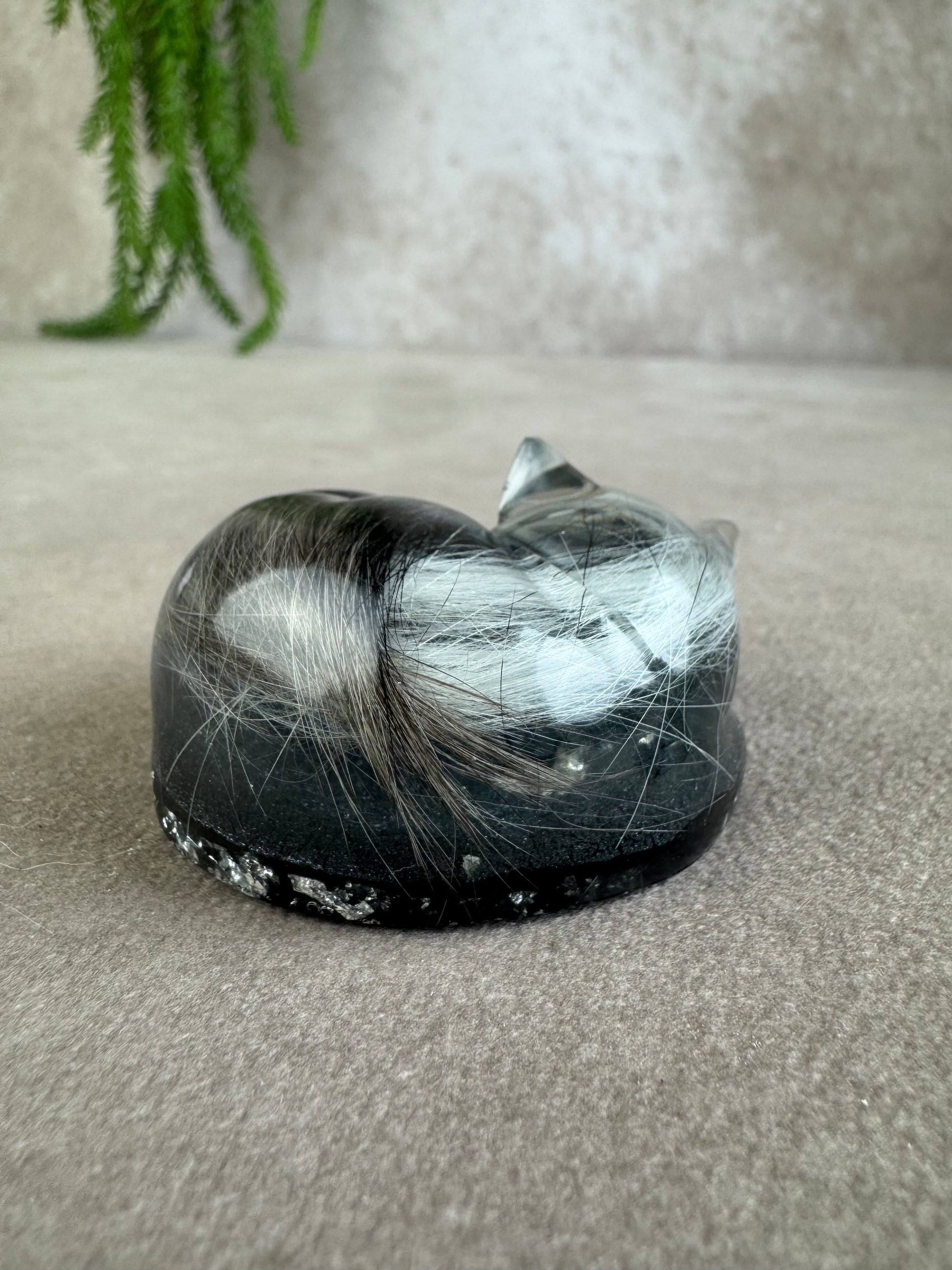 Dit schattige liggende epoxy katje van ongeveer 8 cm lang wordt volledig op maat en naar wens gemaakt. Elk detail kan worden toegevoegd van haren, as of tandjes tot kleine persoonlijke herinneringen zodat het een waardevol en tastbaar aandenken wordt.