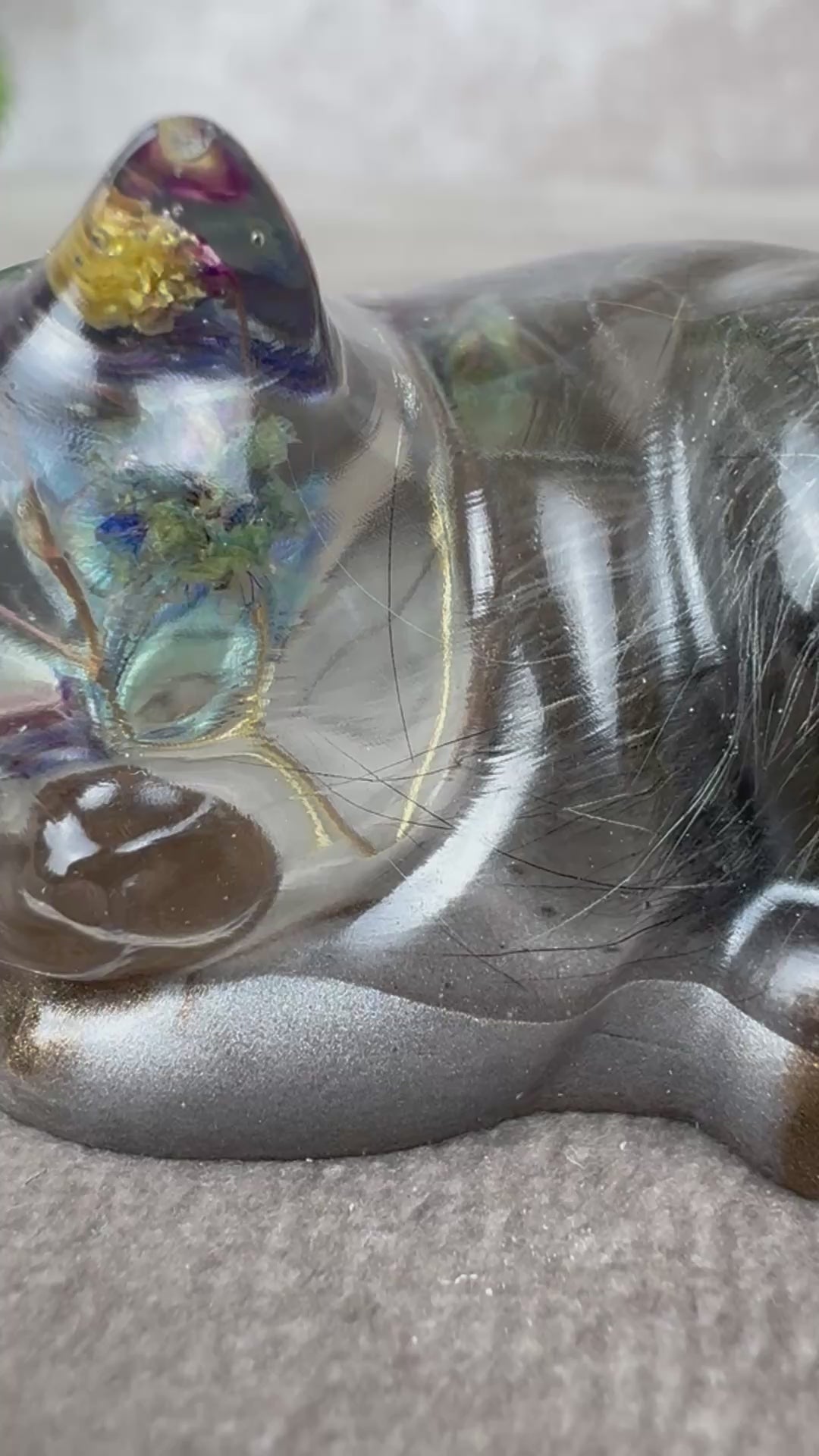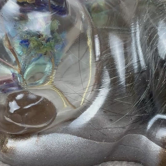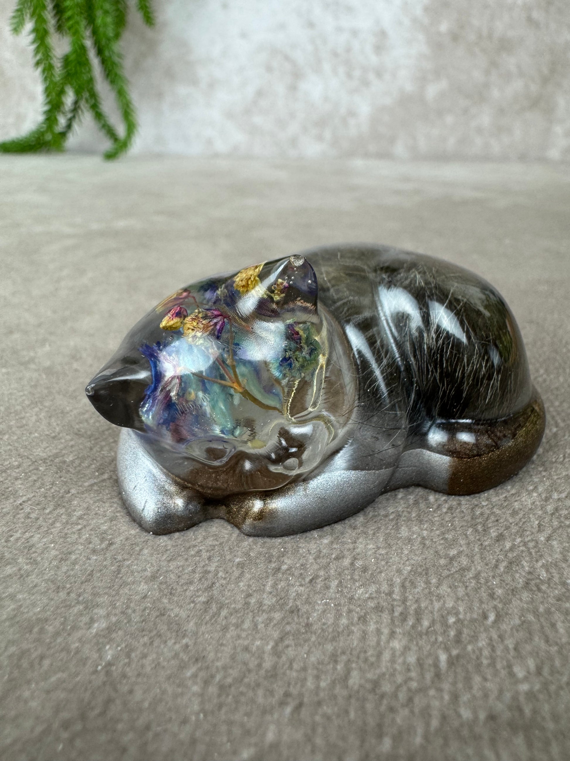 Dit schattige liggende epoxy katje van ongeveer 8 cm lang wordt volledig op maat en naar wens gemaakt. Elk detail kan worden toegevoegd van haren, as of tandjes tot kleine persoonlijke herinneringen zodat het een waardevol en tastbaar aandenken wordt.