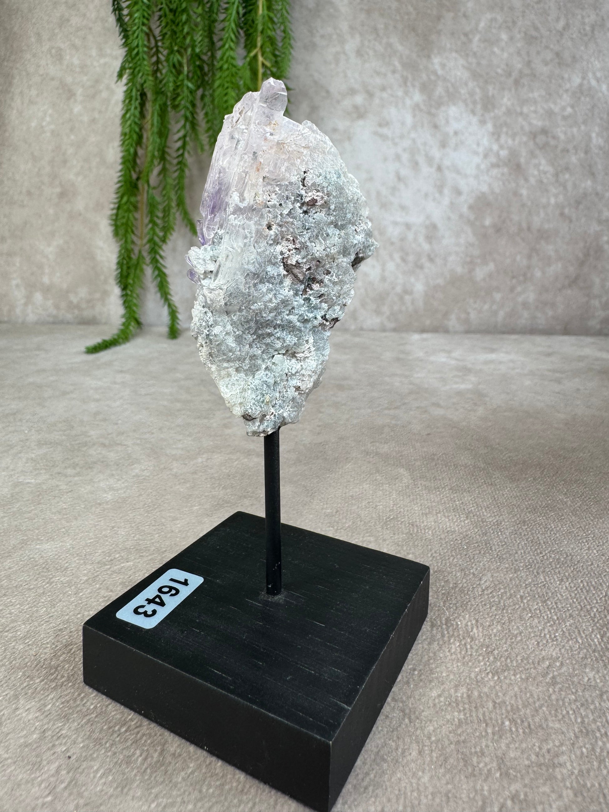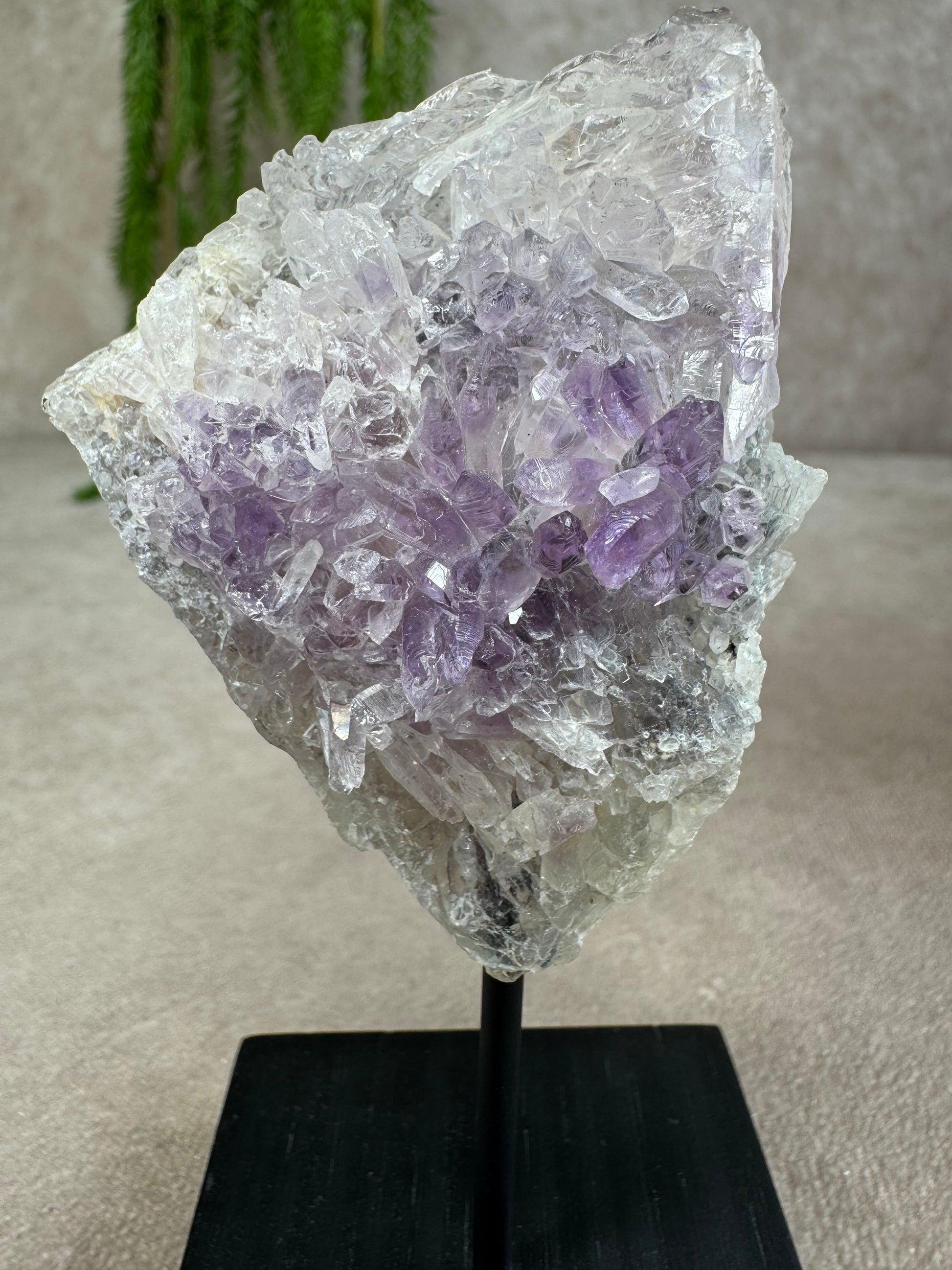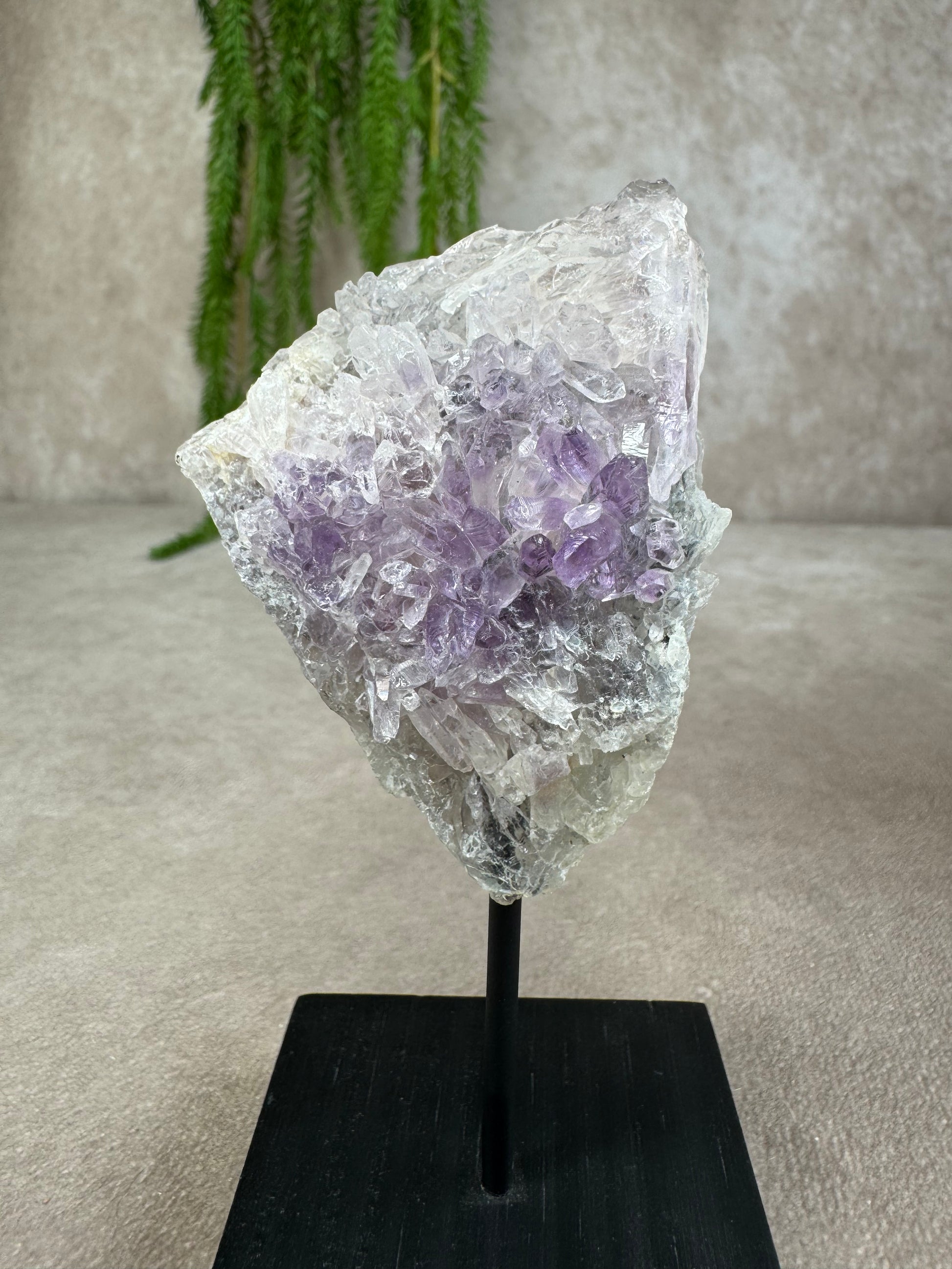 Deze prachtige flower amethist is een elegant stuk van 12,5 cm hoog en 5,8 cm breed, geplaatst op een zwarte standaard die het natuurlijke karakter van de steen perfect benadrukt. De steen toont bloemachtige patronen in zachte paarse en lavendeltinten, met verfijnde kristalstructuren die subtiel fonkelen in het licht.