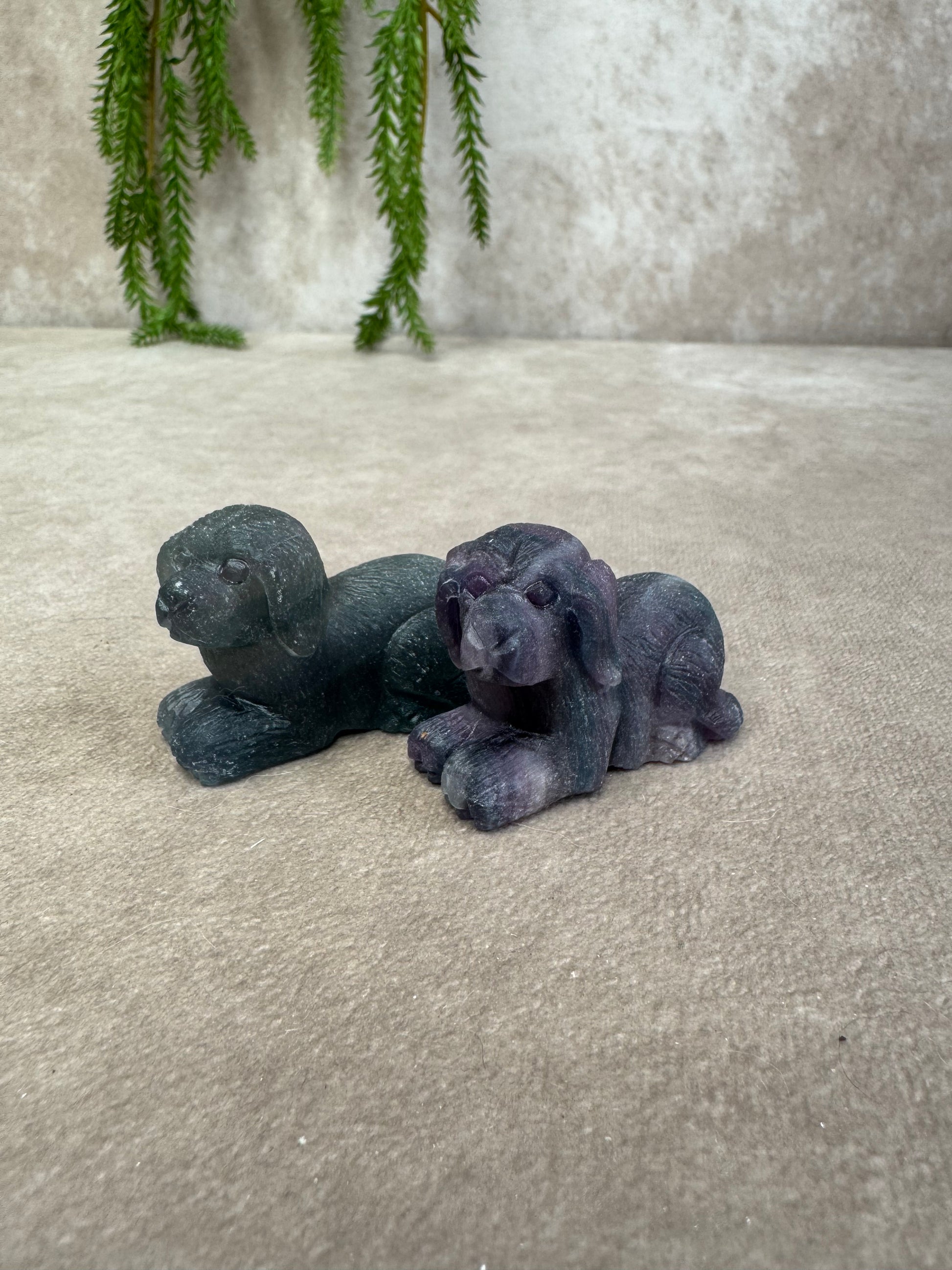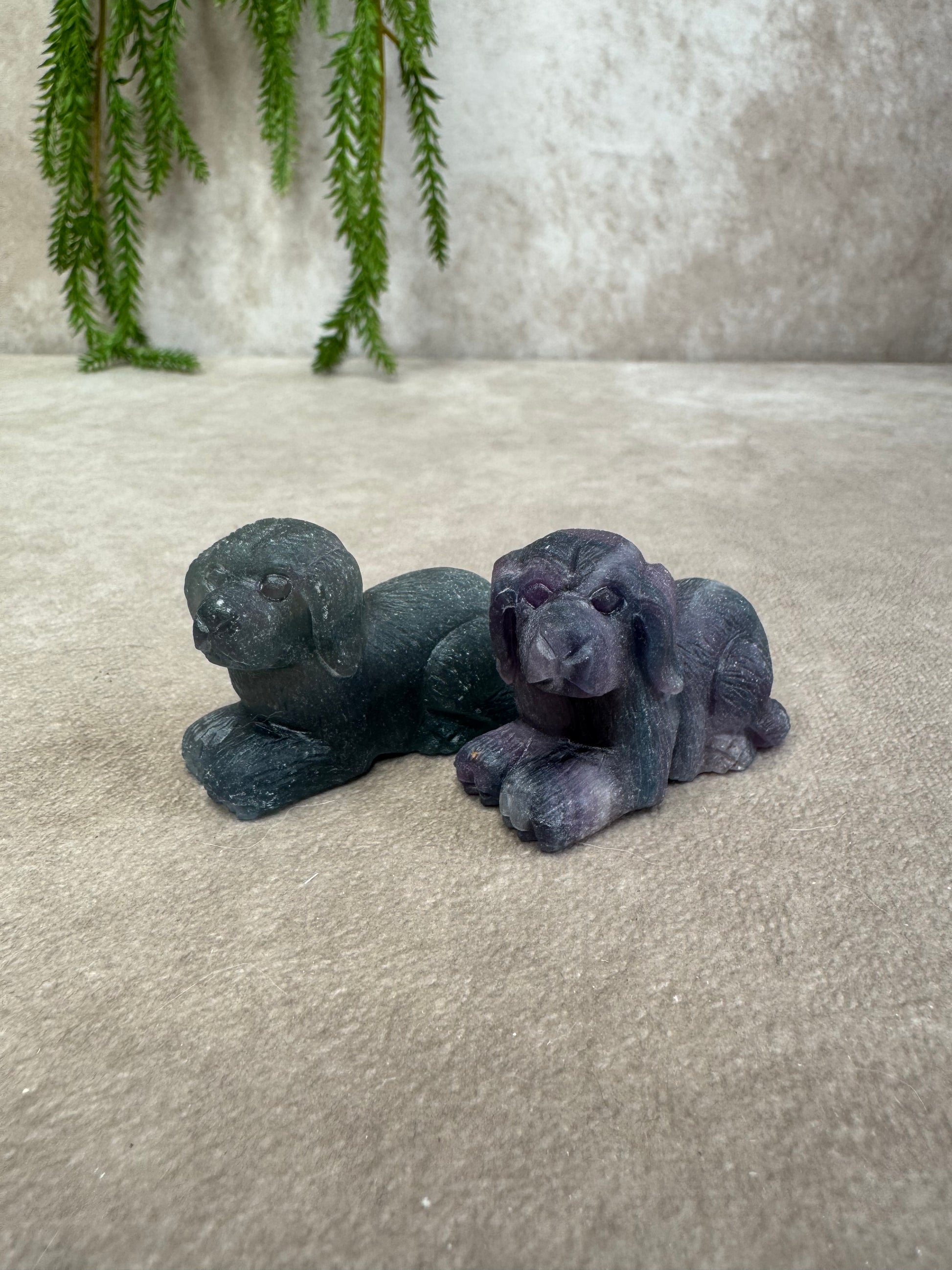 Deze handgesneden liggende hond van fluoriet is een prachtig en liefdevol beeldje met groene, paarse en transparante tinten die natuurlijk in elkaar overlopen. Het stuk is 3,5 cm hoog en 4,8 cm breed, en straalt rust en trouw uit.