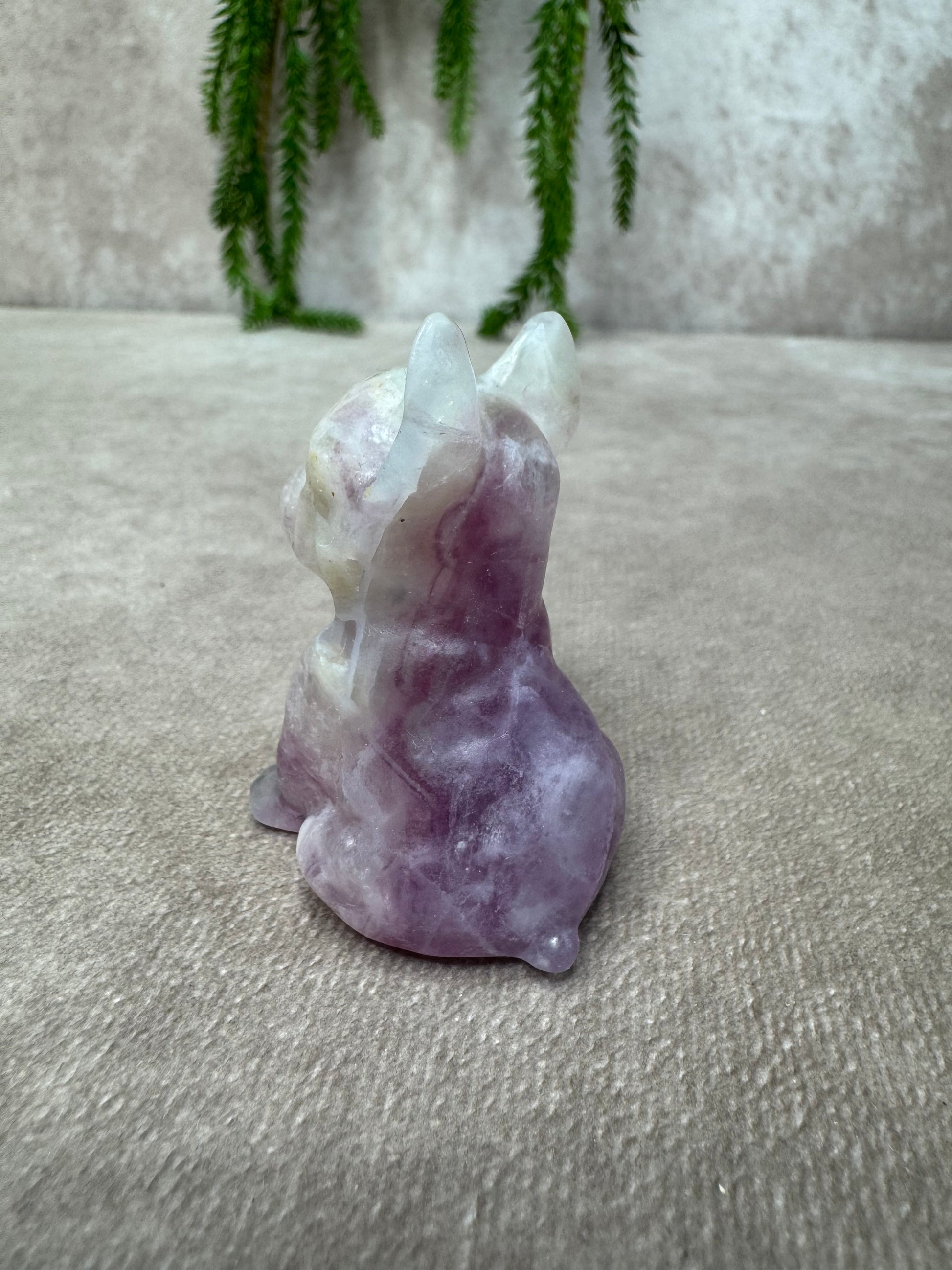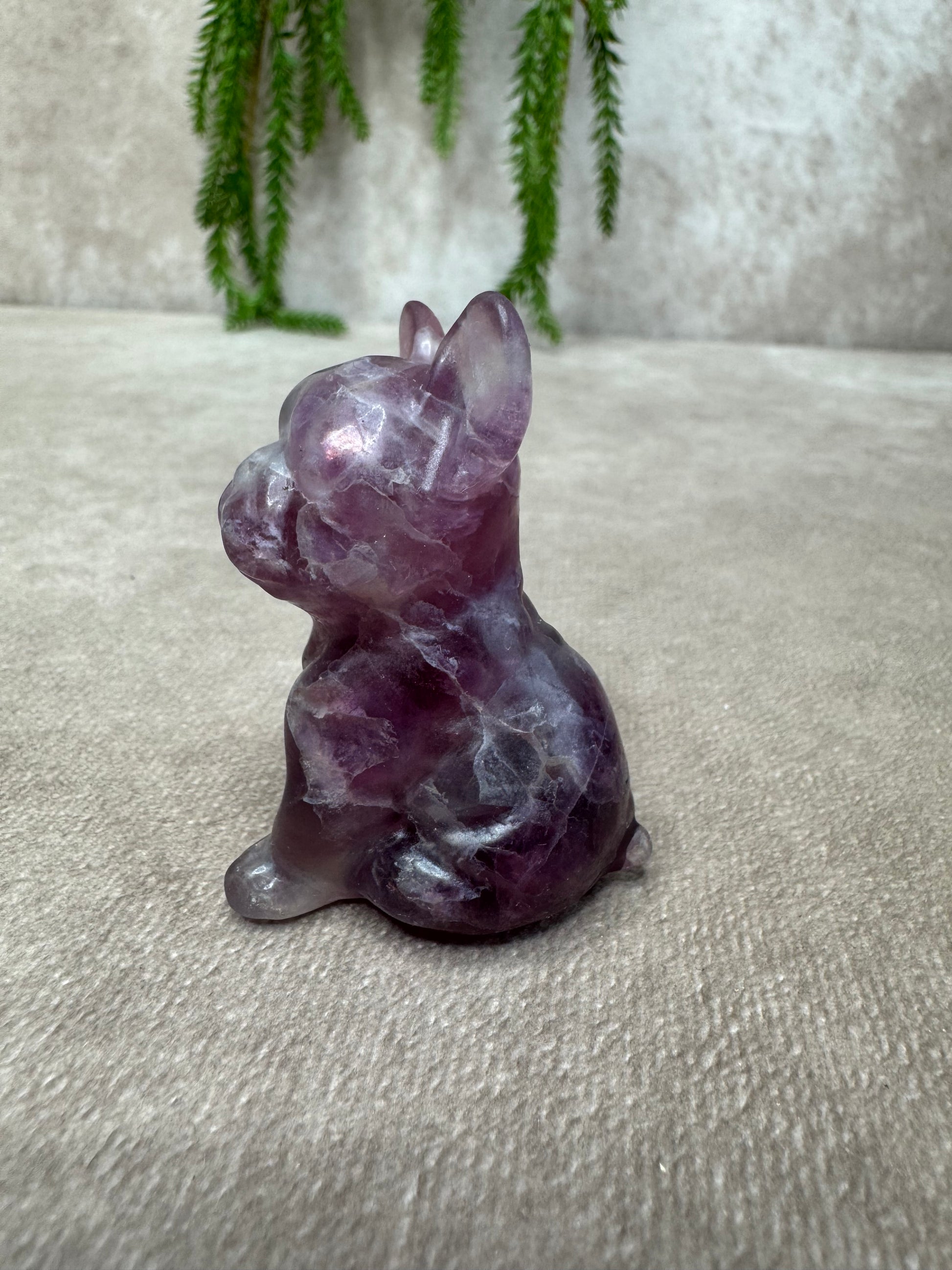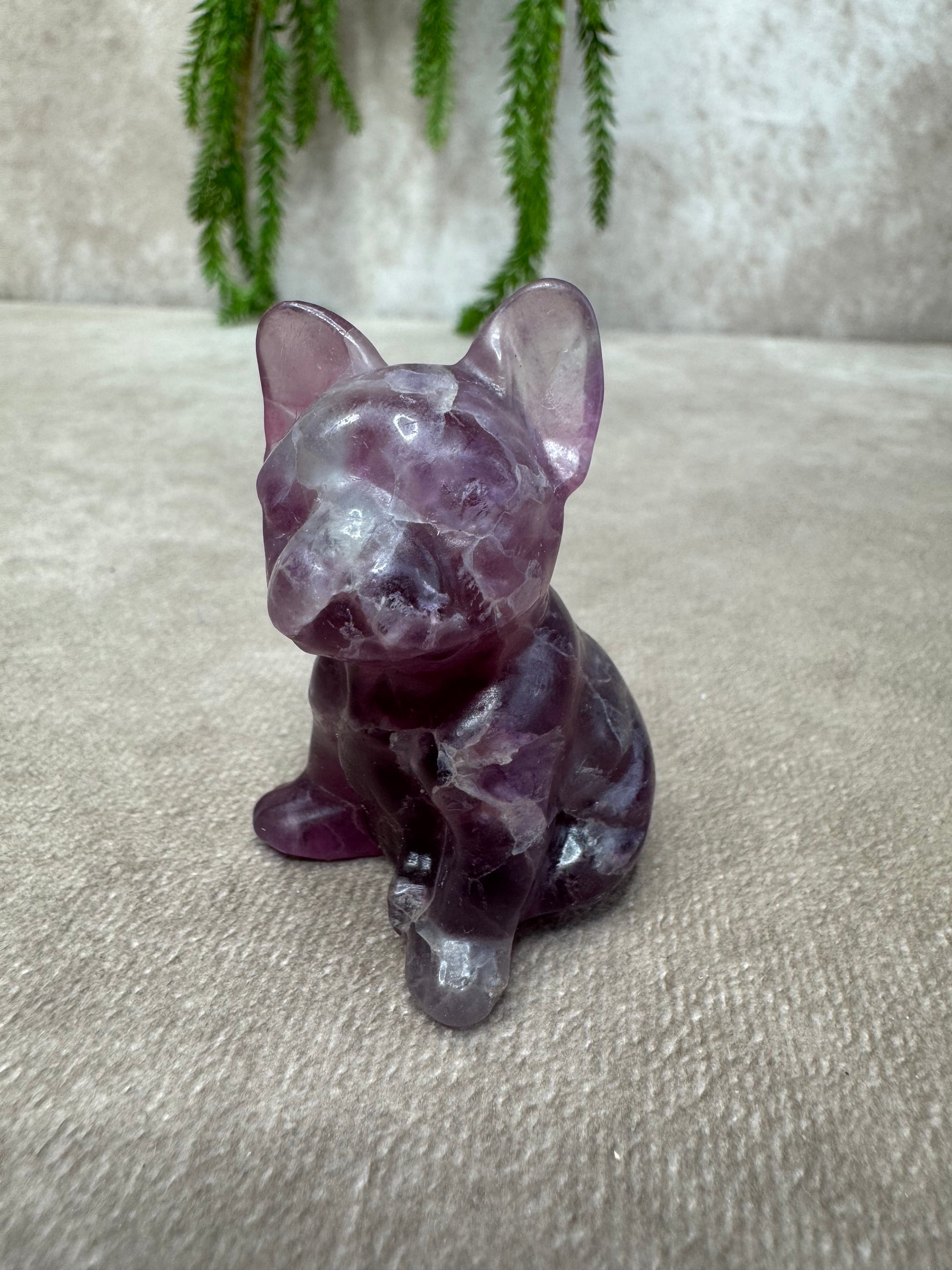 Deze prachtige Franse bulldog van fluoriet is met veel detail handgesneden en straalt karakter en charme uit. Het beeldje is 5,6 cm hoog en heeft betoverende paarse tinten met subtiele natuurlijke kleurnuances.