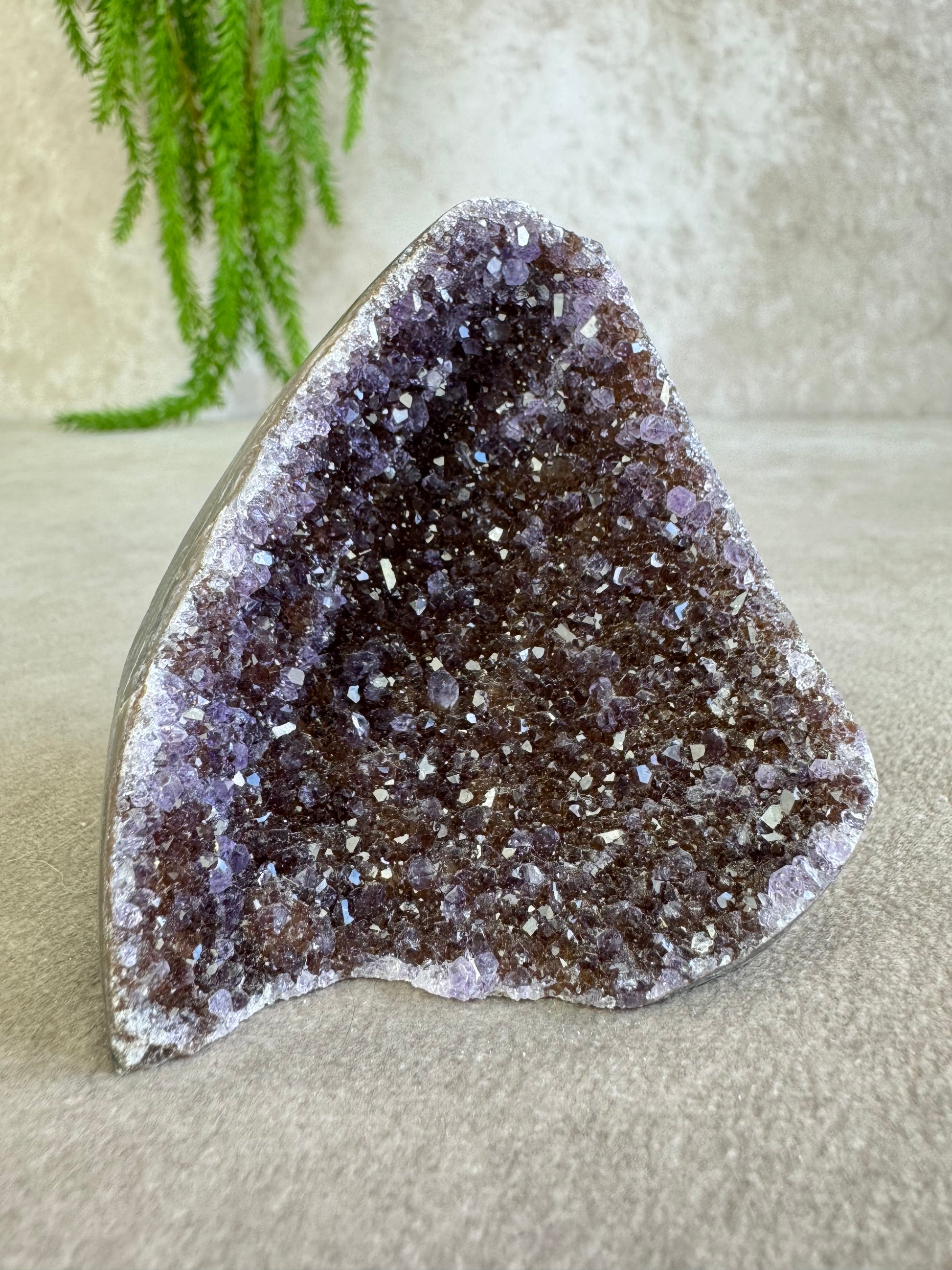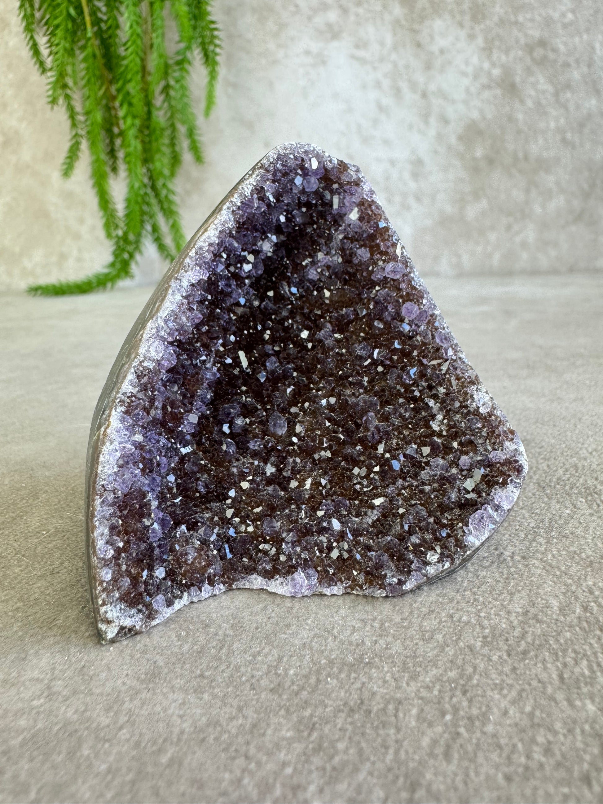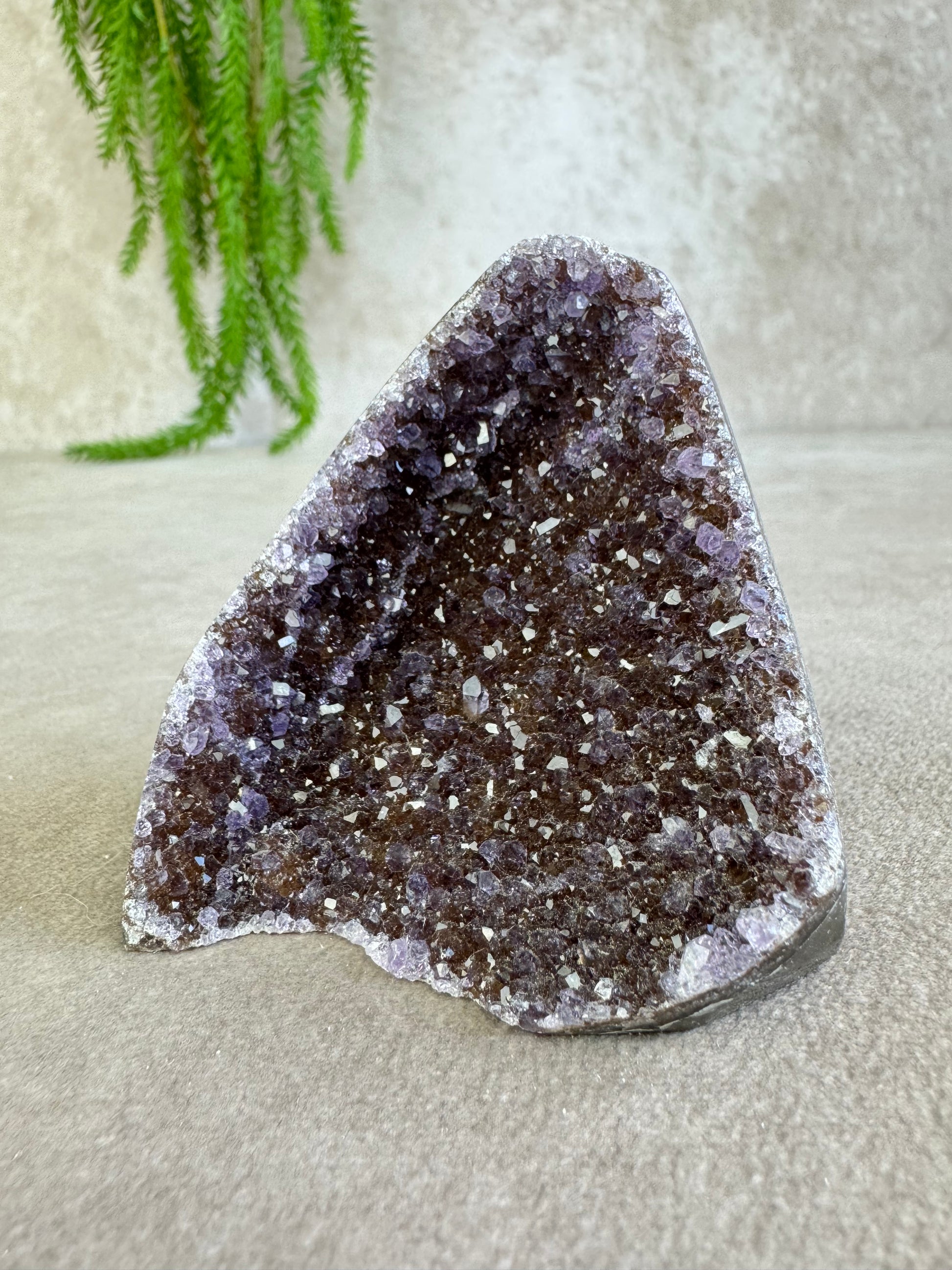 De combinatie van sprankeling en rijke kleur geeft dit stuk een magische uitstraling. Amethist staat bekend om zijn rustgevende en zuiverende energie, ideaal om een kalme sfeer te creëren en helderheid te bevorderen.