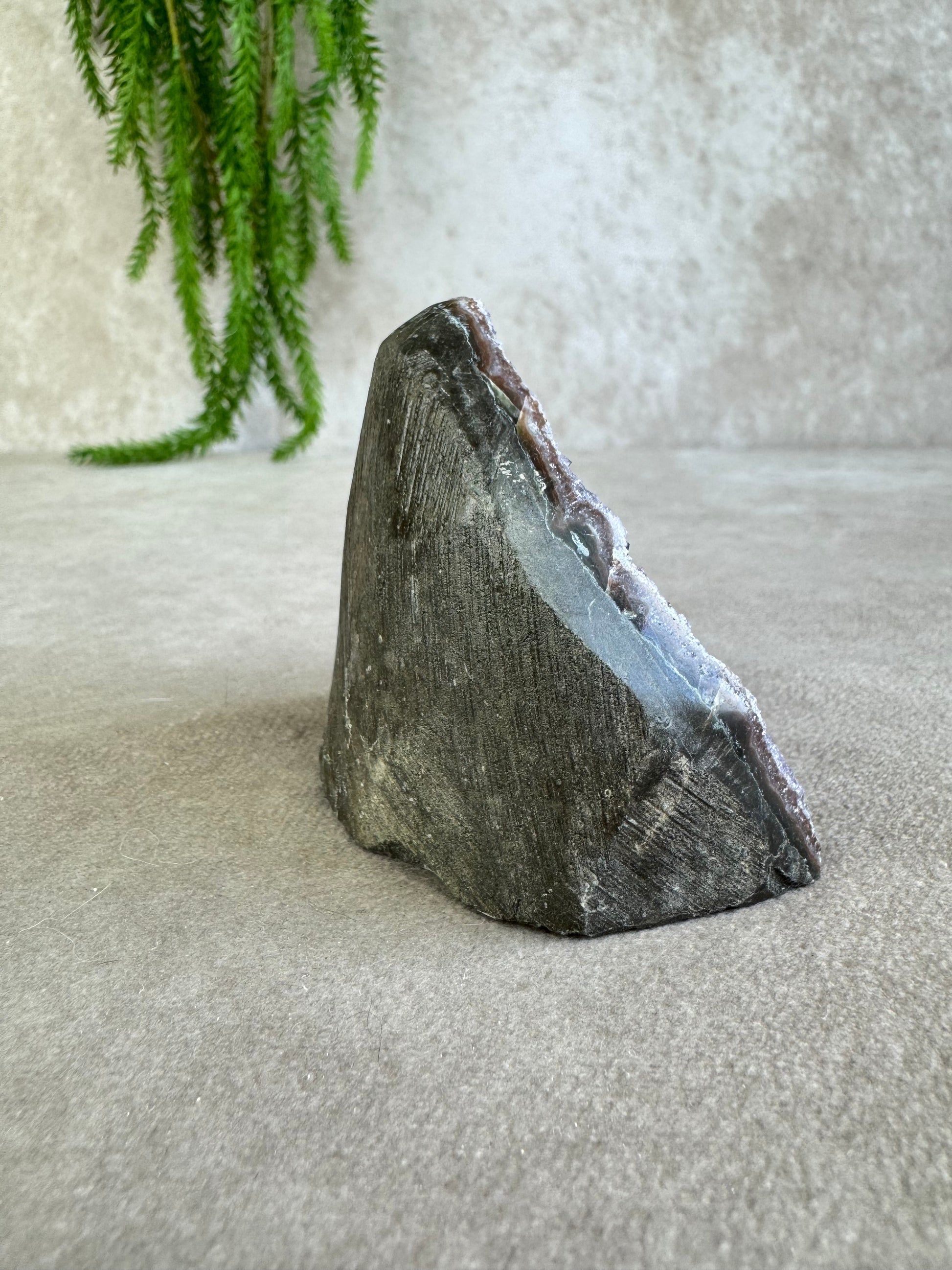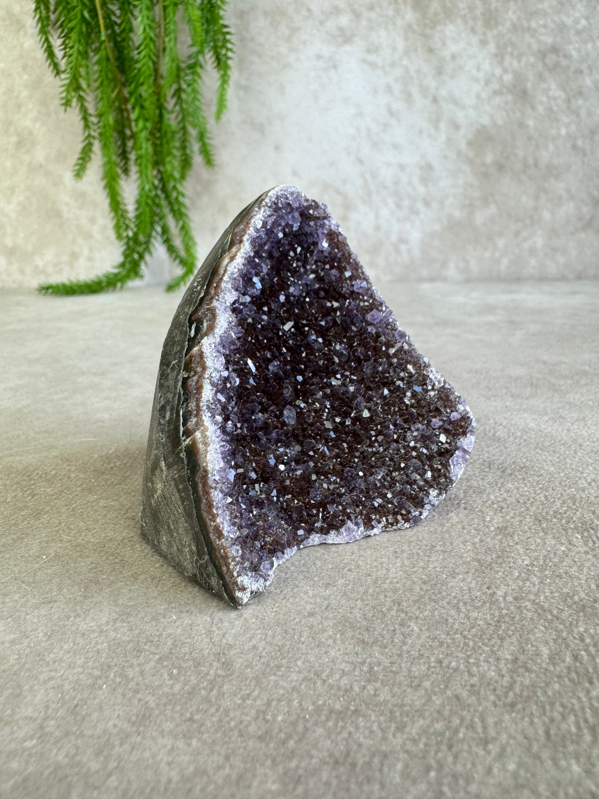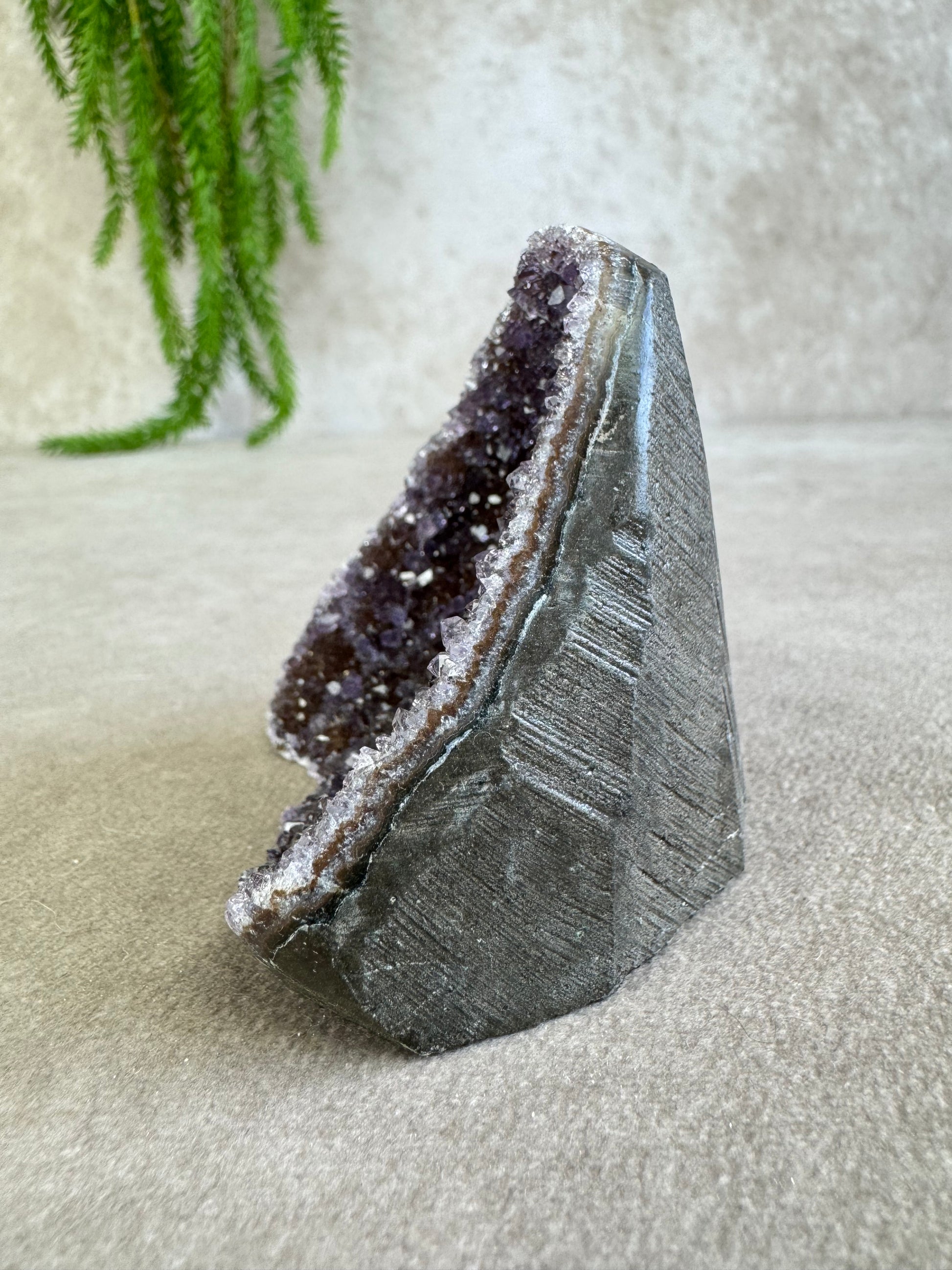 De combinatie van sprankeling en rijke kleur geeft dit stuk een magische uitstraling. Amethist staat bekend om zijn rustgevende en zuiverende energie, ideaal om een kalme sfeer te creëren en helderheid te bevorderen.