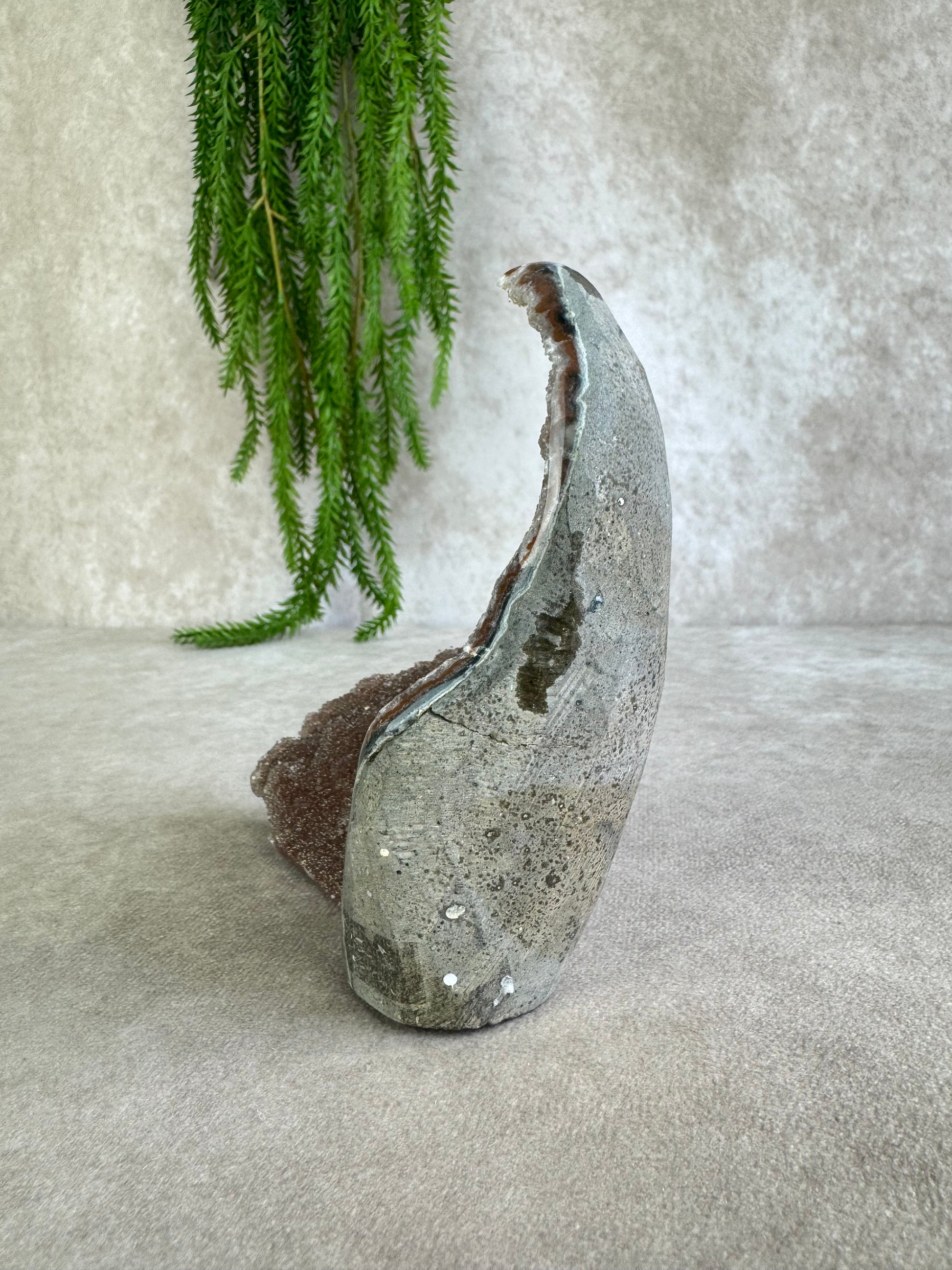 Deze bijzondere galaxy amethist van 538 gram en 14 x 11,5 cm is een uniek kristal vol diepte en detail en zijn bijzondere vorm maakt het echt een pronkstuk. Het oppervlak toont een prachtig spel van glanzende kristallen en natuurlijke patronen die doen denken aan een sterrenhemel, vandaar de naam galaxy amethist.