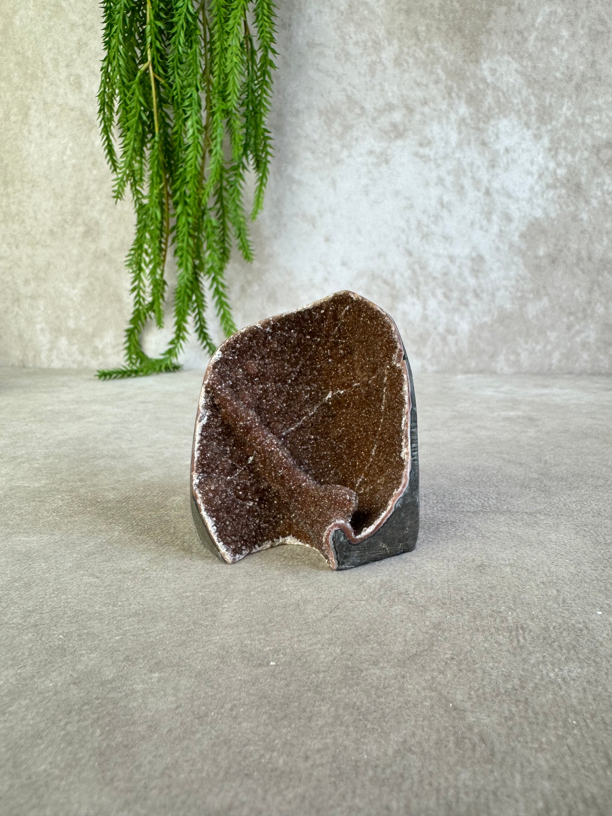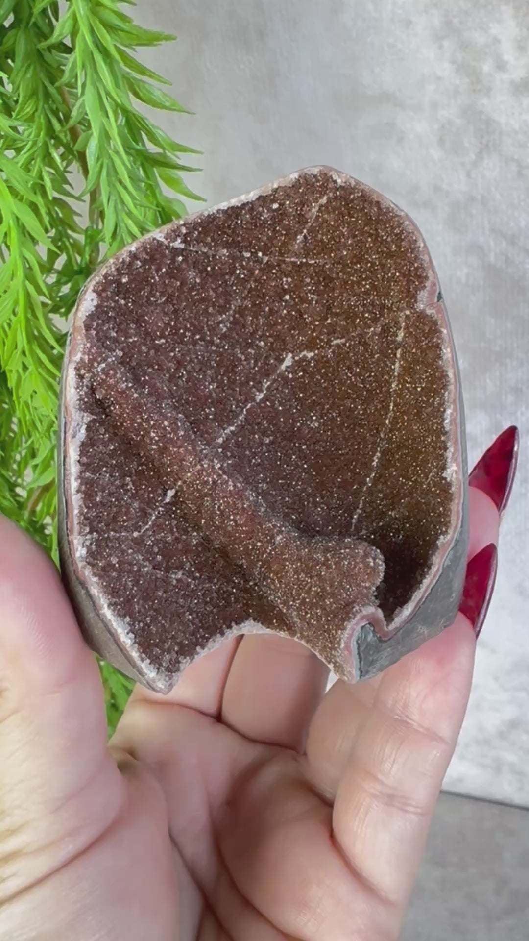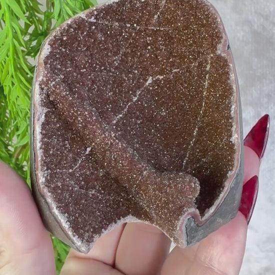 Deze bijzondere galaxy amethist van 182 gram en 7 x 6 cm valt direct op door zijn warme rode tinten en de overvloed aan schittering die het oppervlak laat stralen. De fijne kristallen vangen het licht prachtig, waardoor het stuk een levendige en luxueuze uitstraling krijgt.