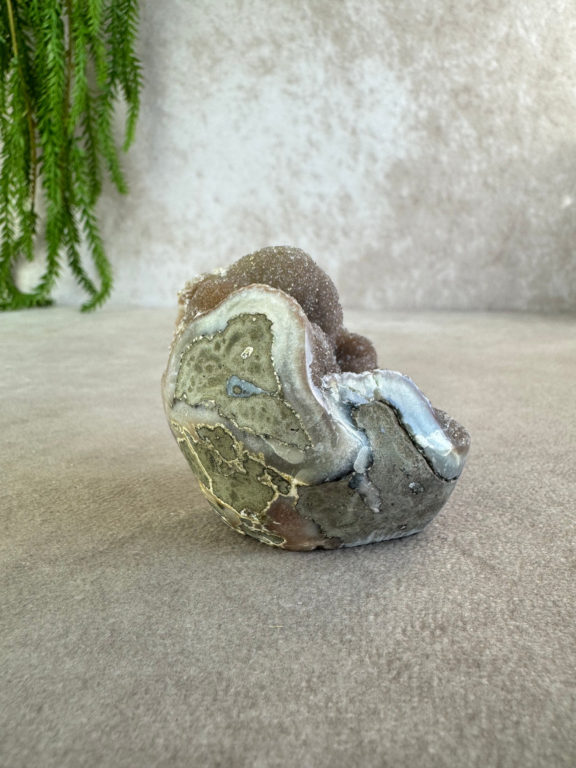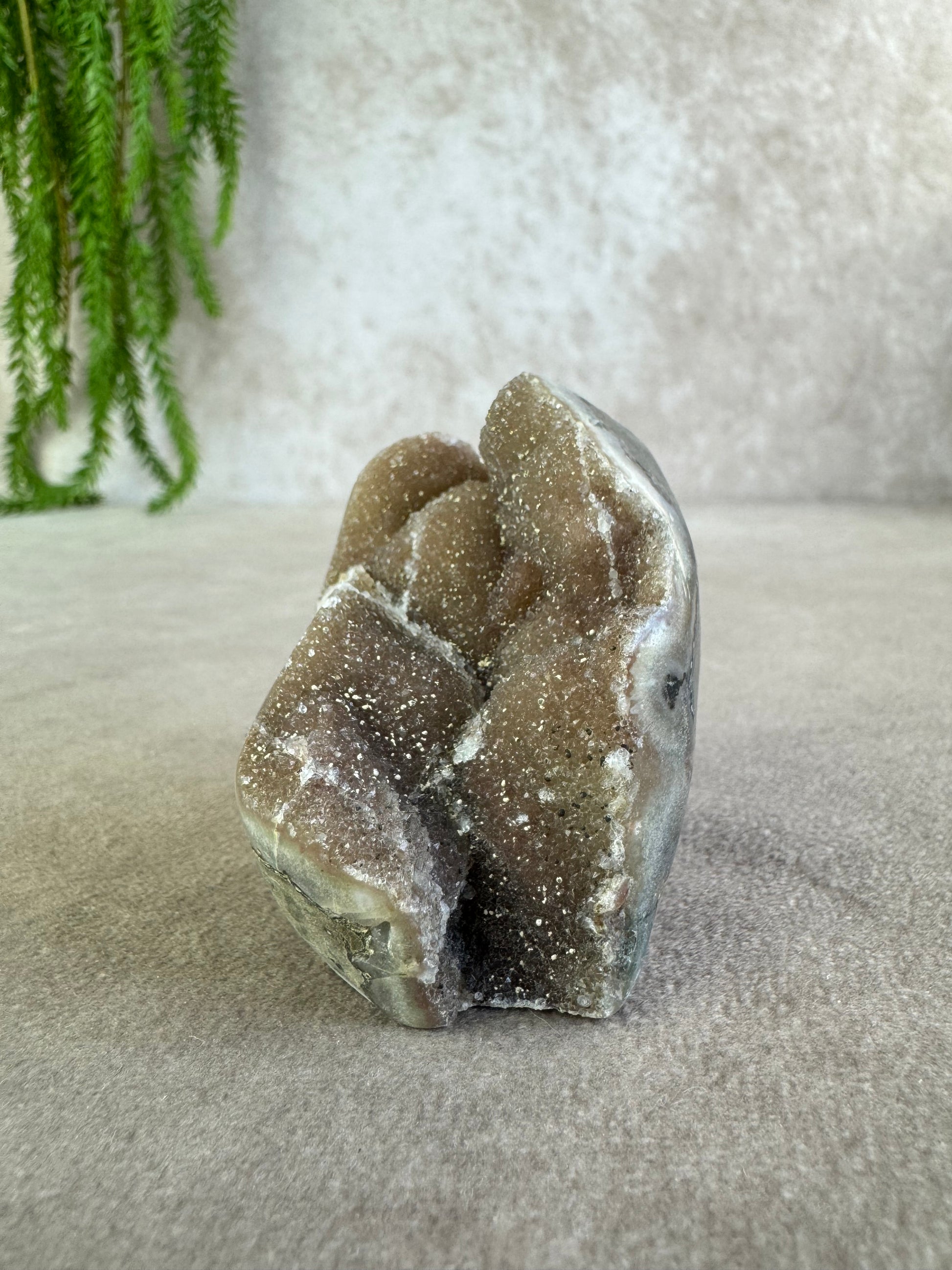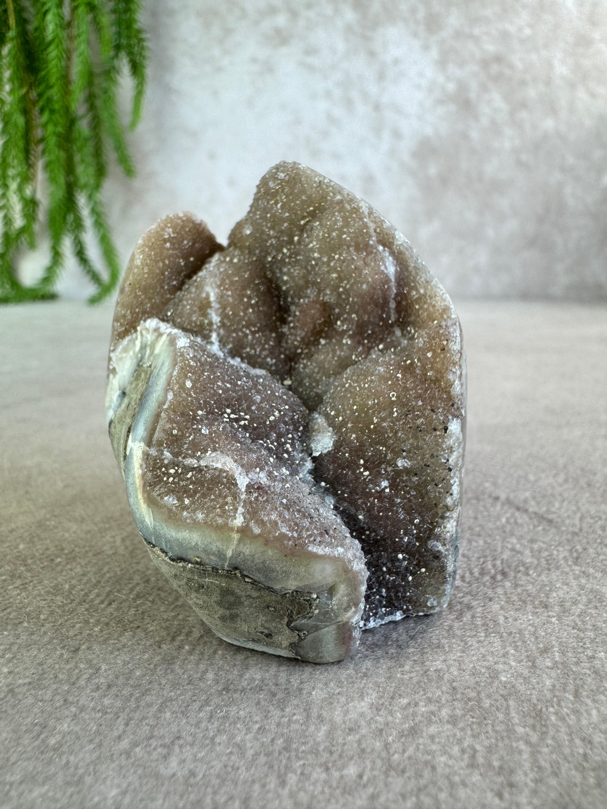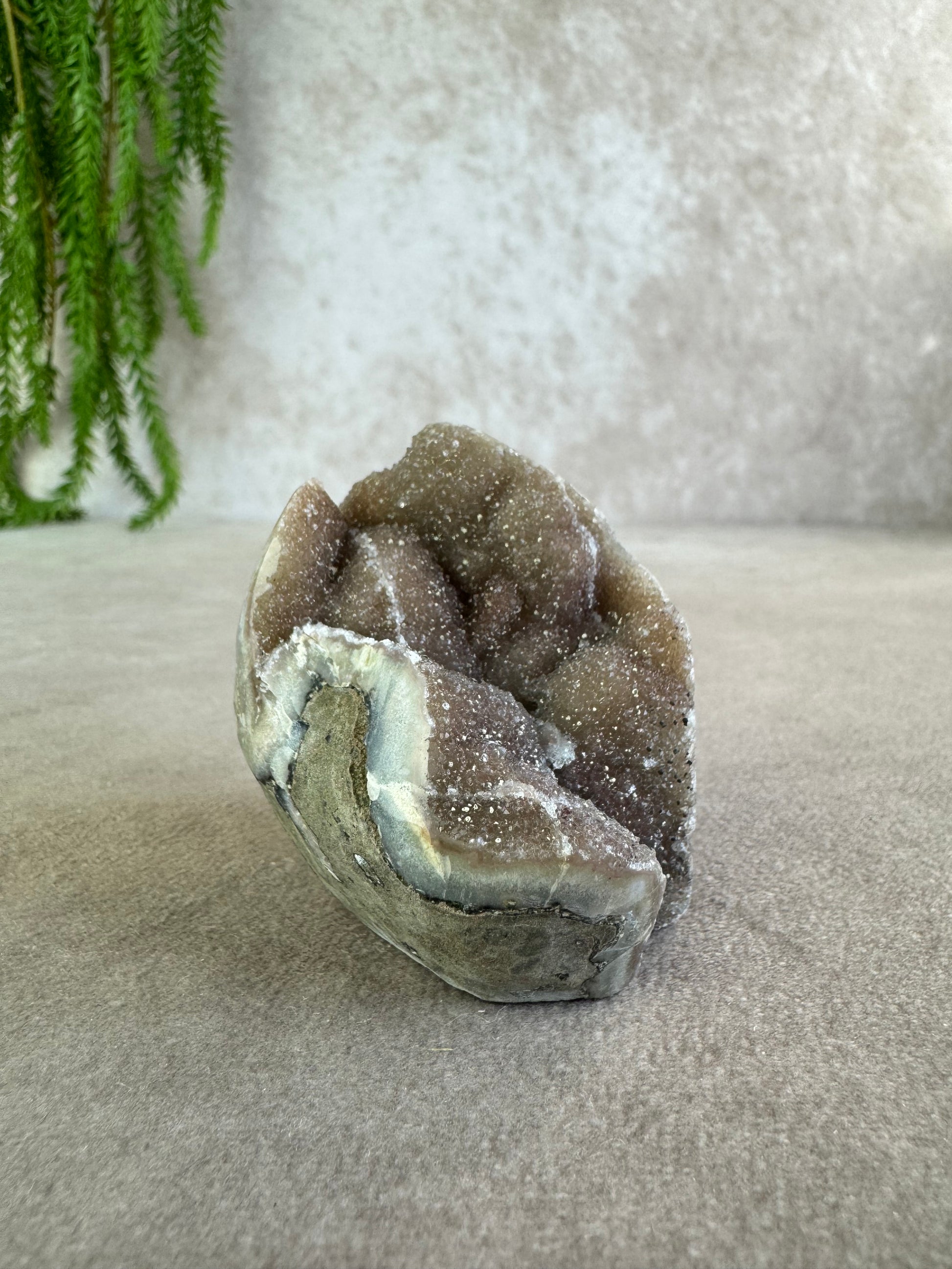 Deze bijzondere galaxy amethist van 118 gram en 5 x 5 cm heeft een warme bruine tint met een schitterende druzy die van voor tot achter doorloopt. Dit geeft het stuk een extra sprankelende en levendige uitstraling, alsof het volledig van glinsterende kristallen is gevuld.