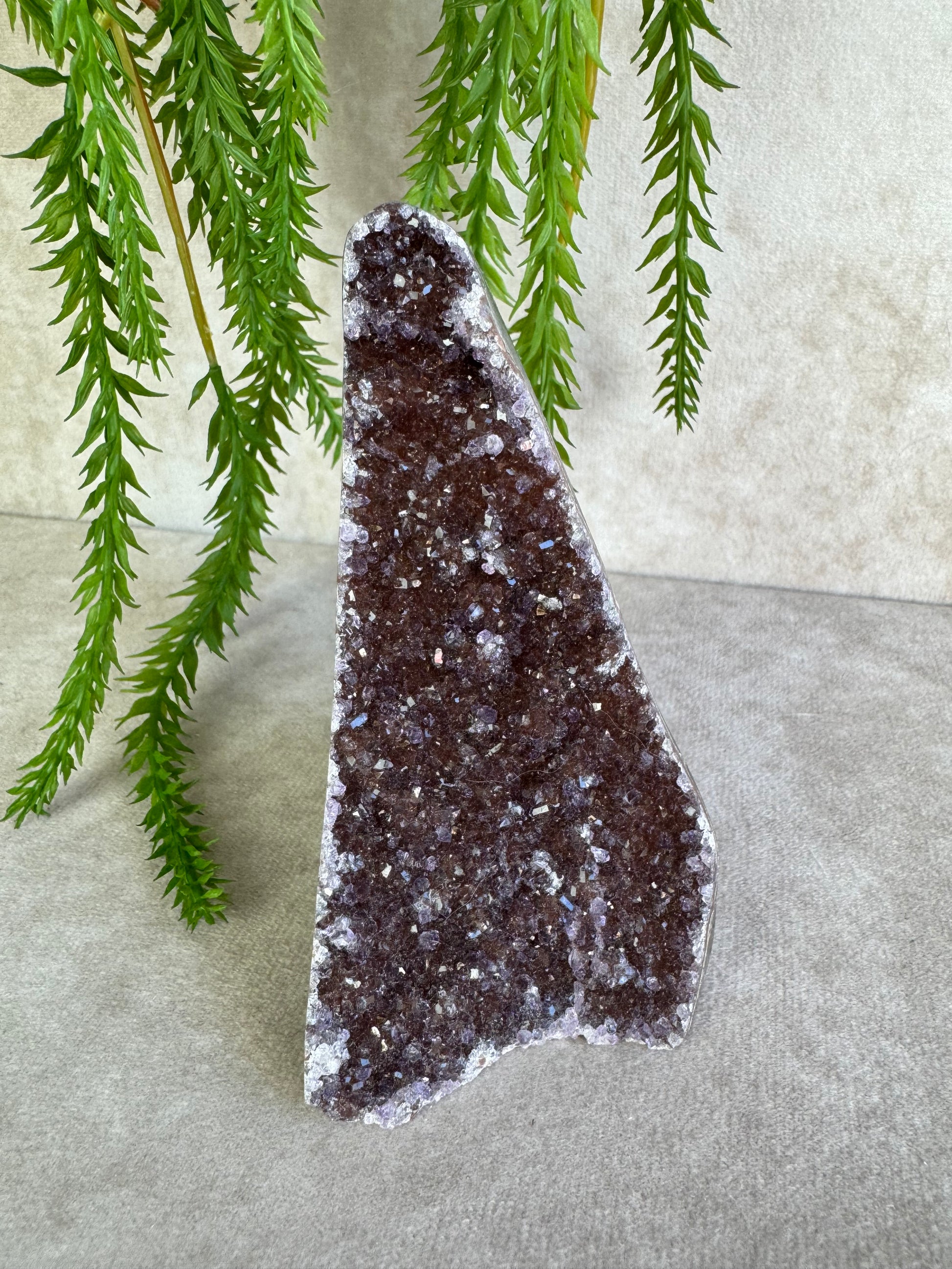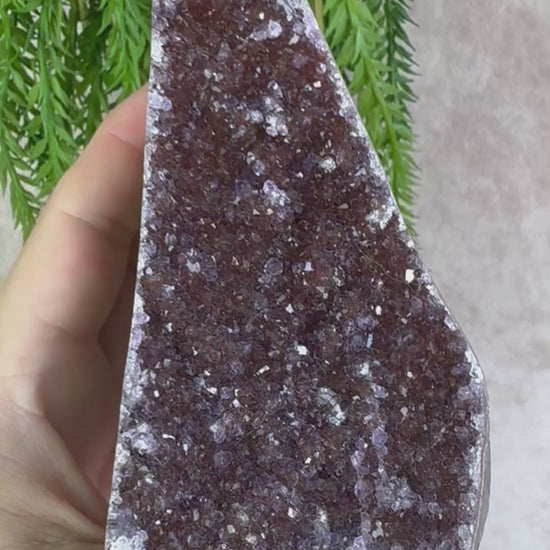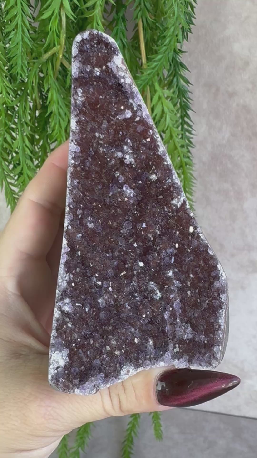 Amethist staat bekend om zijn rustgevende en zuiverende werking. De rode schakeringen voegen daar een extra dimensie van kracht en vitaliteit aan toe, waardoor dit kristal zowel balans als energie uitstraalt.