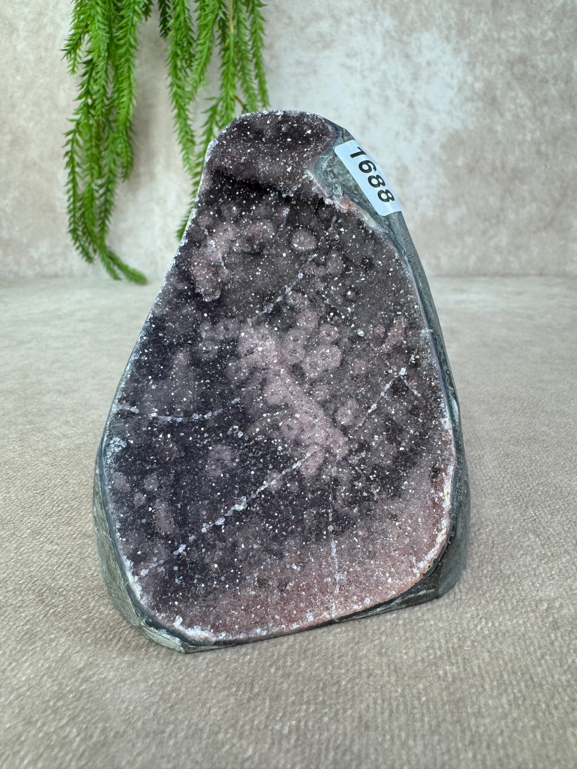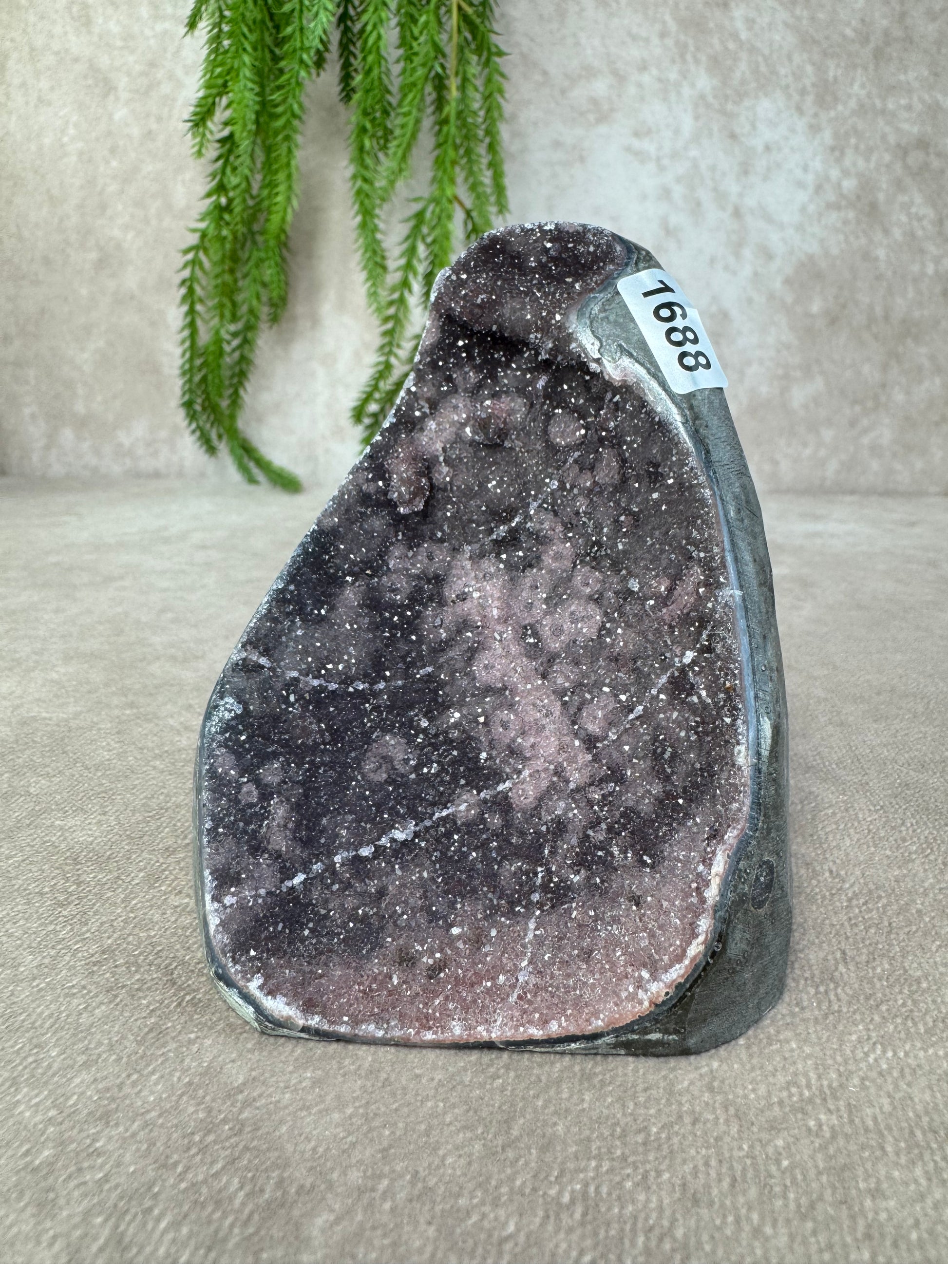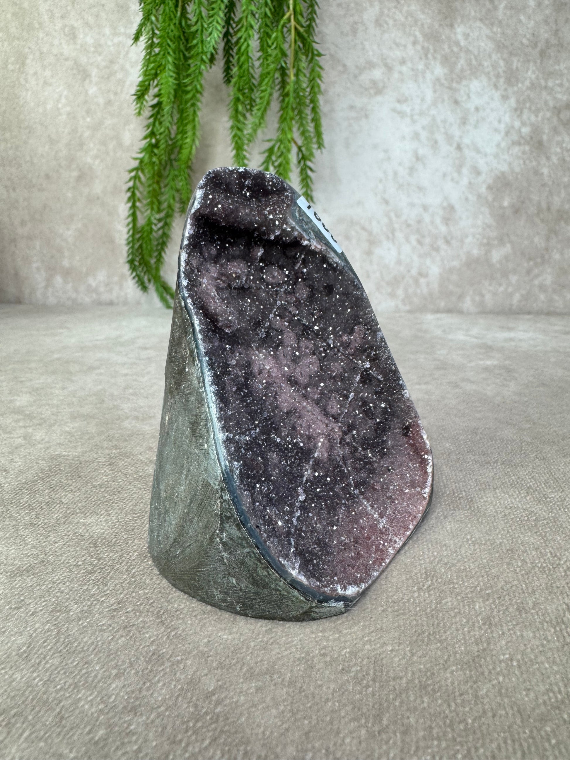Deze schitterende Galaxy Amethist, ook wel Rainbow Amethist genoemd, toont een adembenemend kleurenspel van diep paars tot zacht roze. Met een gewicht van 522 gram en een afmeting van 10 cm hoog en 8,6 cm breed, is dit een compact maar opvallend stuk vol natuurlijke schoonheid.