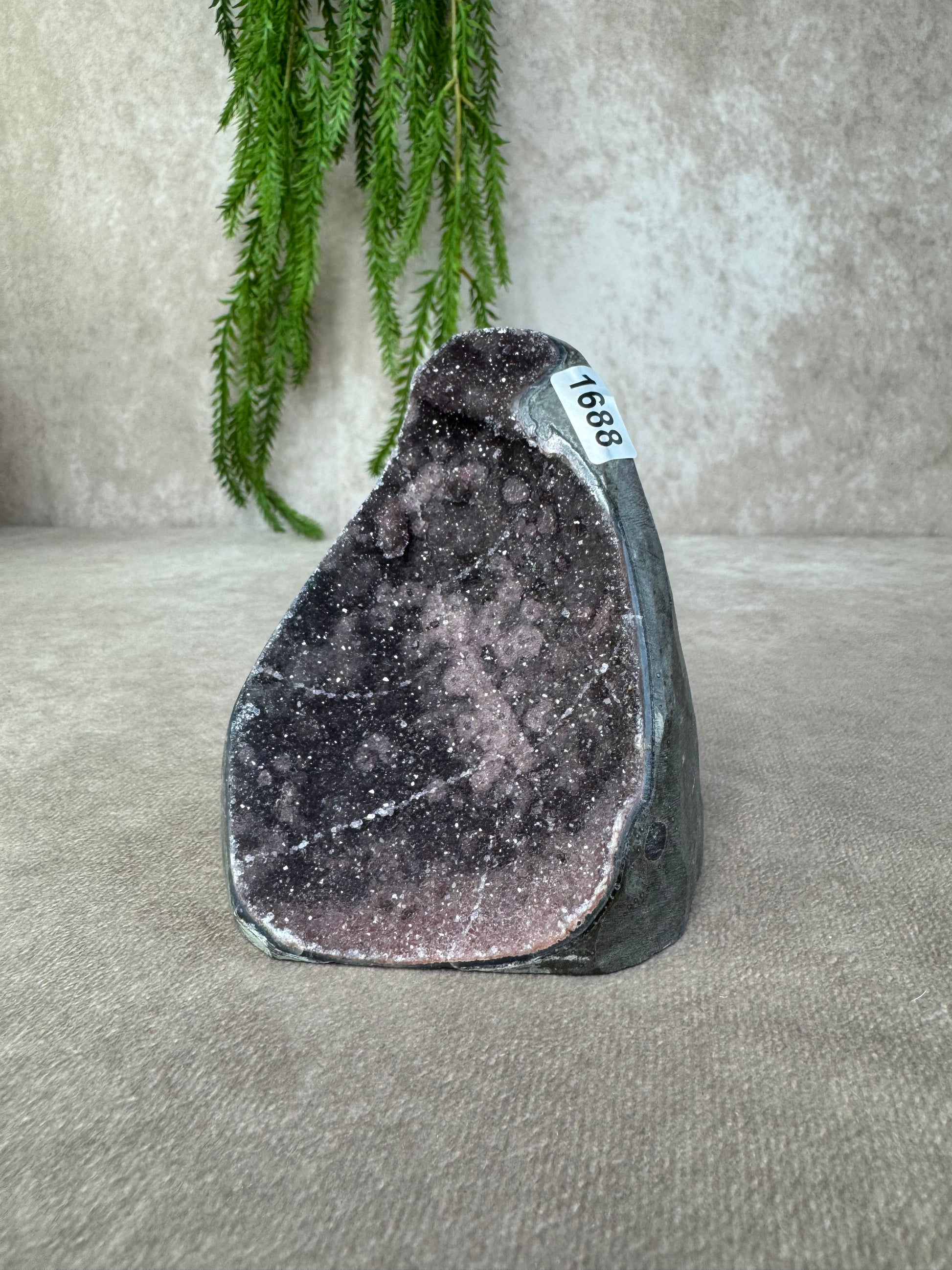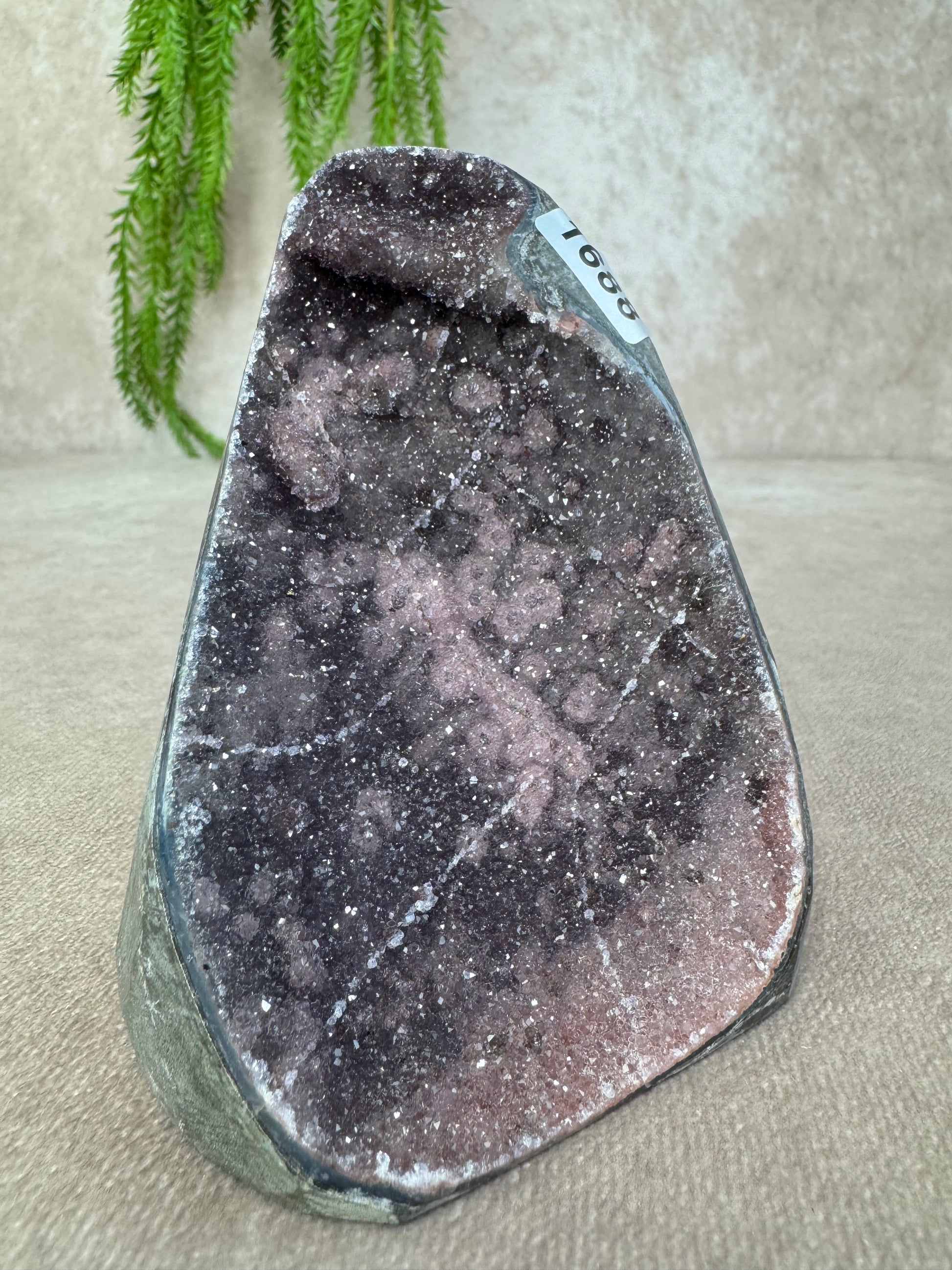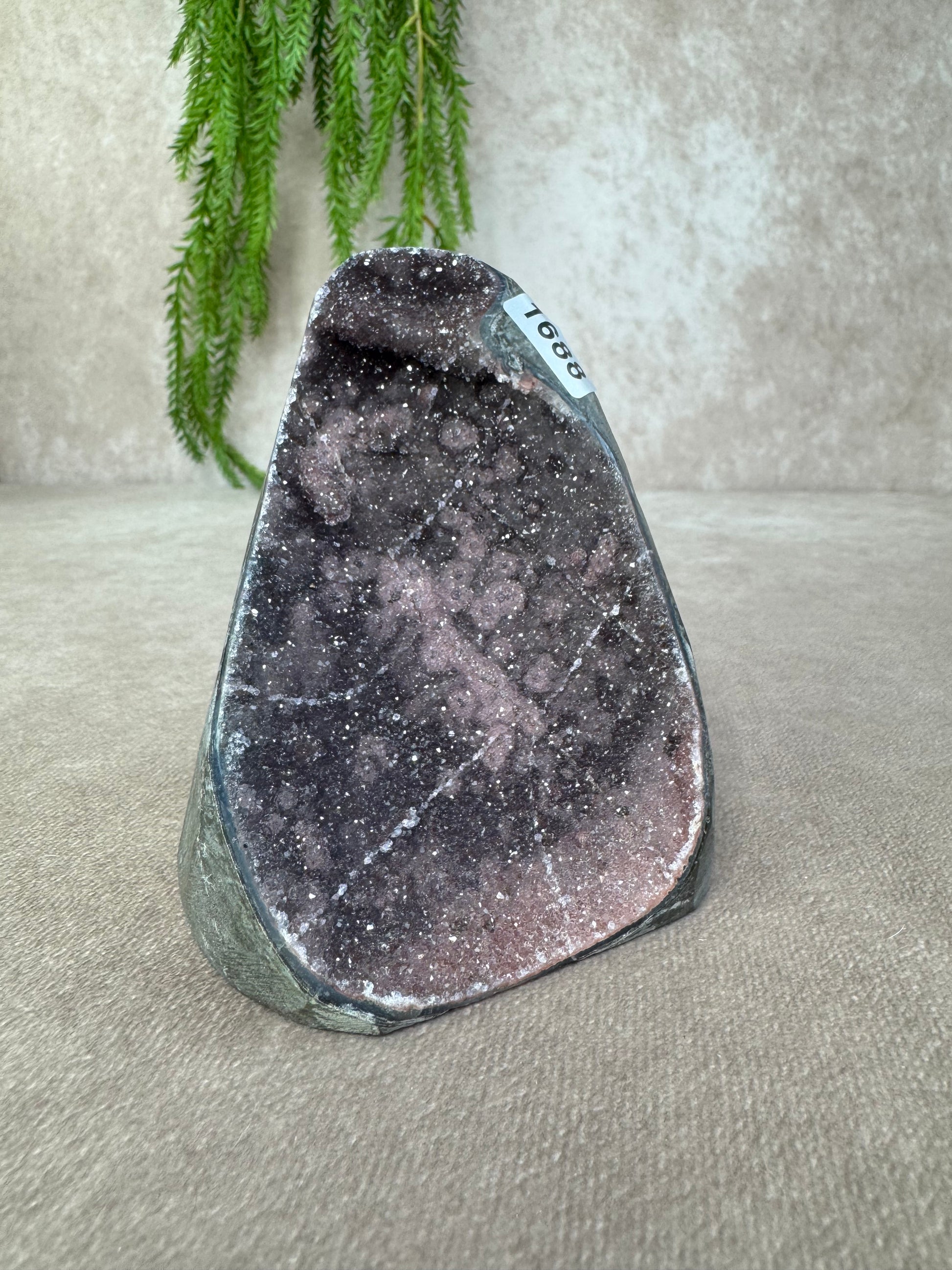 Deze schitterende Galaxy Amethist, ook wel Rainbow Amethist genoemd, toont een adembenemend kleurenspel van diep paars tot zacht roze. Met een gewicht van 522 gram en een afmeting van 10 cm hoog en 8,6 cm breed, is dit een compact maar opvallend stuk vol natuurlijke schoonheid.
