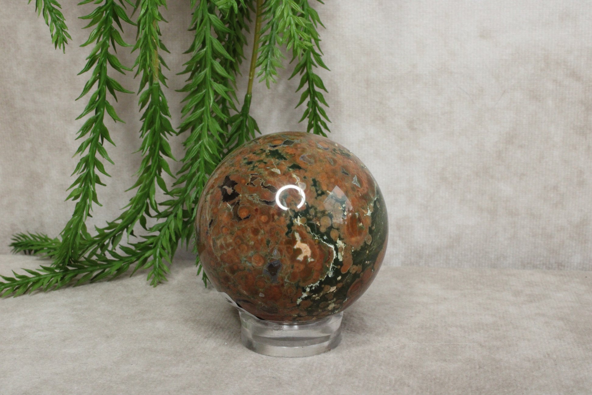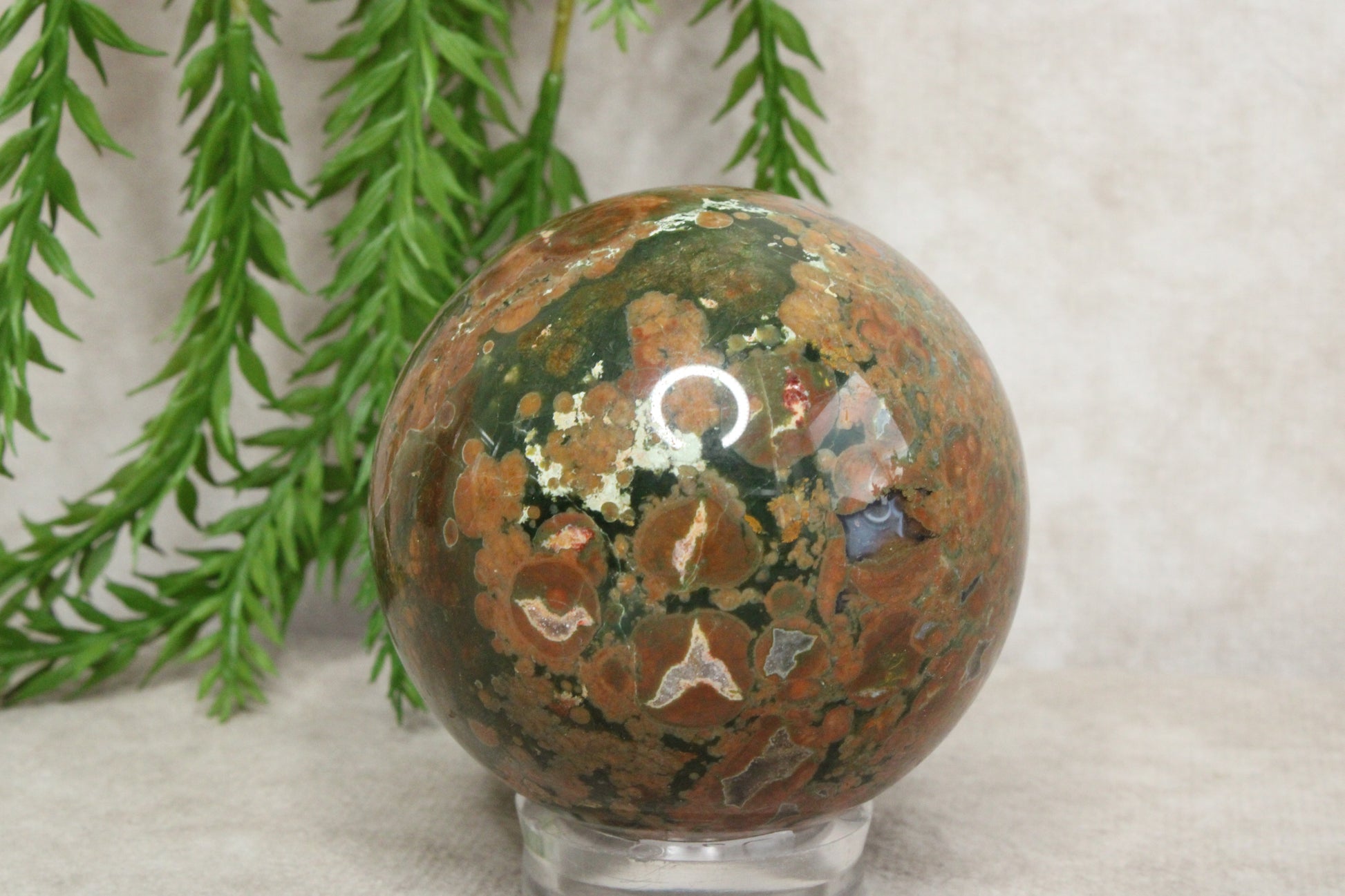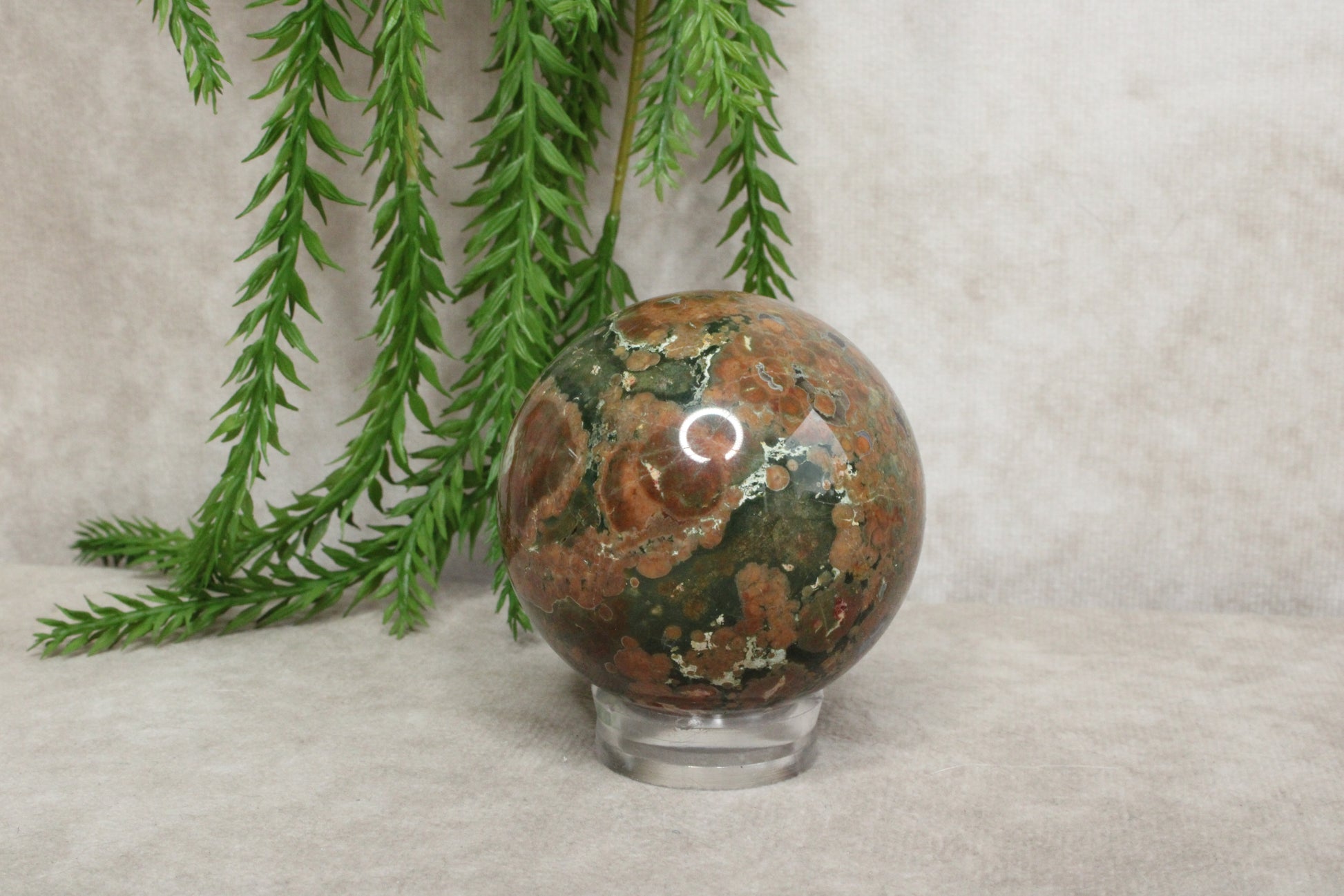Deze prachtige jaspis bol van 5,8 cm en een gewicht van 256 gram laat de natuurlijke schoonheid van de steen goed zien. De warme kleuren en unieke patronen maken elke bol anders en geven hem een rustige, aardse uitstraling. Het is een stijlvol object dat mooi staat in huis of als onderdeel van een kristalcollectie.