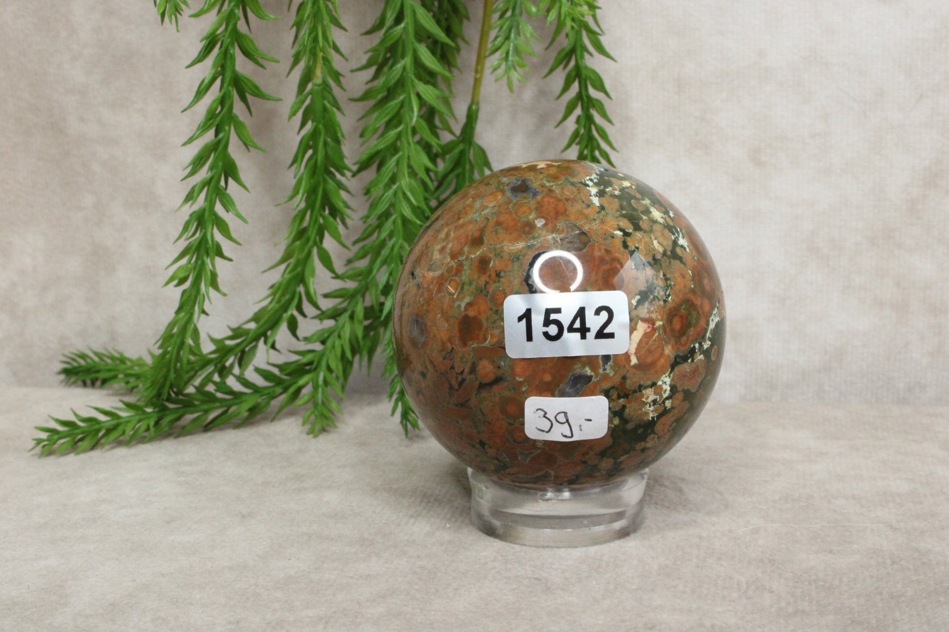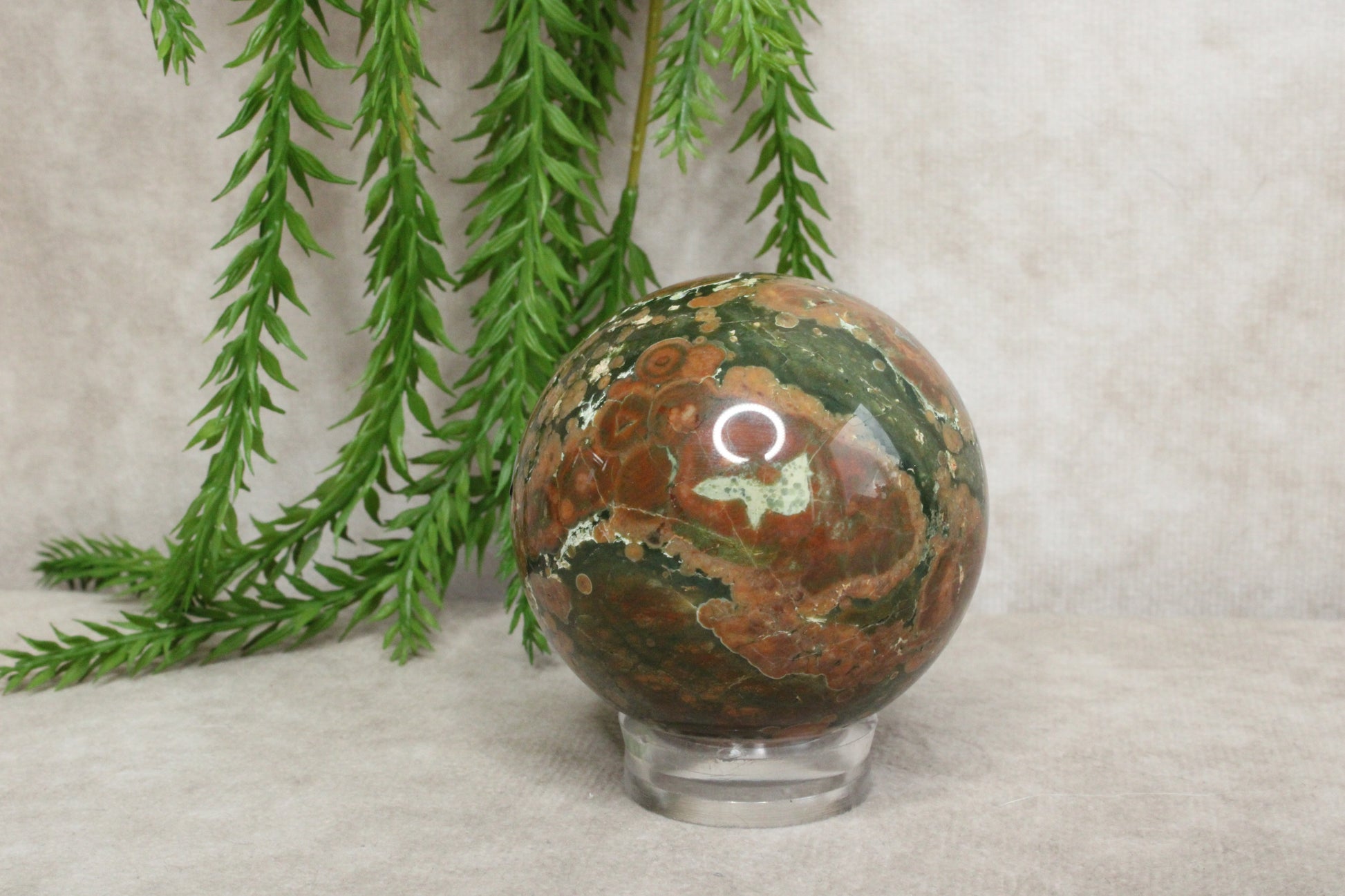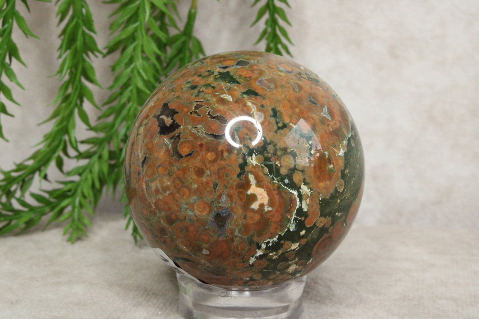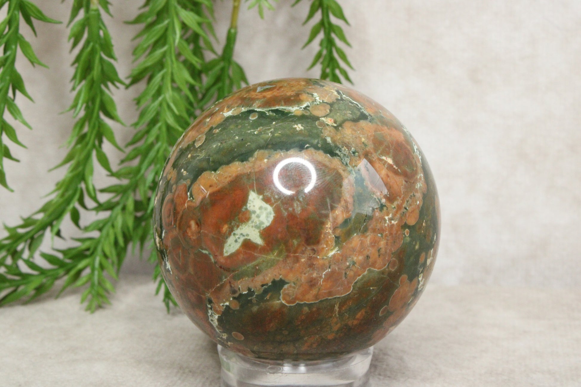 Deze prachtige jaspis bol van 5,8 cm en een gewicht van 256 gram laat de natuurlijke schoonheid van de steen goed zien. De warme kleuren en unieke patronen maken elke bol anders en geven hem een rustige, aardse uitstraling. Het is een stijlvol object dat mooi staat in huis of als onderdeel van een kristalcollectie.
