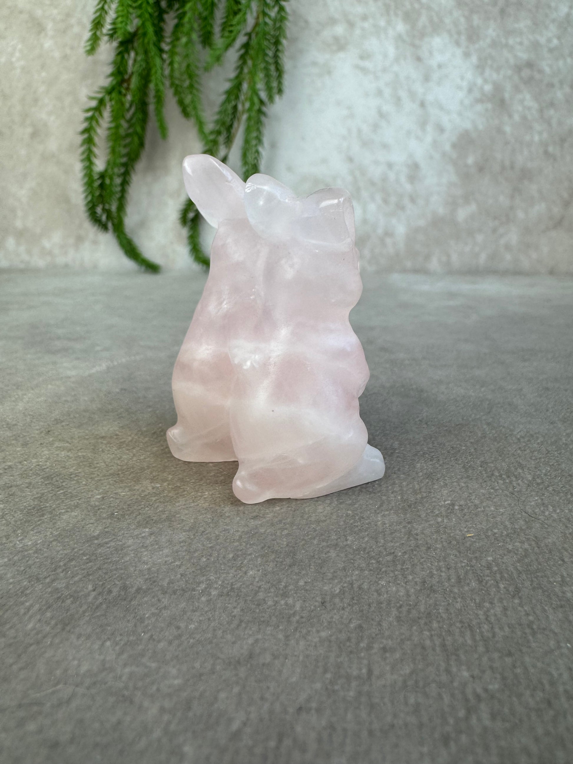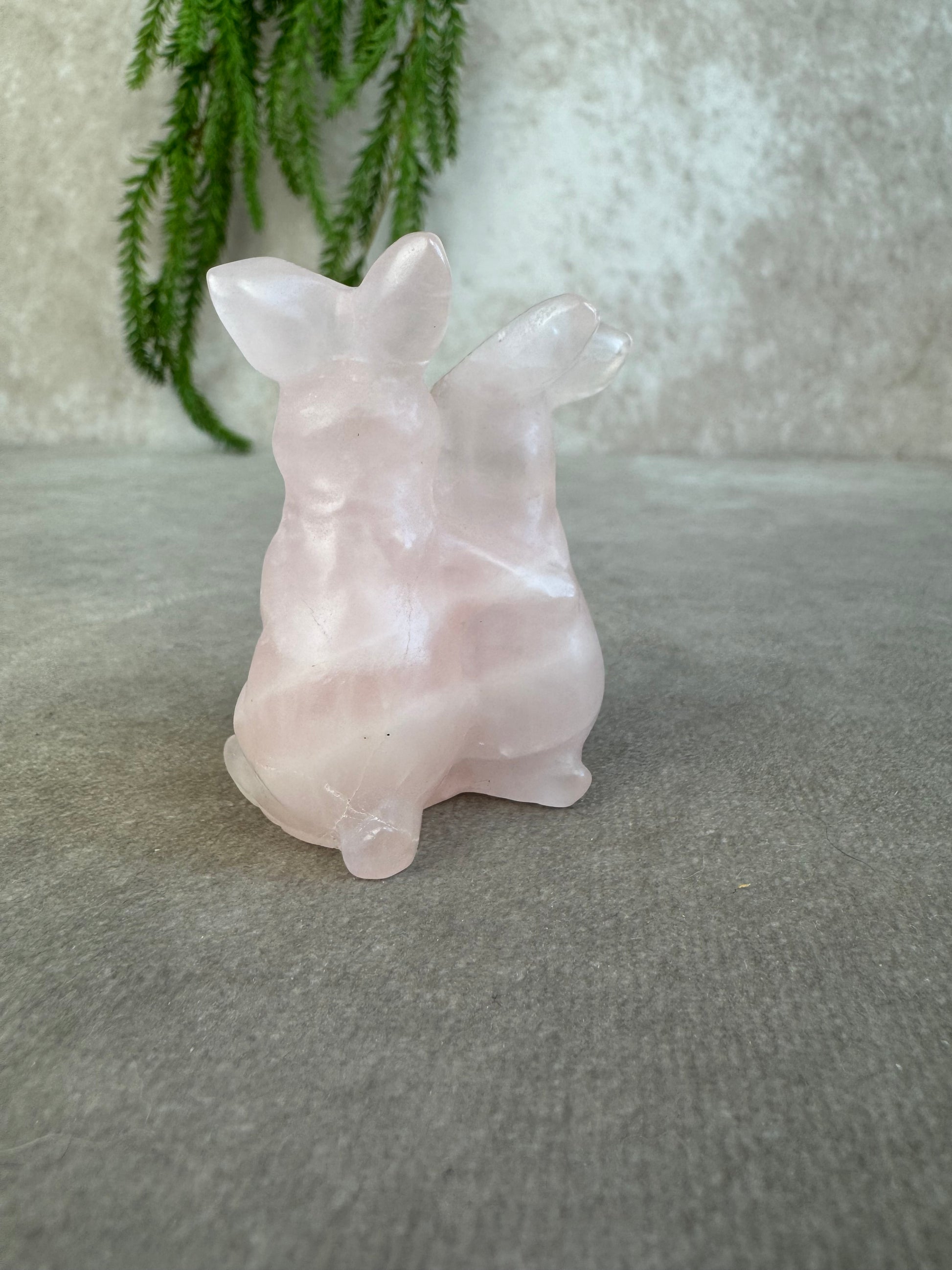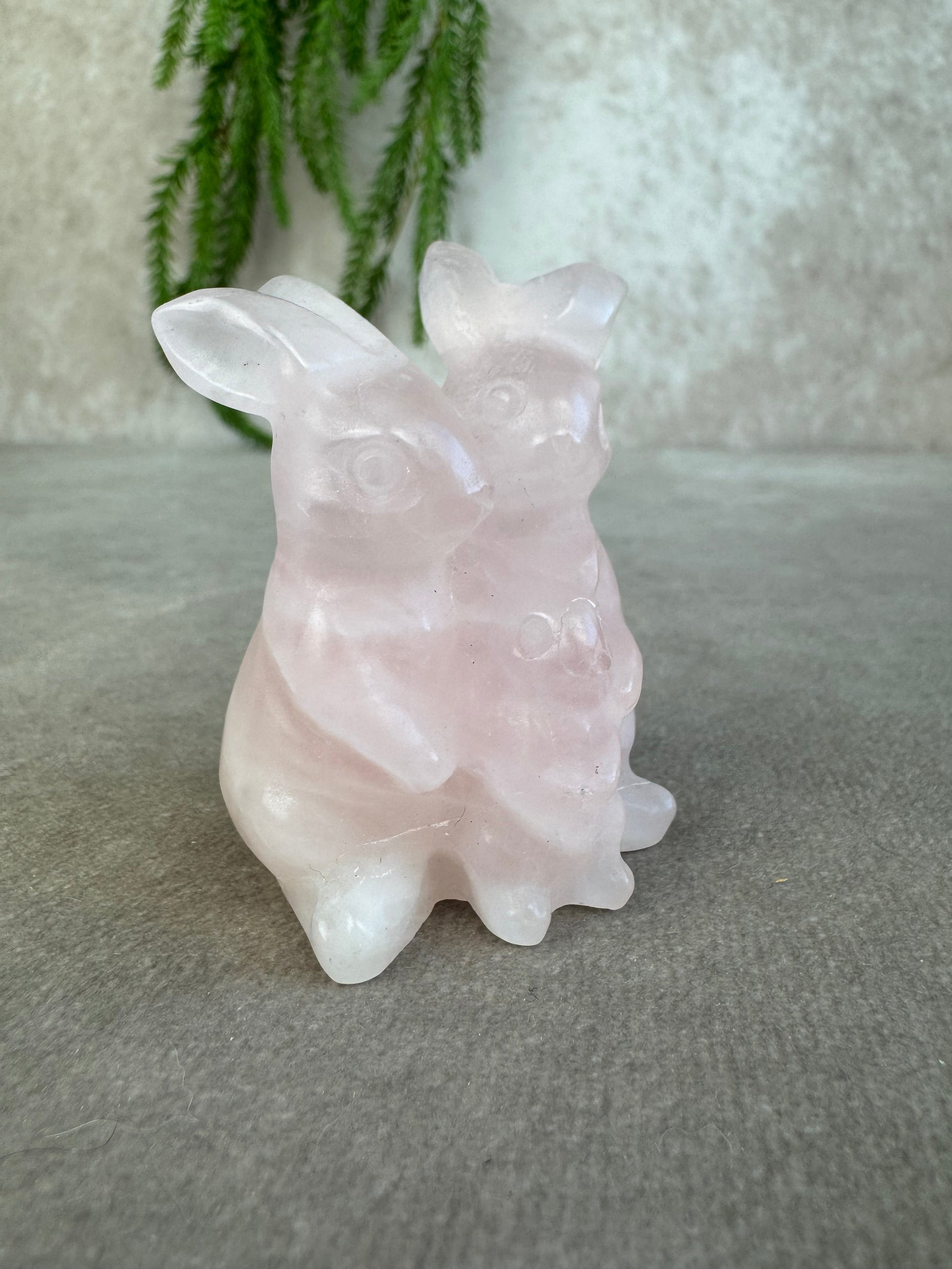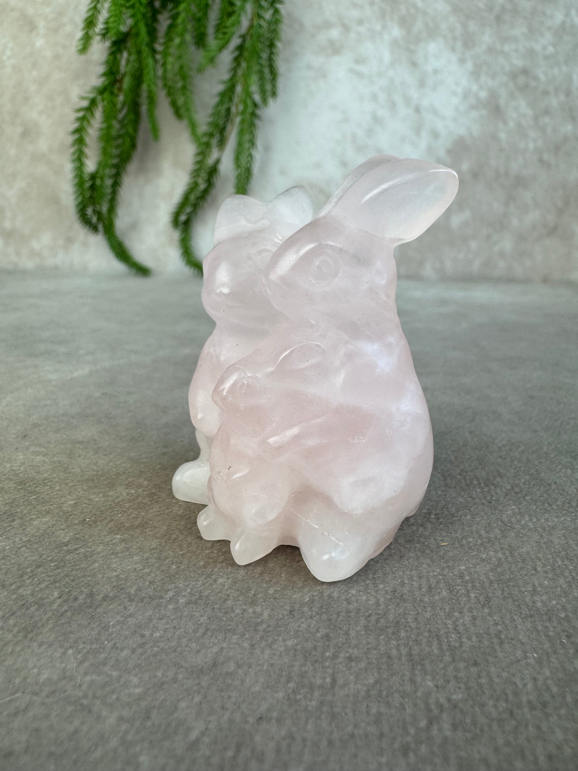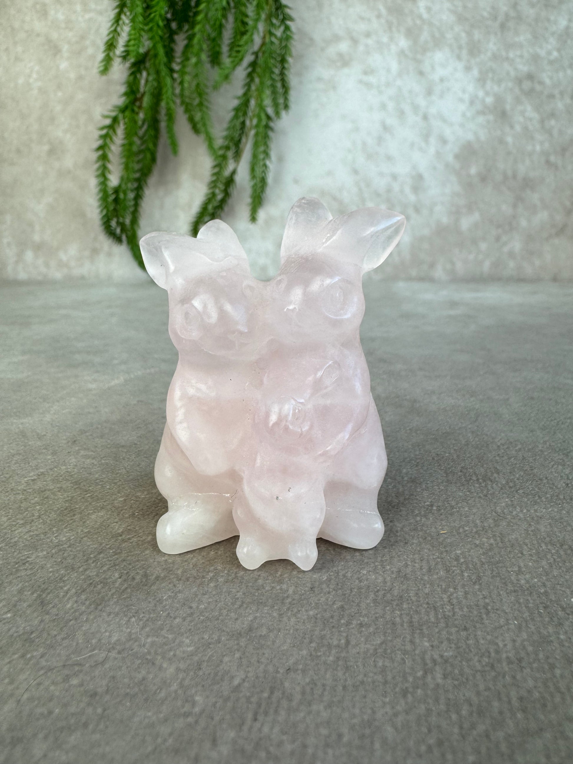 Deze schattige carving van rozenkwarts toont een konijnenfamilie met twee volwassen konijnen en een baby, met een afmeting van 6 cm hoog en 4,8 cm breed. Het zachte roze van de steen geeft de carving een warme en liefdevolle uitstraling.