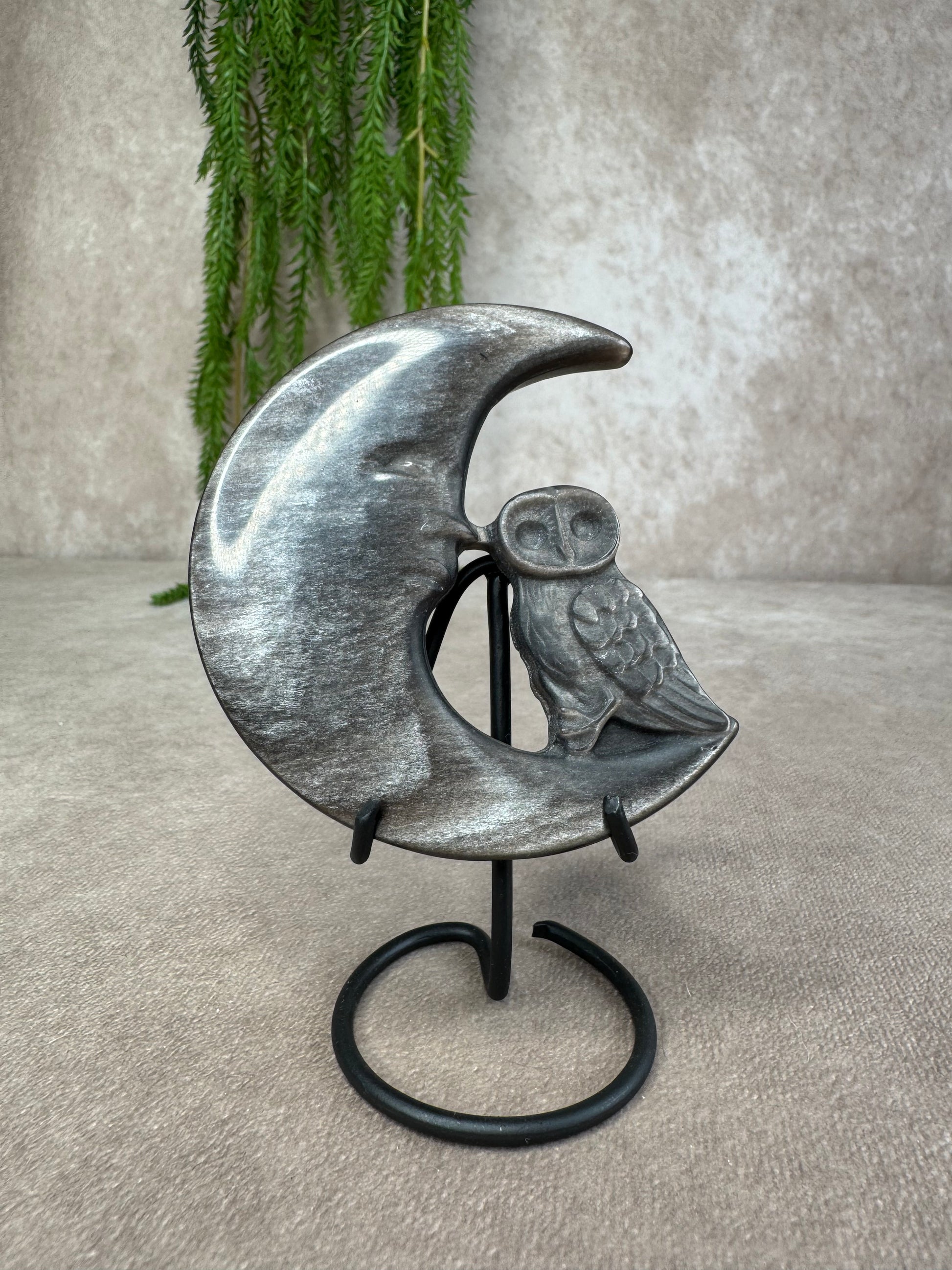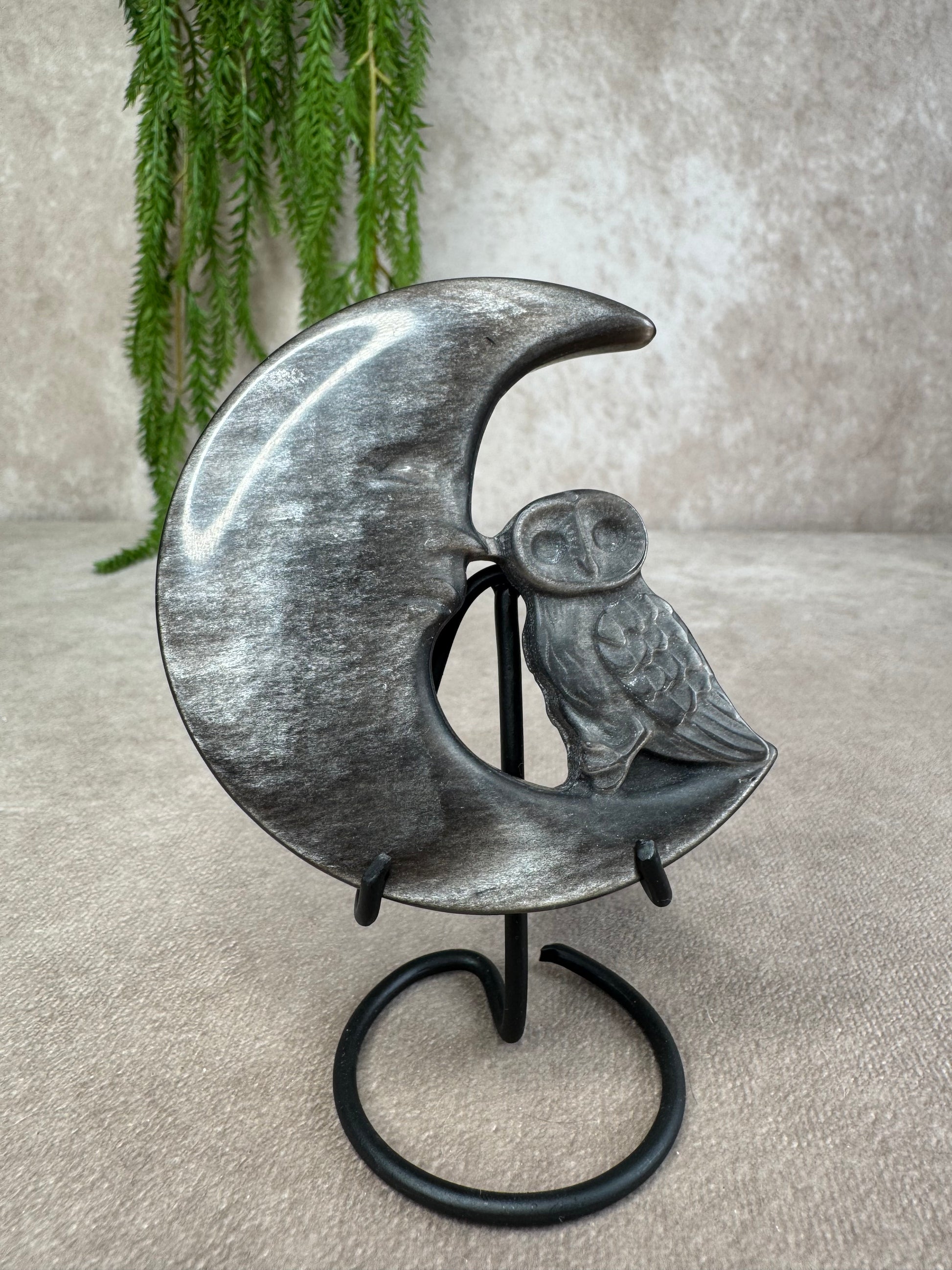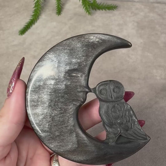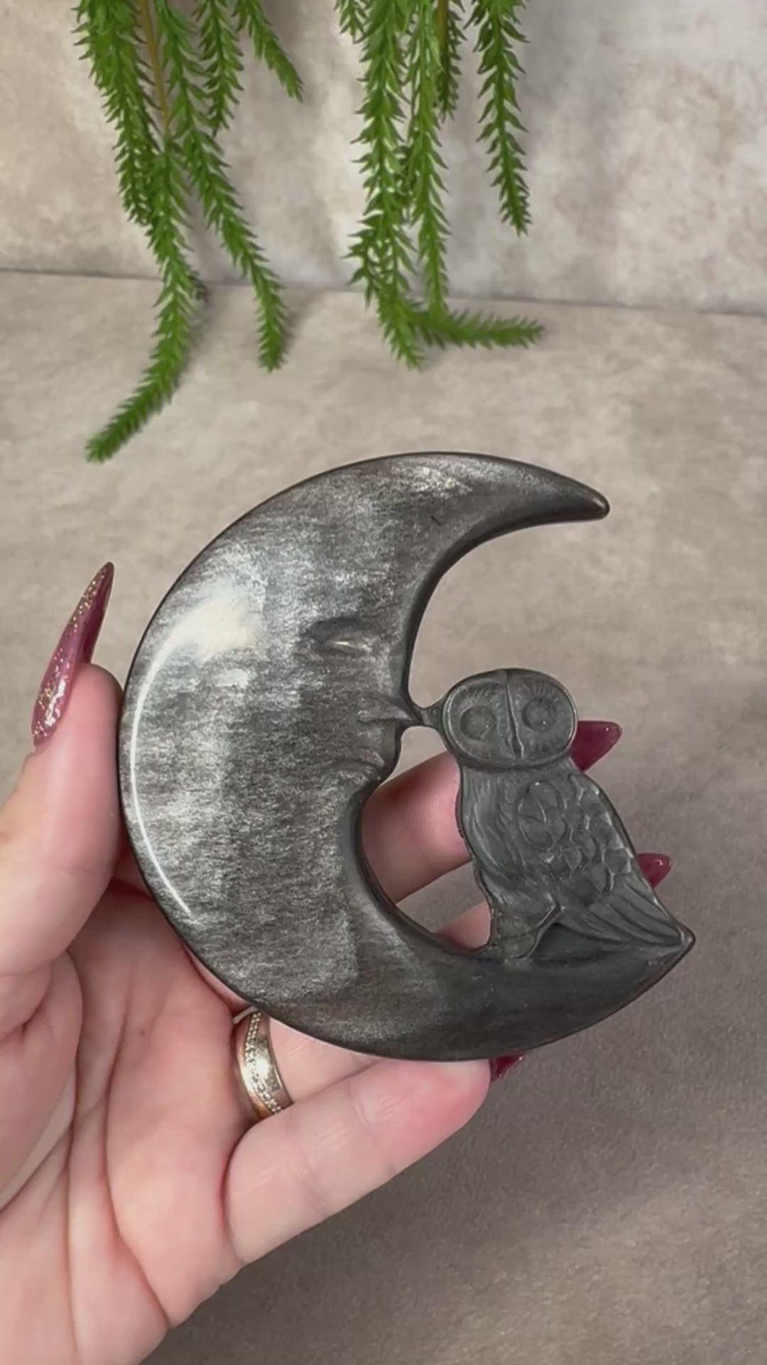 Deze handgesneden maan met uil van zilver obsidiaan is een prachtig en uniek stuk natuursteen. Het beeldje is 8,6 cm hoog en 8,1 cm breed, en toont een verfijnde zilverkleurige glans die subtiel oplicht bij het bewegen van het licht.