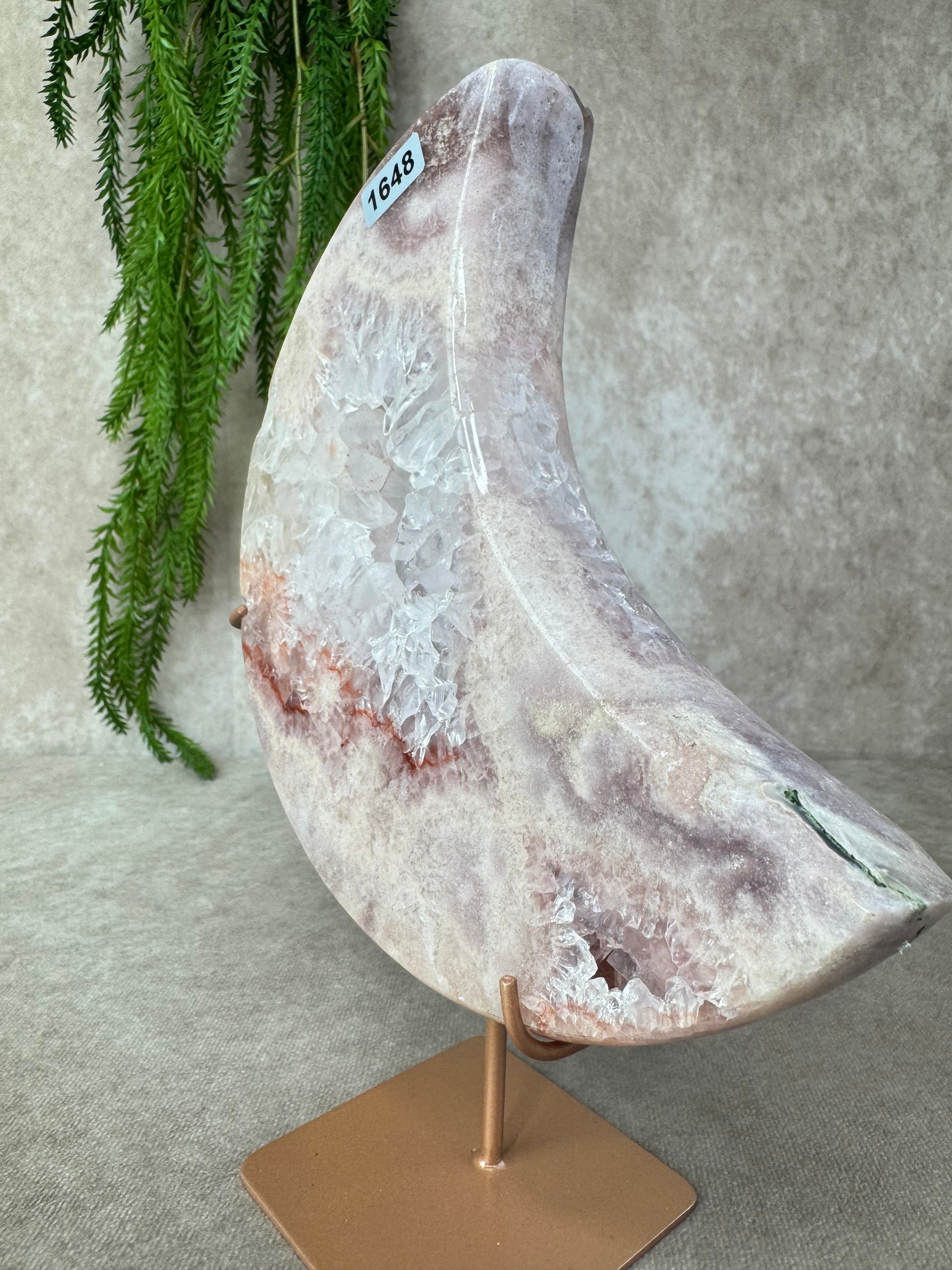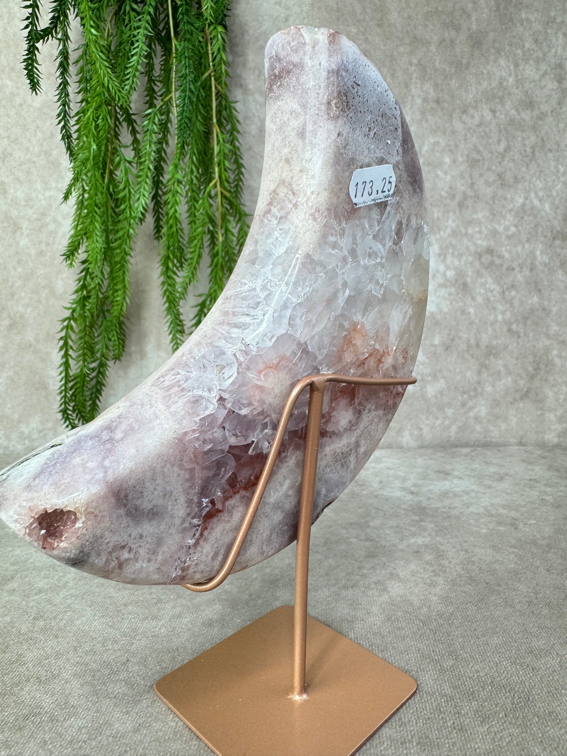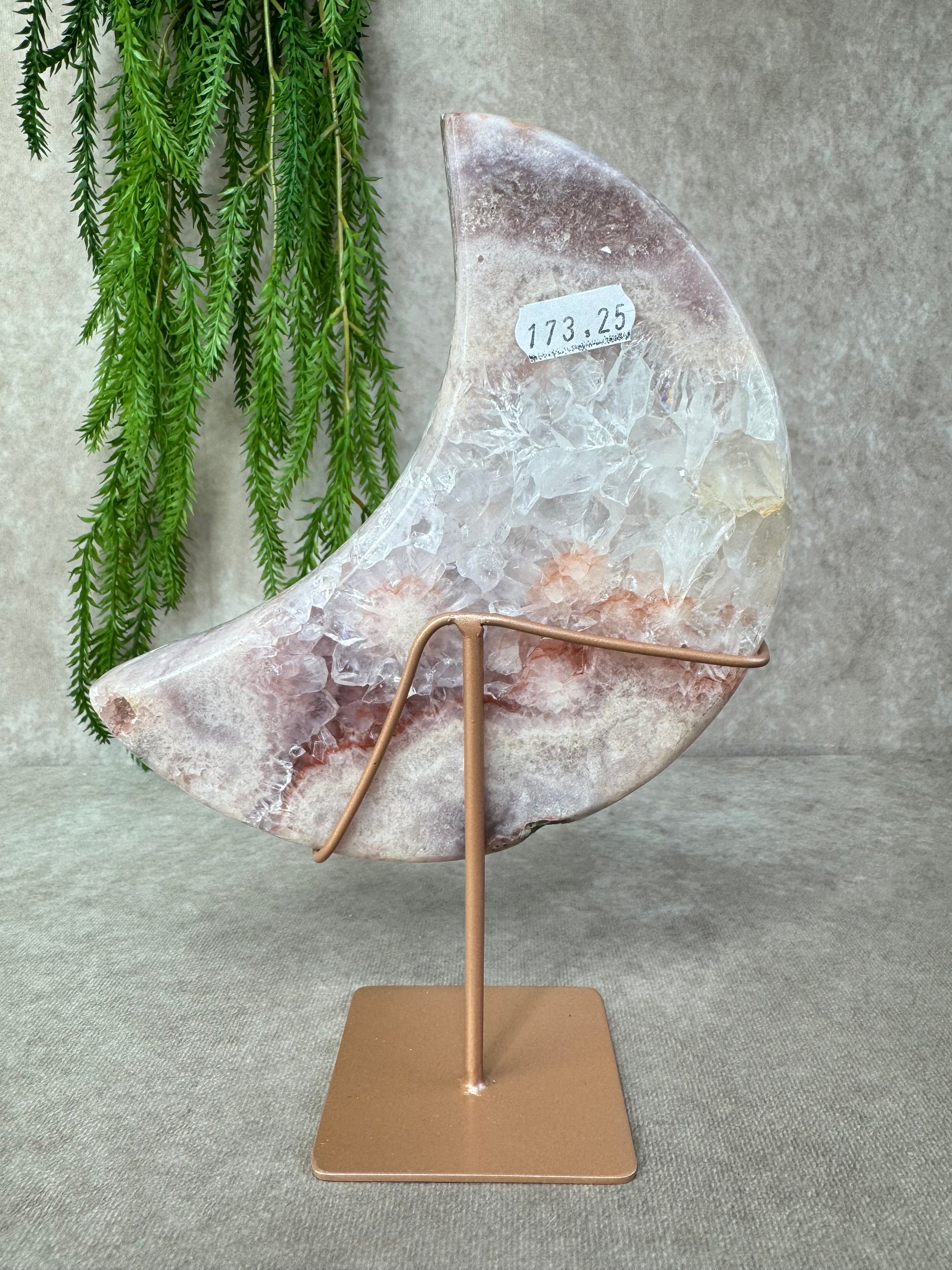 Deze schitterende maan van roze amethist straalt zachtheid en rust uit. Met haar imposante formaat van 24 cm hoog en 15,7 cm breed en een gewicht van 1387 gram, is dit een indrukwekkend stuk dat meteen in het oog springt.