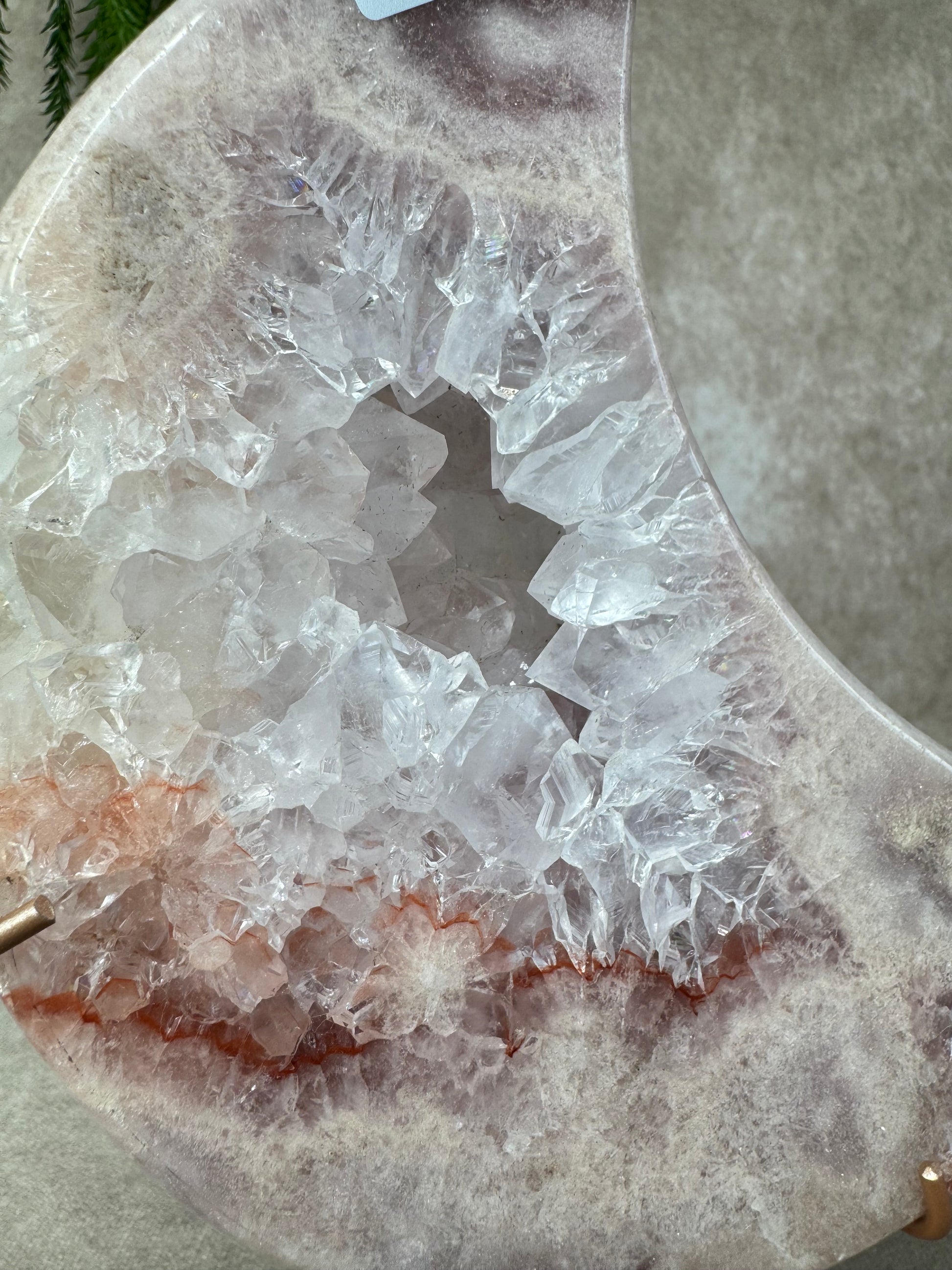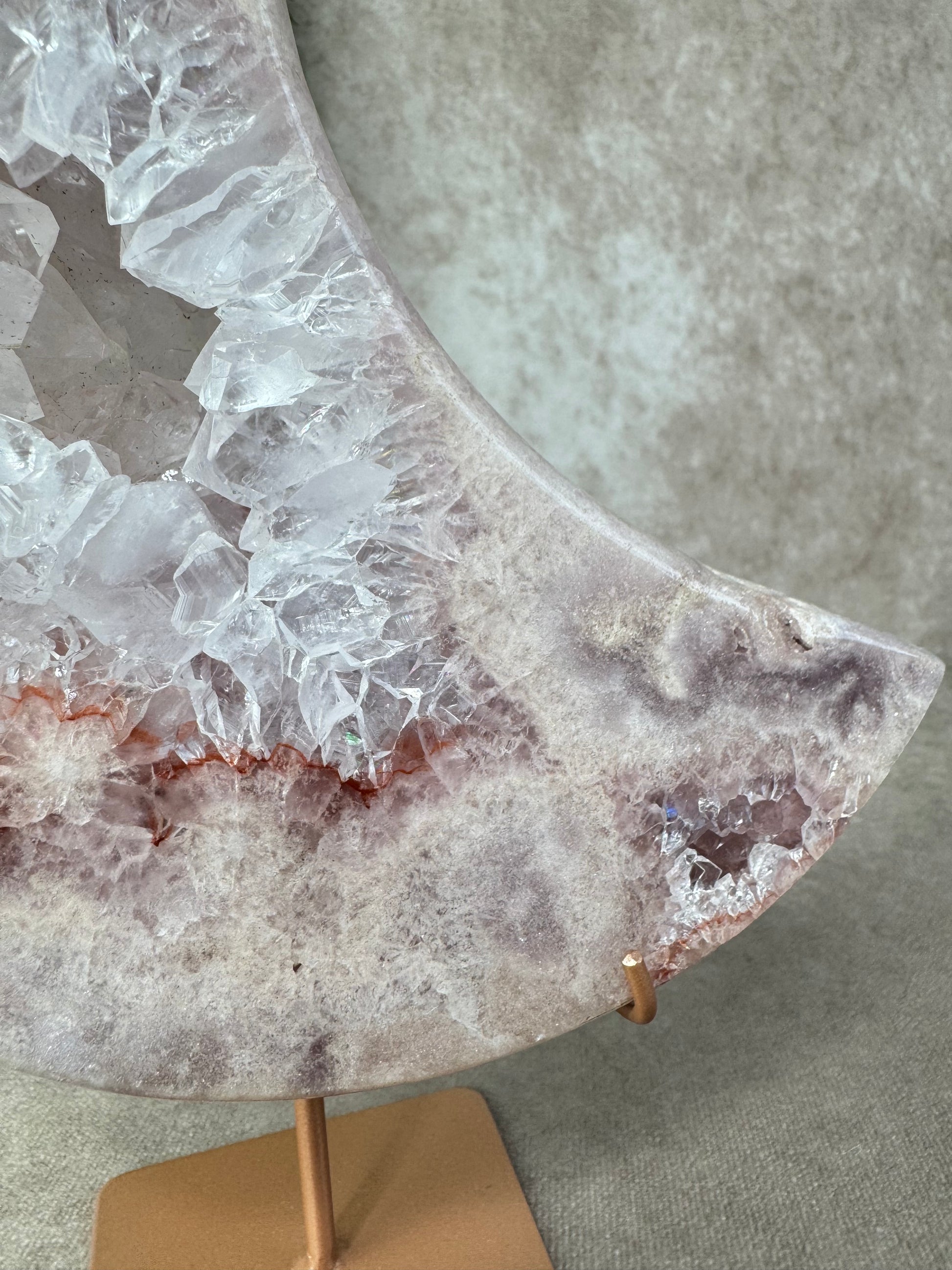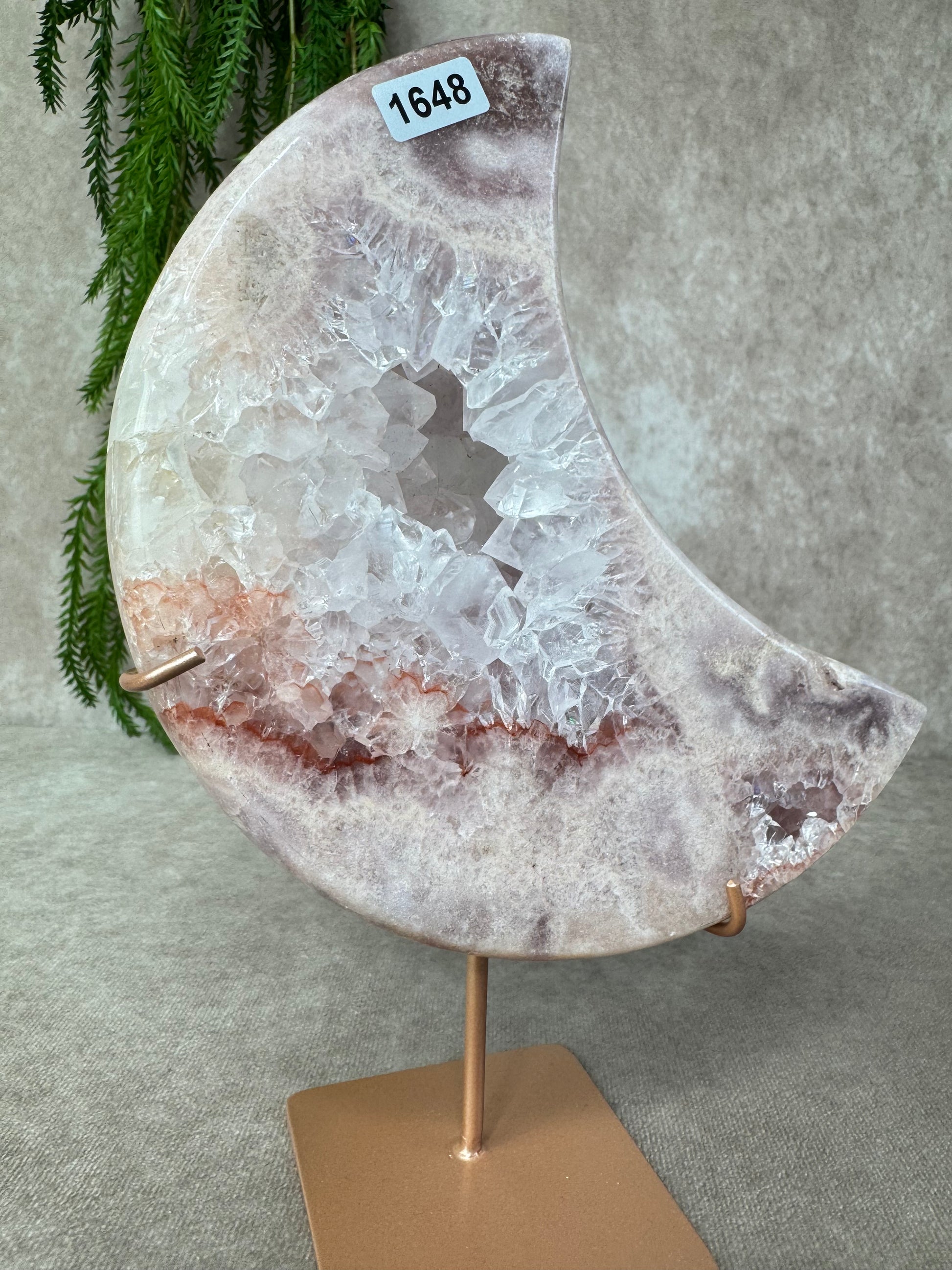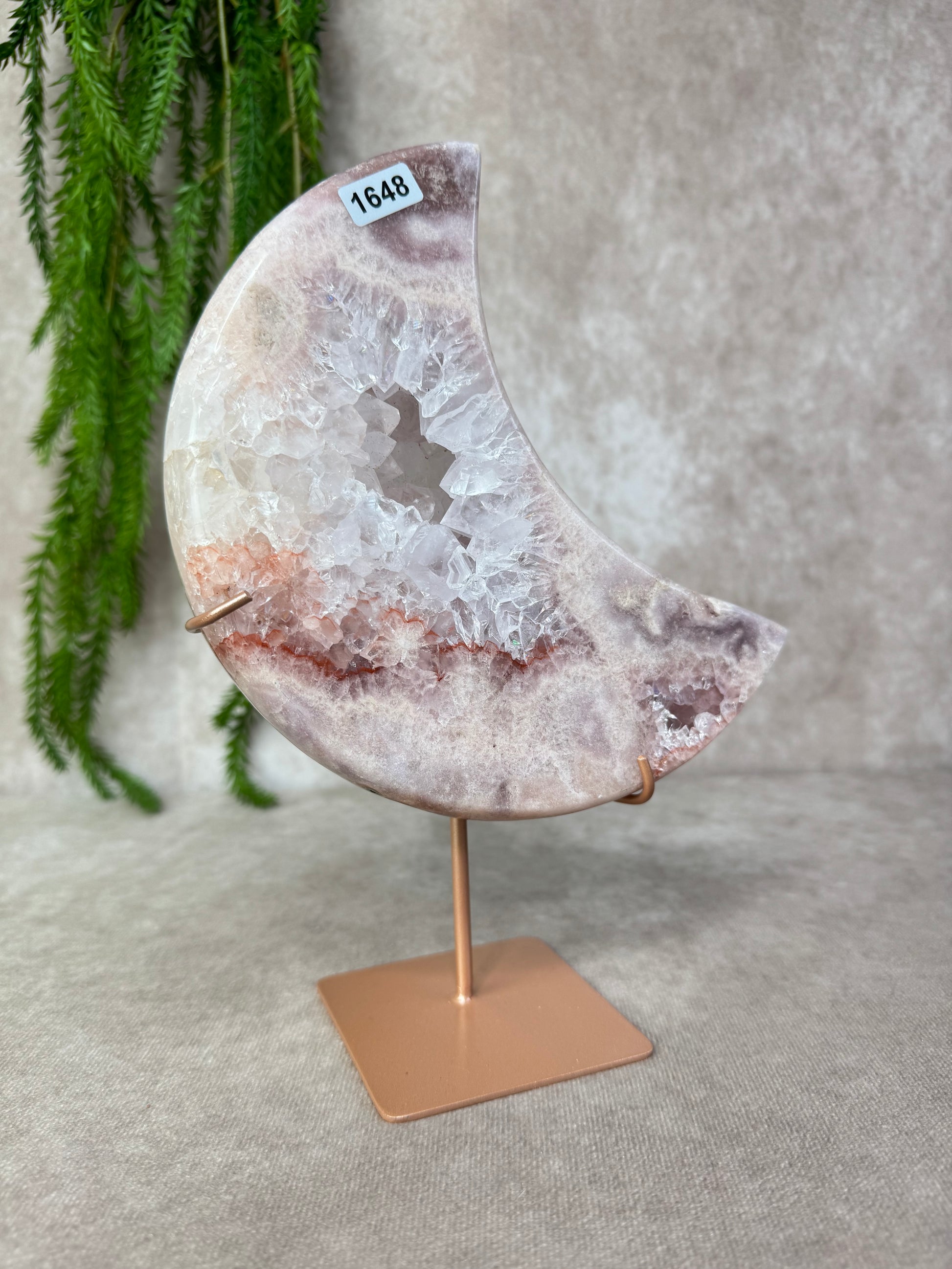 Deze schitterende maan van roze amethist straalt zachtheid en rust uit. Met haar imposante formaat van 24 cm hoog en 15,7 cm breed en een gewicht van 1387 gram, is dit een indrukwekkend stuk dat meteen in het oog springt.