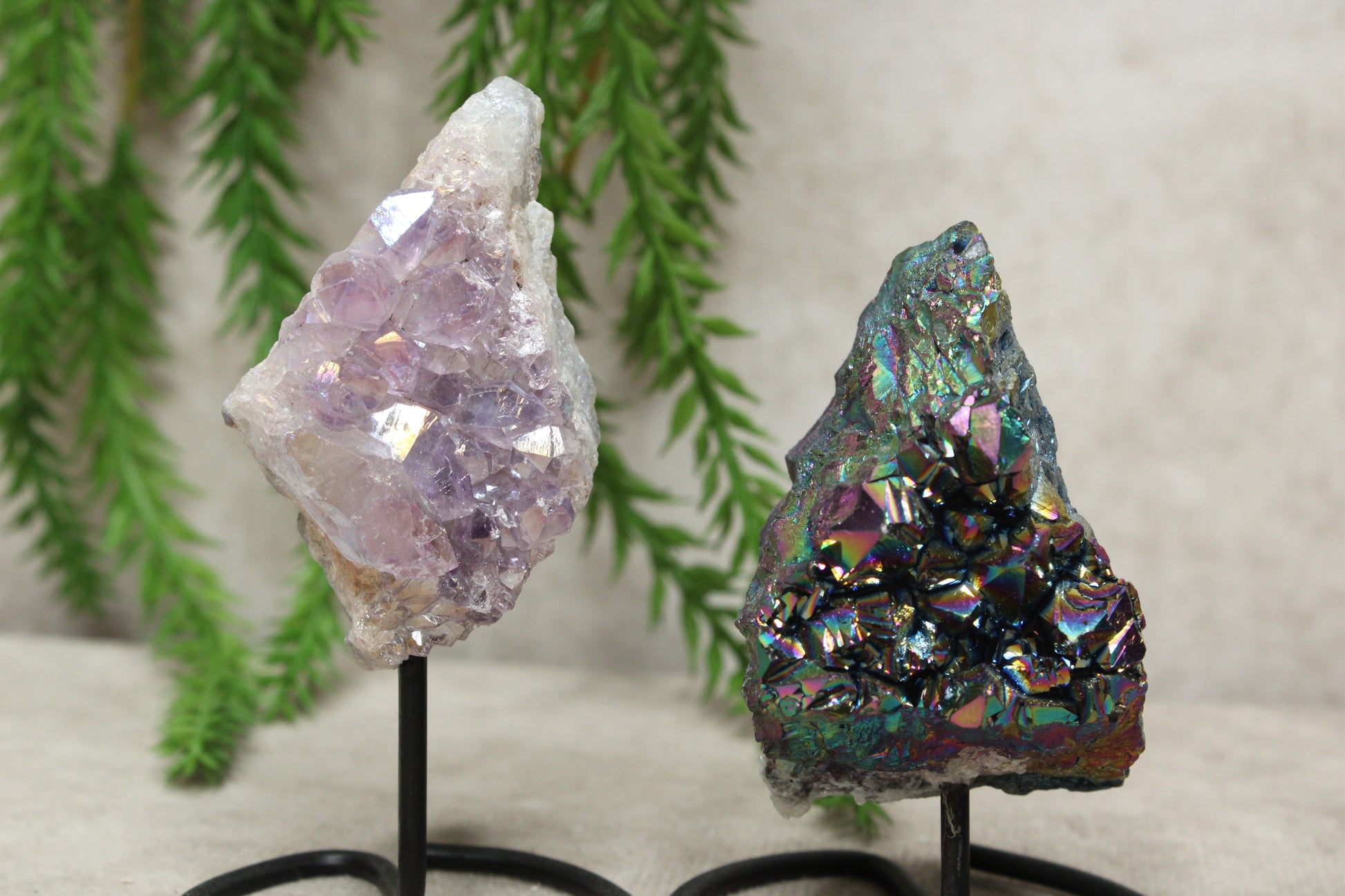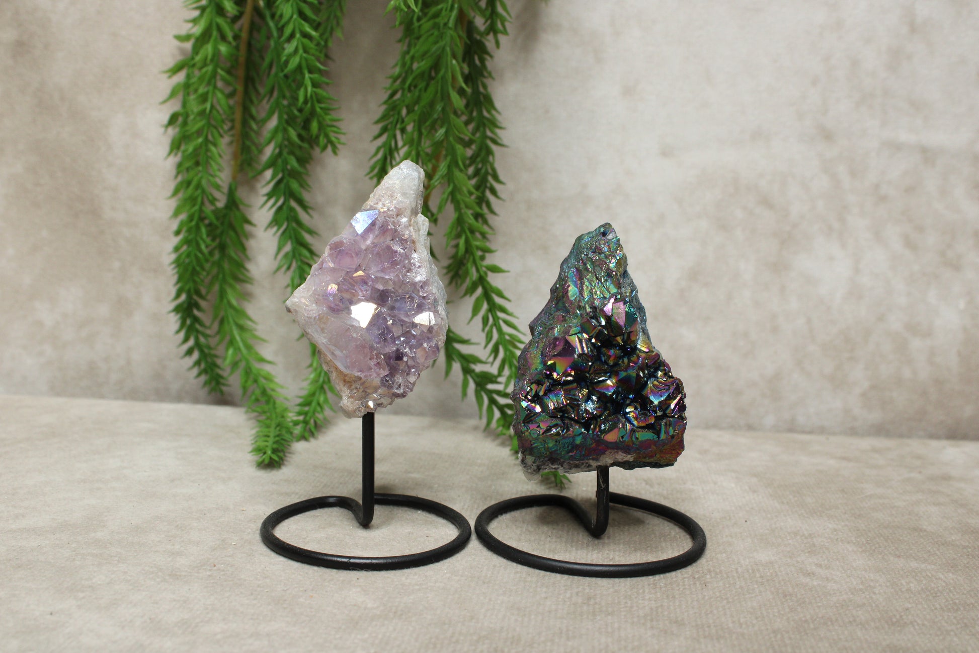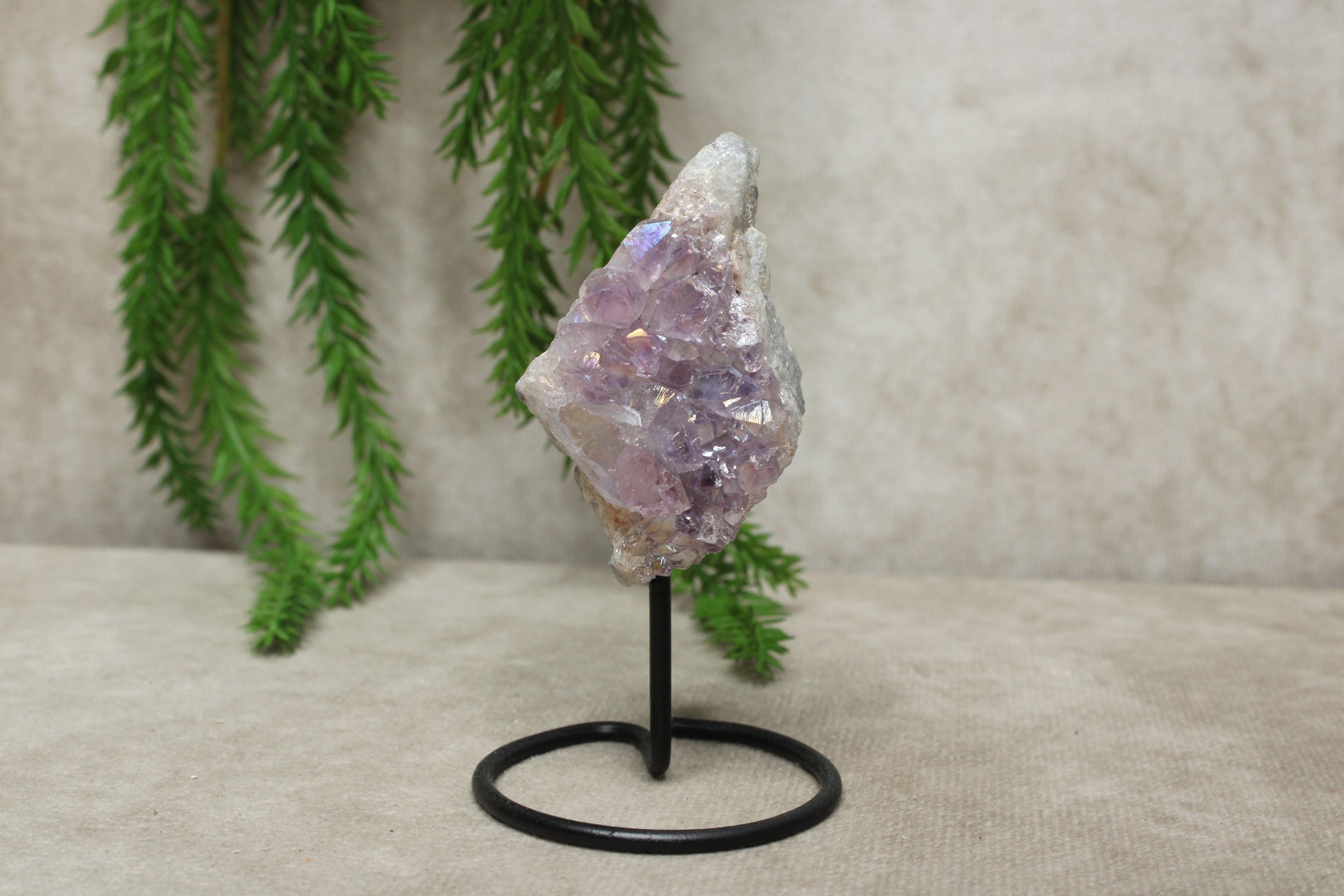 Deze mini amethist is voorzien van een aura-laagje, een door mensen aangebrachte coating op natuurlijke amethist die zorgt voor een prachtige, iriserende glans. De stukjes zijn ongeveer 7–9 cm hoog inc standaard.