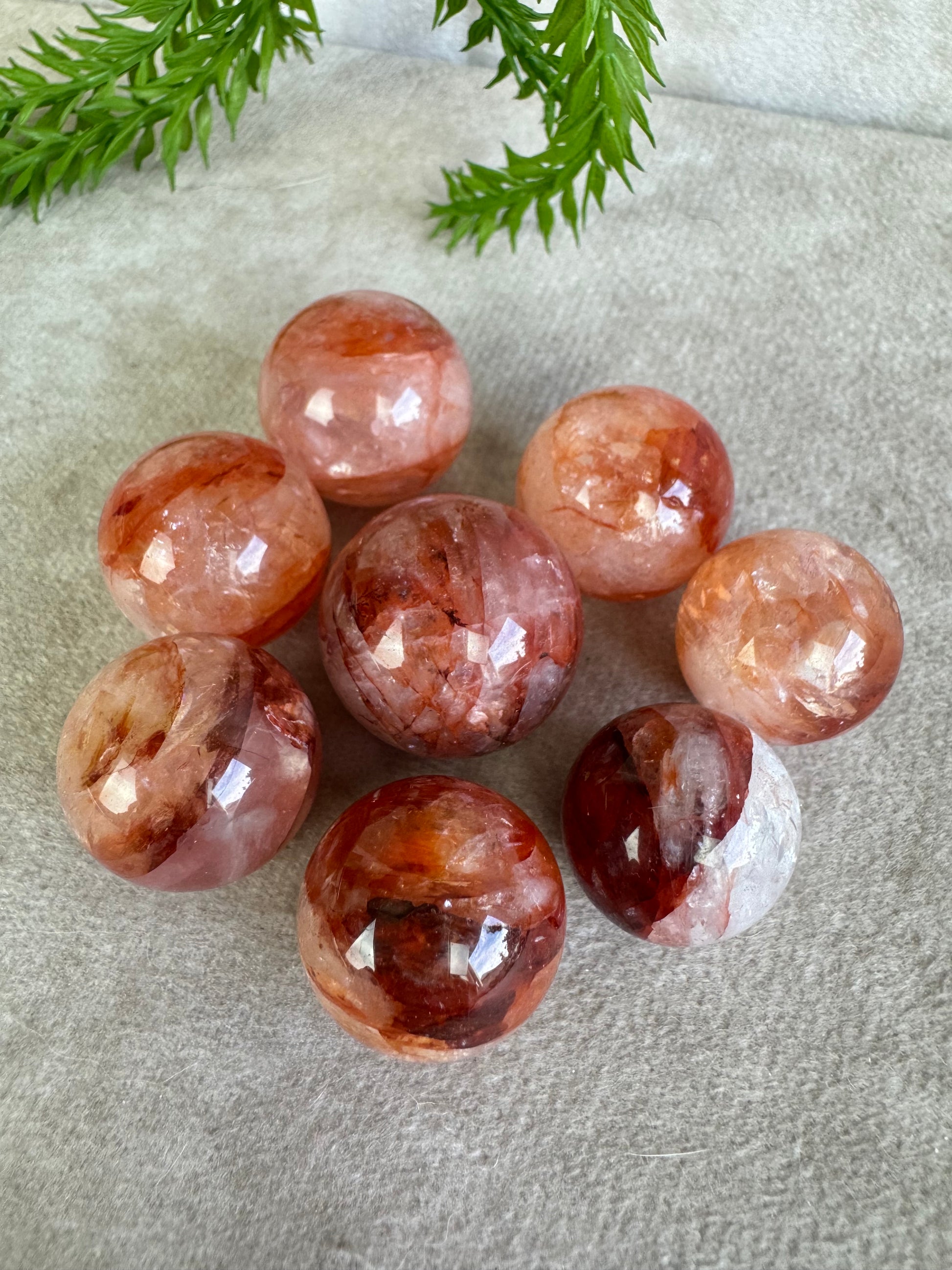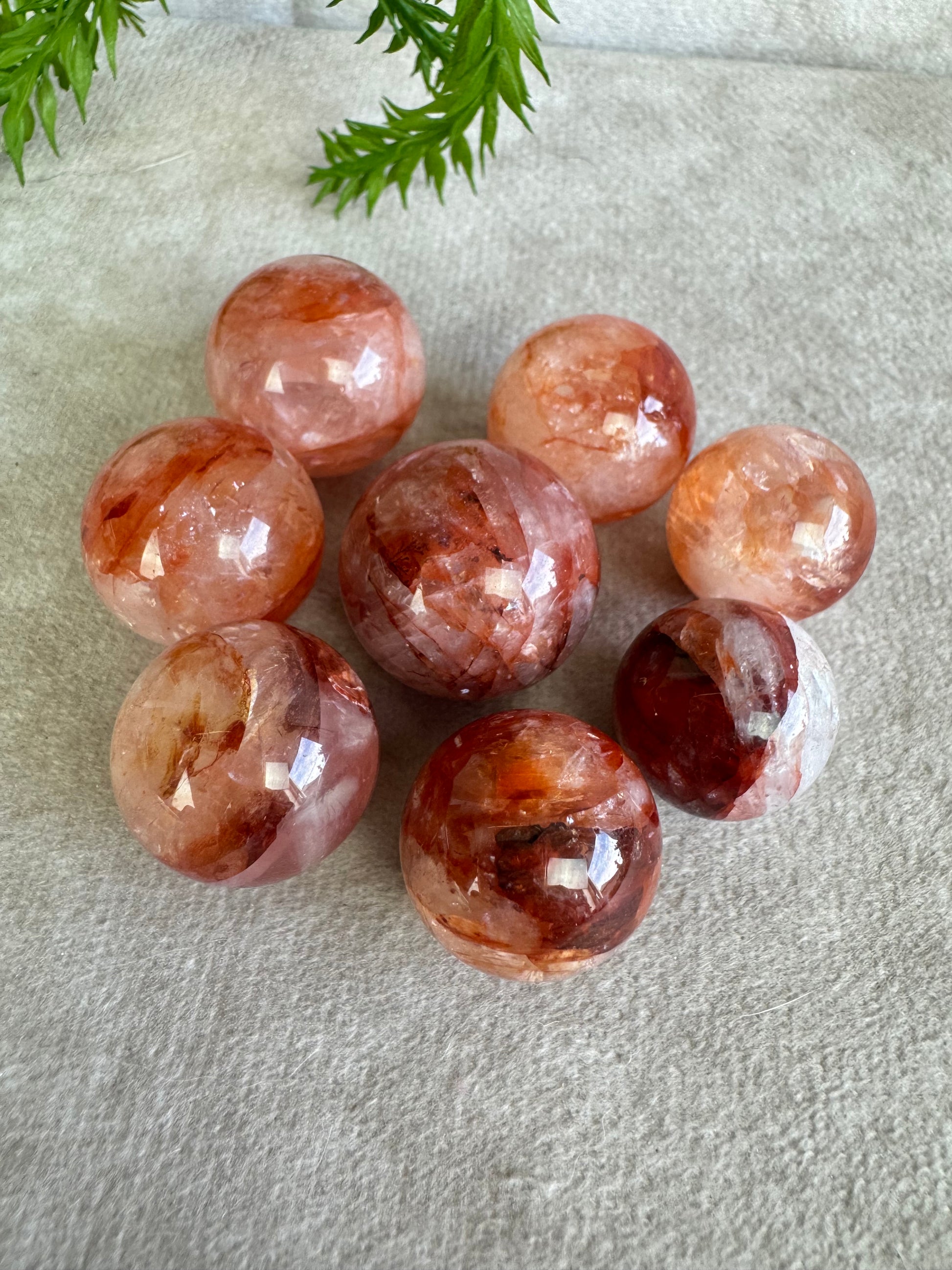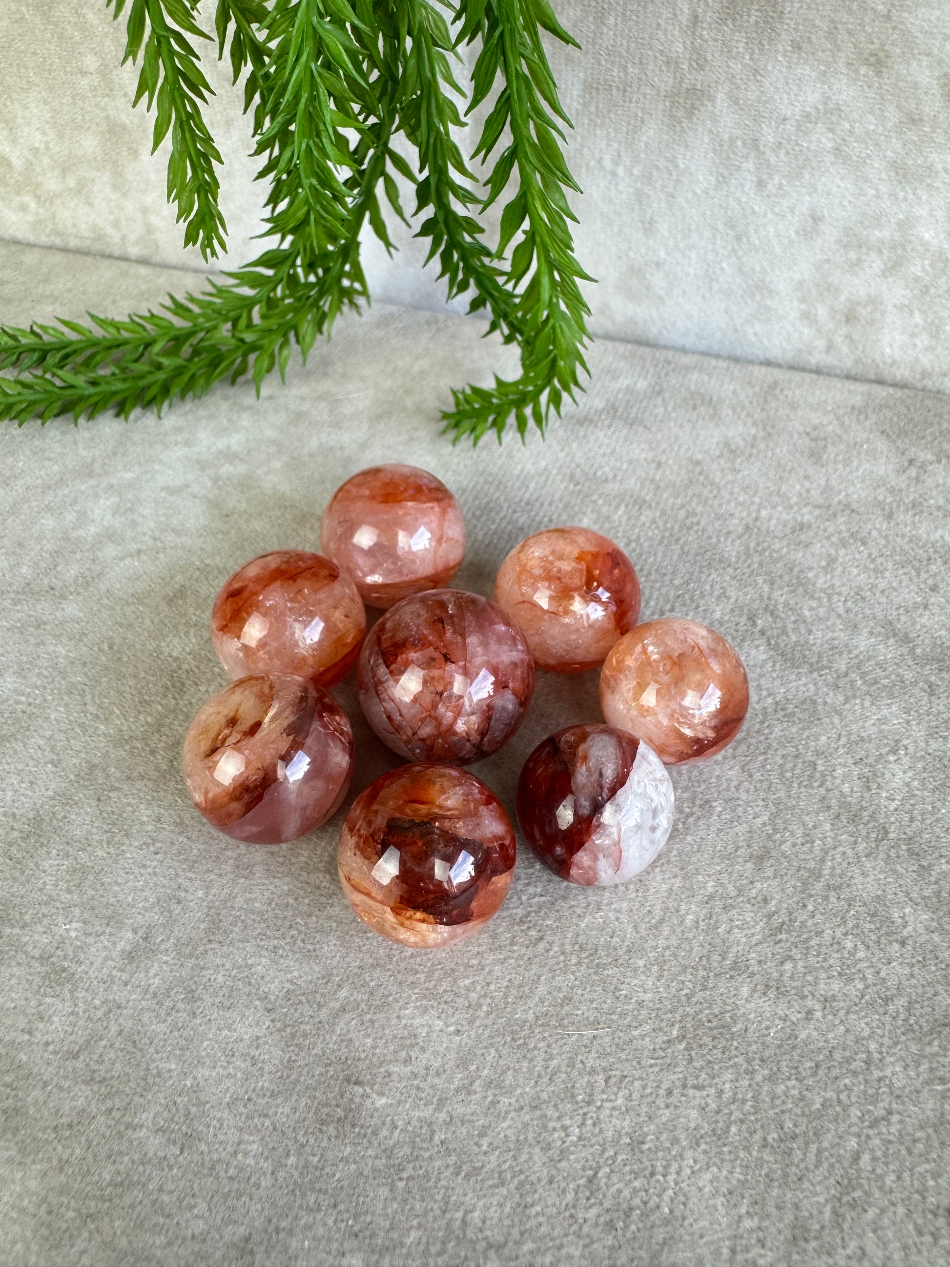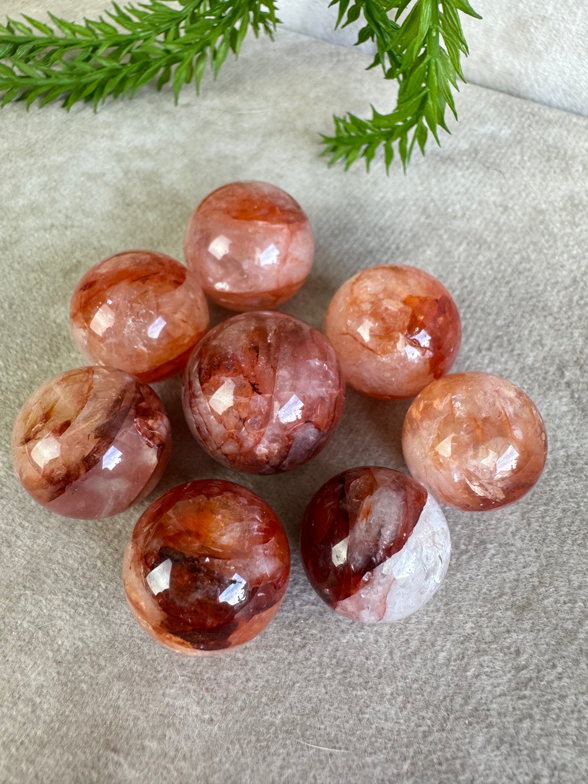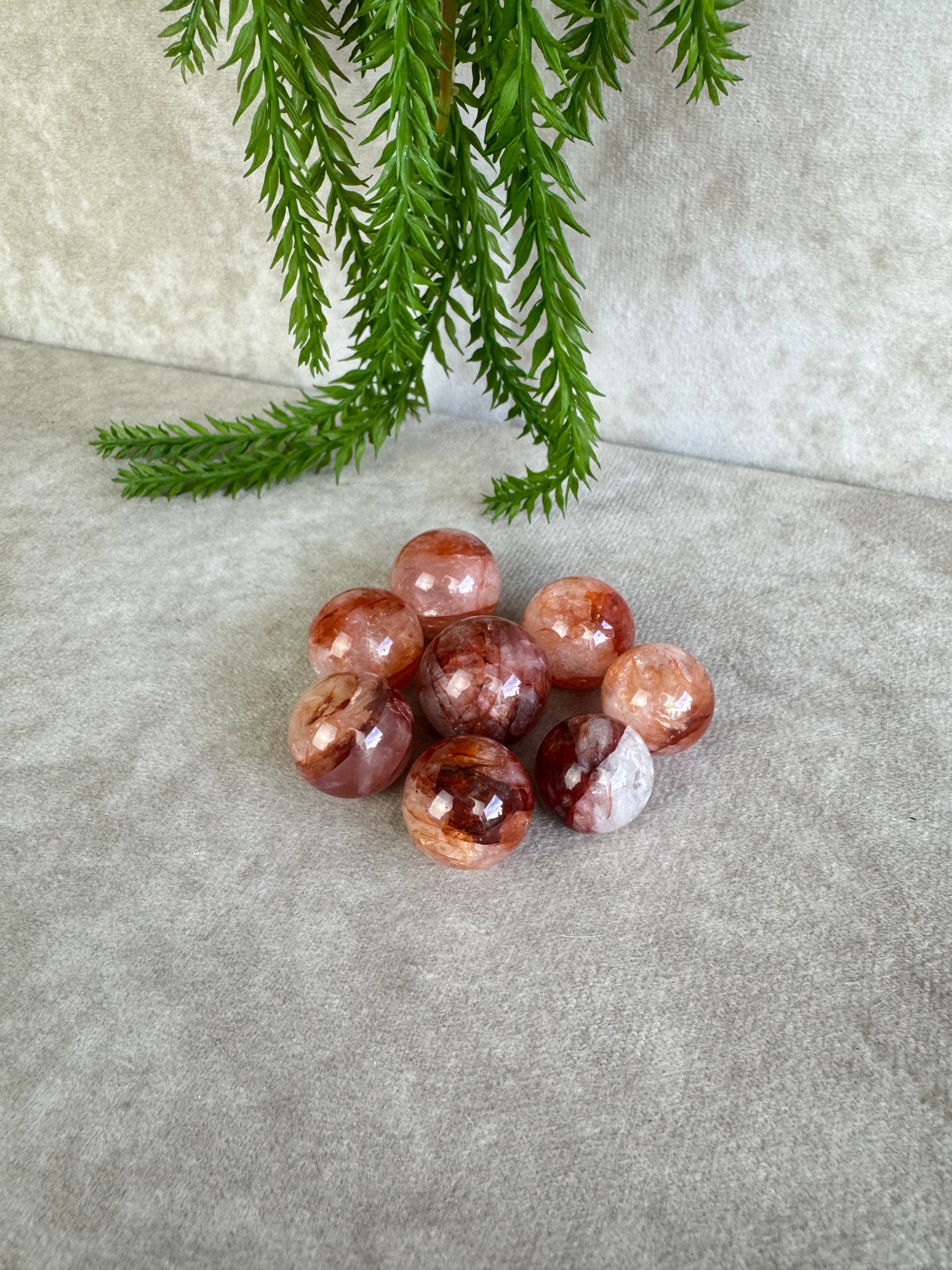 Deze mini bollen van vuurkwarts, ook bekend als hematoïde kwarts, hebben een warme uitstraling met hun rood-oranje tot goudbruine tinten. Elke bol is uniek, met prachtige natuurlijke patronen en glans.