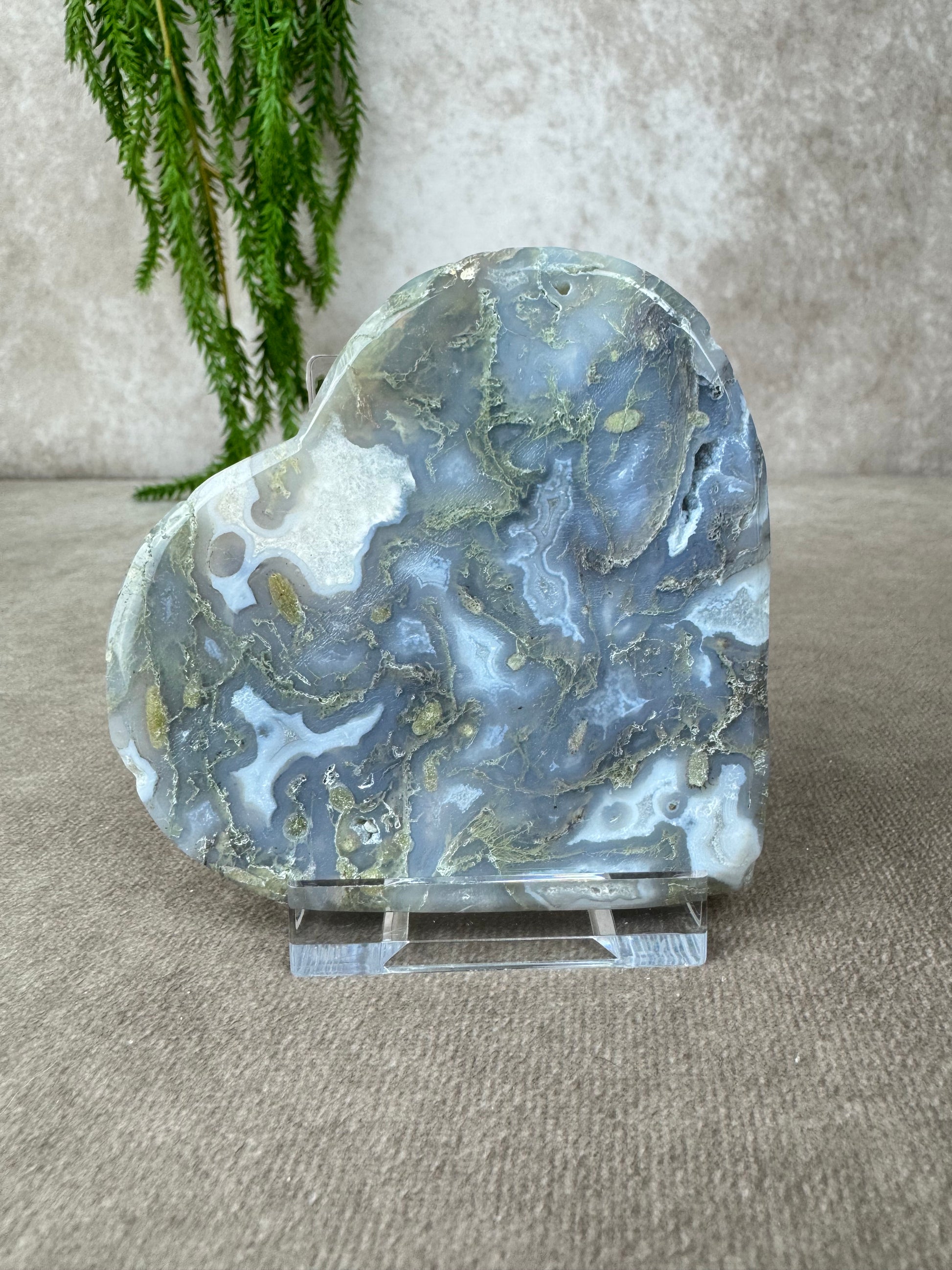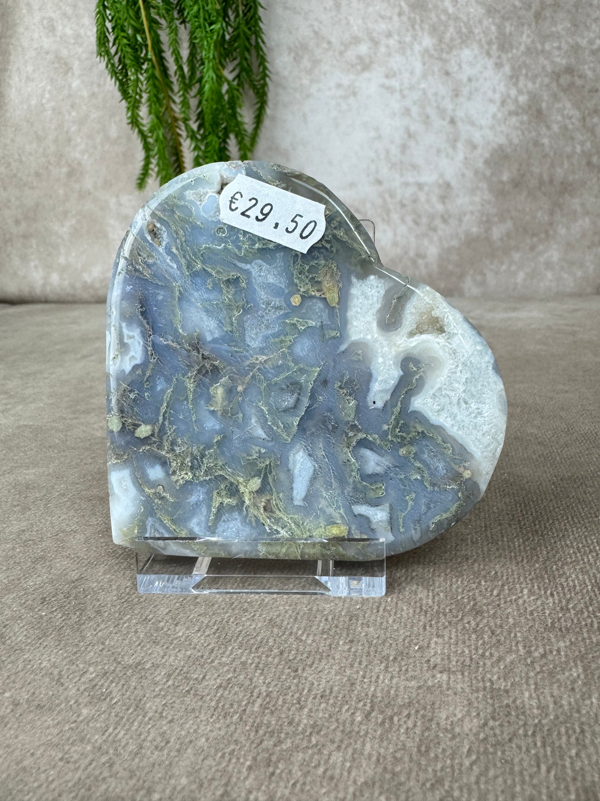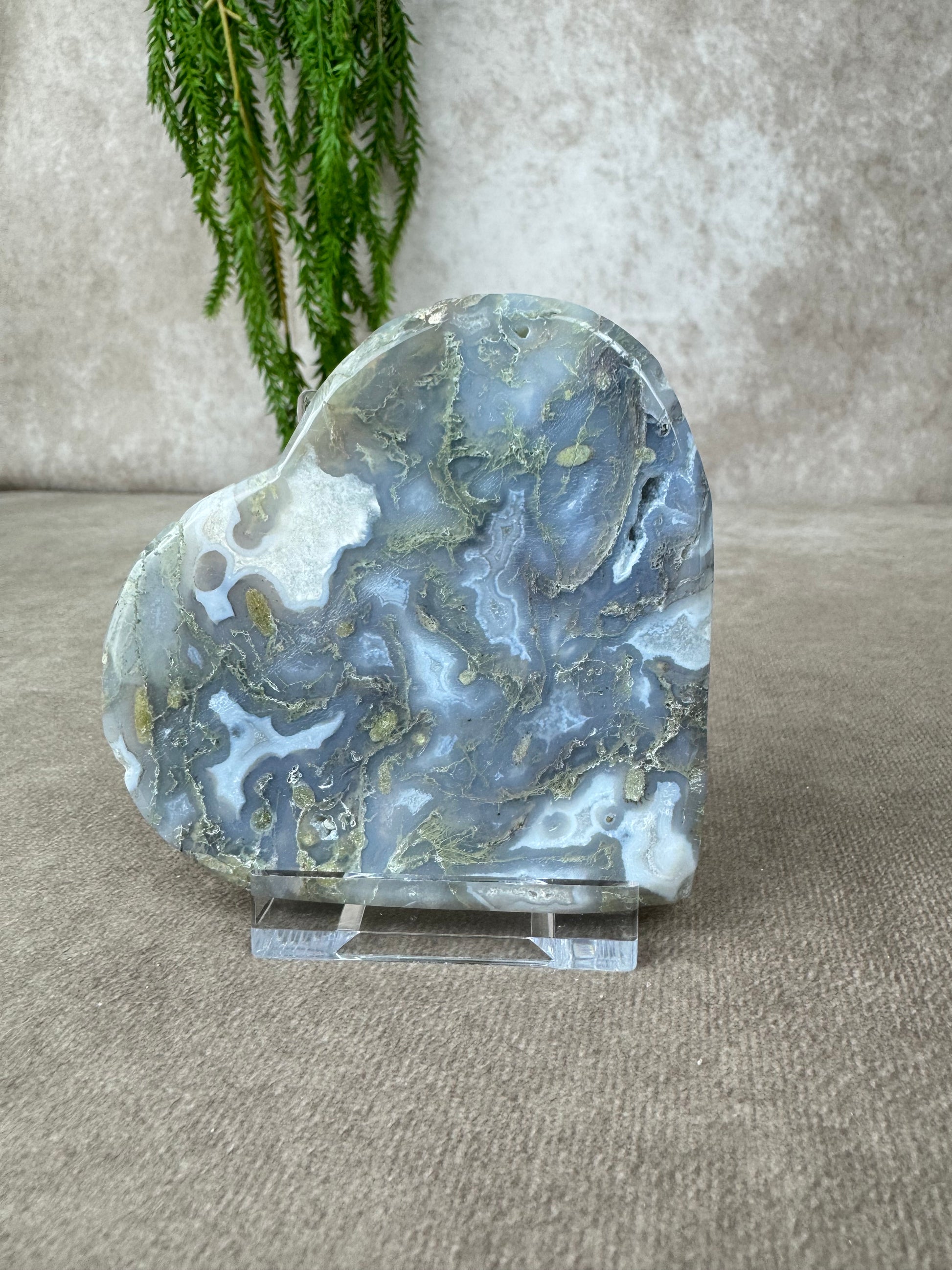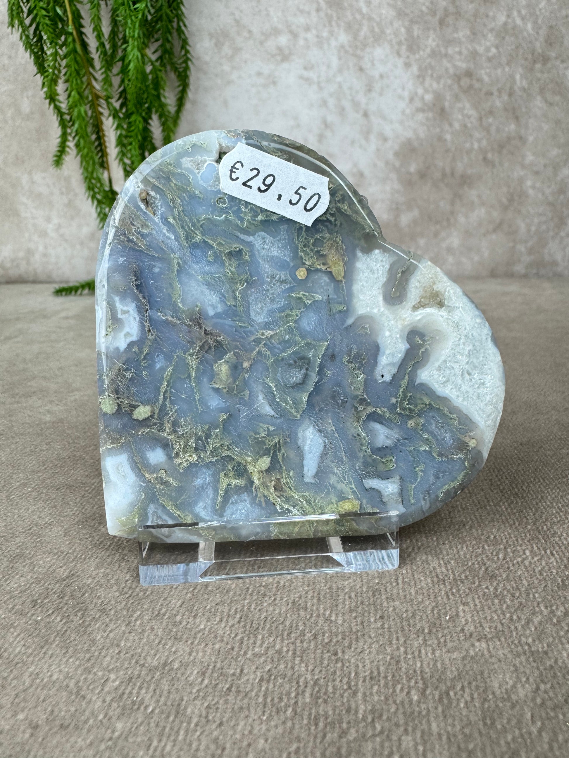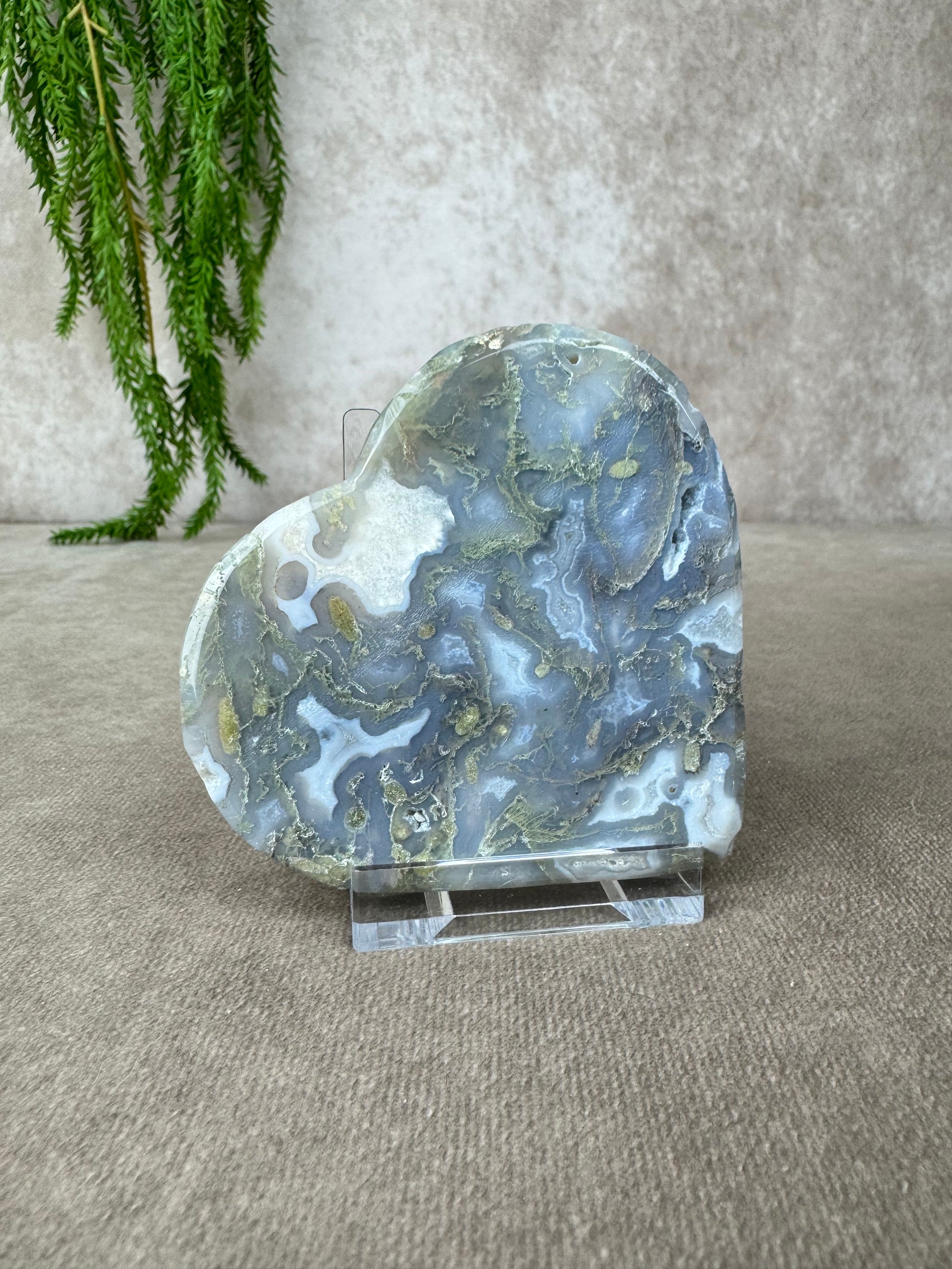 Mosagaat is een steen van rust, herstel en verbondenheid met de aarde. Ze helpt je om te aarden, brengt stabiliteit in tijden van verandering en nodigt uit tot zachte groei, precies zoals de natuur dat doet. Dit hart ligt stevig in de hand, straalt zachtheid uit en past perfect in een rustige ruimte, een altaar of als liefdevol geschenk.