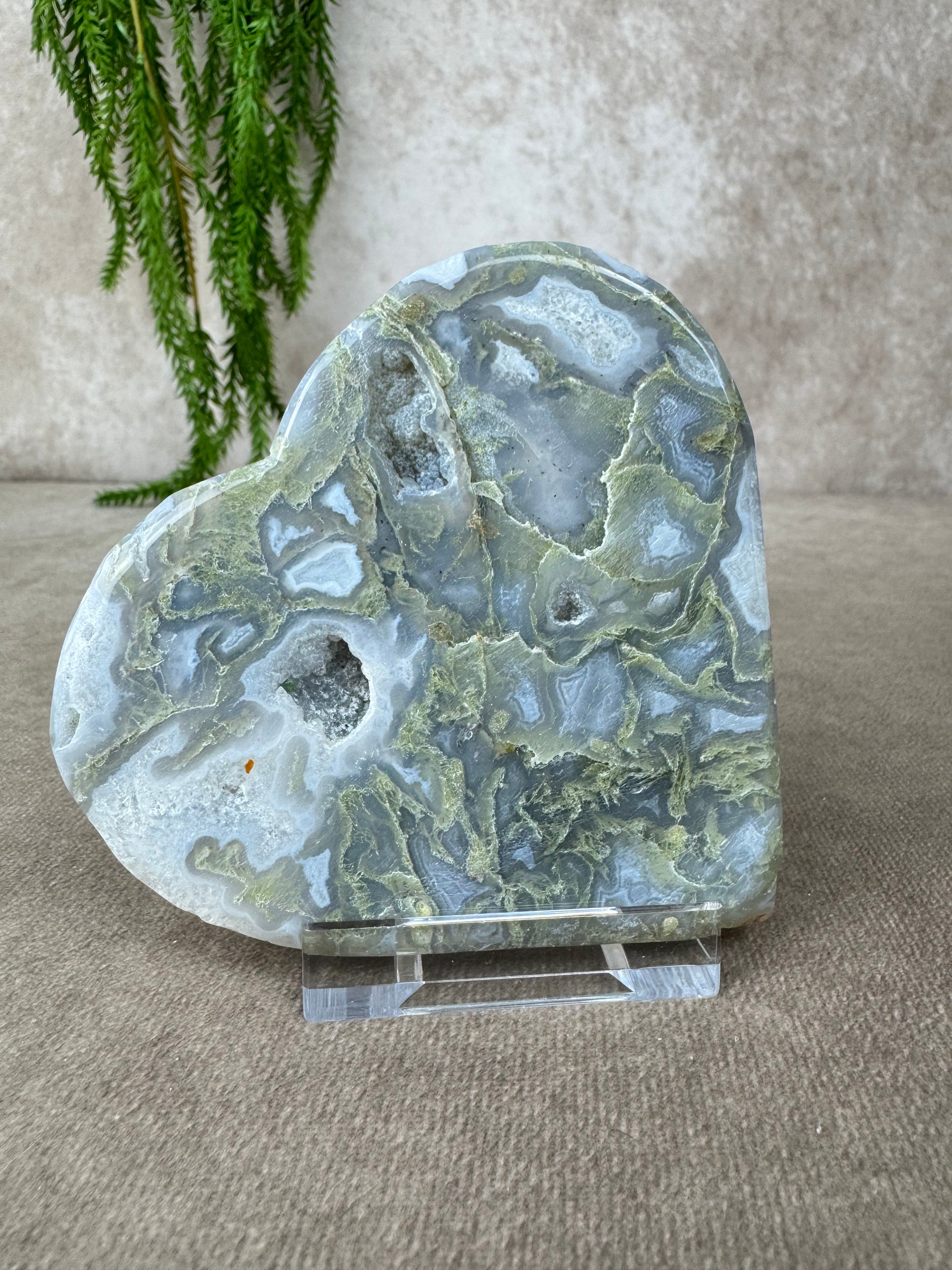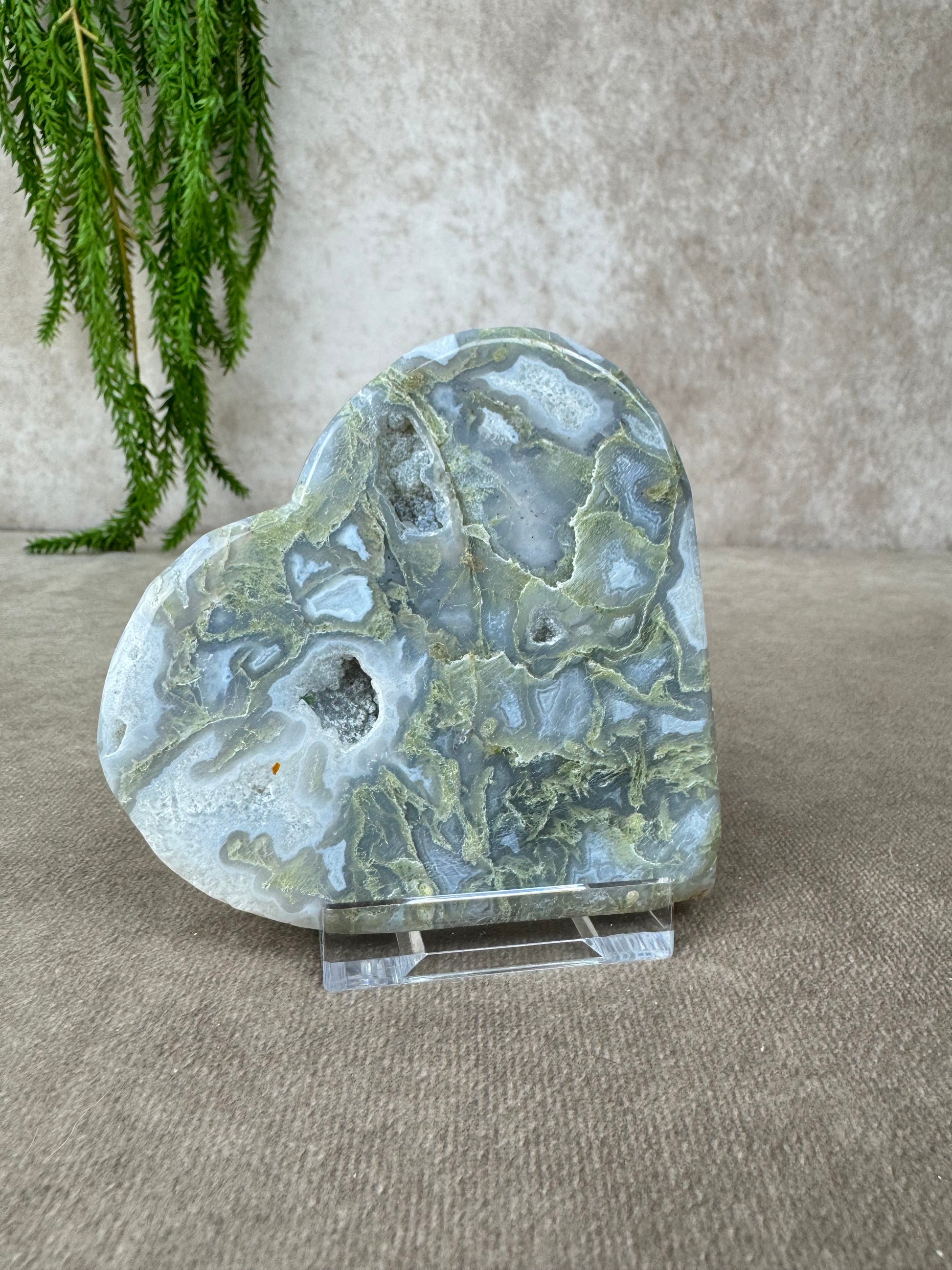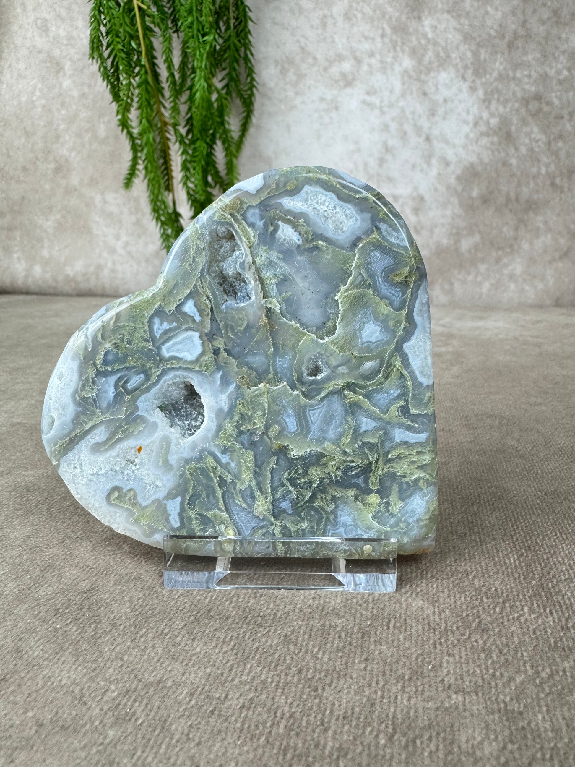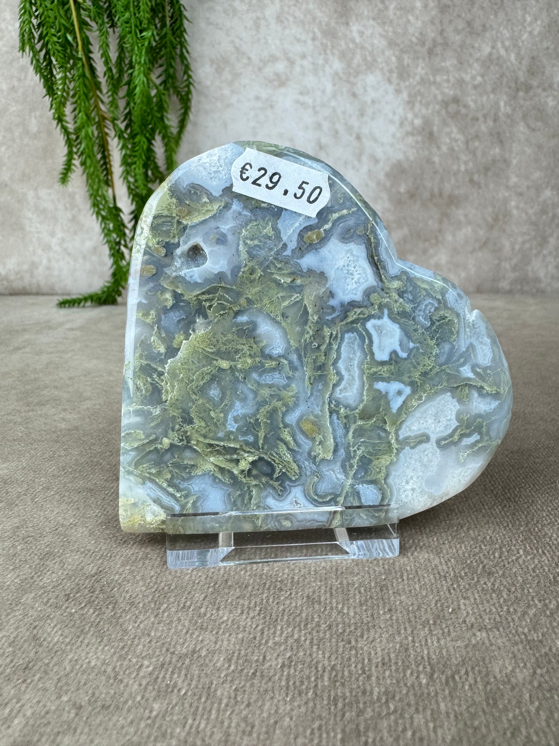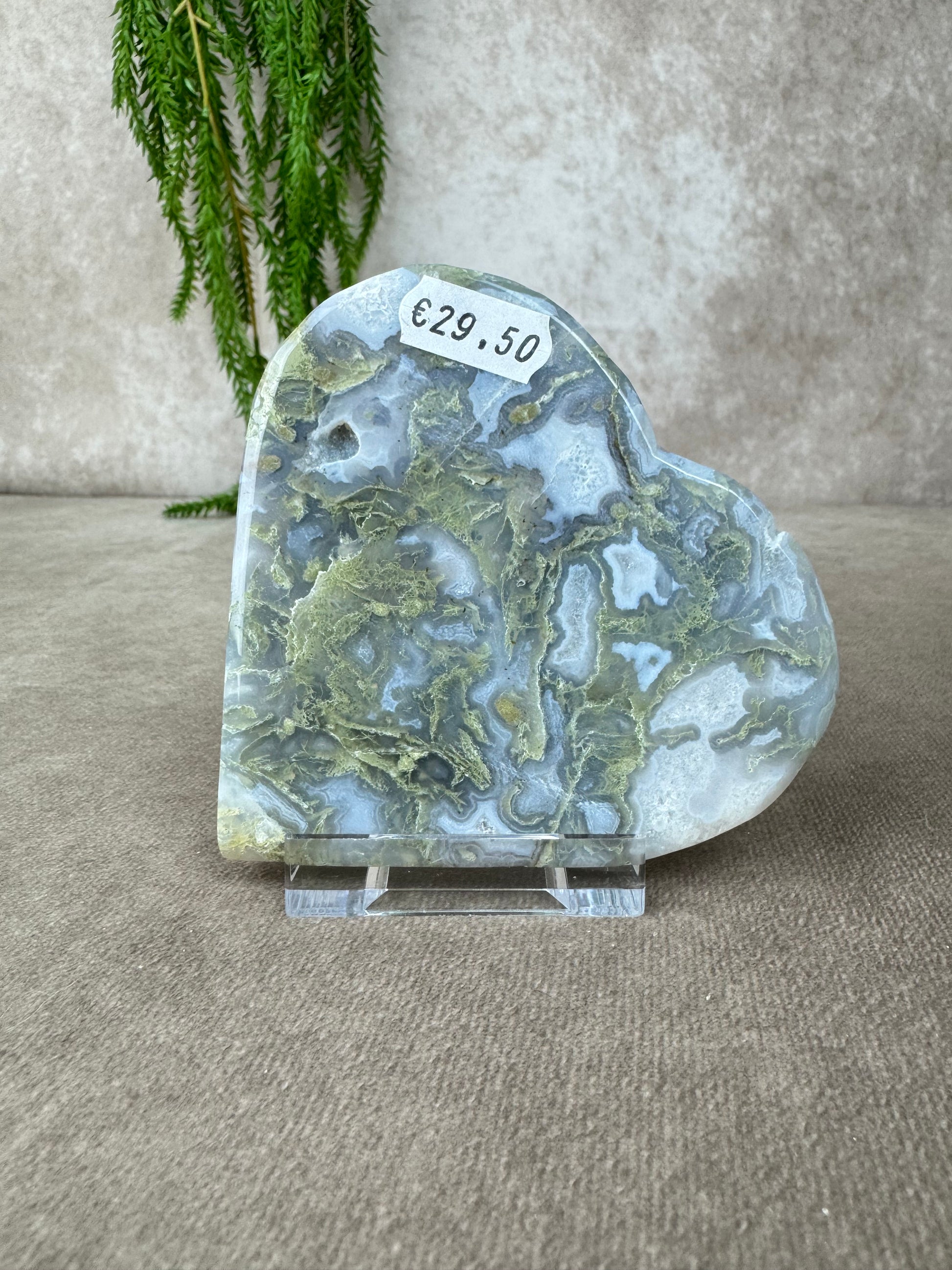 Mosagaat is een steen van rust, herstel en verbondenheid met de aarde. Ze helpt je om te aarden, brengt stabiliteit in tijden van verandering en nodigt uit tot zachte groei, precies zoals de natuur dat doet. Dit hart ligt stevig in de hand, straalt zachtheid uit en past perfect in een rustige ruimte, een altaar of als liefdevol geschenk.