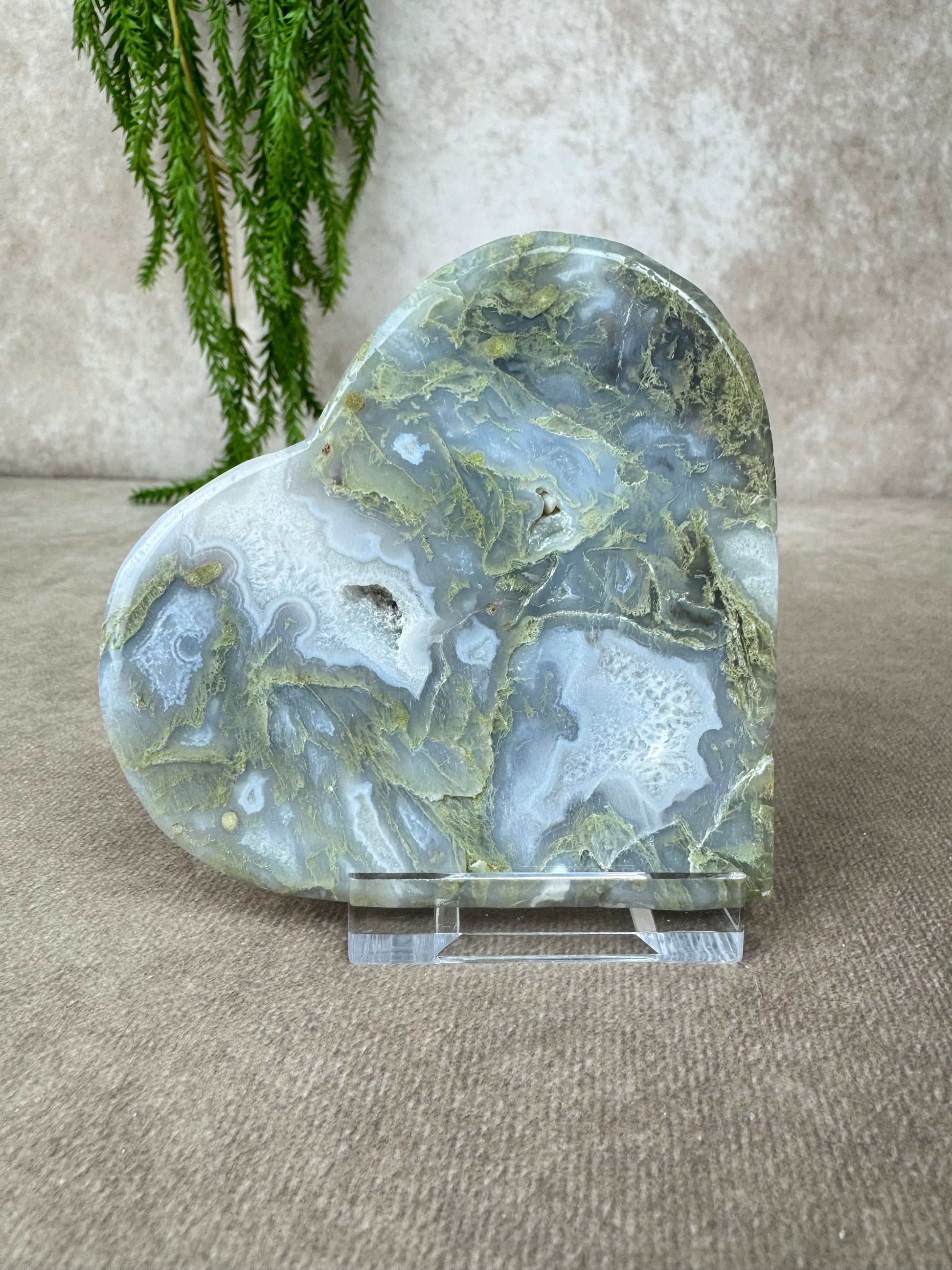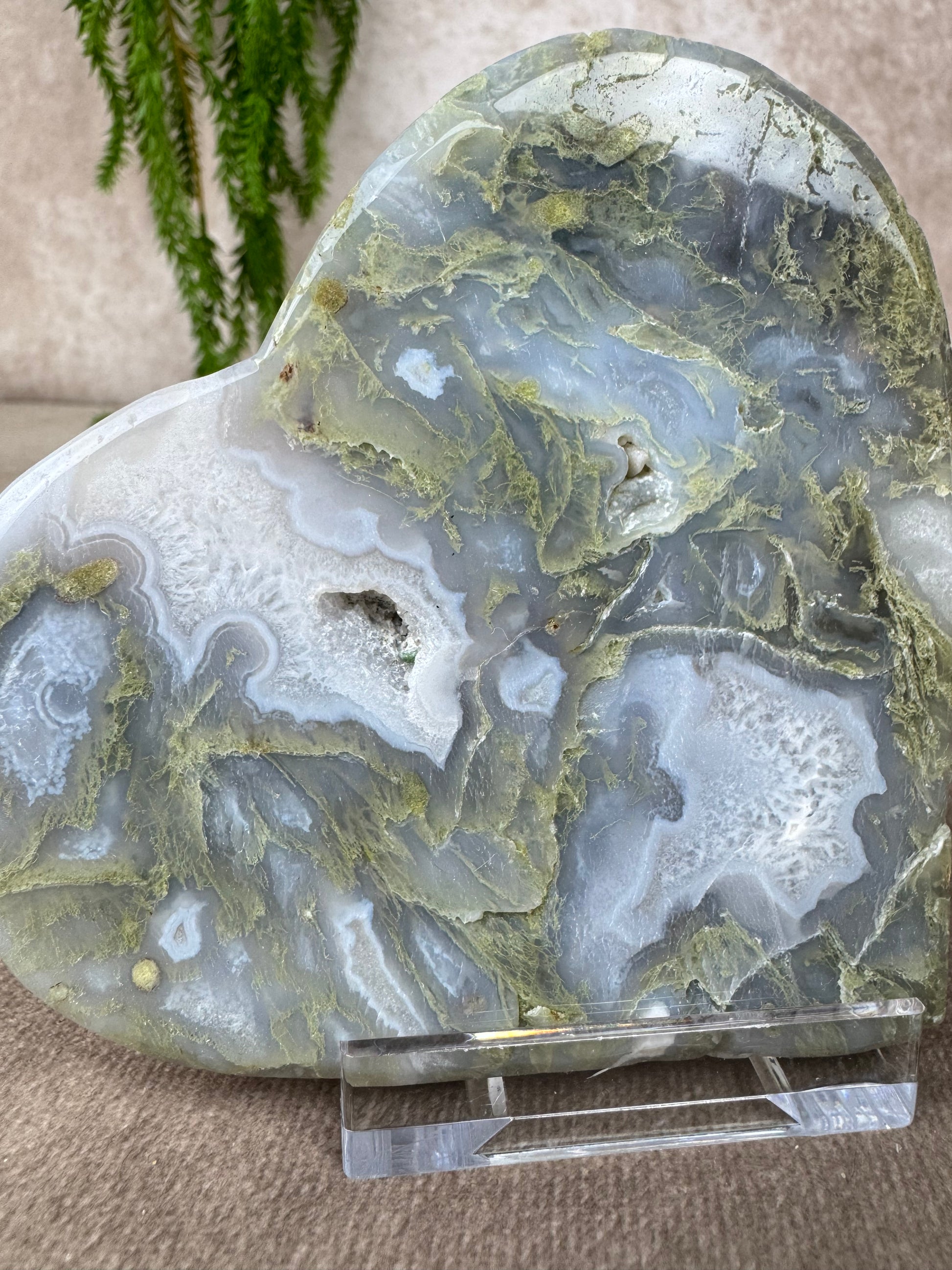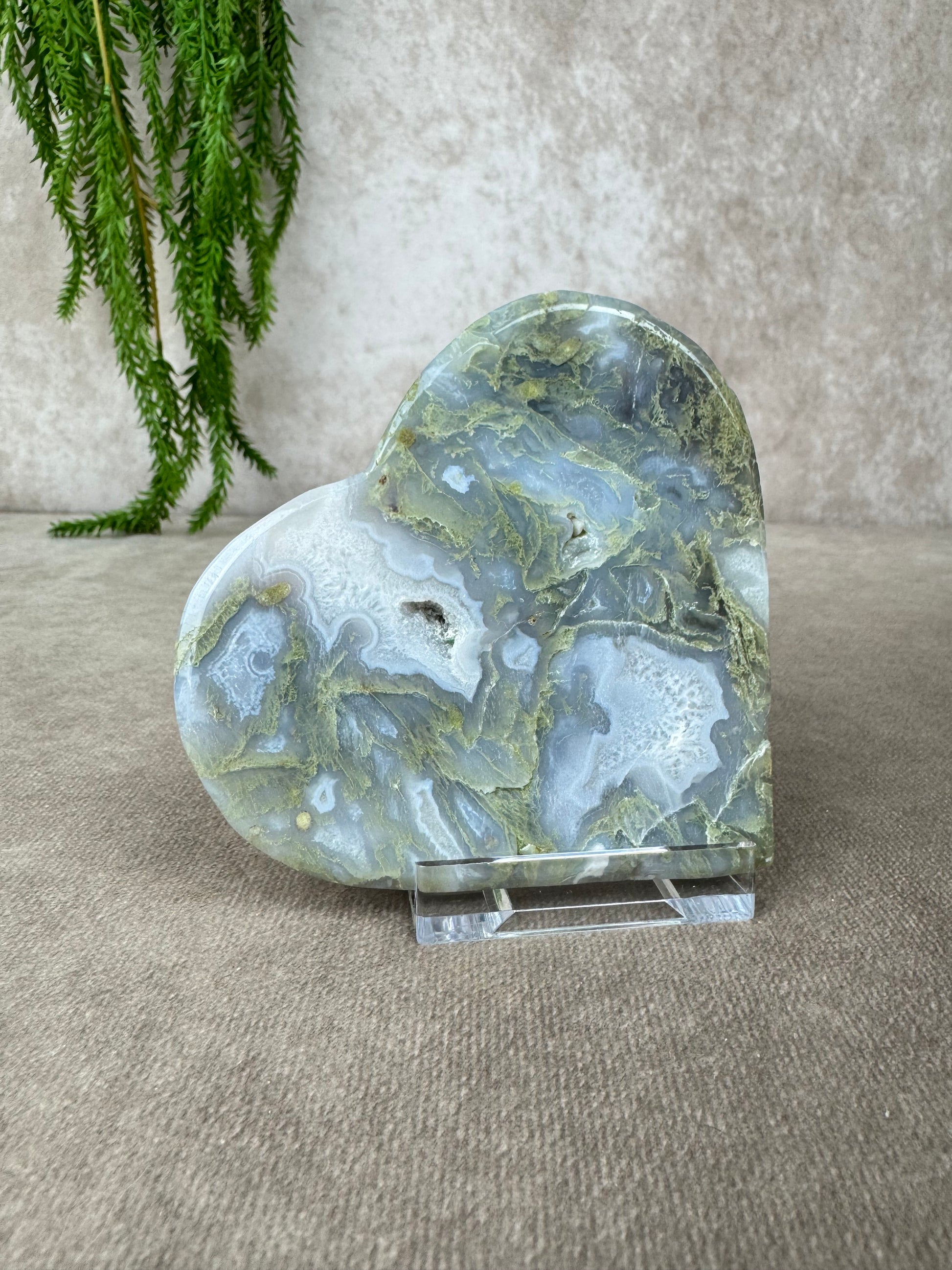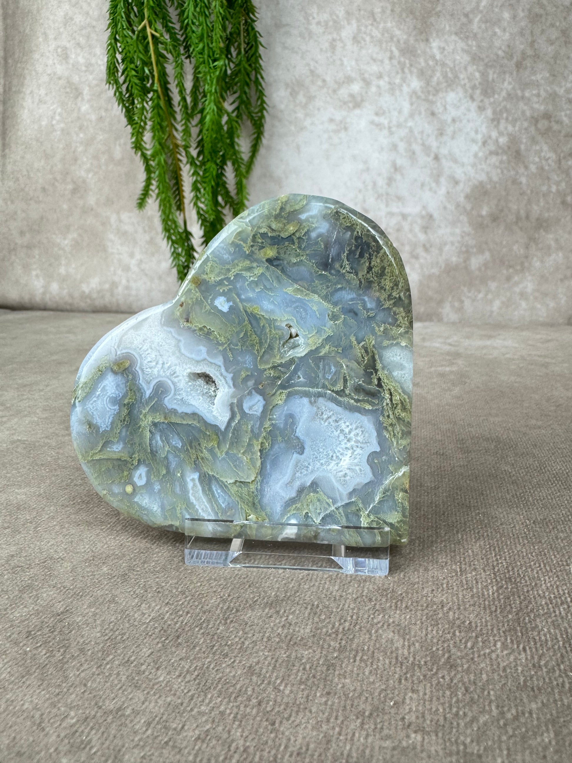 Mosagaat is een steen van rust, herstel en verbondenheid met de aarde. Ze helpt je om te aarden, brengt stabiliteit in tijden van verandering en nodigt uit tot zachte groei, precies zoals de natuur dat doet. Dit hart ligt stevig in de hand, straalt zachtheid uit en past perfect in een rustige ruimte, een altaar of als liefdevol geschenk.
