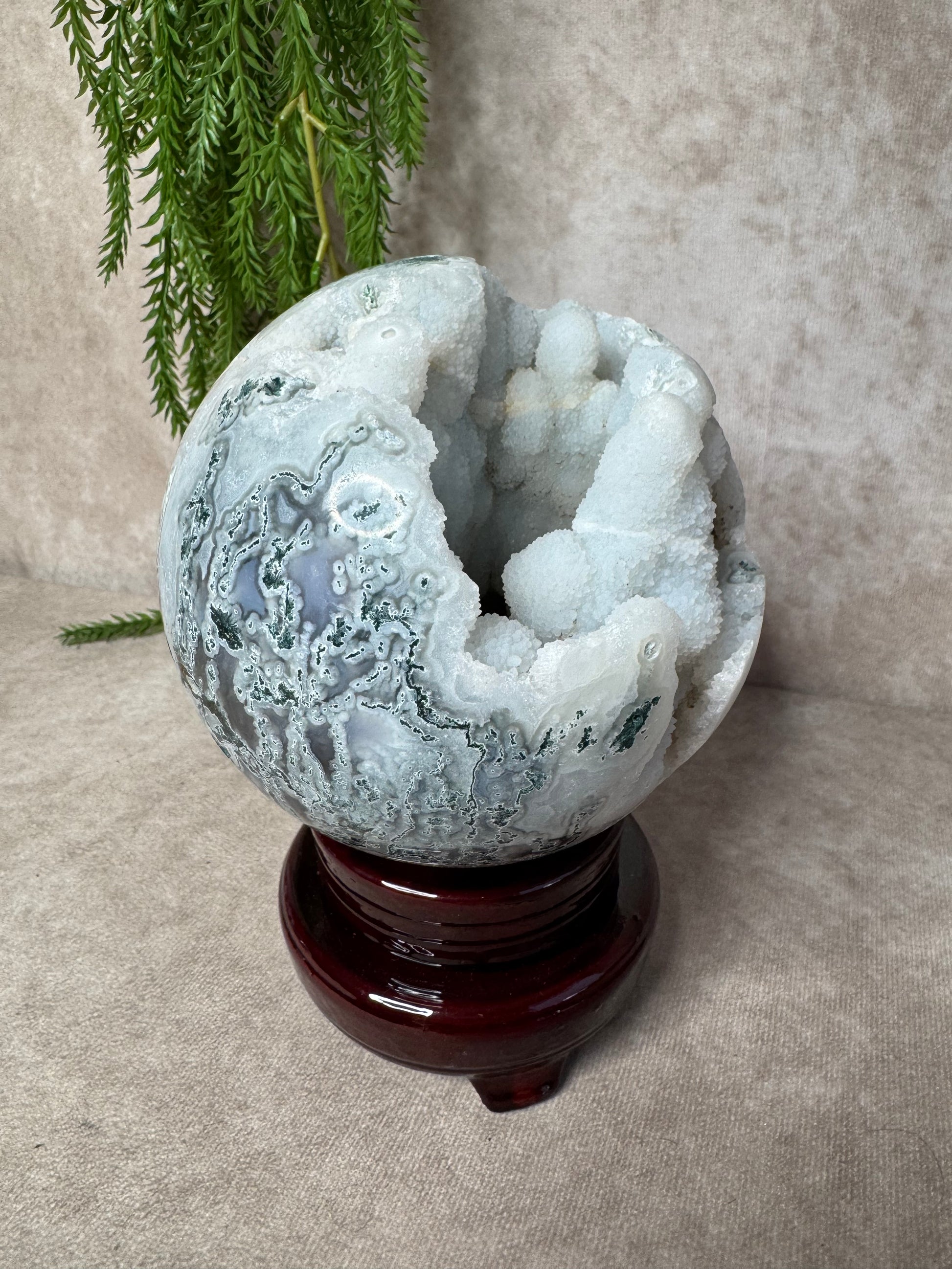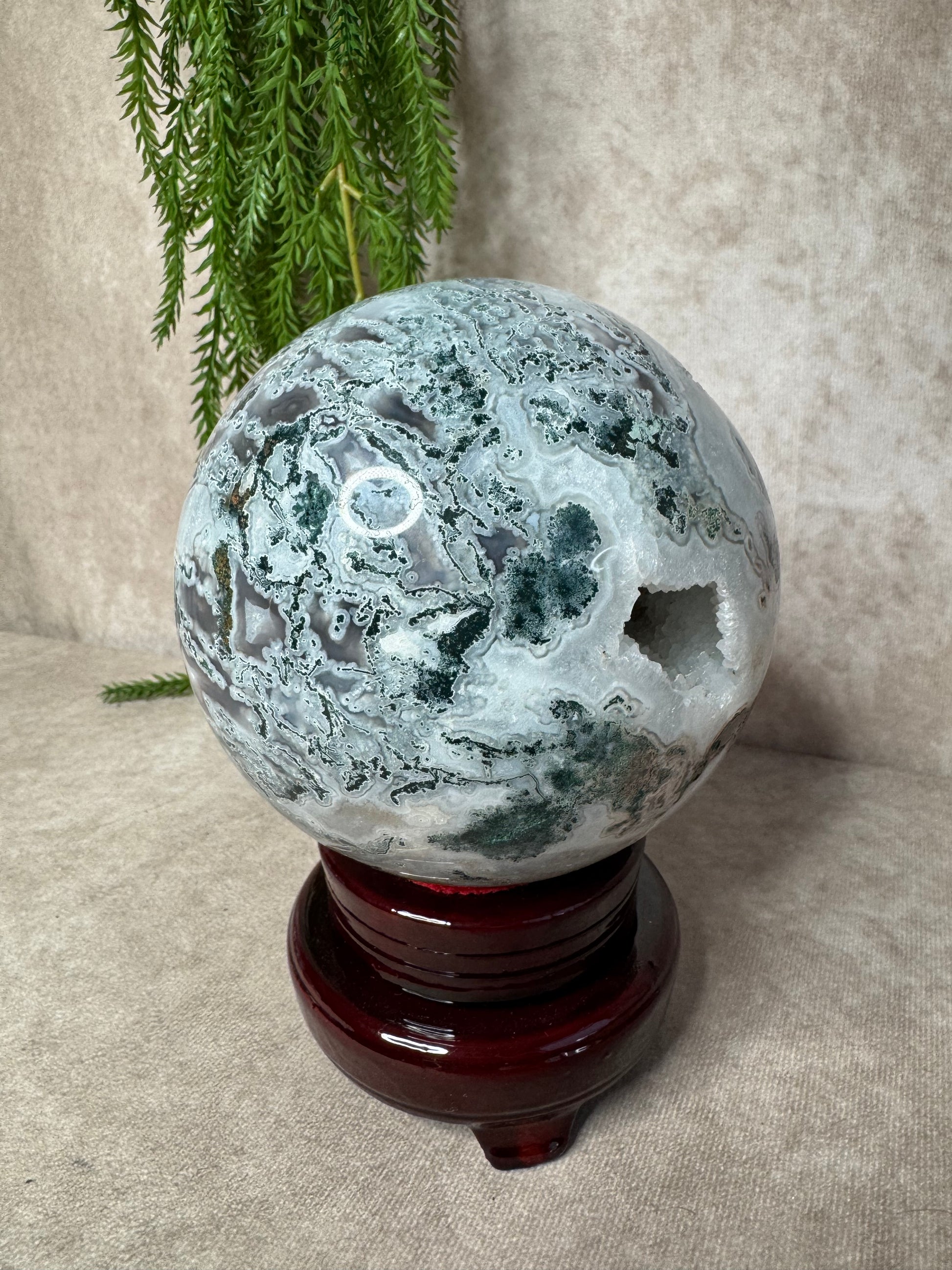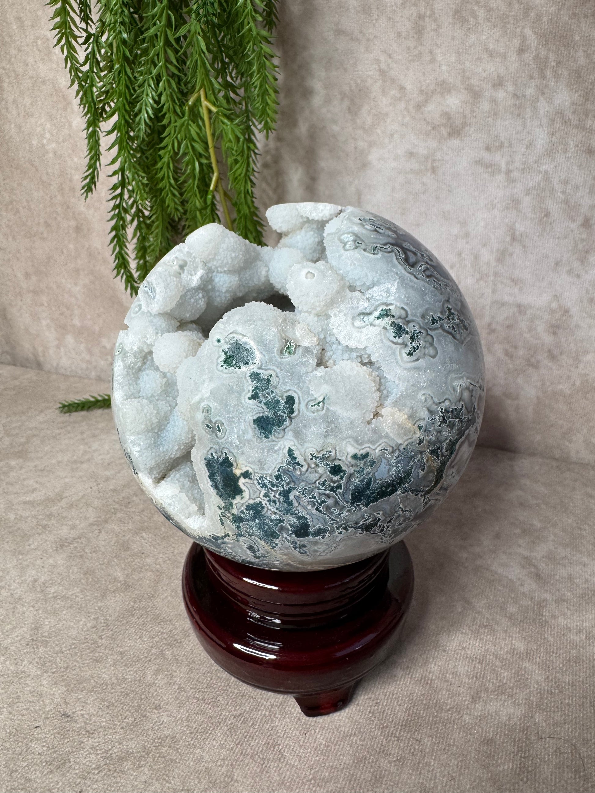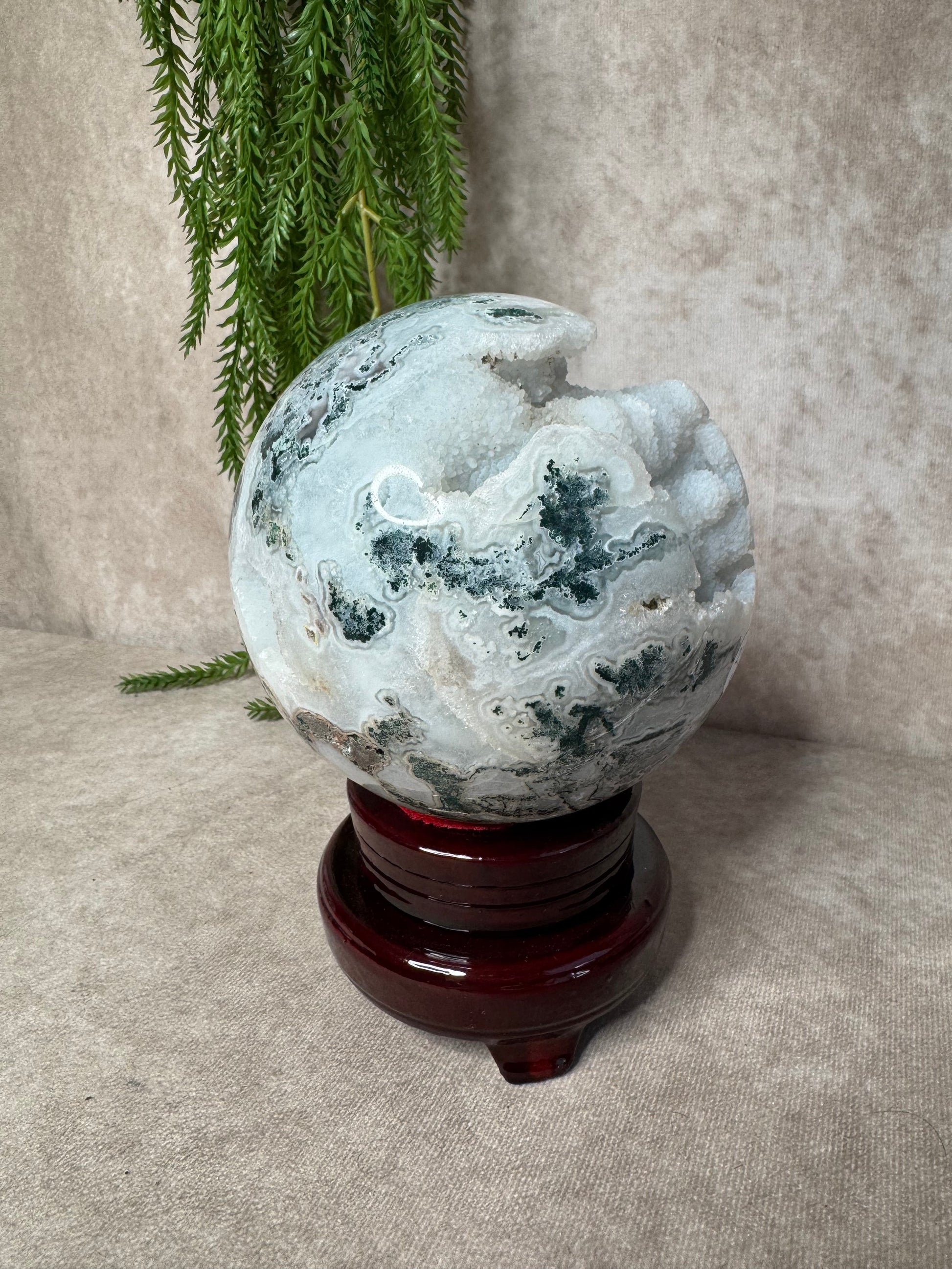Deze mega mosagaat bol van 2316 gram en circa 13,2 cm omtrek is een bijzonder natuurstuk met prachtige groene mosinsluitingen en een schitterend open druzy-gedeelte. Het lichtspel in de druzy en de diepe aardse kleuren maken de bol een ware blikvanger voor elke ruimte.