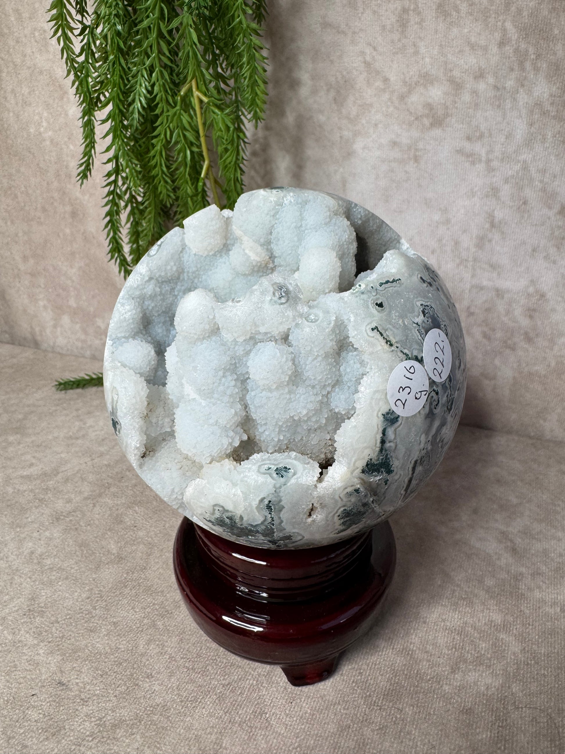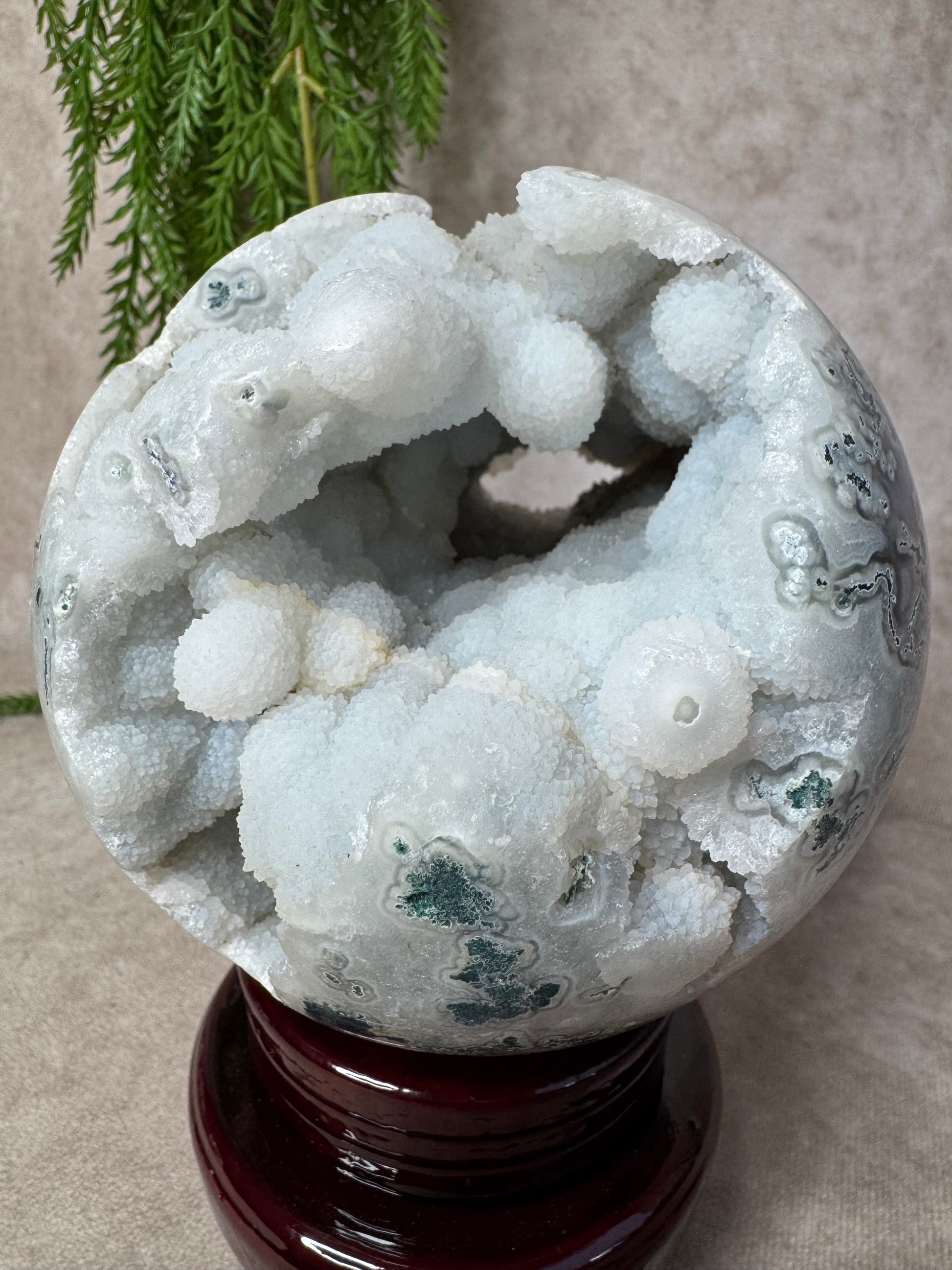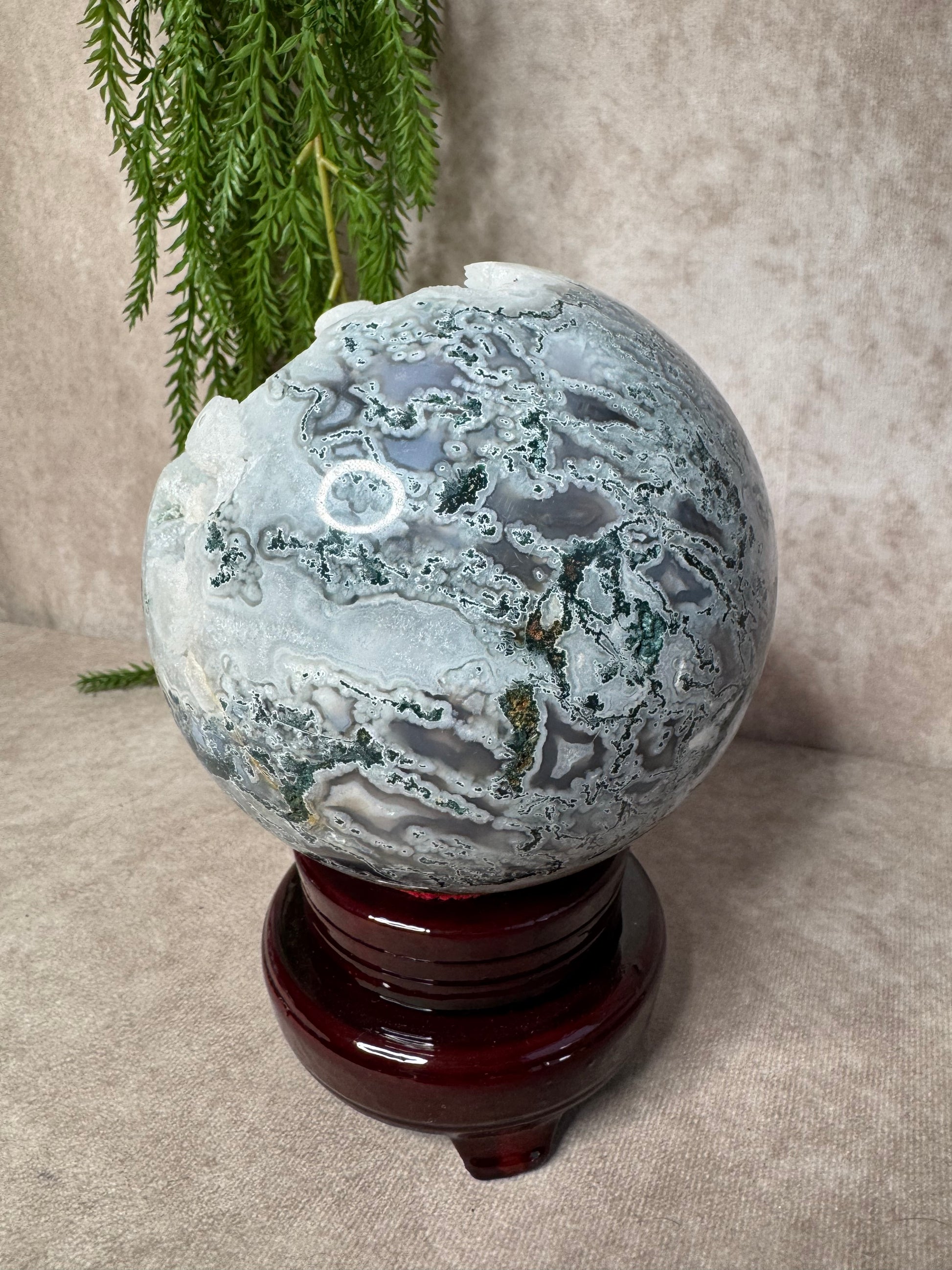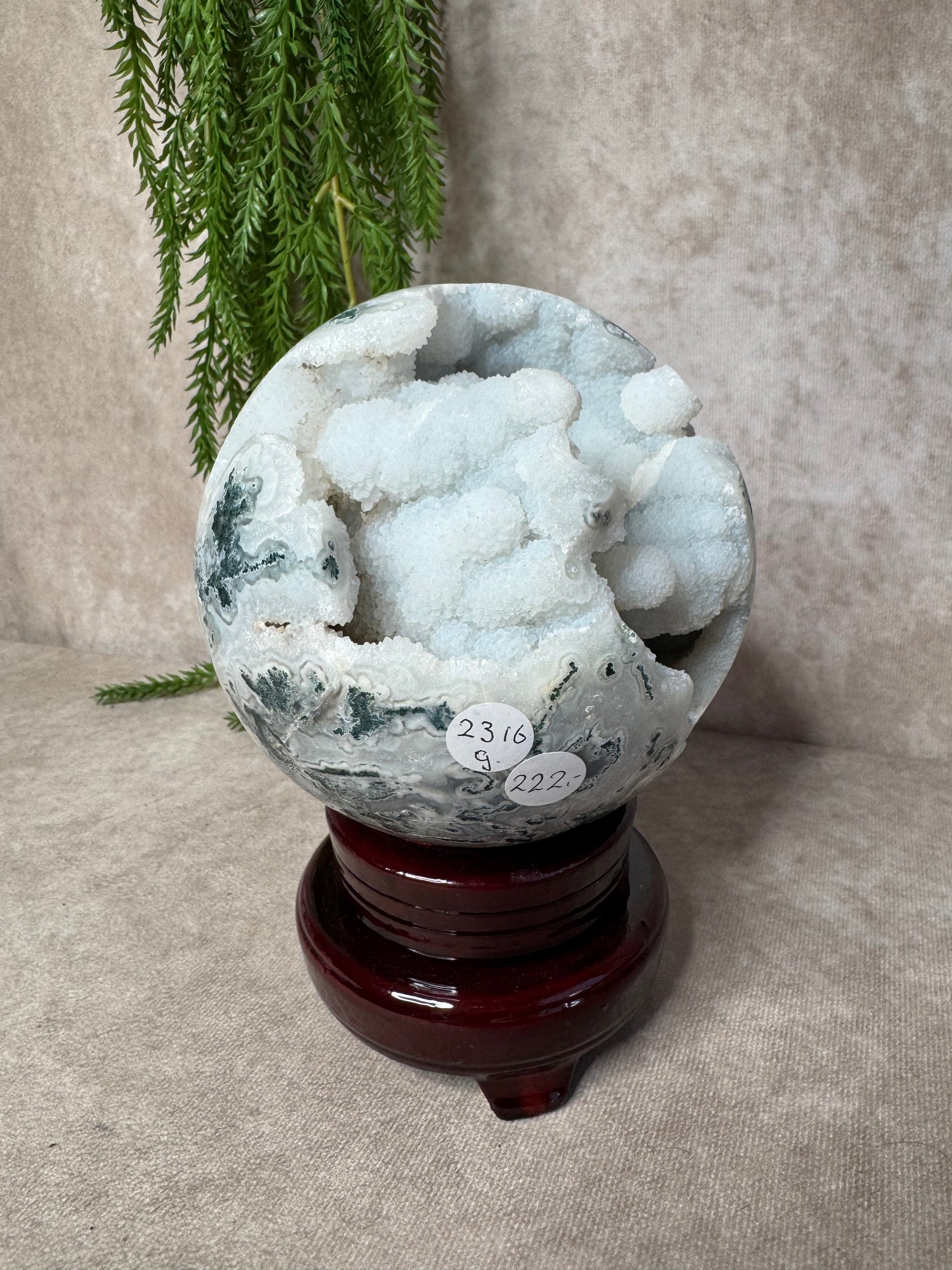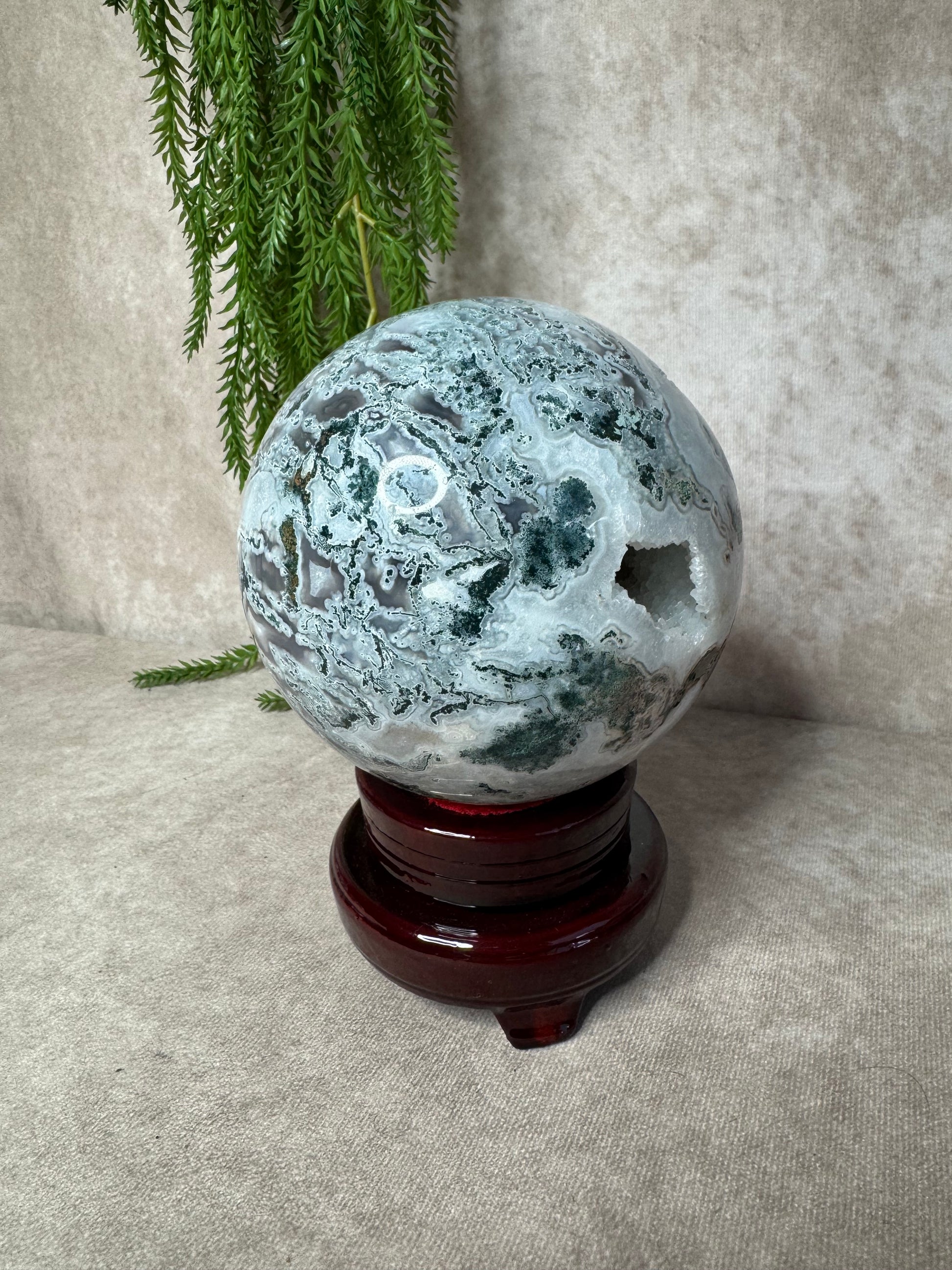 Deze mega mosagaat bol van 2316 gram en circa 13,2 cm omtrek is een bijzonder natuurstuk met prachtige groene mosinsluitingen en een schitterend open druzy-gedeelte. Het lichtspel in de druzy en de diepe aardse kleuren maken de bol een ware blikvanger voor elke ruimte.