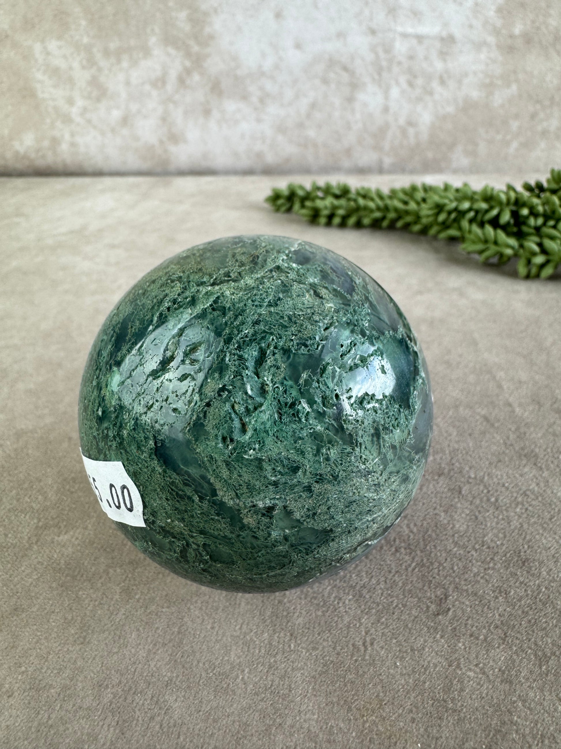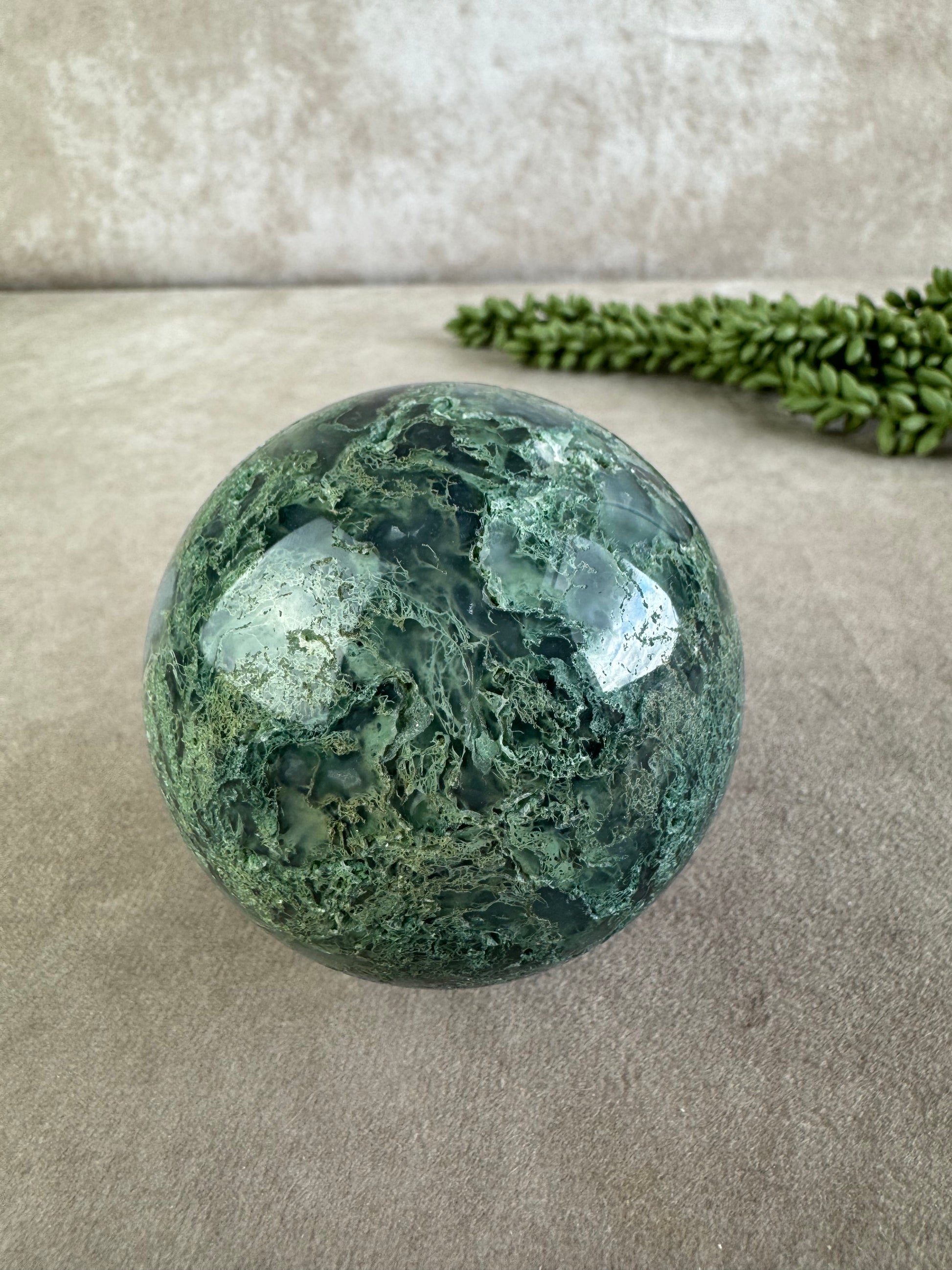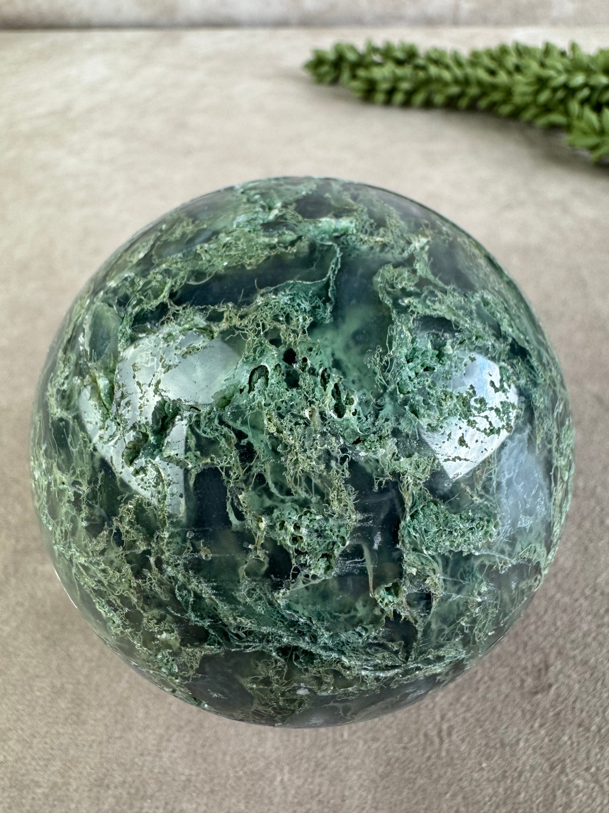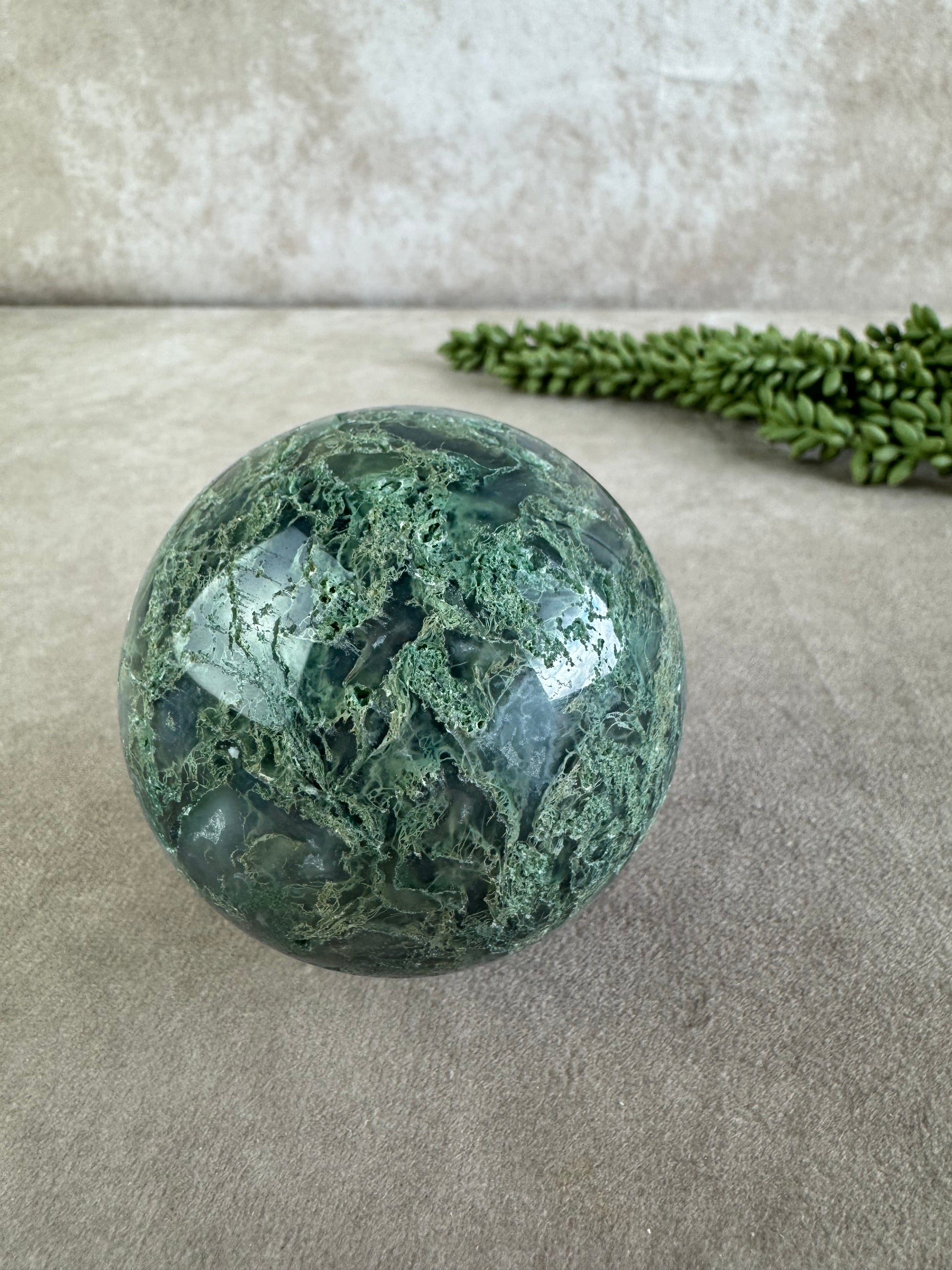 Deze prachtige mosagaat bol met een diameter van 7,4 cm is een uniek stuk vol natuurlijke schoonheid en aardse energie. De organische patronen in groentinten doen denken aan mos, bomen en bossen, wat deze steen een sterk verbonden gevoel met de natuur geeft. Elke bol is uniek, met speelse insluitsels en transparante delen die een serene uitstraling creëren.