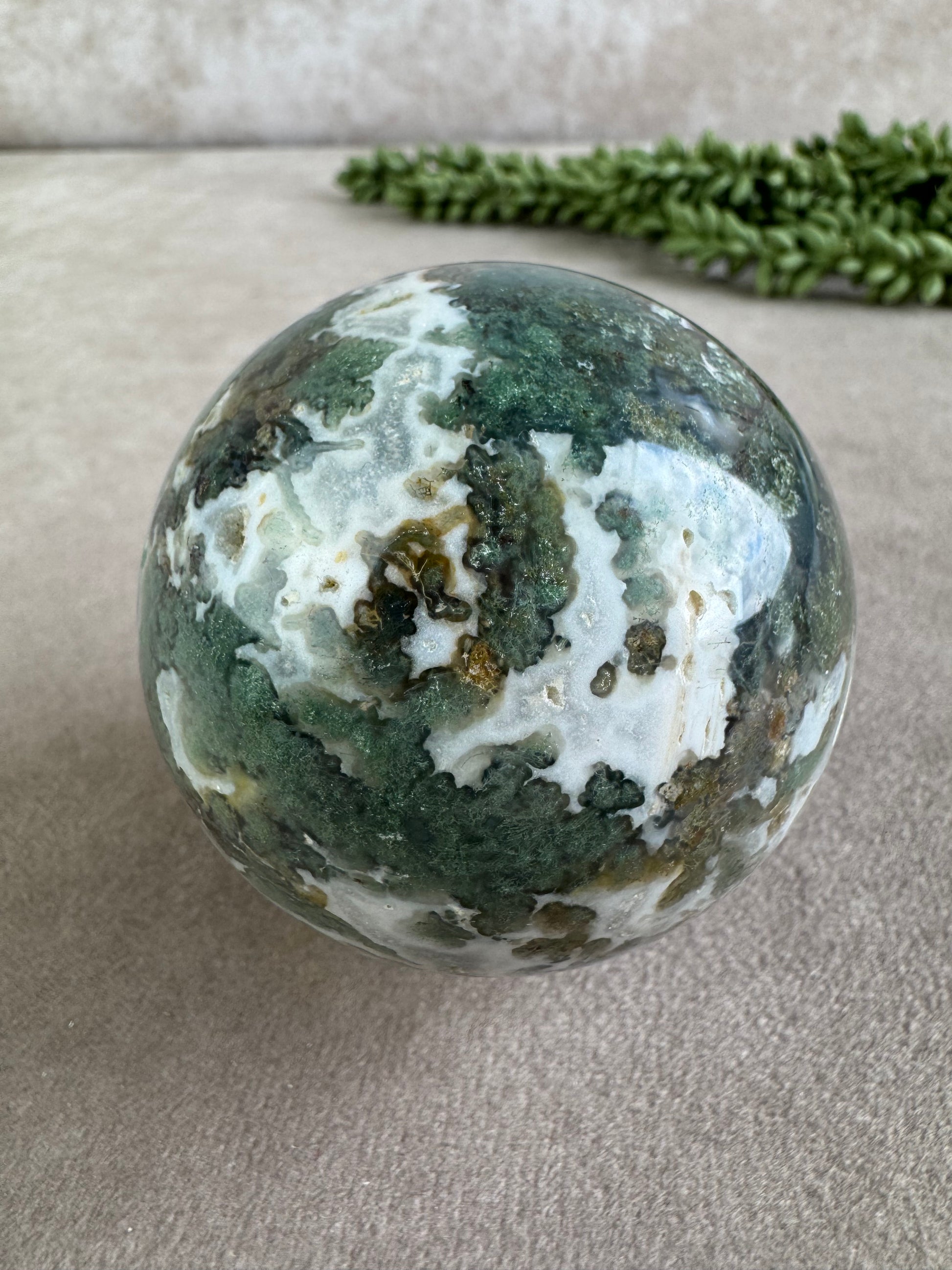 Deze prachtige mosagaat bol met een diameter van 6,4 cm is een uniek stuk vol natuurlijke schoonheid en aardse energie. De organische patronen in groentinten doen denken aan mos, bomen en bossen, wat deze steen een sterk verbonden gevoel met de natuur geeft. Elke bol is uniek, met speelse insluitsels en transparante delen die een serene uitstraling creëren.