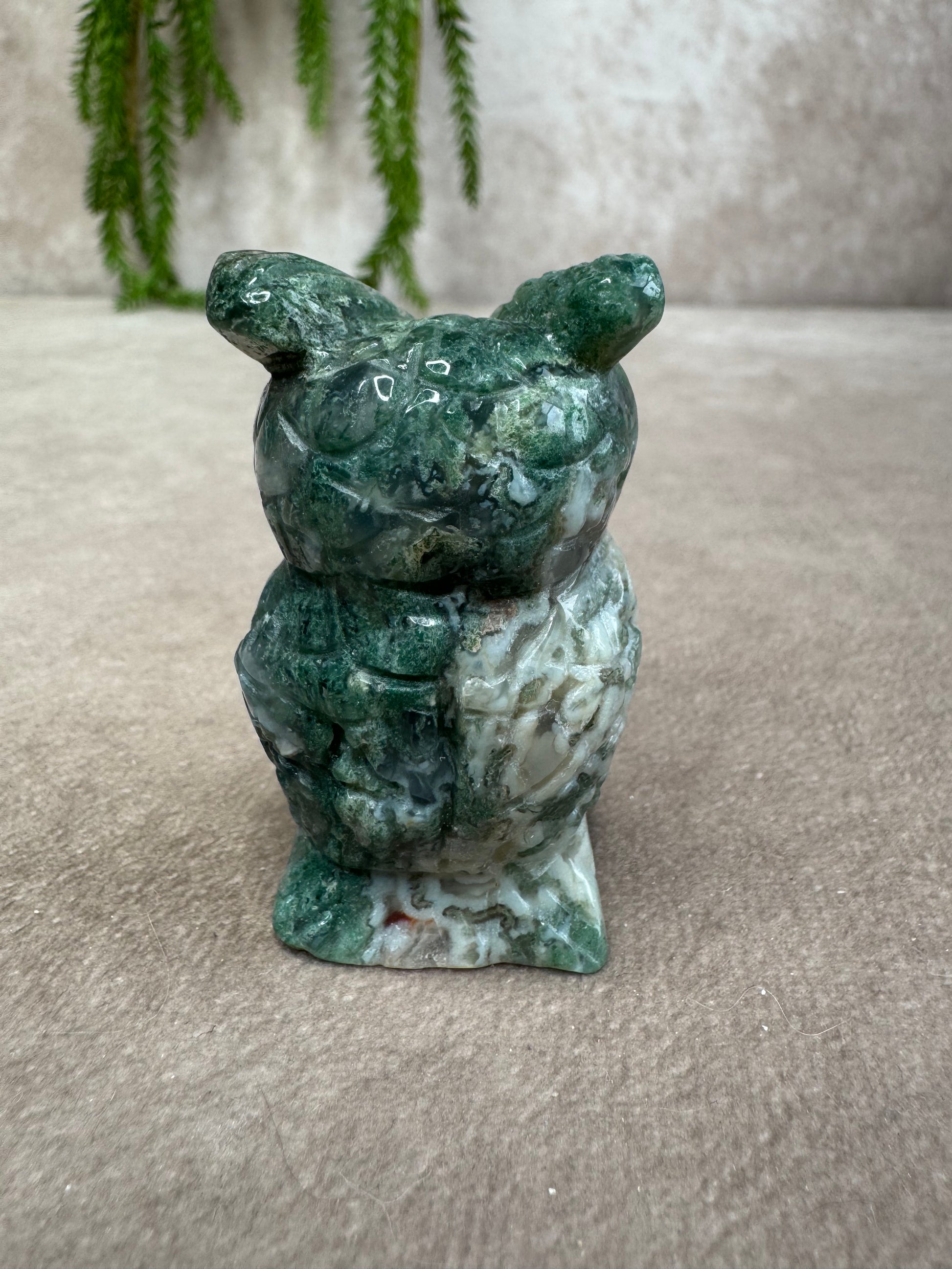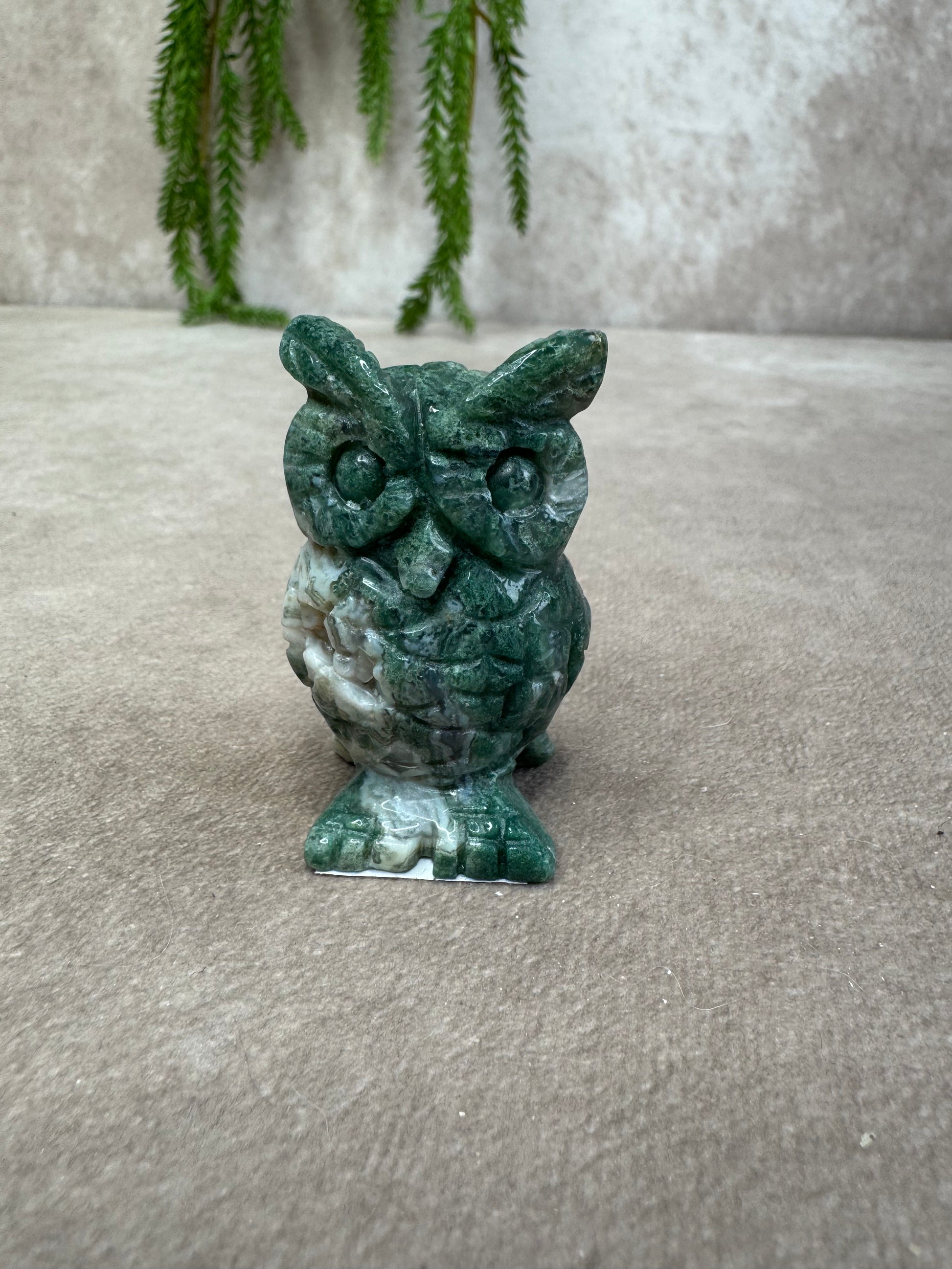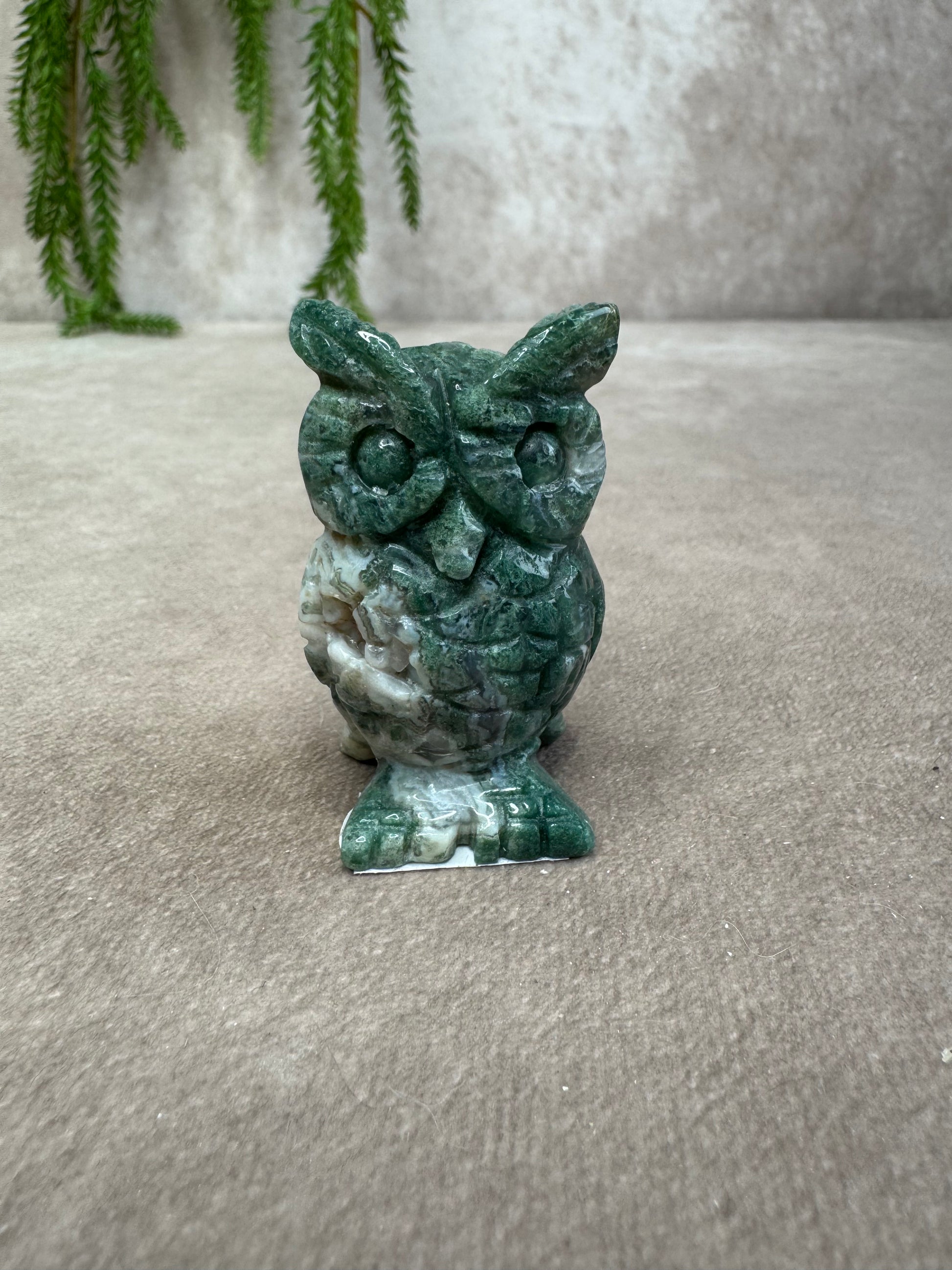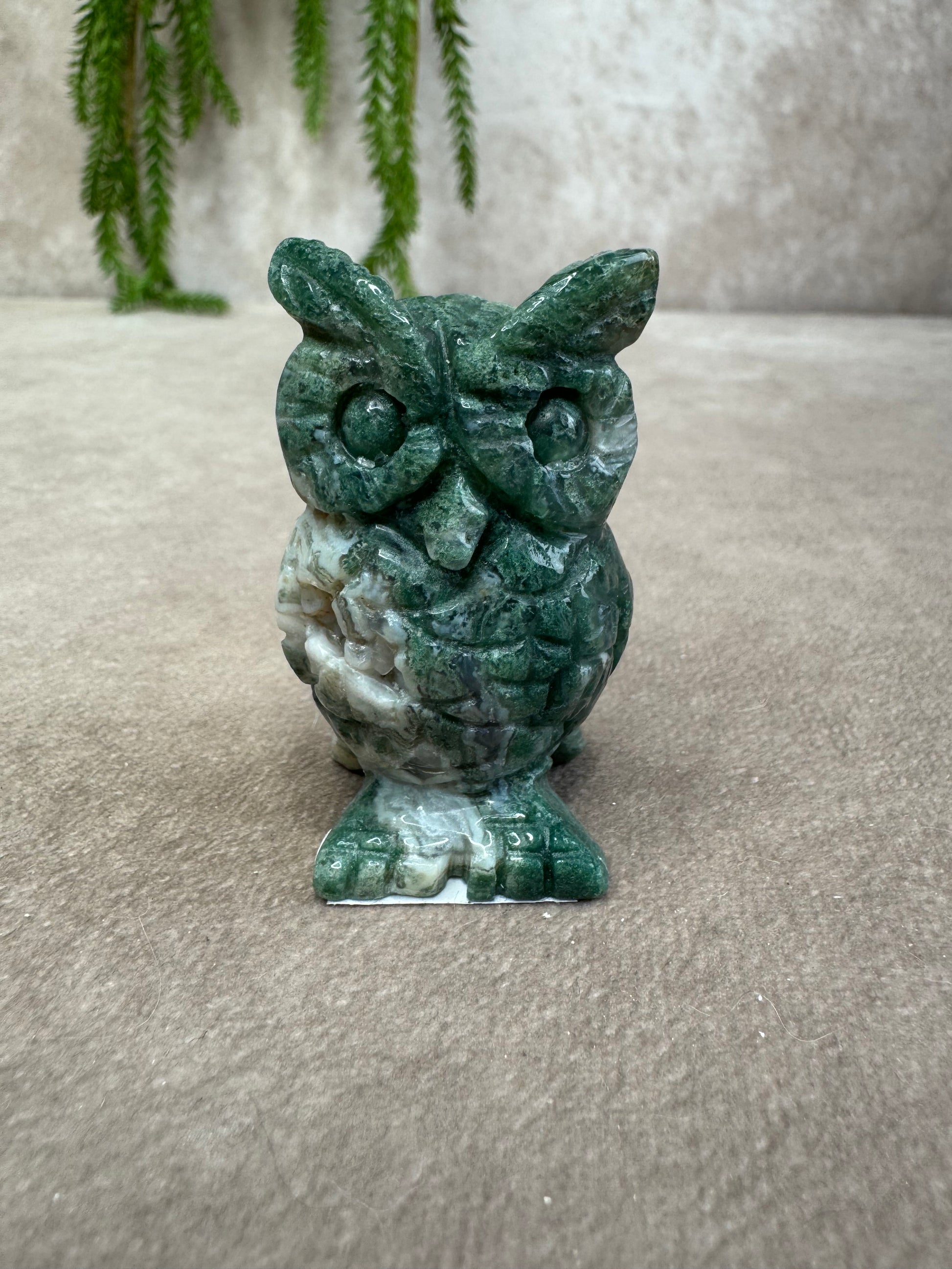 Deze prachtige uil van mosagaat is met de hand gesneden en straalt een natuurlijke, serene energie uit. Het beeldje is 5,5 cm hoog en toont de kenmerkende groene aders en patronen van mosagaat, die doen denken aan een weelderig boslandschap.