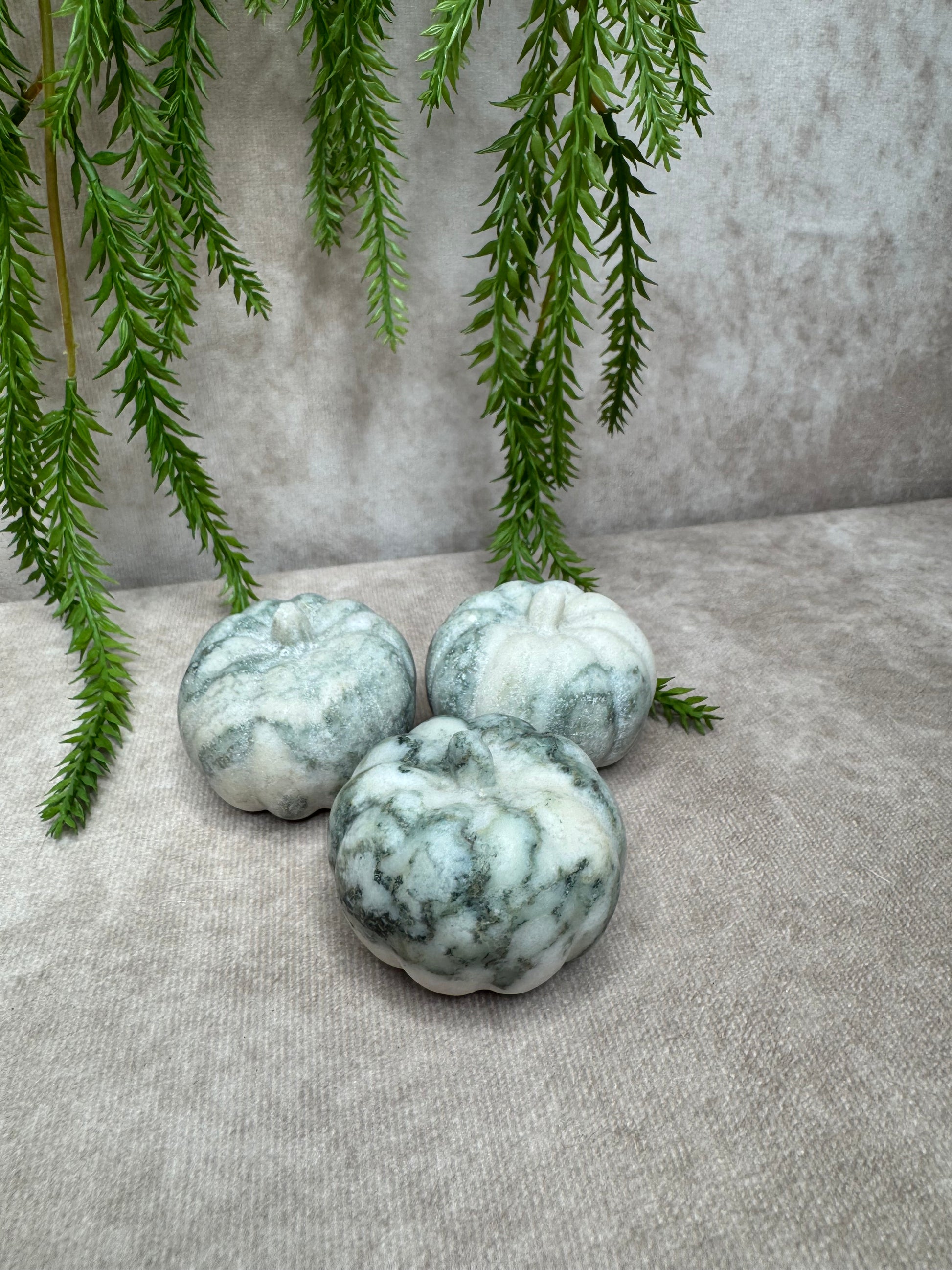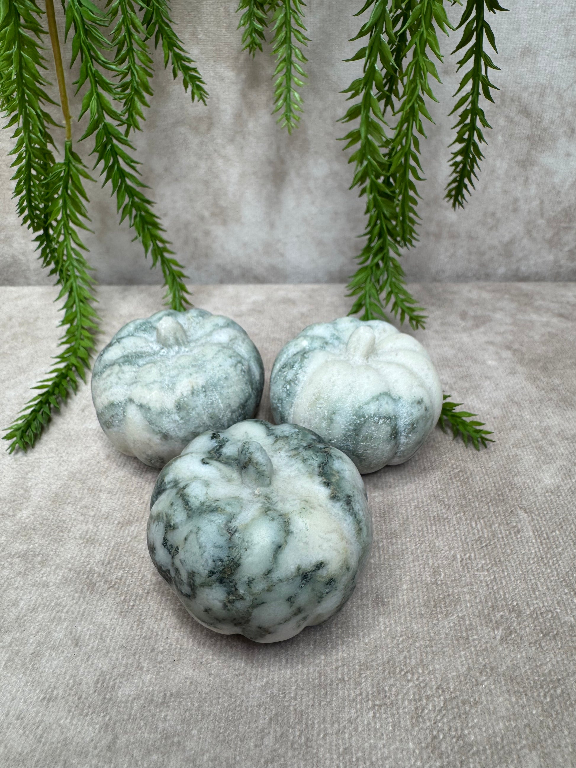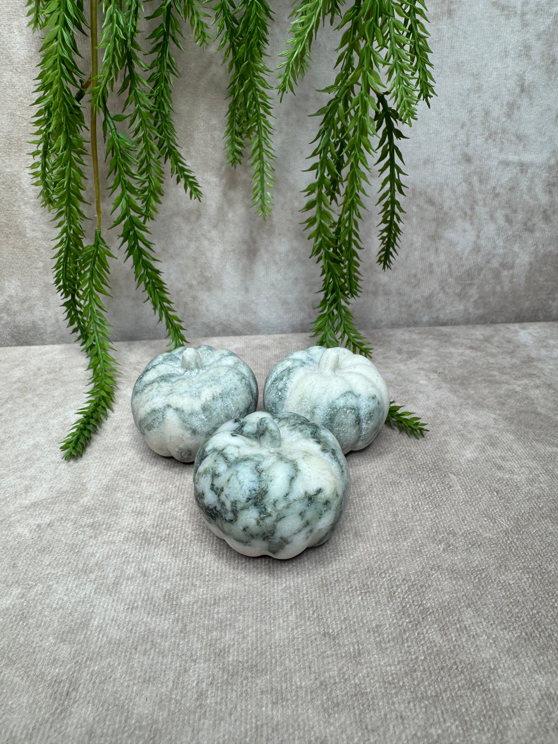 Deze prachtige pompoen van boomagaat heeft een natuurlijke en rustgevende uitstraling met haar groene aders en witte tot crèmekleurige patronen. Met een diameter van 5 cm en een hoogte van 4,1 cm is dit een sfeervol en aardend edelstenen decoratiestuk.