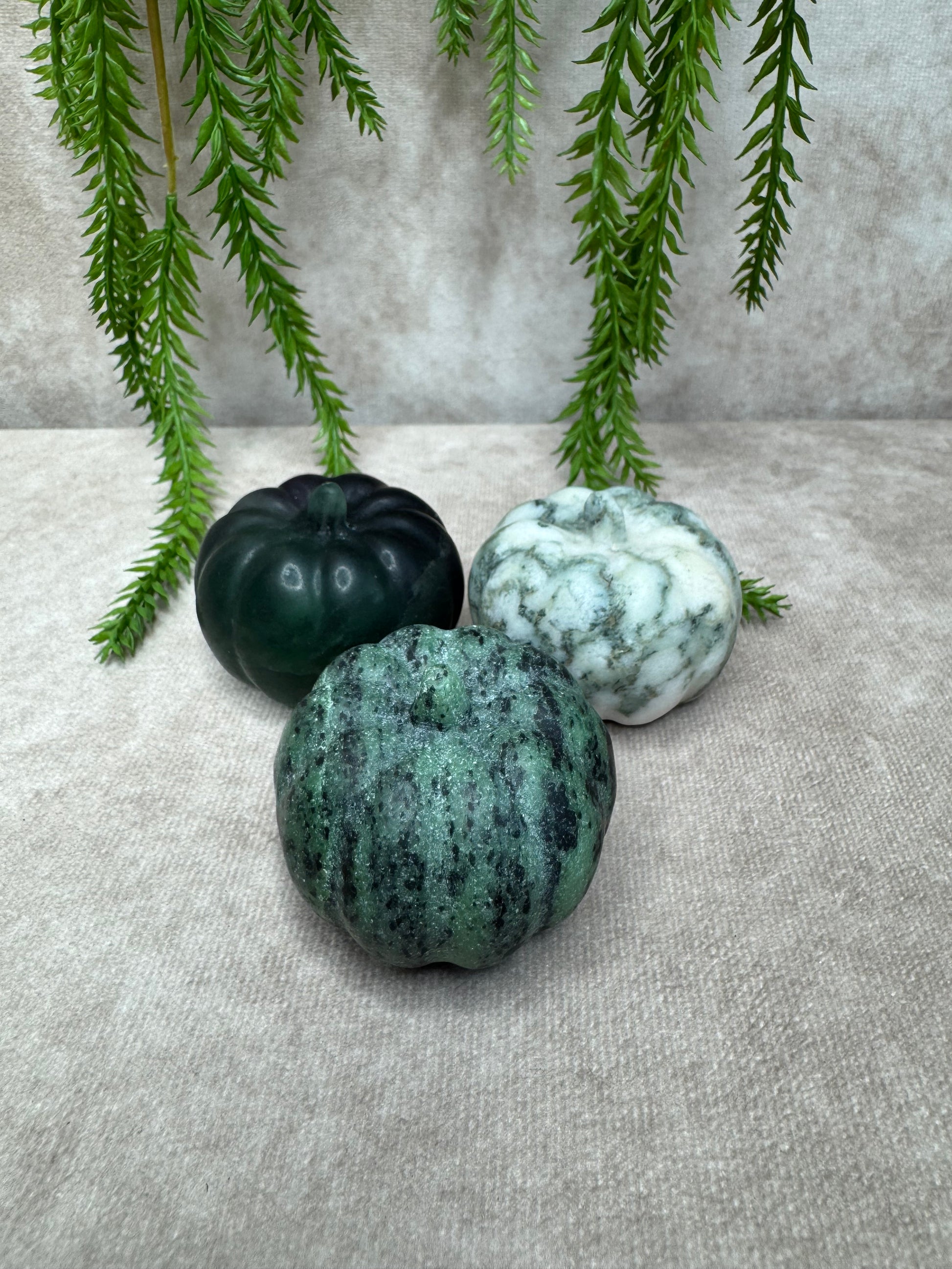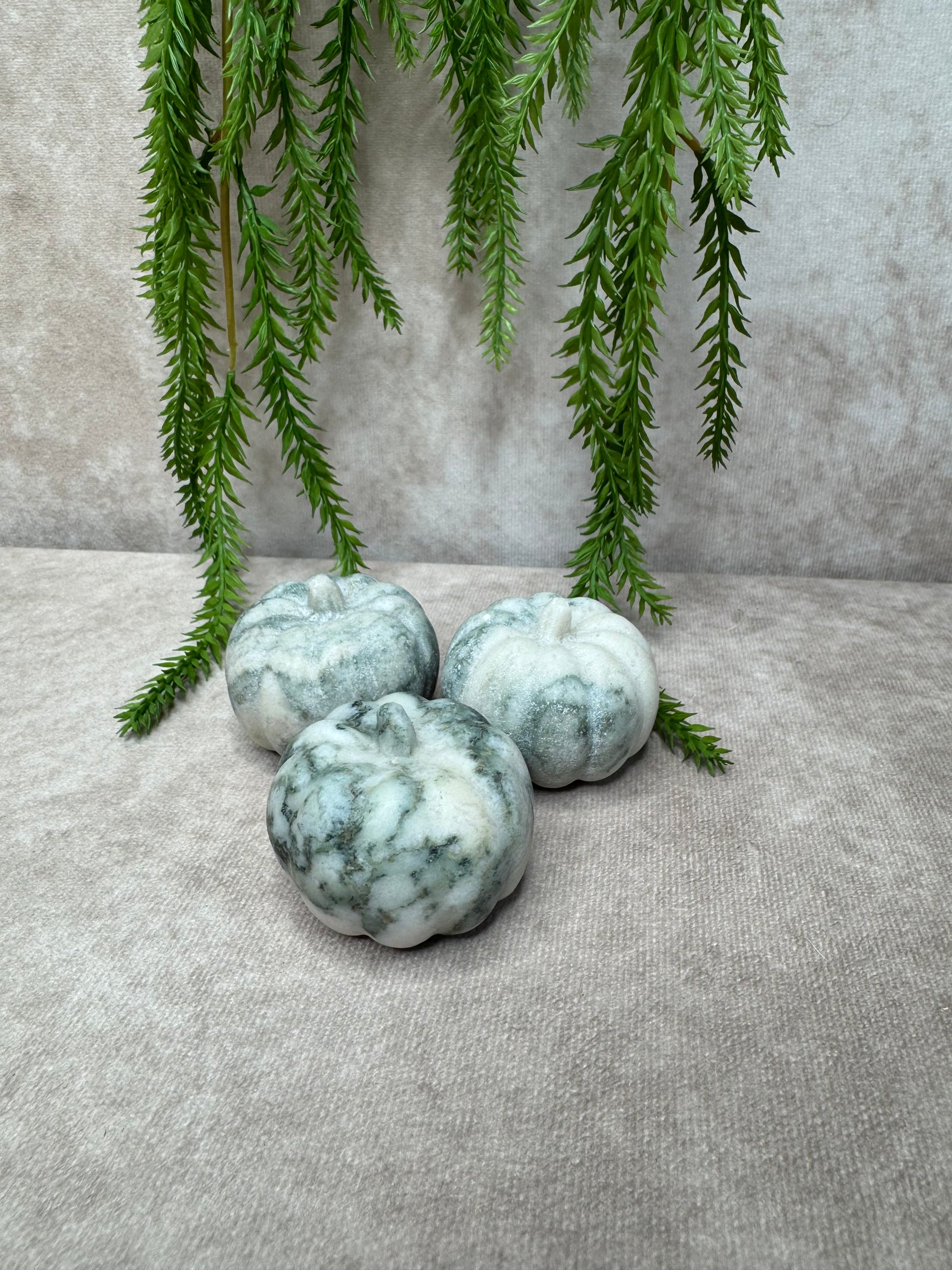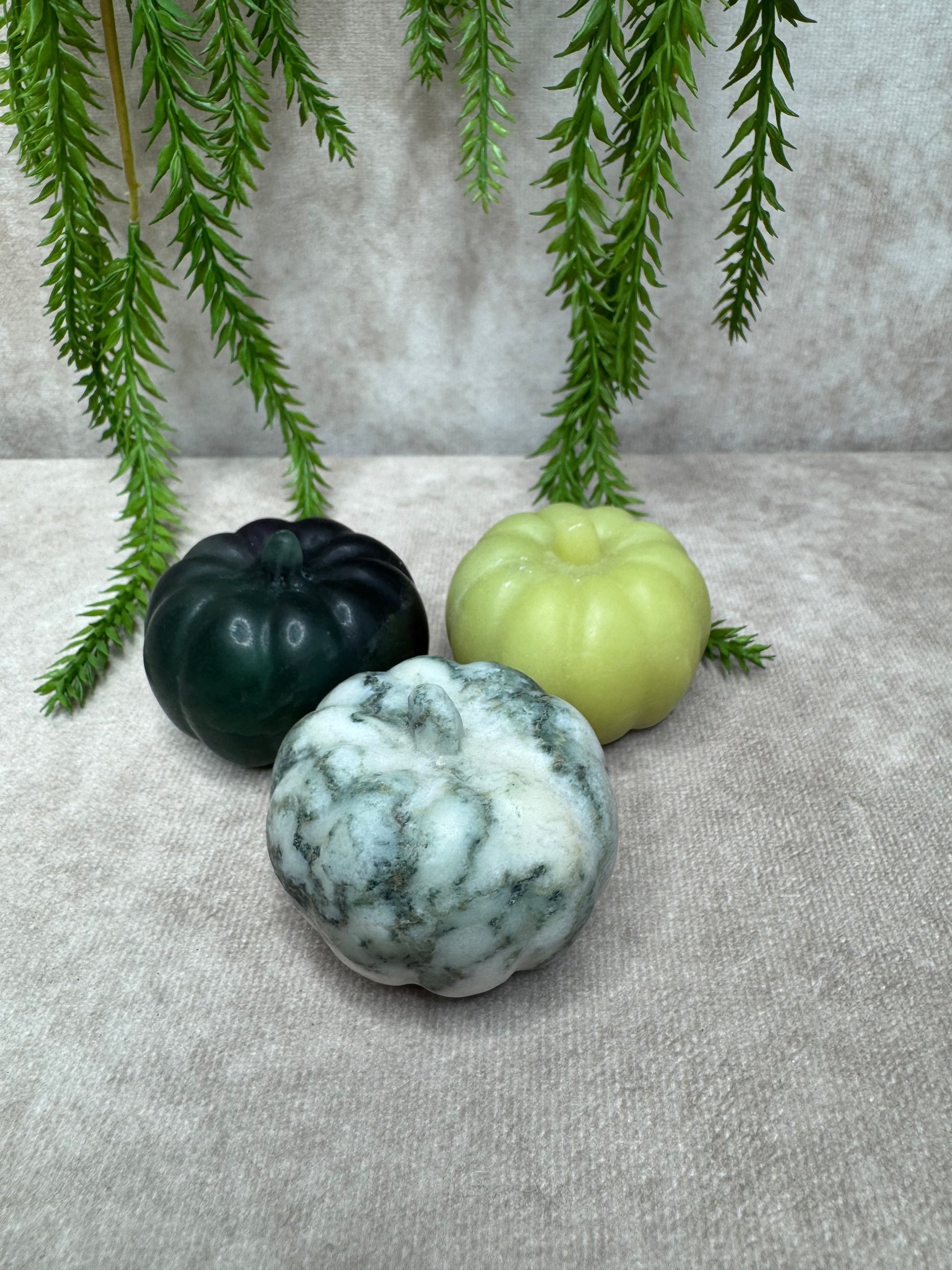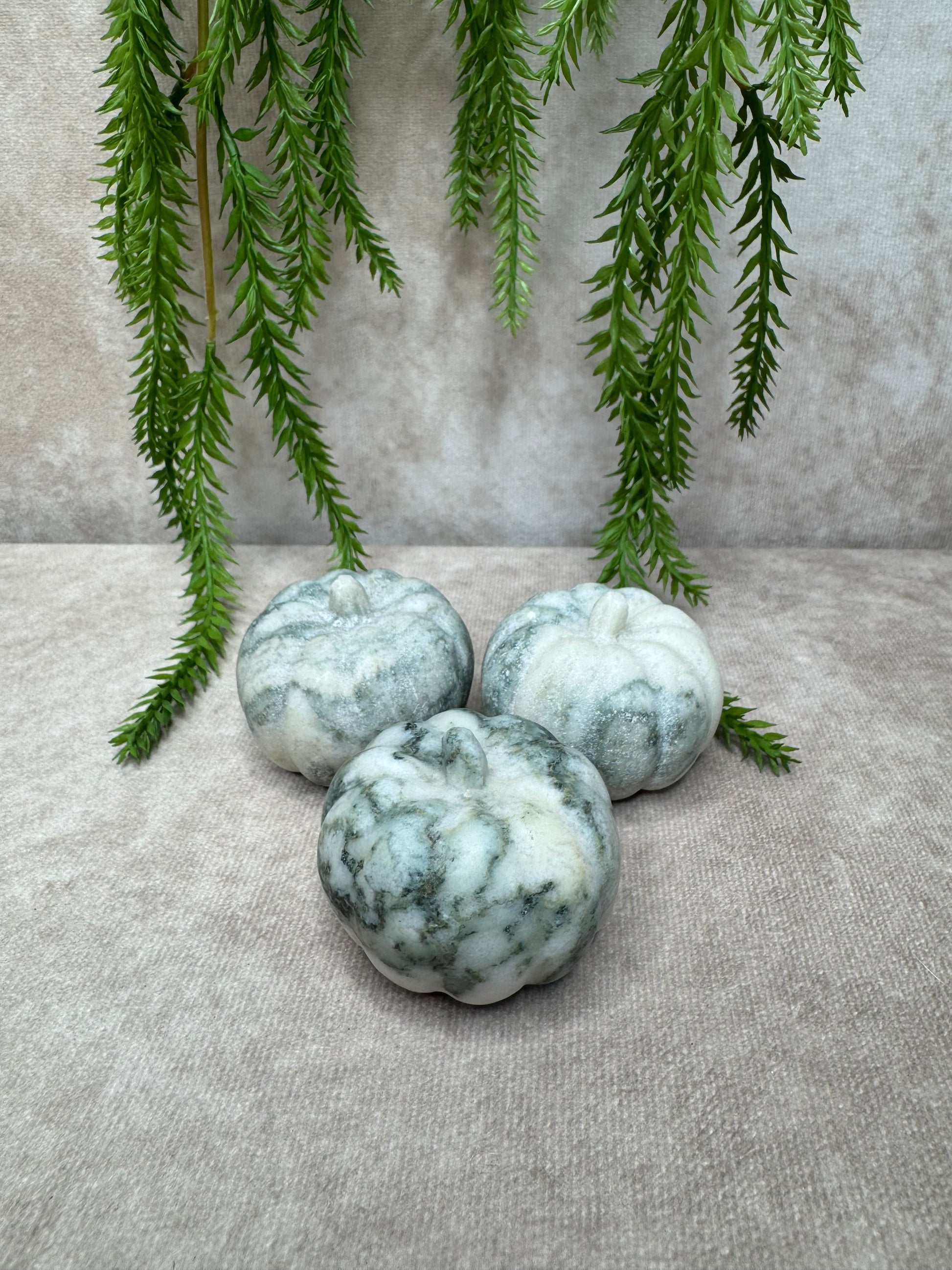Deze prachtige pompoen van boomagaat heeft een natuurlijke en rustgevende uitstraling met haar groene aders en witte tot crèmekleurige patronen. Met een diameter van 5 cm en een hoogte van 4,1 cm is dit een sfeervol en aardend edelstenen decoratiestuk.