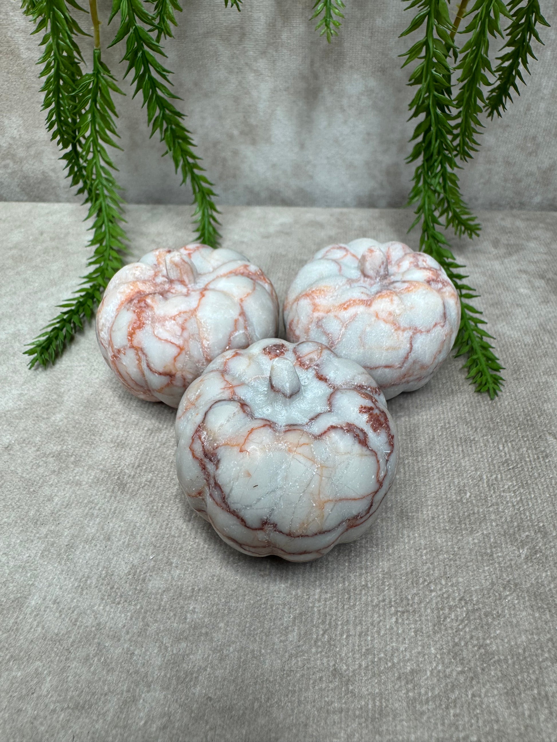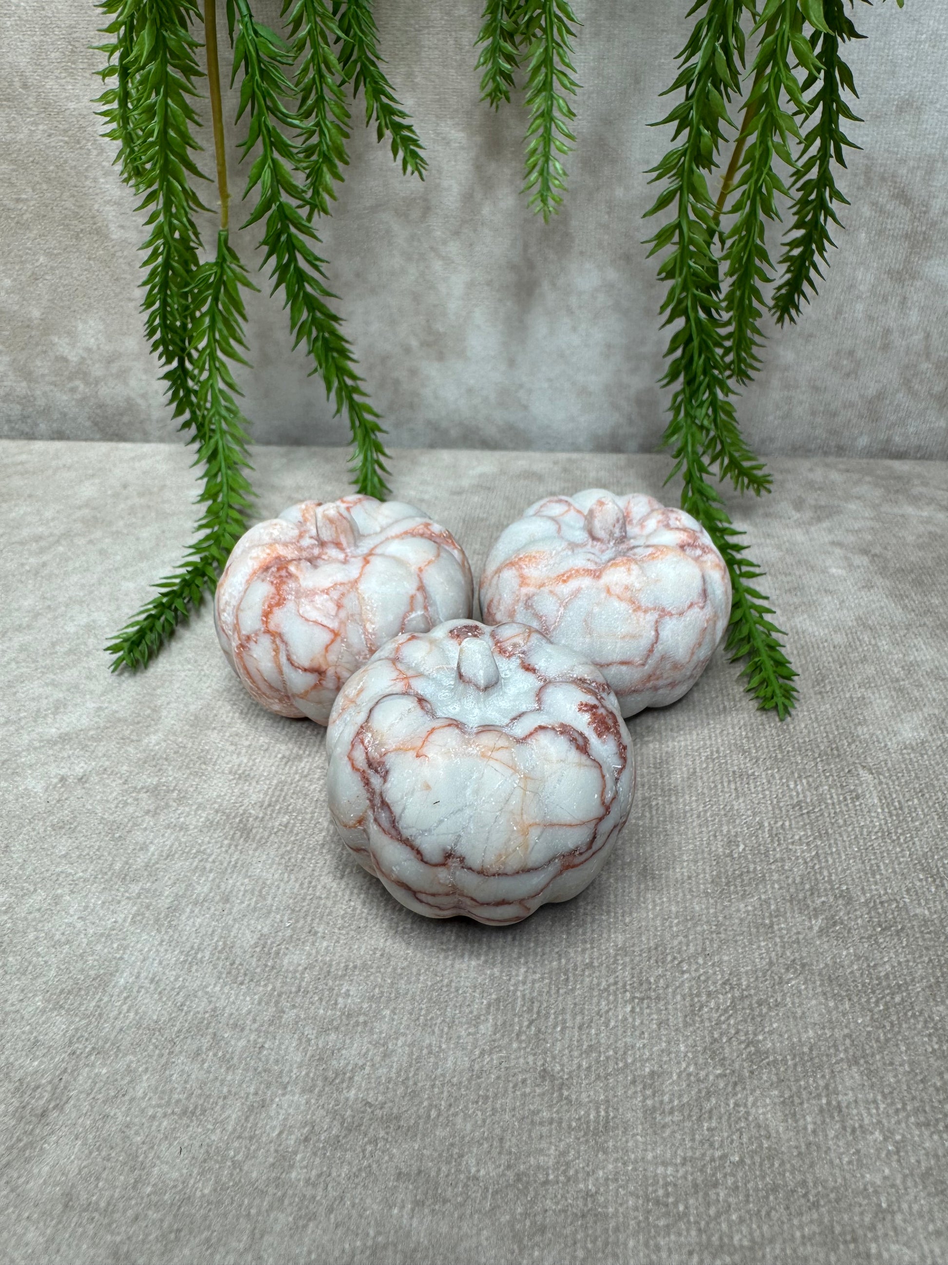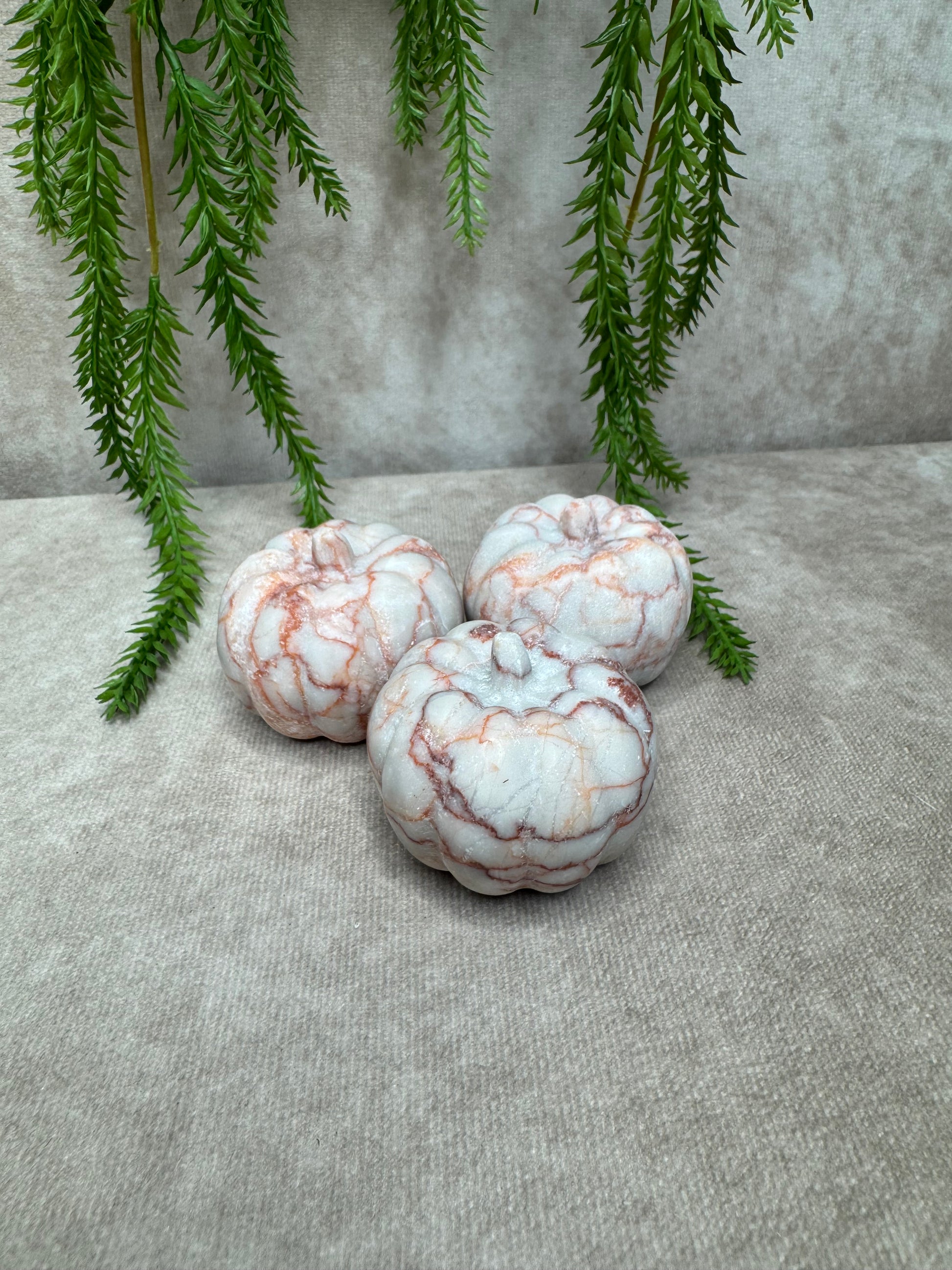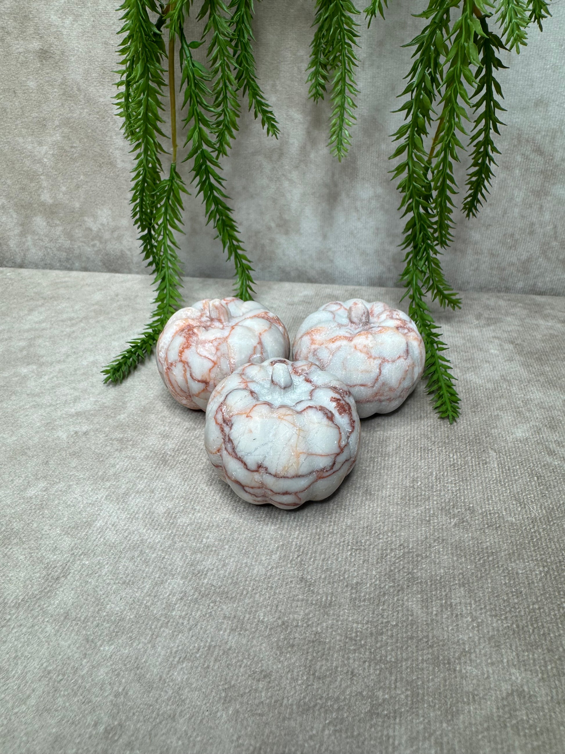 Deze elegante pompoen van marmer heeft een tijdloze en verfijnde uitstraling met haar natuurlijke witte, grijze en oranje aders. Met een diameter van 5 cm en een hoogte van 4,1 cm is dit een stijlvol en duurzaam decoratiestuk van natuursteen.