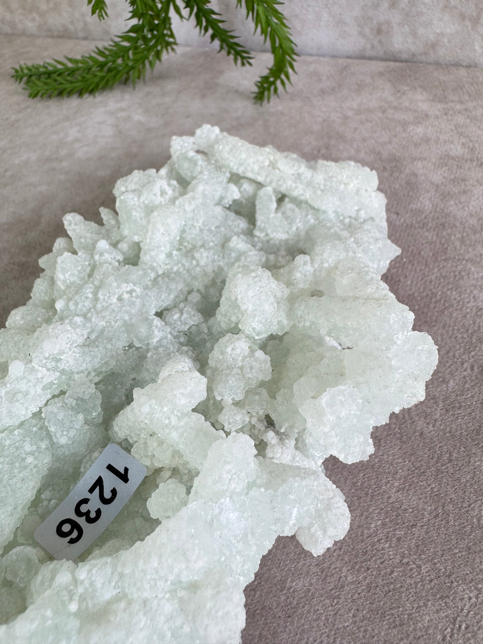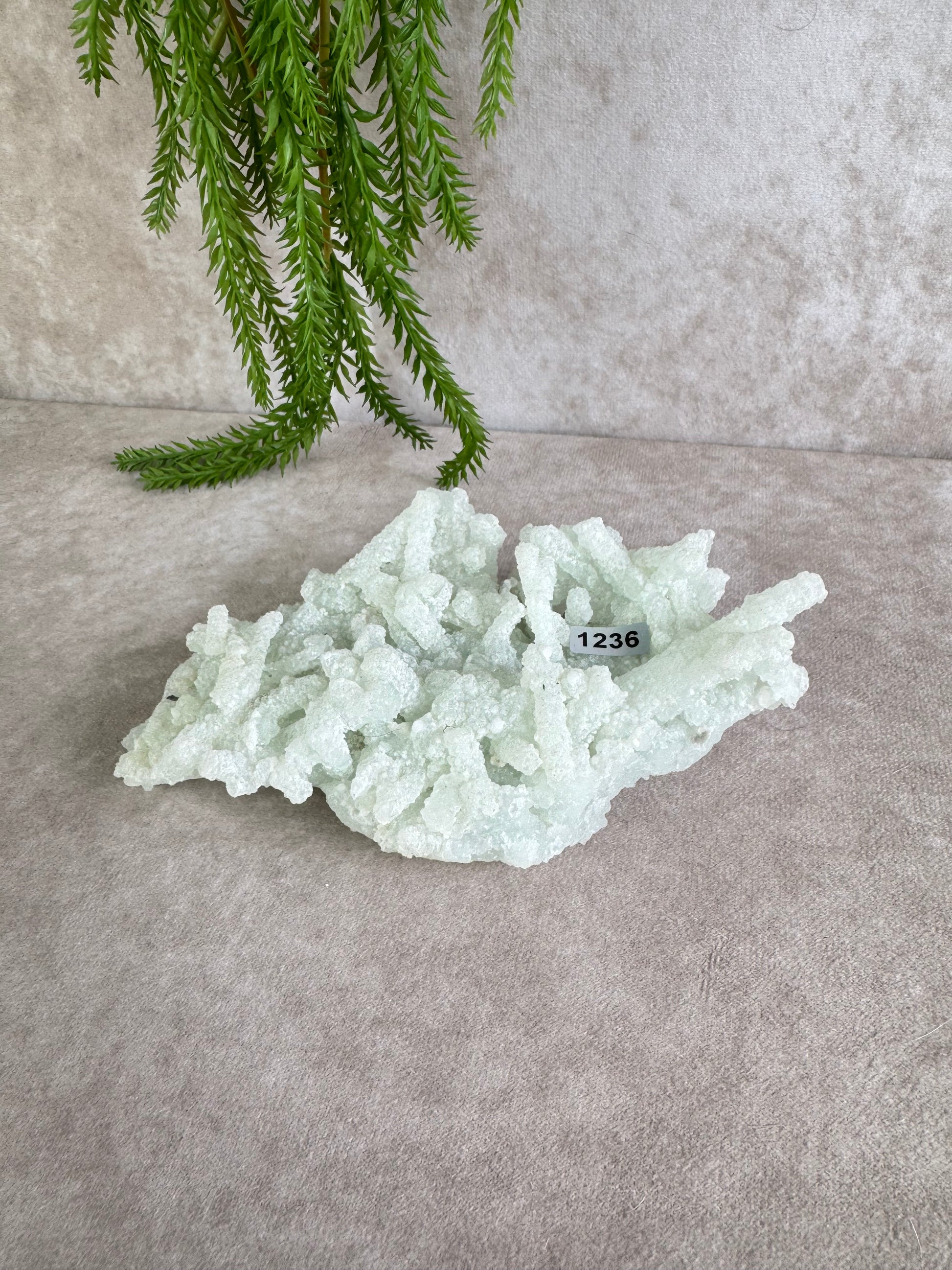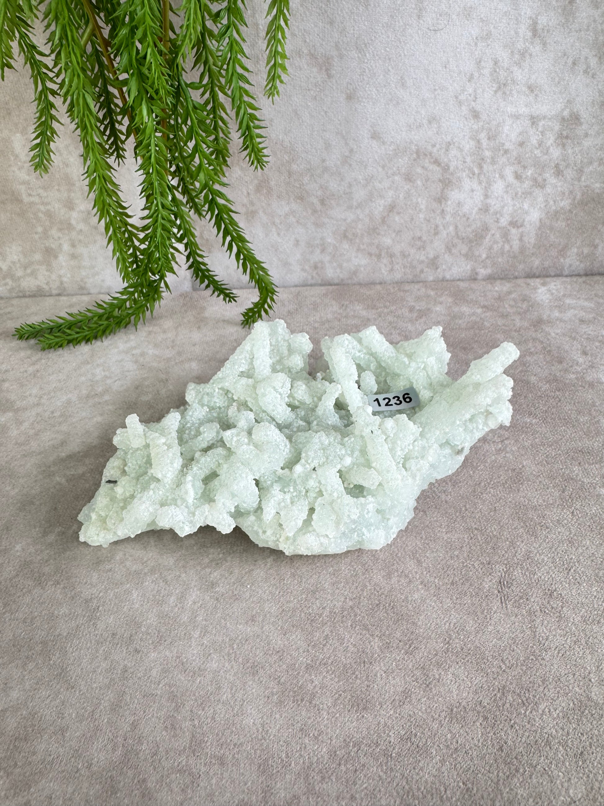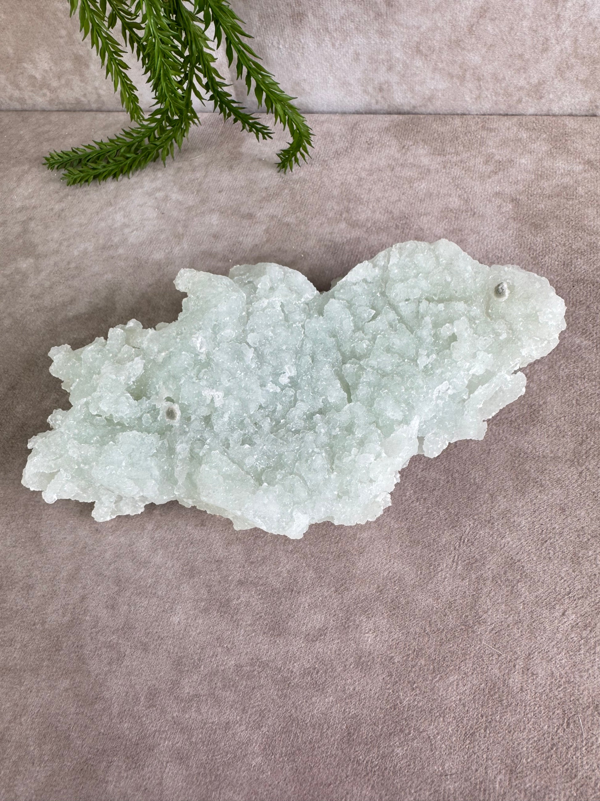 Deze indrukwekkende en zeldzame prehniet cluster van circa 18 x 11,5 cm en maar liefst 490 gram is een krachtig natuurwonder met een uitzonderlijke uitstraling. De zachte groene tinten, gecombineerd met de typische afgeronde kristalstructuren van prehniet, geven dit stuk een serene en bijna etherische uitstraling. Een waar pronkstuk voor verzamelaars en liefhebbers van bijzondere, energetisch rijke mineralen.