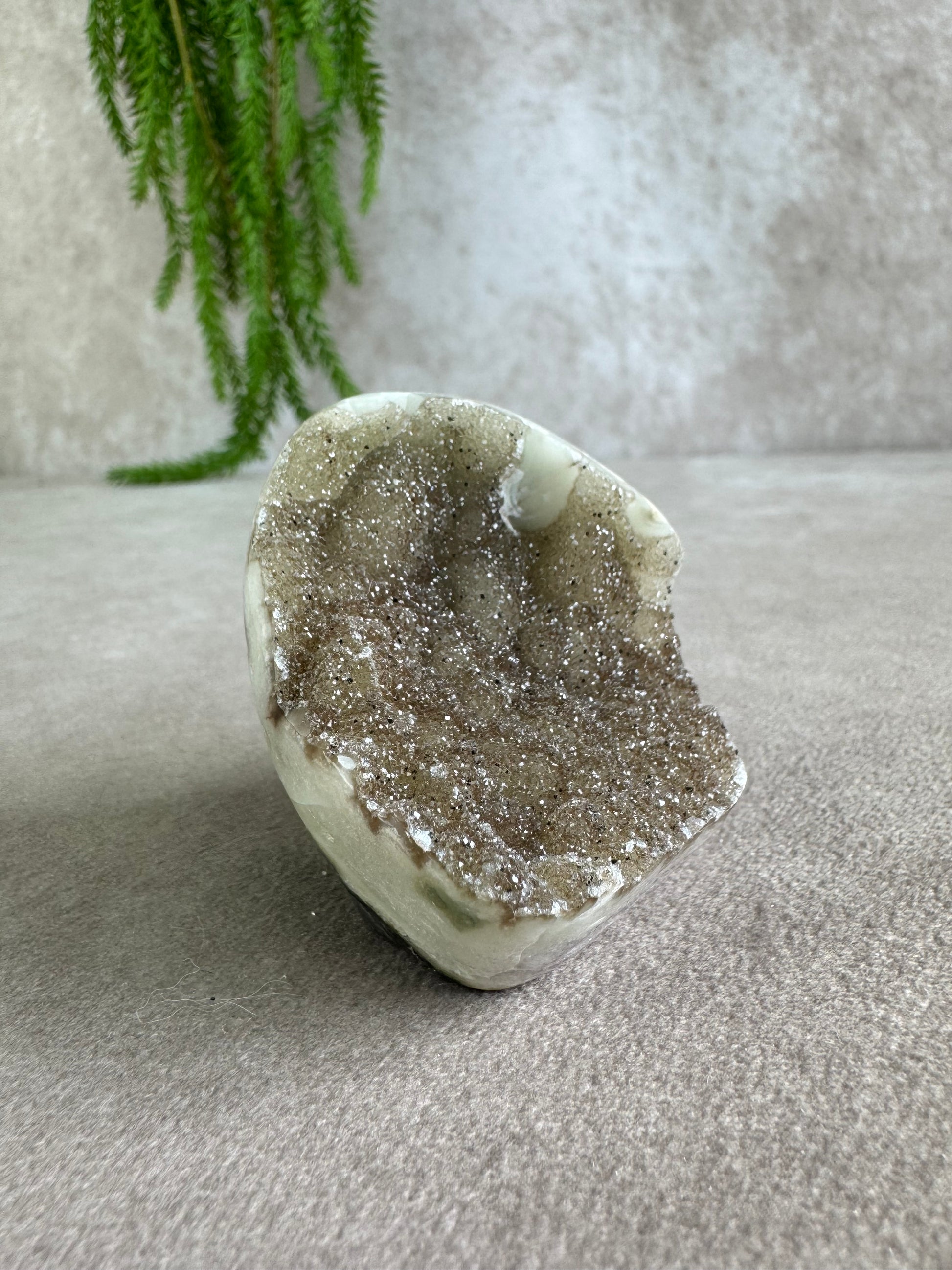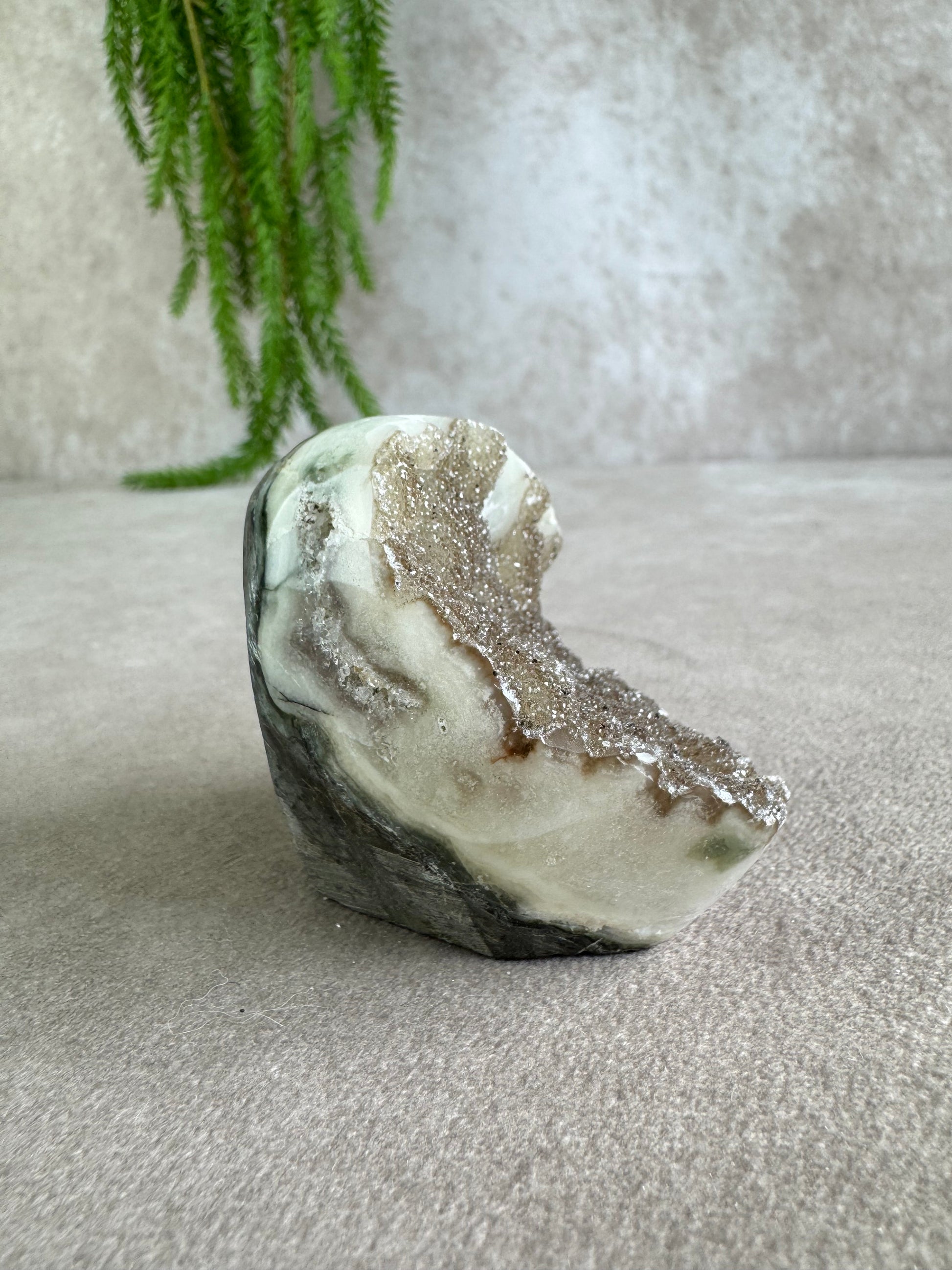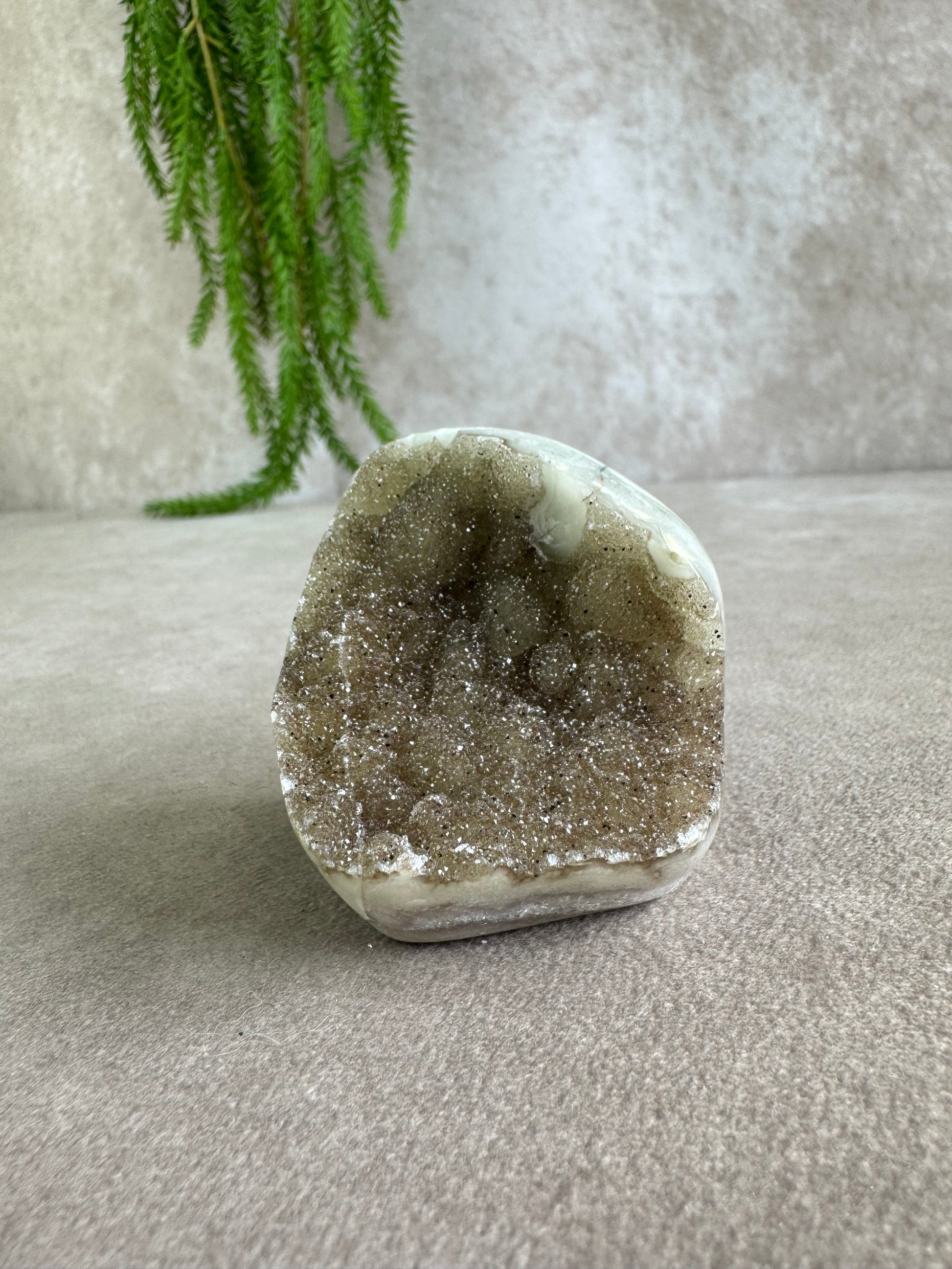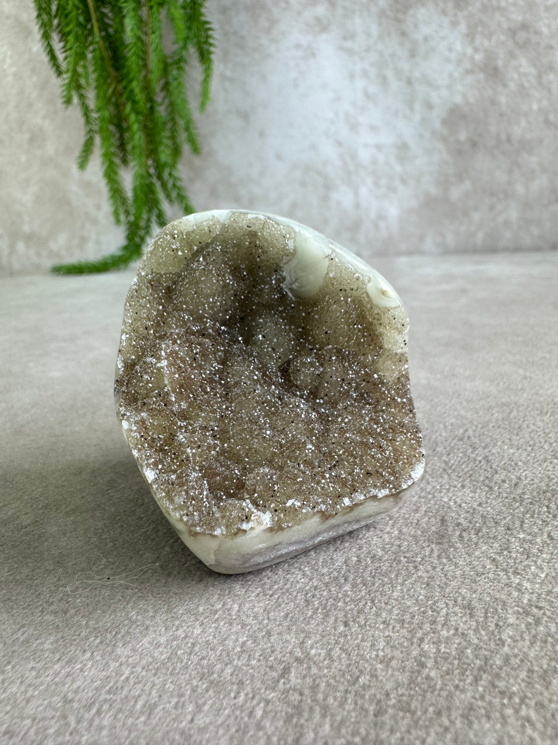 Deze schitterende rainbow amethist van 156 gram is een bijzonder kristal met veel karakter. De suikerdruzy, een laagje fijne sprankelende kristallen, laat het oppervlak fonkelen alsof het bedekt is met suiker. De rand van natuurlijke agaat geeft het stuk een prachtig contrast én extra stabiliserende energie.