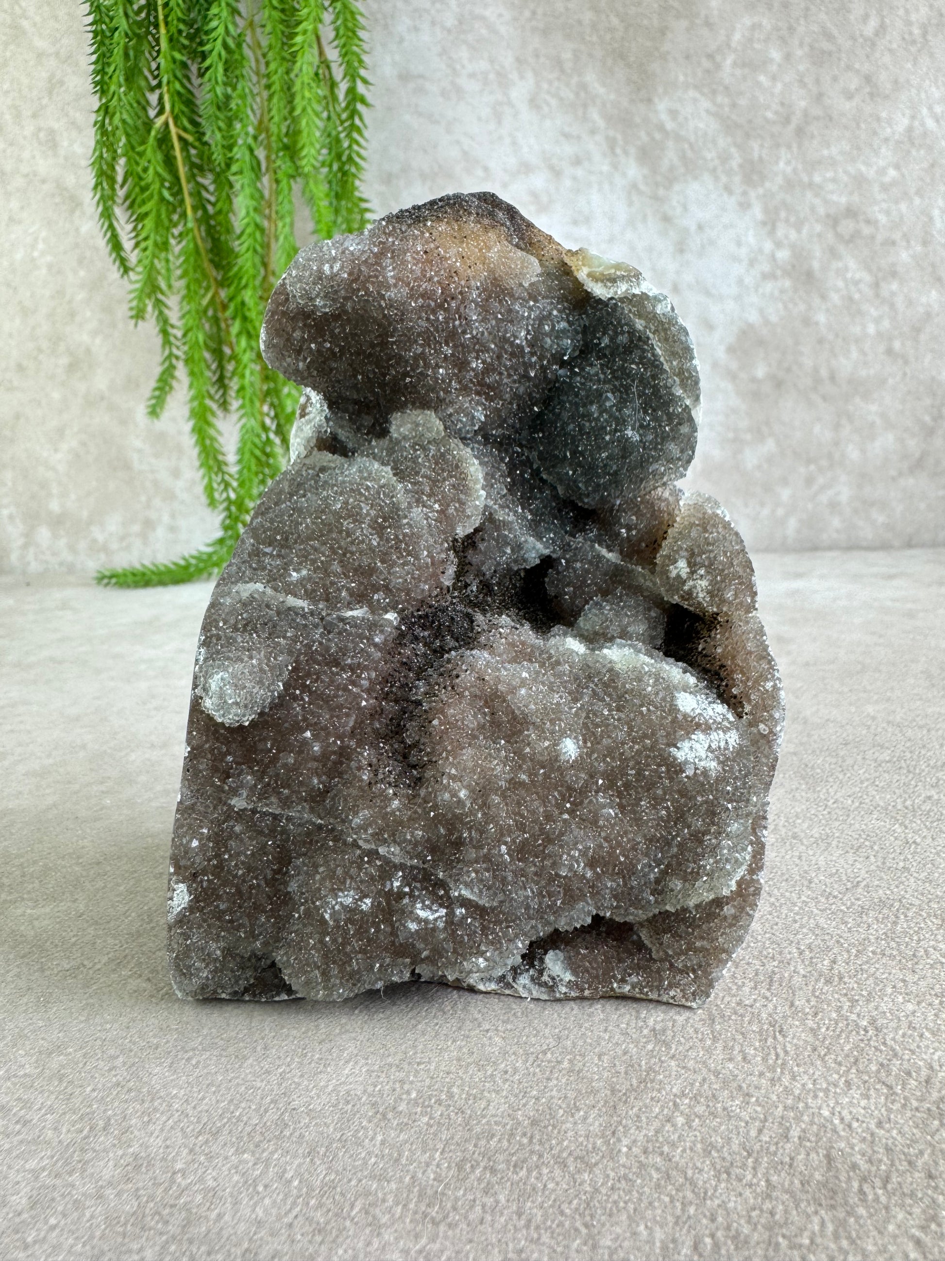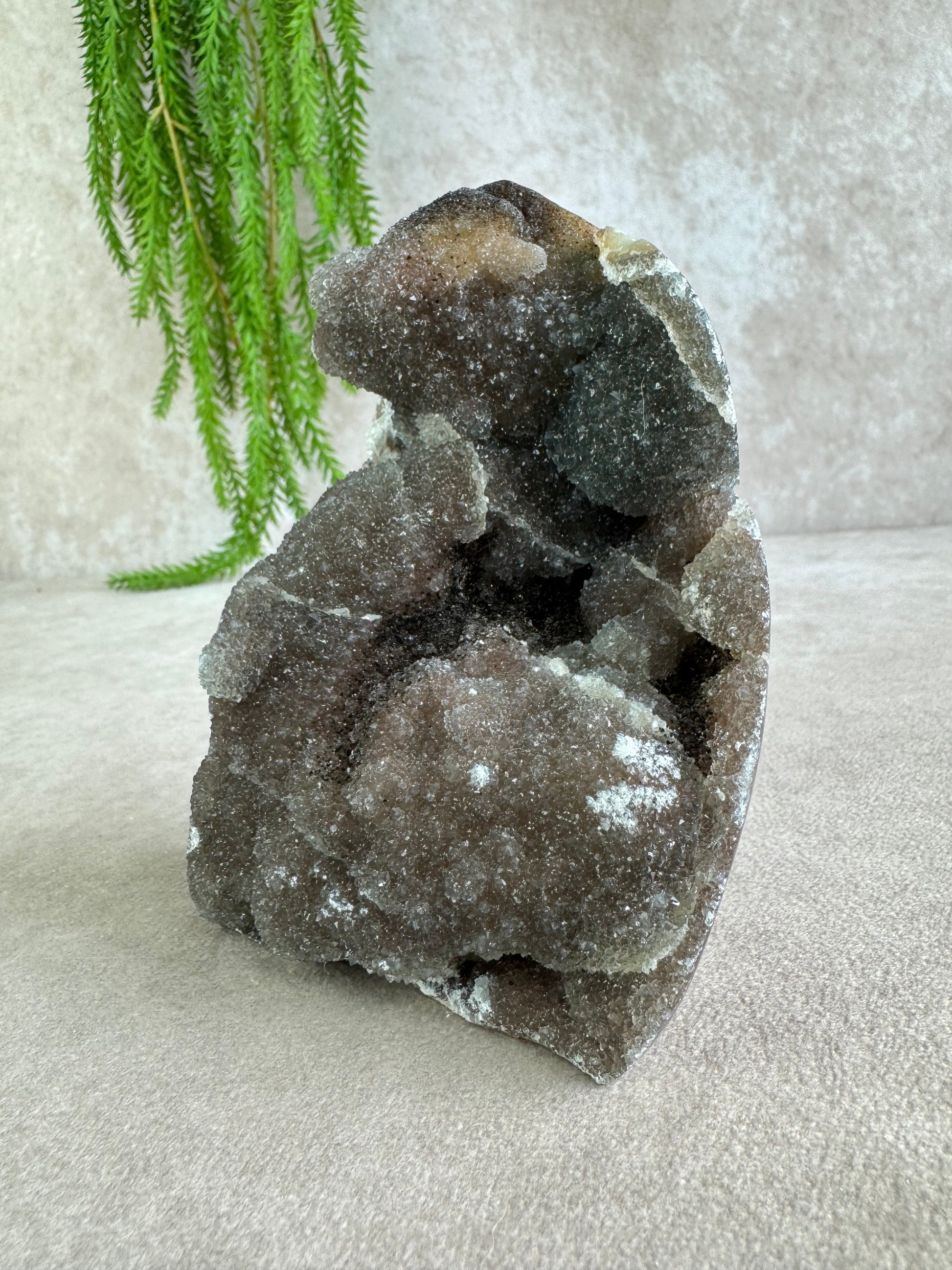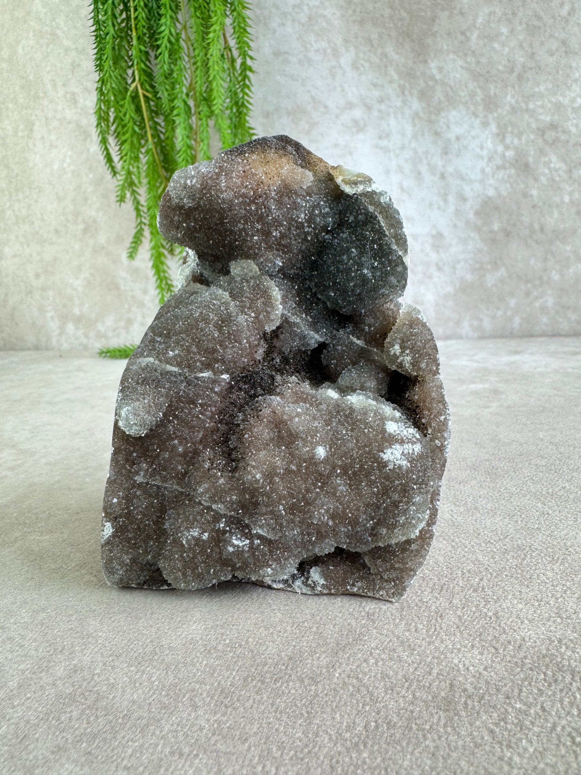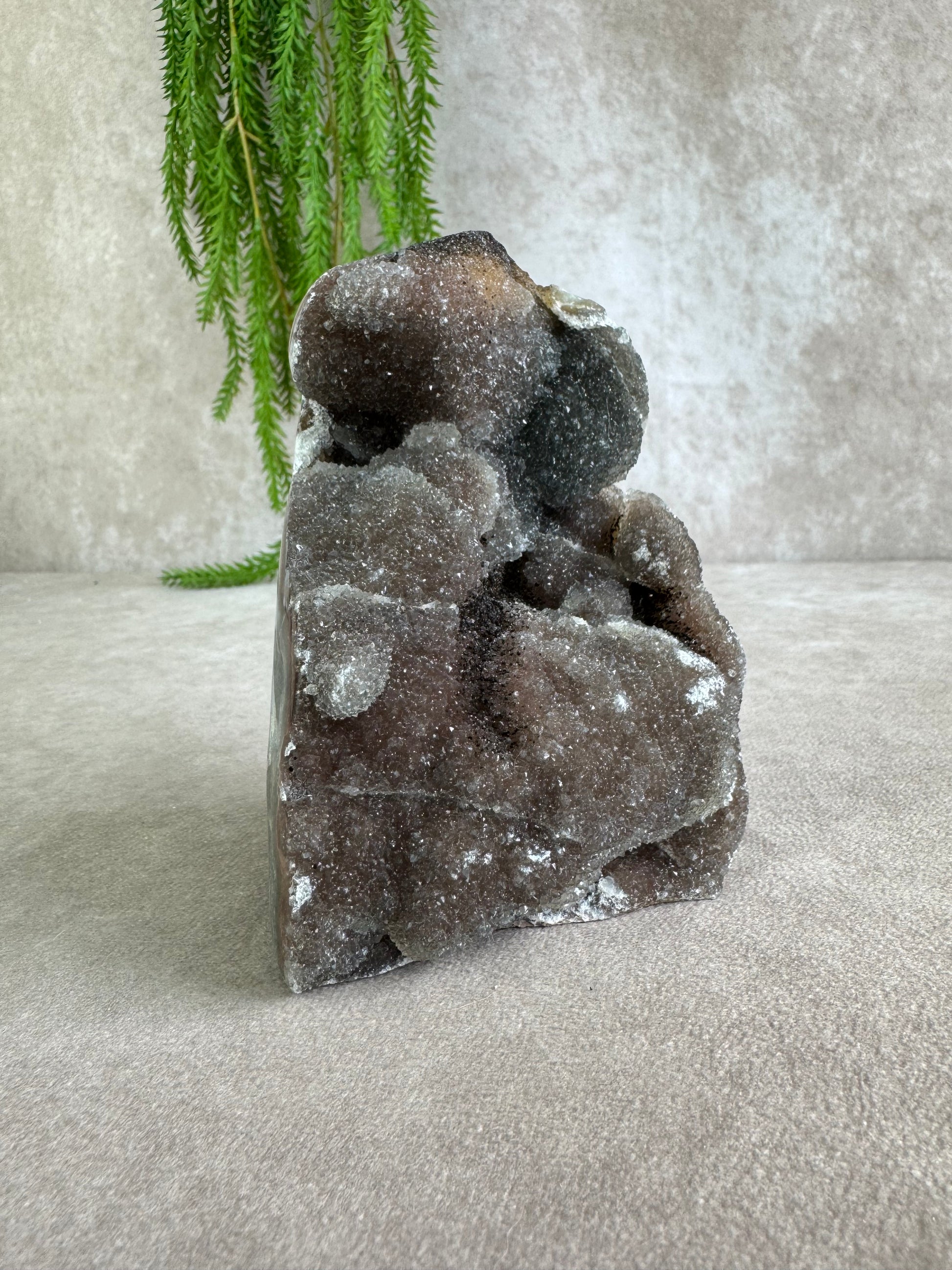 Deze indrukwekkende rainbow amethist van 680 gram is een echte blikvanger. De warme rood-bruine tinten geven dit kristal een aardse, robuuste uitstraling, terwijl de kristalpunten sprankelen met subtiele regenboogkleuren die tot leven komen zodra het licht erop valt.