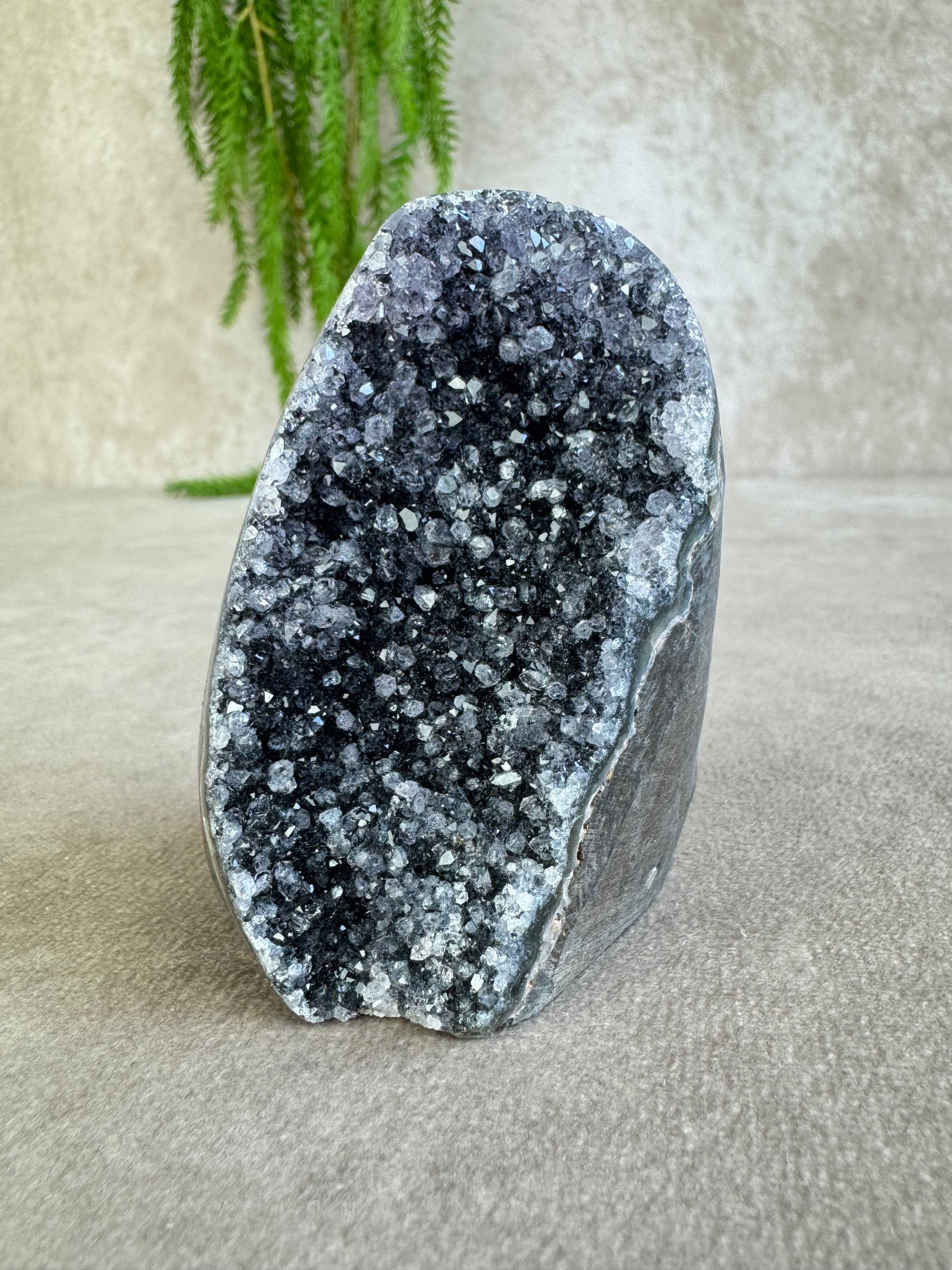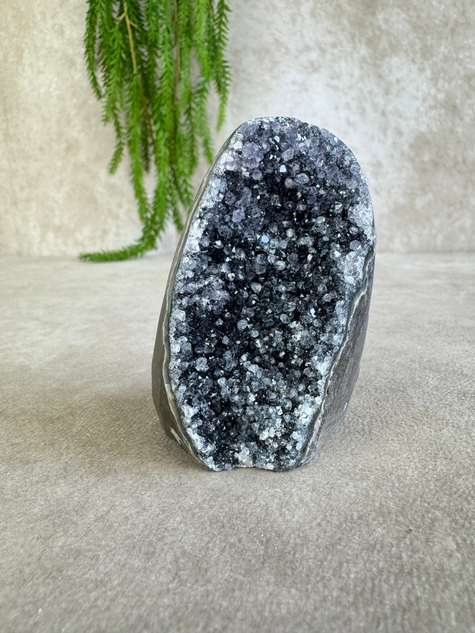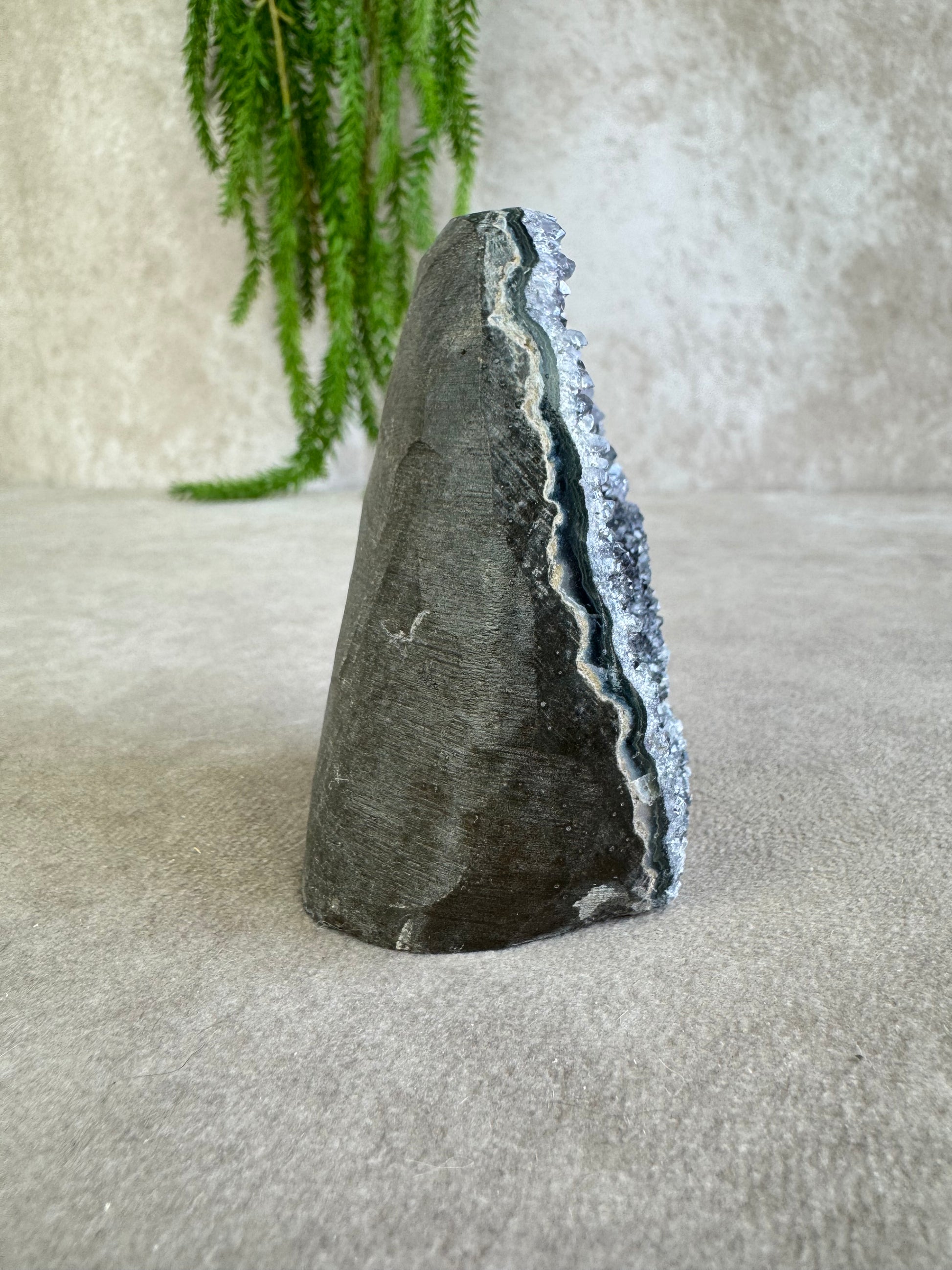 De glinsteringen die tussen de kristallen verschijnen wanneer het licht erop valt, geven dit stuk een extra magische uitstraling. Amethist staat bekend om zijn kalmerende en zuiverende werking, ideaal voor ontspanning en een harmonieuze sfeer.