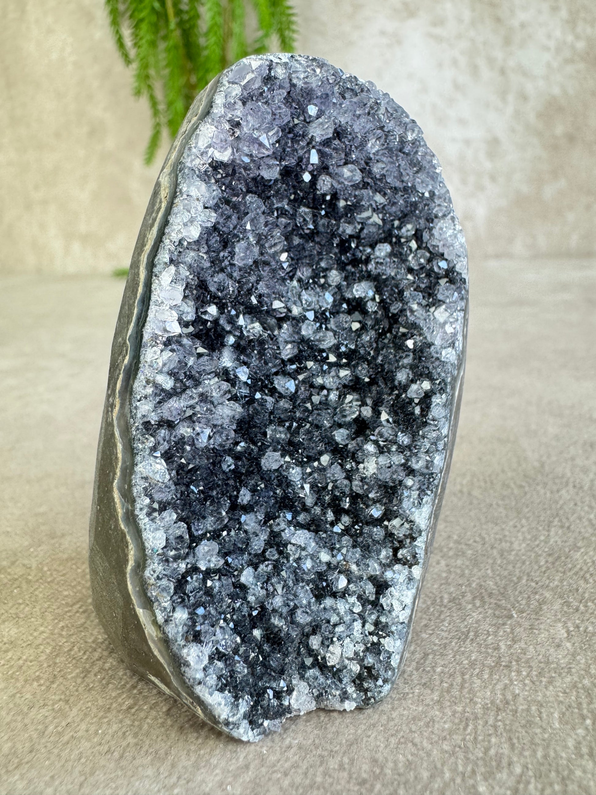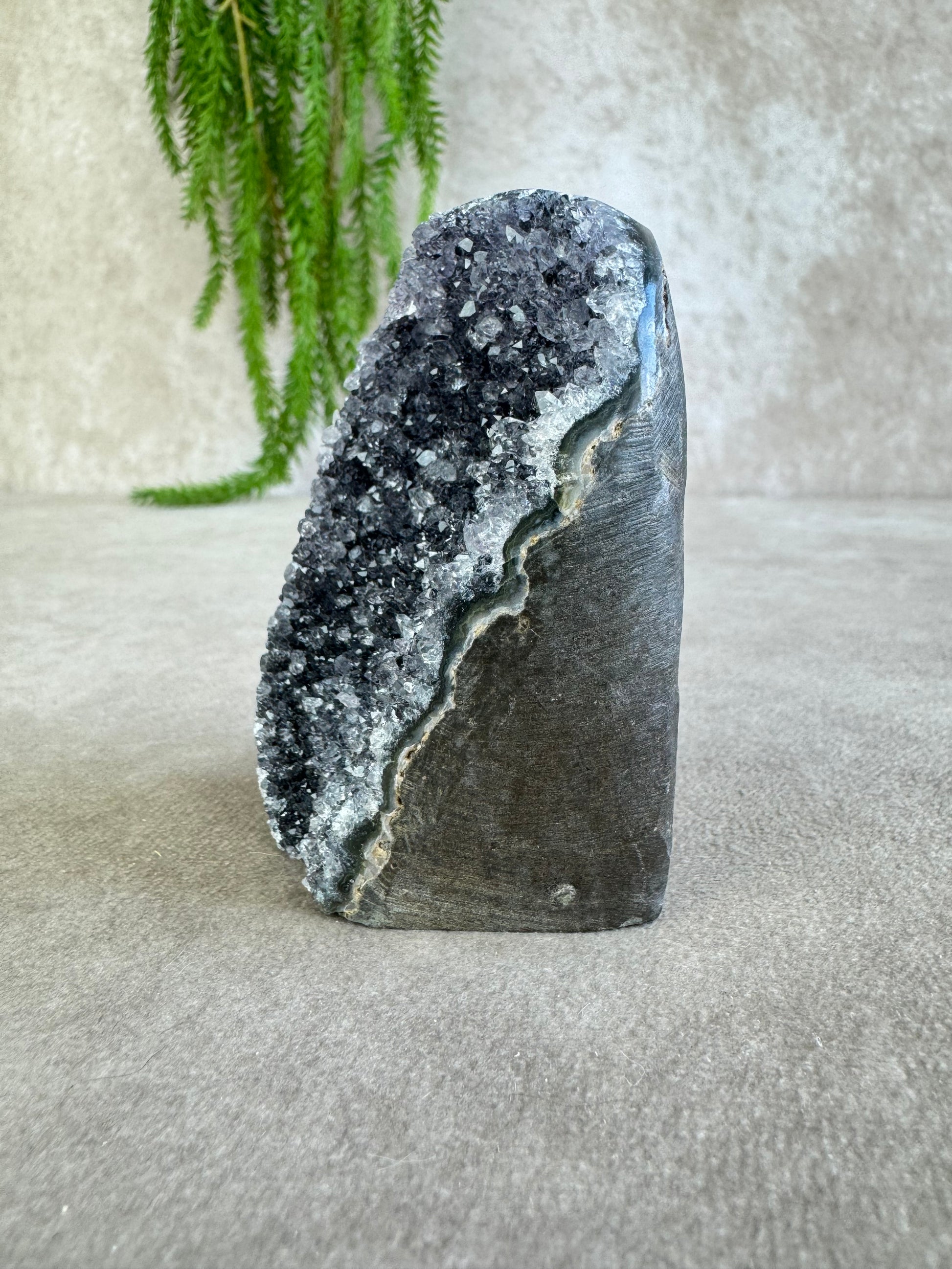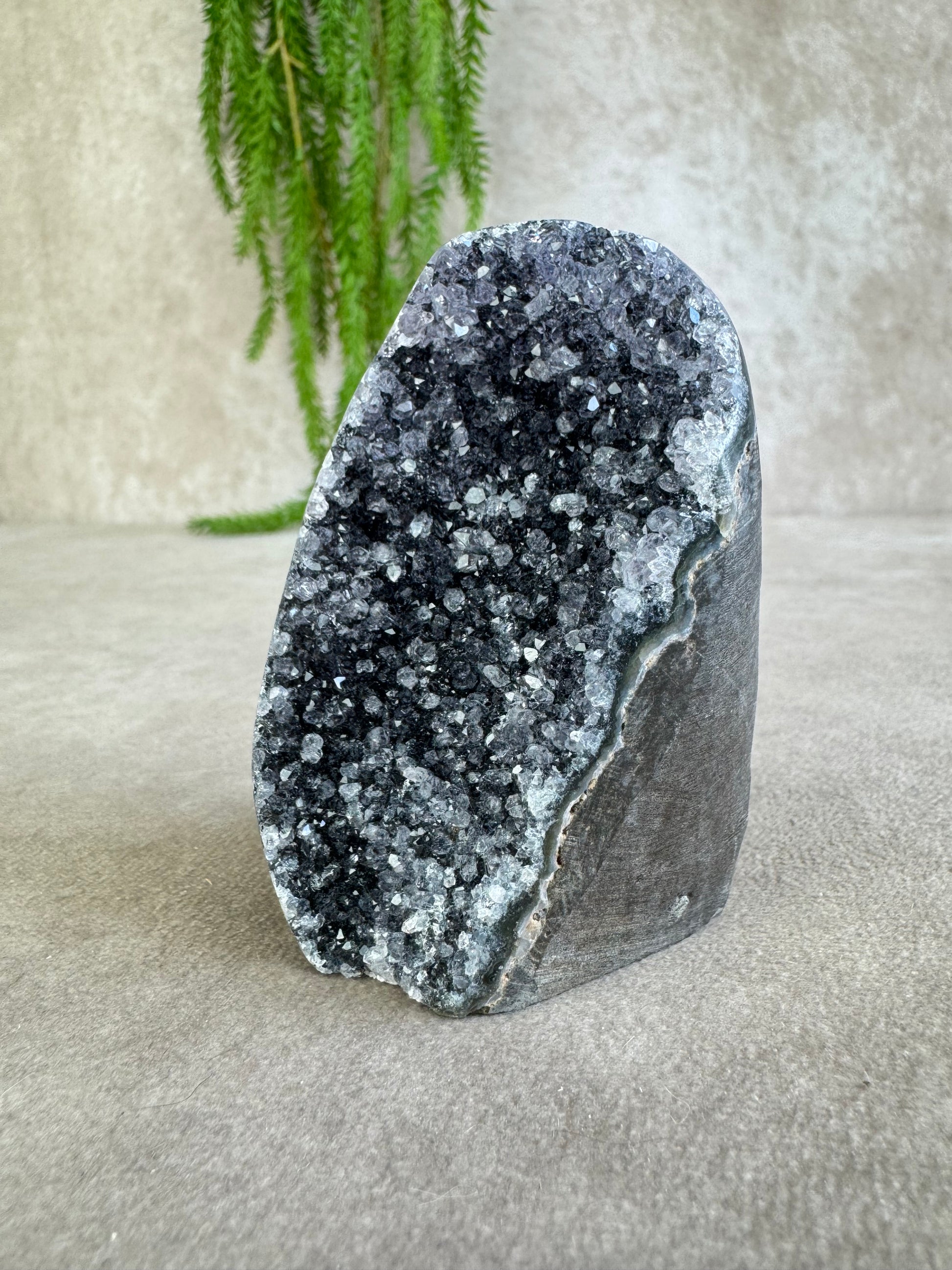 De glinsteringen die tussen de kristallen verschijnen wanneer het licht erop valt, geven dit stuk een extra magische uitstraling. Amethist staat bekend om zijn kalmerende en zuiverende werking, ideaal voor ontspanning en een harmonieuze sfeer.