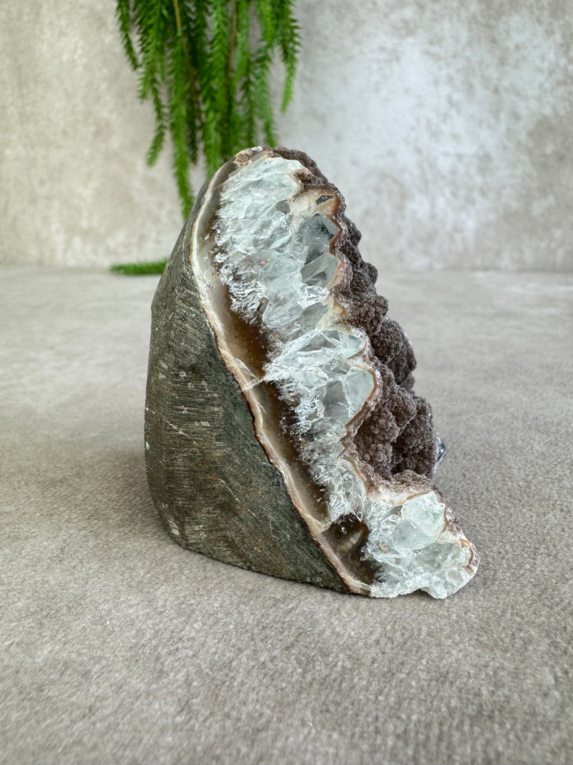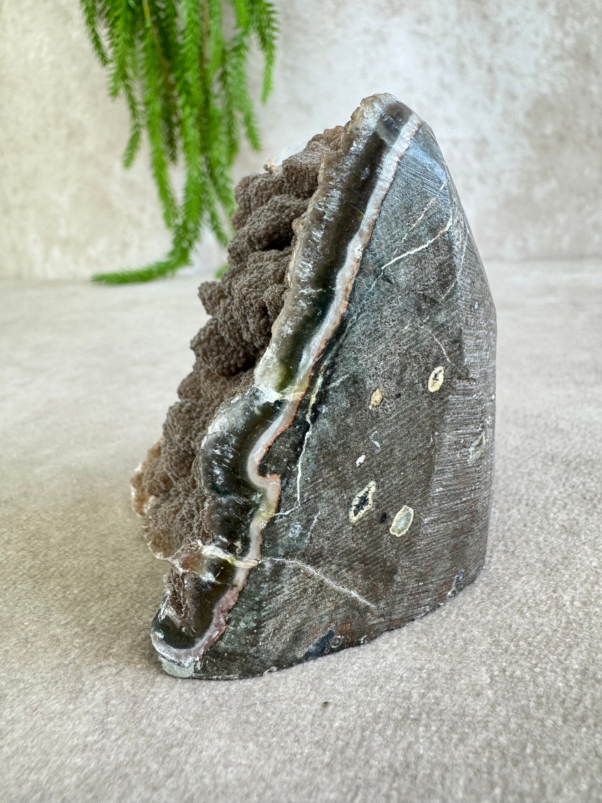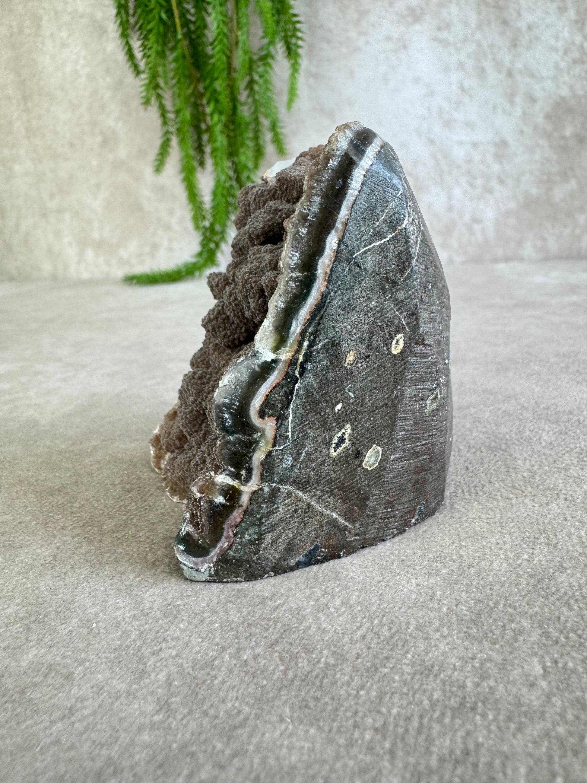 Deze rainbow amethist van 260 gram heeft fijne, sprankelende kristalpunten in een bijzondere mix van een matte en glimmende bruin tinten. Met zijn formaat van 7 x 6 cm is het een handzaam stuk dat toch krachtig aanwezig is.