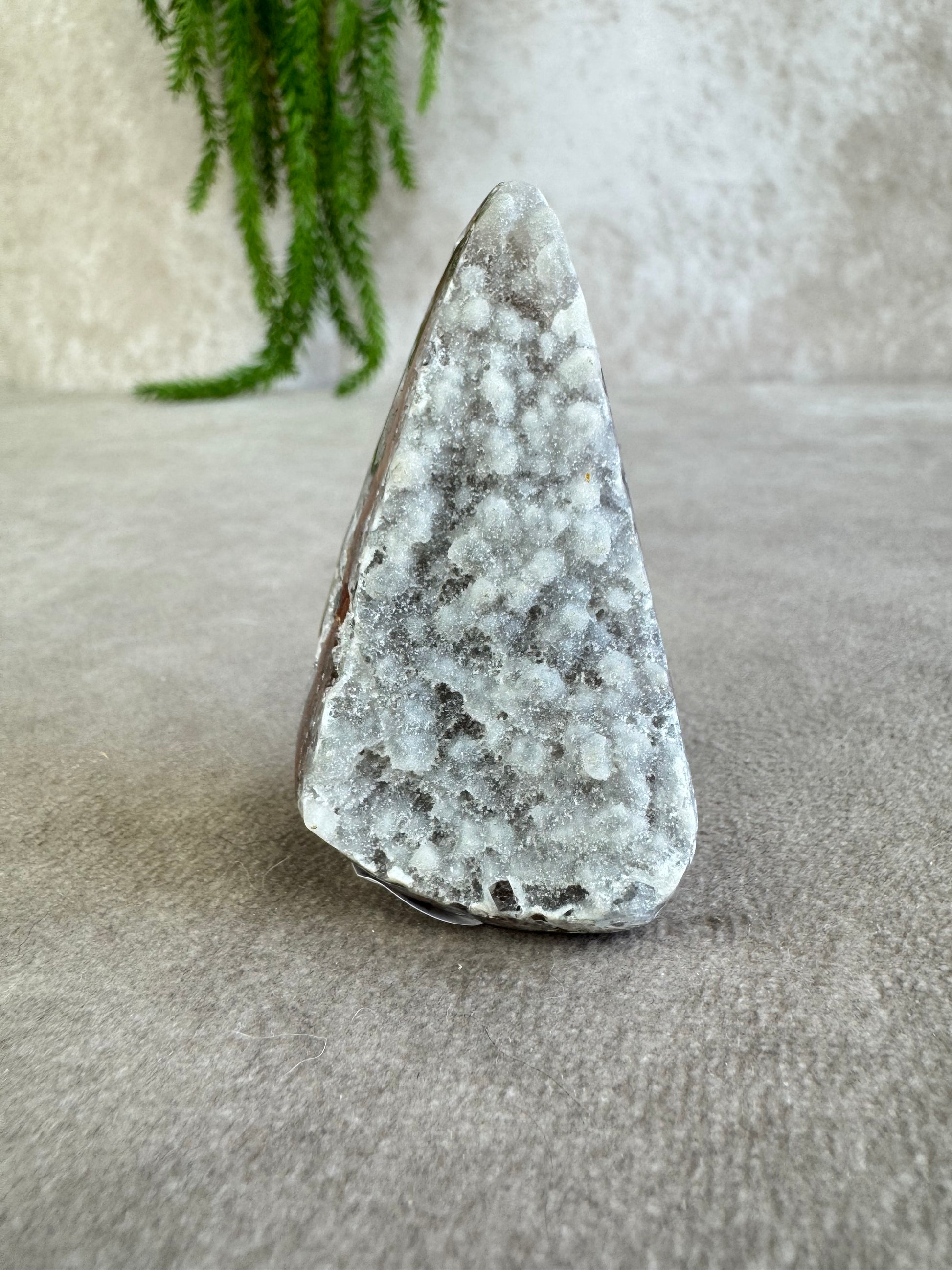 Deze verfijnde rainbow amethist in punt vorm weegt 68 gram en combineert prachtige rode banding met een laagje fijne druzy kristallen die schitteren zodra het licht erop valt. Het compacte formaat van 6 x 3,5 cm maakt hem perfect voor op een altaar, bureau of in een kristalgrid.