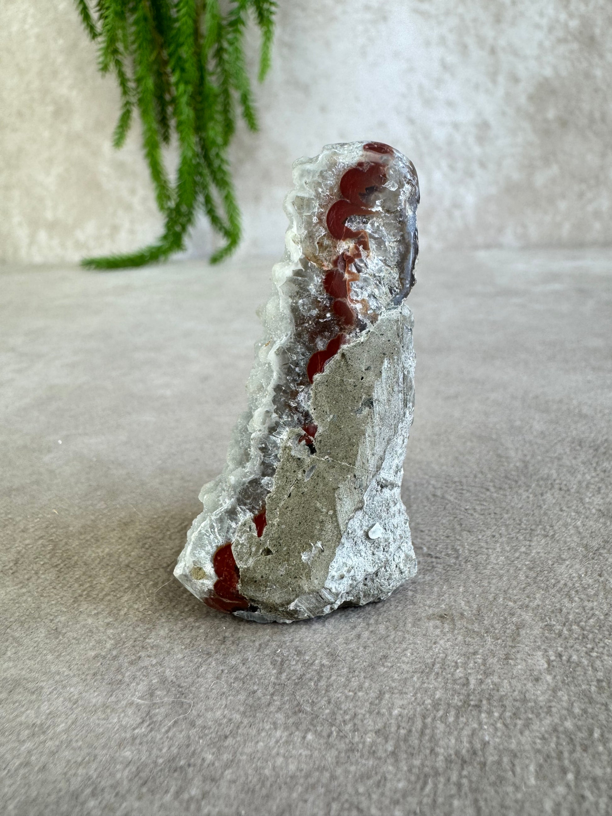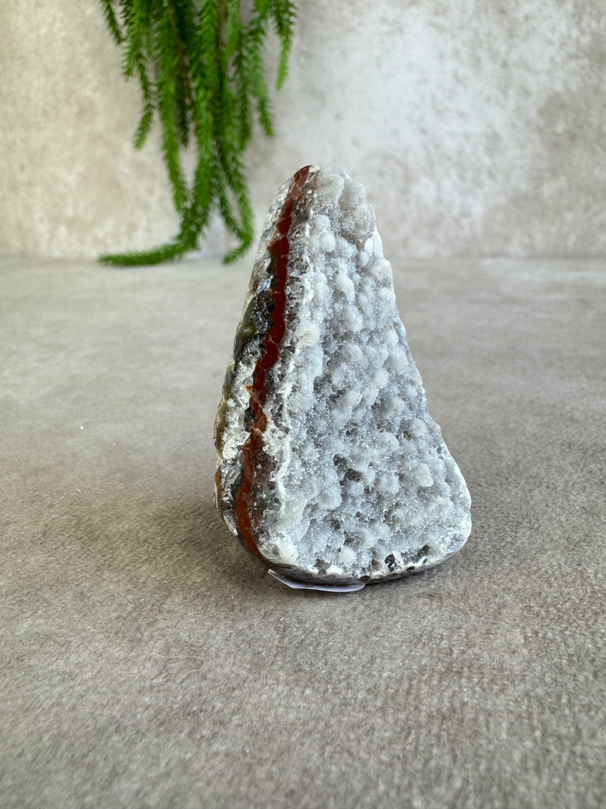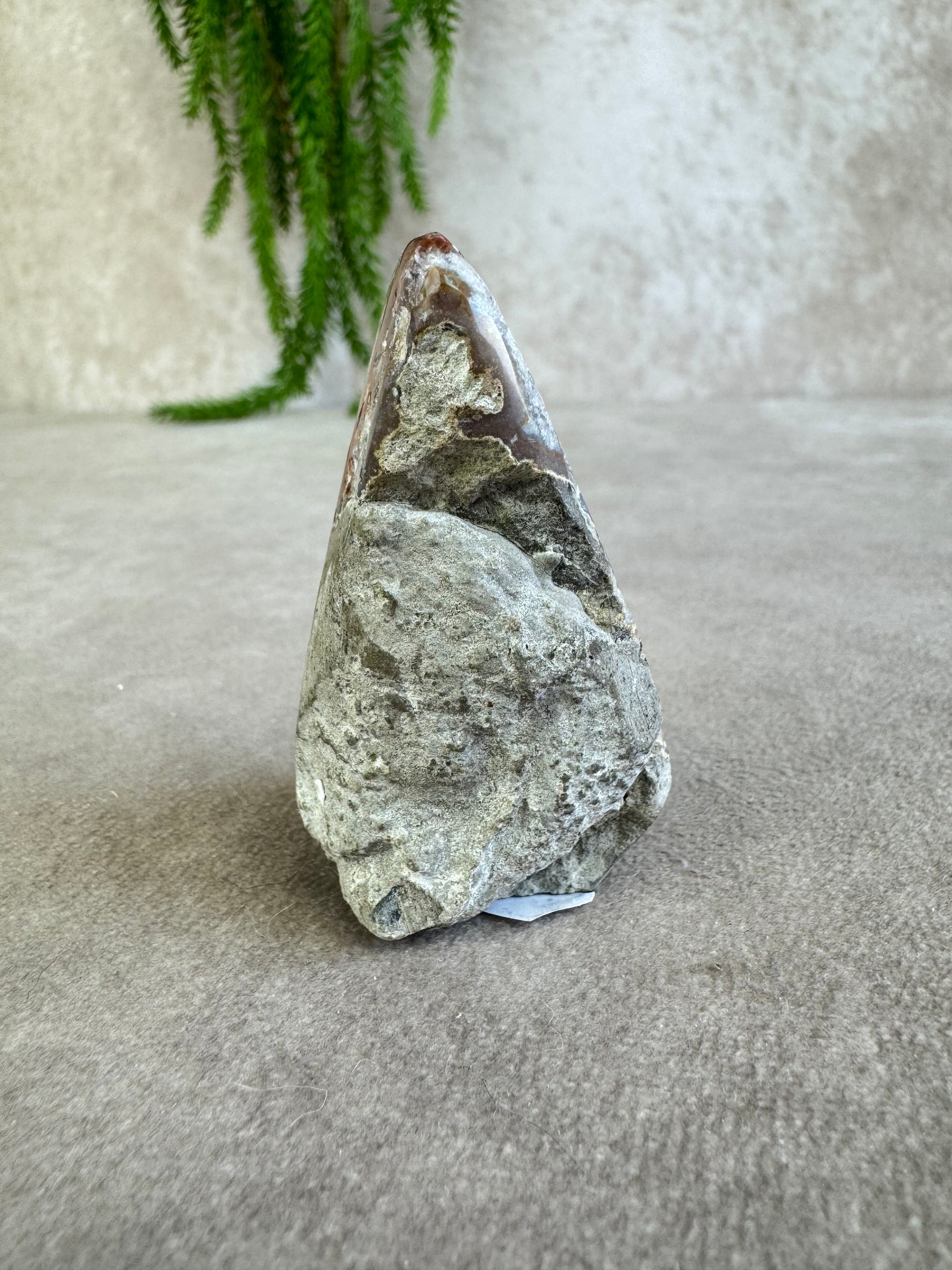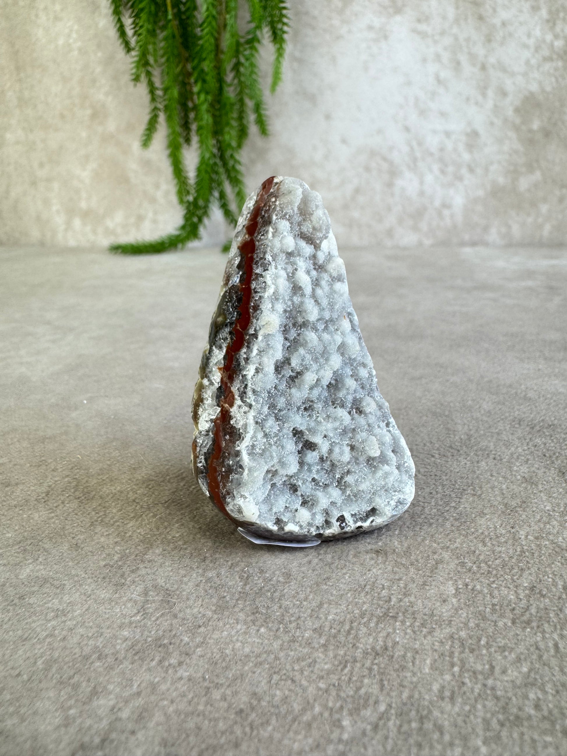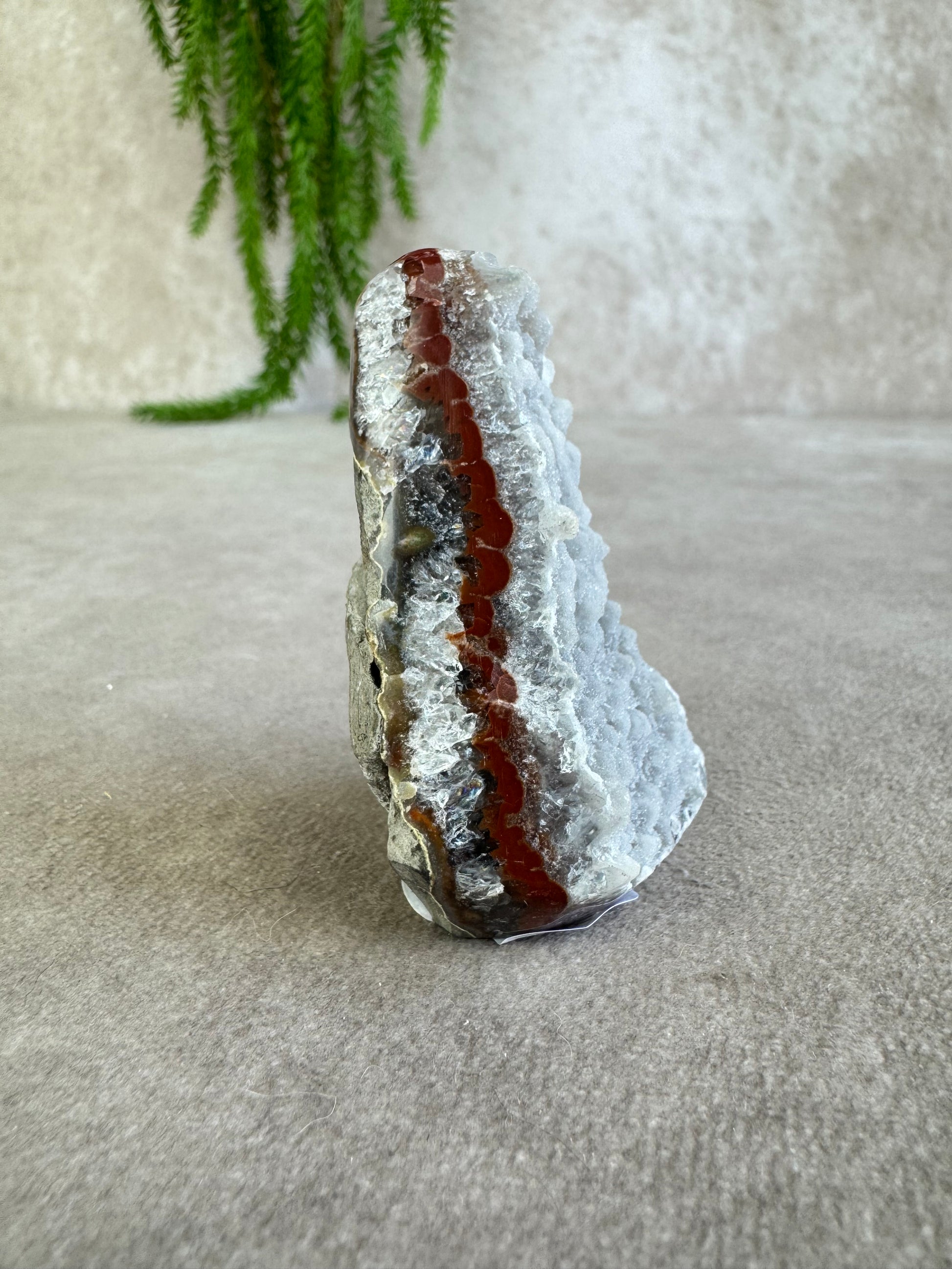 De puntvorm helpt de energie van amethist bekend om zijn rustgevende en zuiverende werking gericht omhoog te sturen. De rode banding voegt daarbij een aardende, krachtige energie toe, waardoor dit kristal zowel kalmte als vitaliteit uitstraalt.