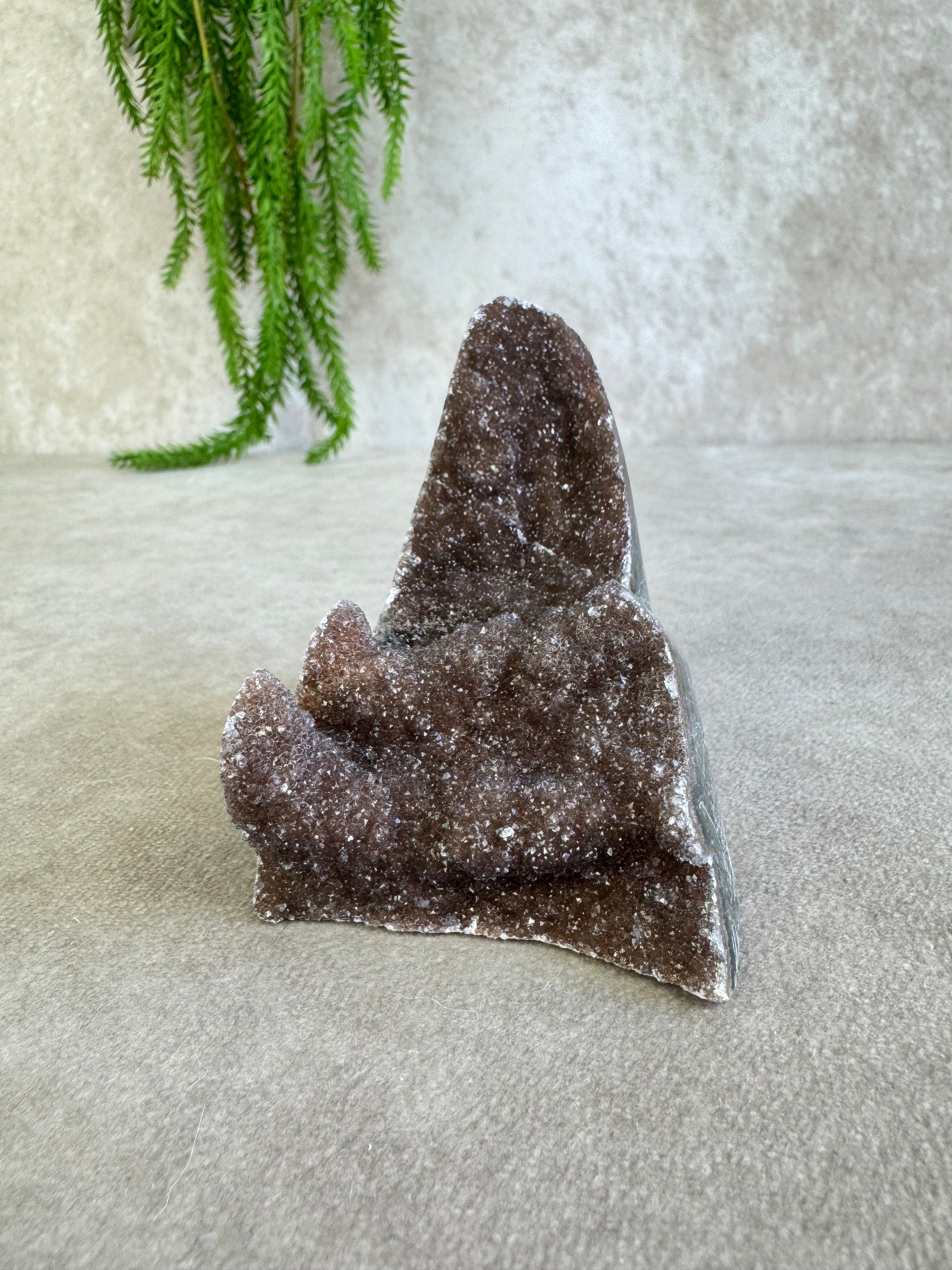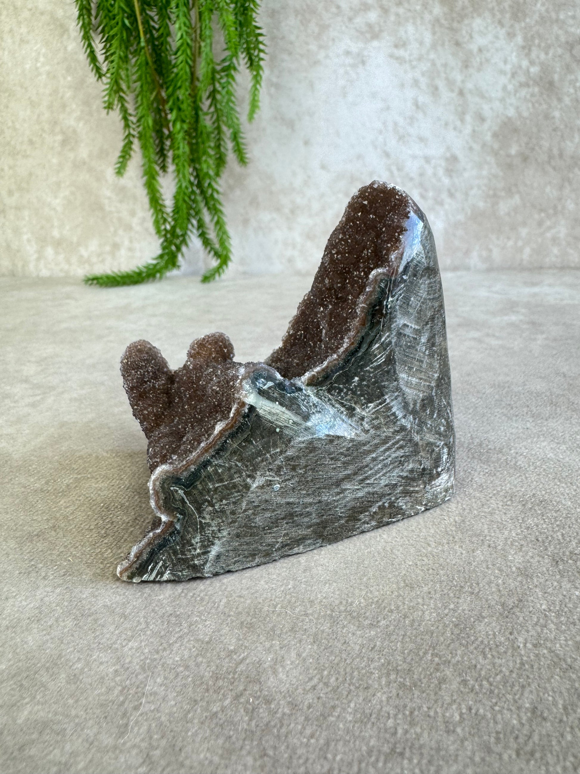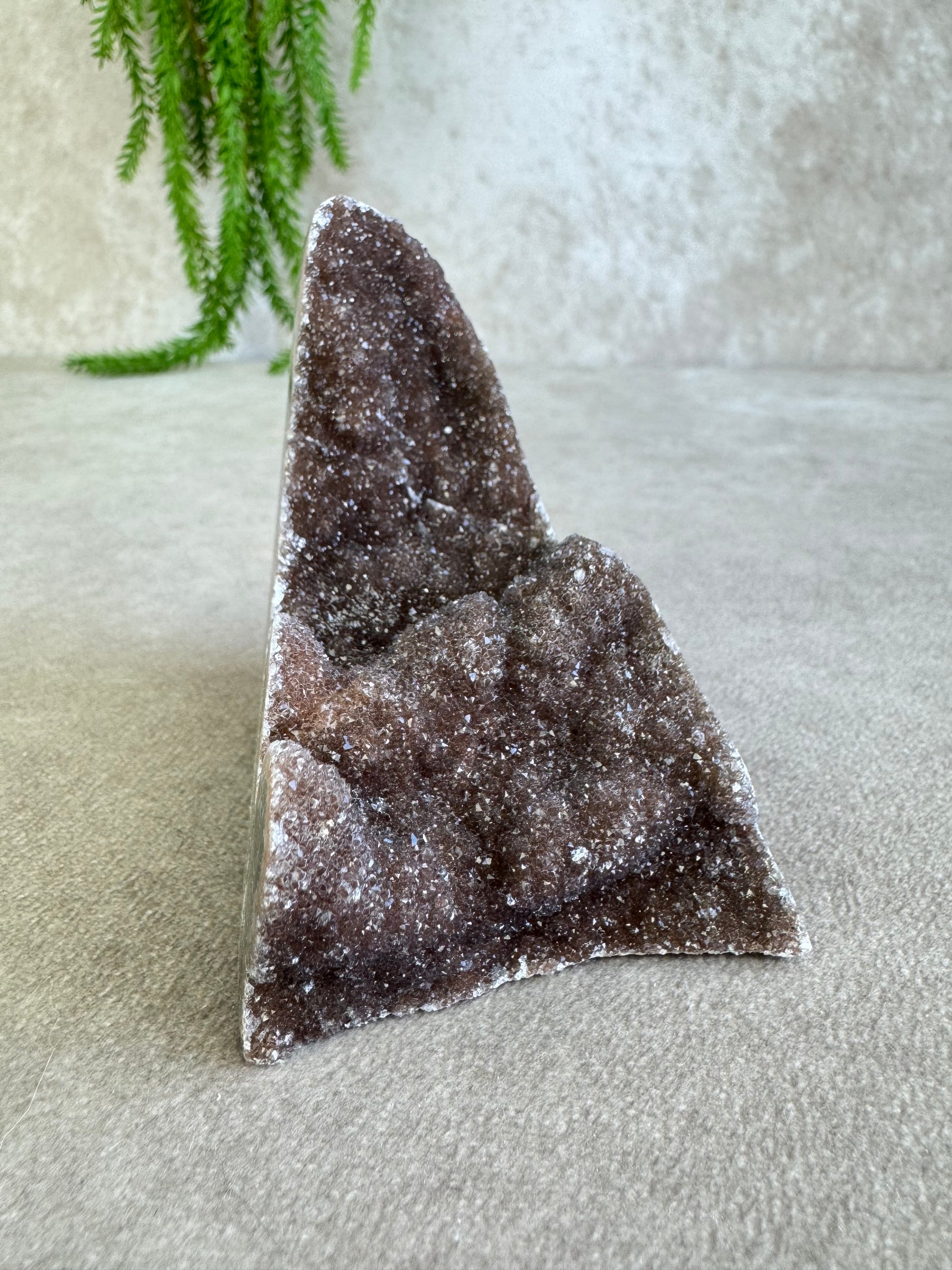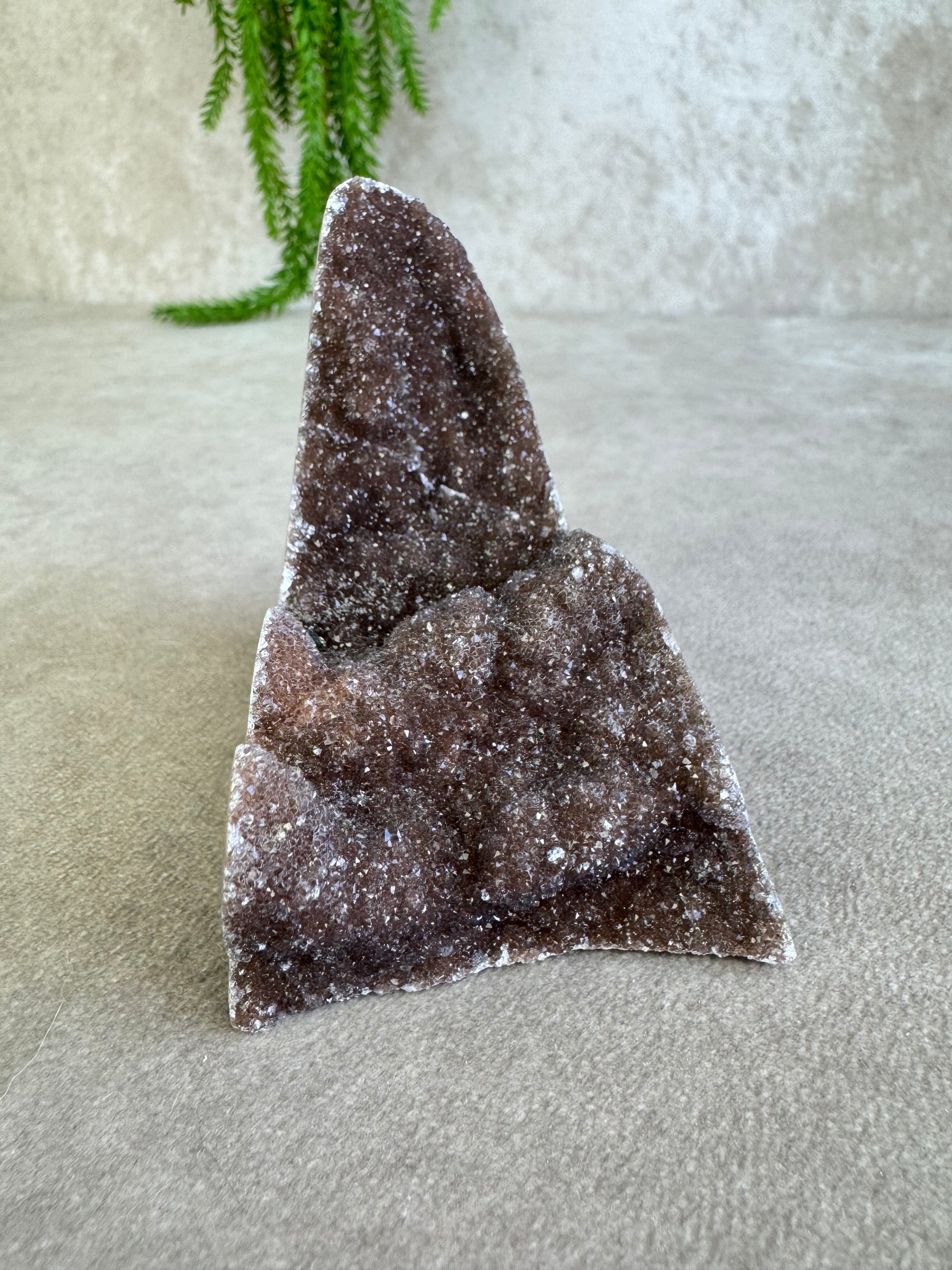 Deze rainbow amethist van 336 gram heeft een elegant formaat van 8 x 8,5 cm en een bijzondere rood bruine kleurtoon die hem een stijlvolle, rustige uitstraling geeft. Tussen de kristalpunten schitteren subtiele glinsteringen, die oplichten zodra het licht erop valt.