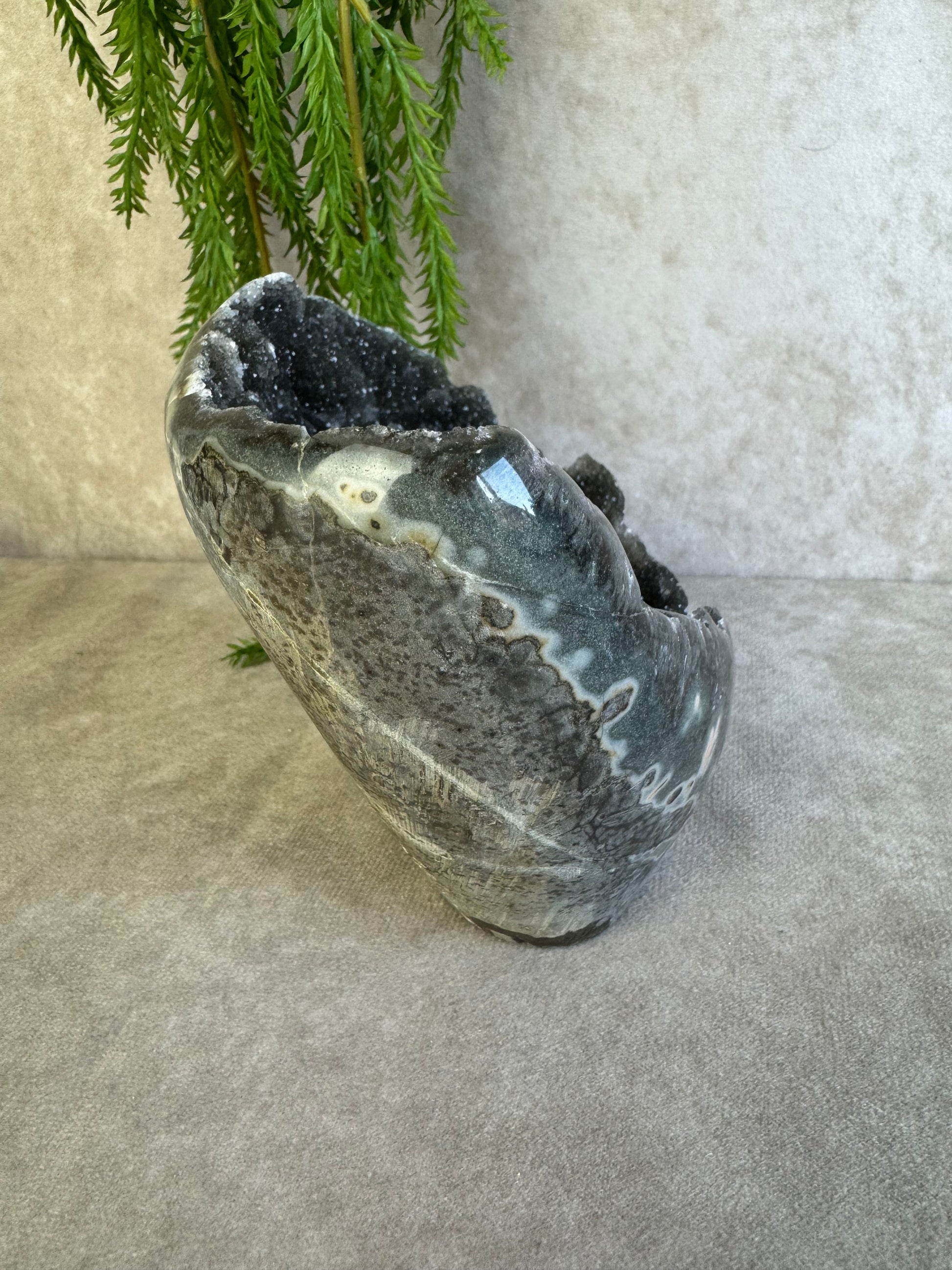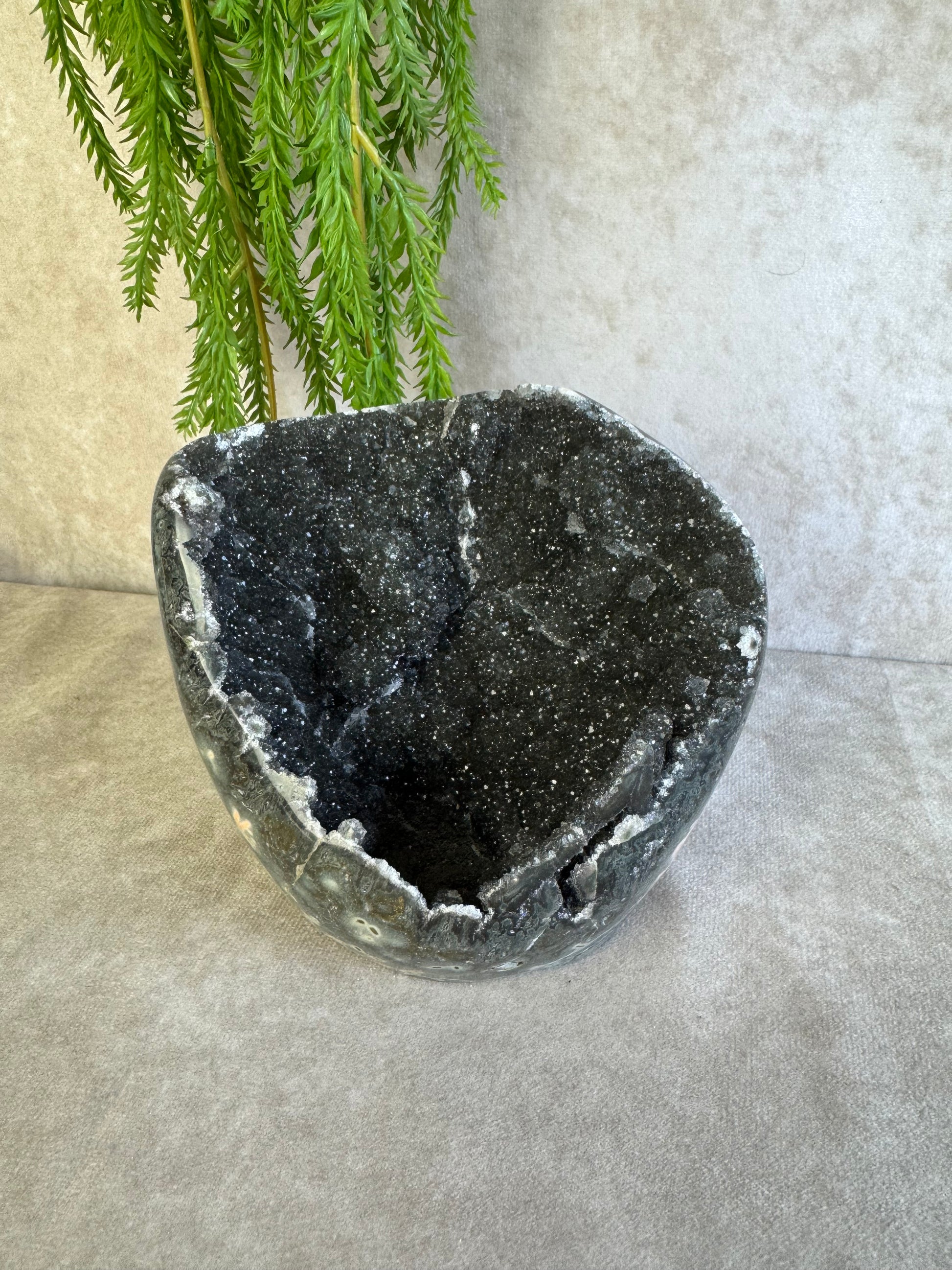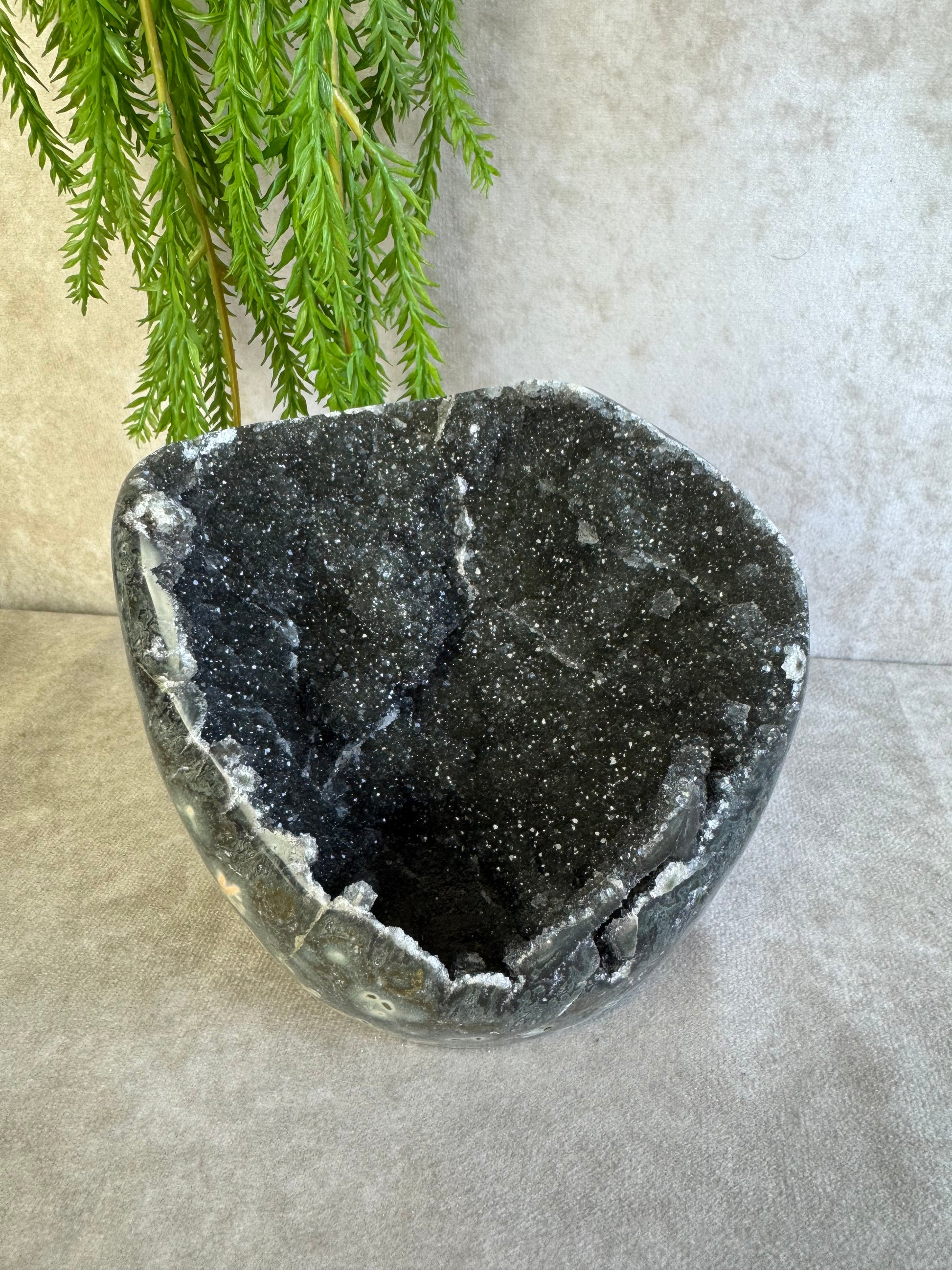 Dit diep zwarte stuk heeft prachtige druzy en weegt 1354 gram en 12,5x15 cm.