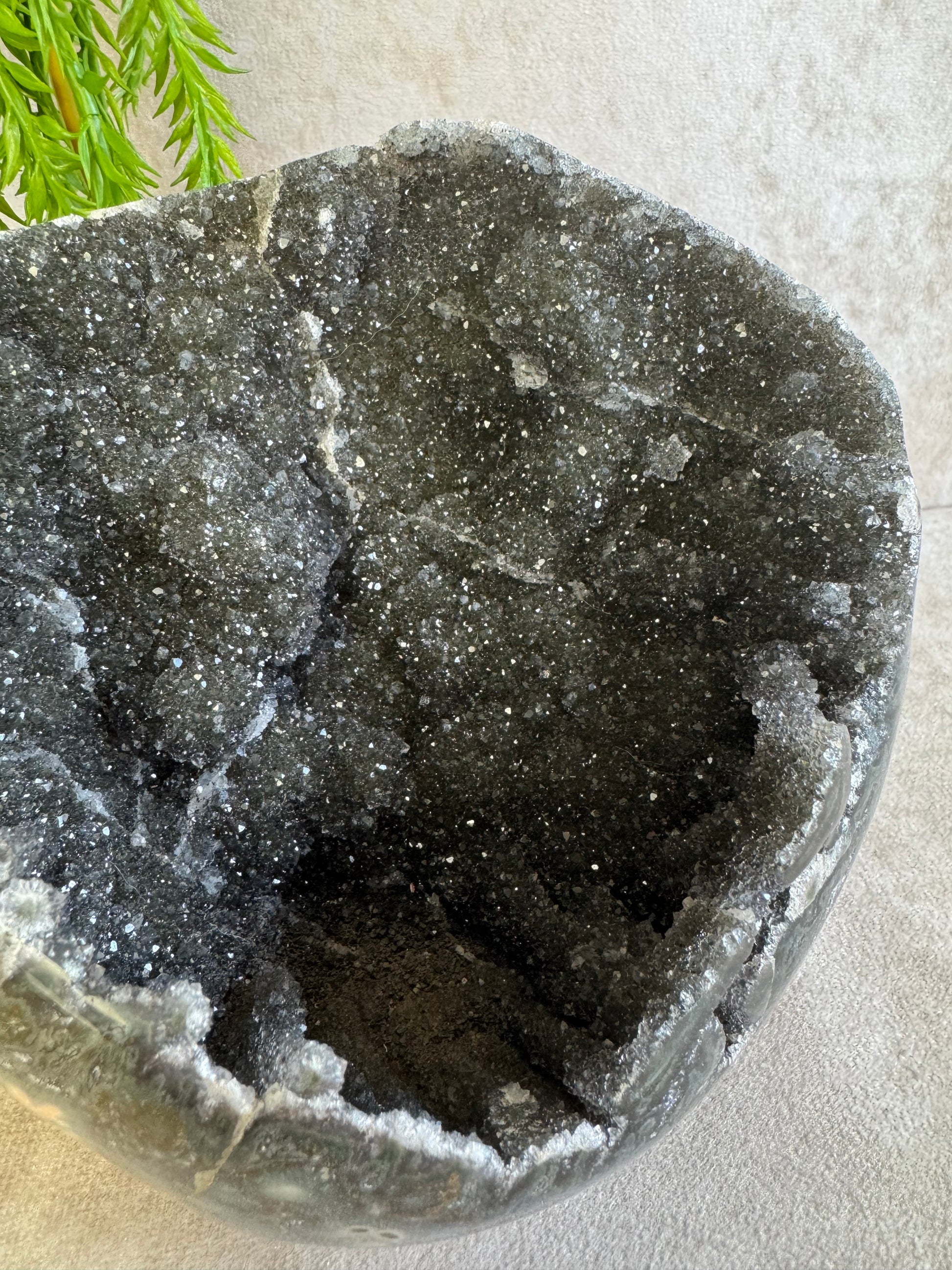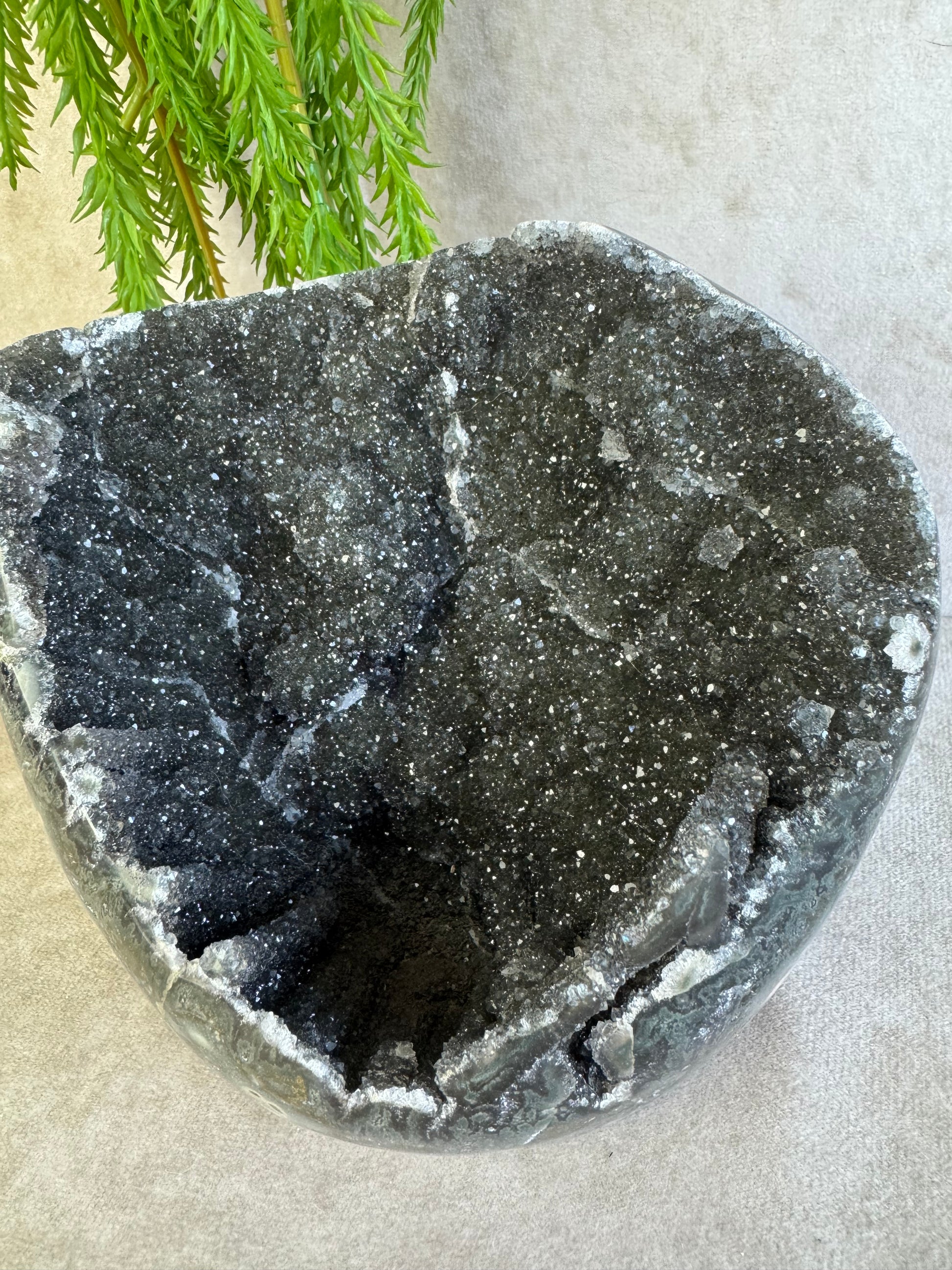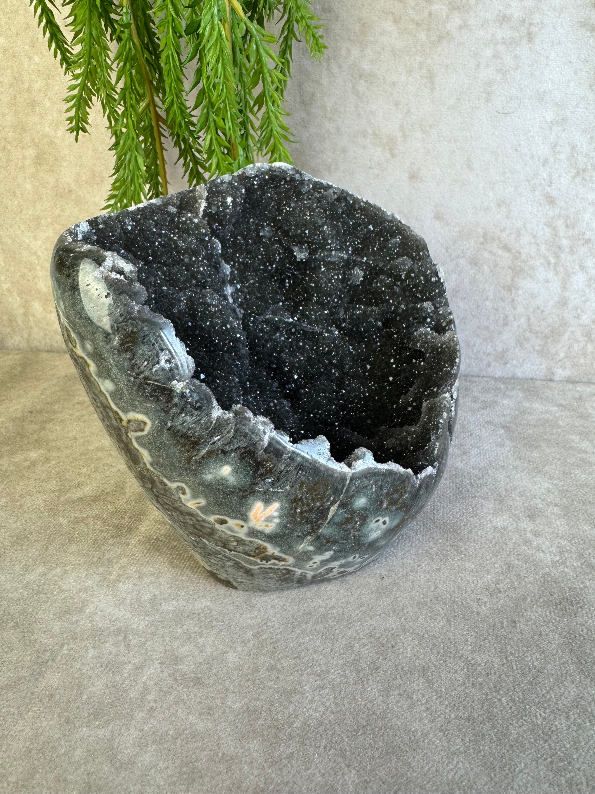 Dit diep zwarte stuk heeft prachtige druzy en weegt 1354 gram en 12,5x15 cm.
